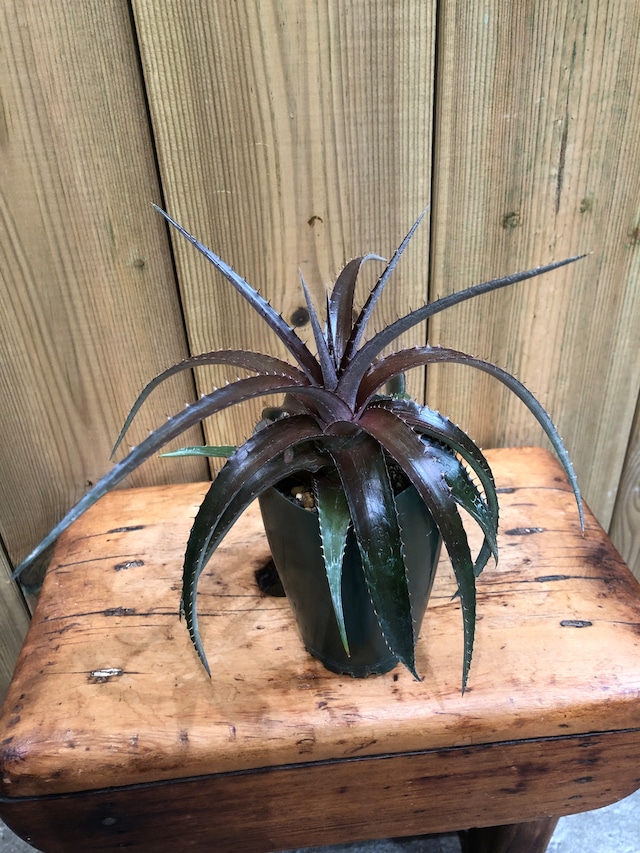 ブラジル原産のディッキアの交配種で、葉は硬く内側に緩やかにカーブし縁には鋭い鋸歯が並んでいます。 幅広で赤茶色の葉をロゼット形に展開し、子株を出しながら群生します。 ・高さ 約20㎝ (植物本体 約12㎝) ・幅 約23㎝ ・成長期は春〜秋で屋外では直射日光に当てますが夏場は葉焼けの可能性がありますので30%程度の遮光や半日陰等で用土が乾ききったら水遣りします。 ・屋内では窓際等の陽当たりの良い場所に置くか、植物育成ライト下で用土が乾ききったら水遣りします。 ・冬の休眠期は屋内に移動させ窓際等の陽当たりの良い場所に置くか、植物育成ライト下で用土が乾ききってから数日置いて水遣りします。 ⚫︎冬の窓際は朝・夜は冷え込みますので朝・夜は暖かい場所に移動させます。 ⚫︎休眠期の冬に陽当たりのあまり良くない場所や気温の低い場所に置く場合には根を湿らせる程度の水遣りをします。