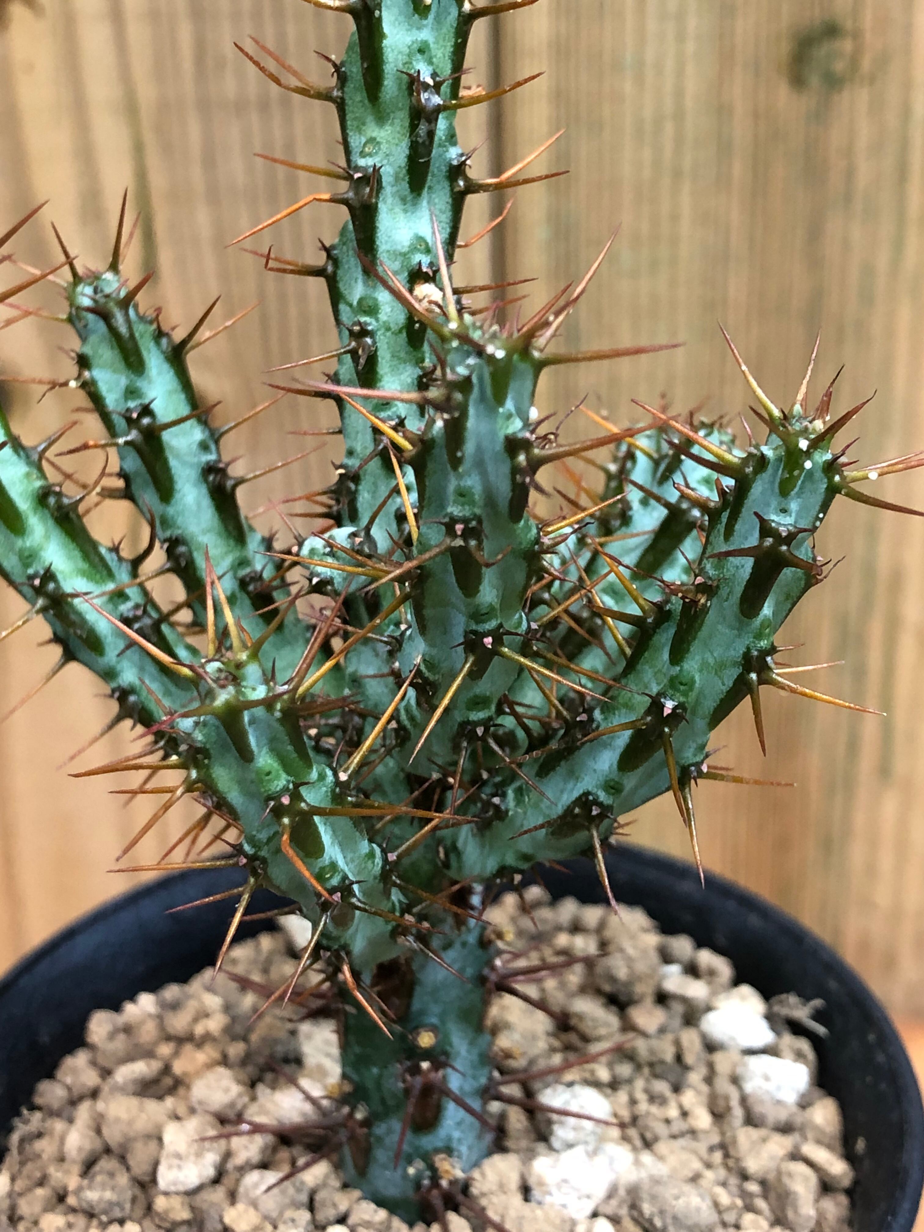 南アフリカ原産の綺麗な模様のユーフォルビアで青緑色の表皮に濃い模様が入り、そこから4本の棘が生えています。成長点付近の棘は明るい色味をしており、古くなると赤茶色になります。成長と共に枝数が増えたり切り戻すと切り口付近から新しく枝が生え、群生していきます。