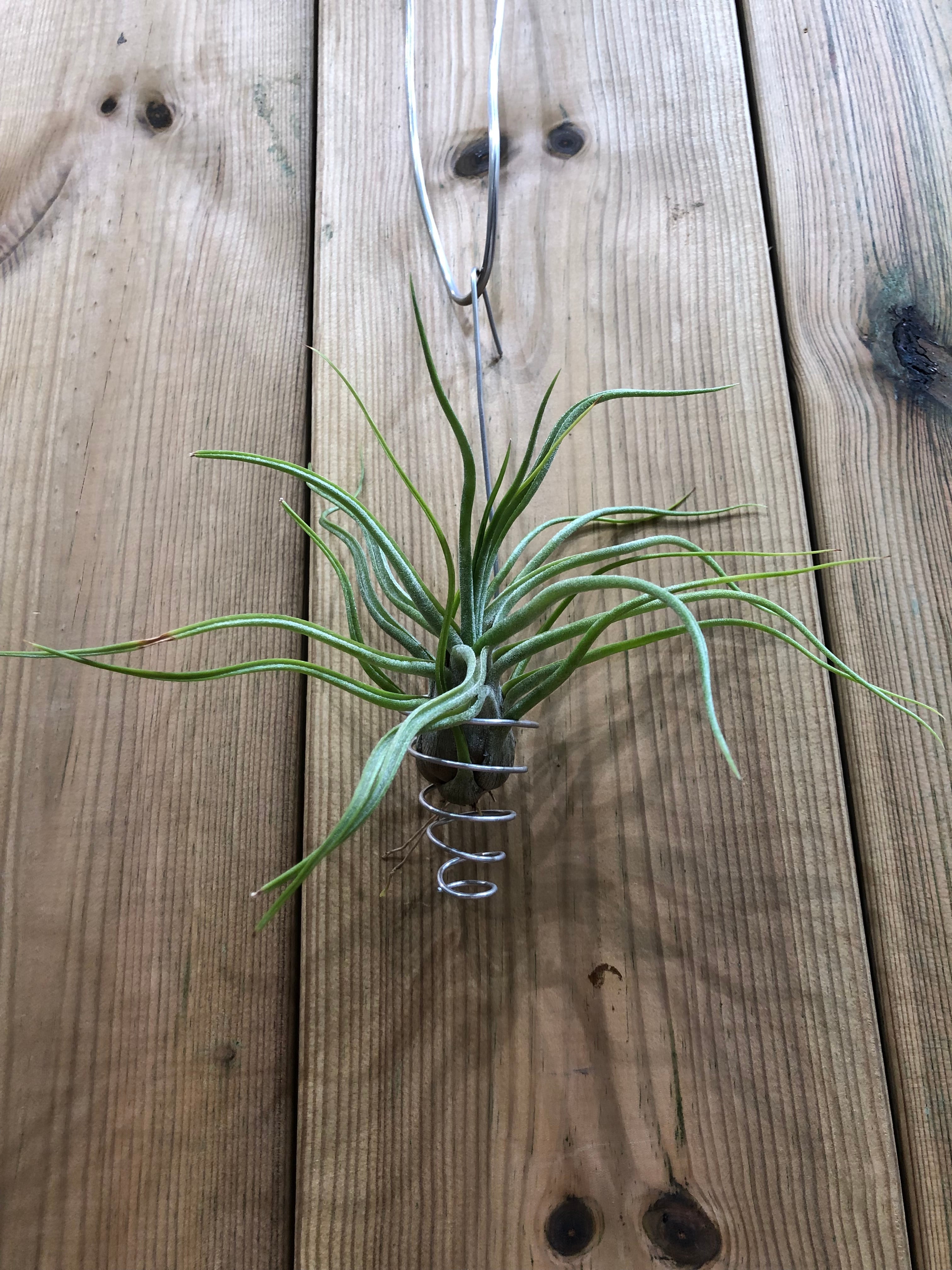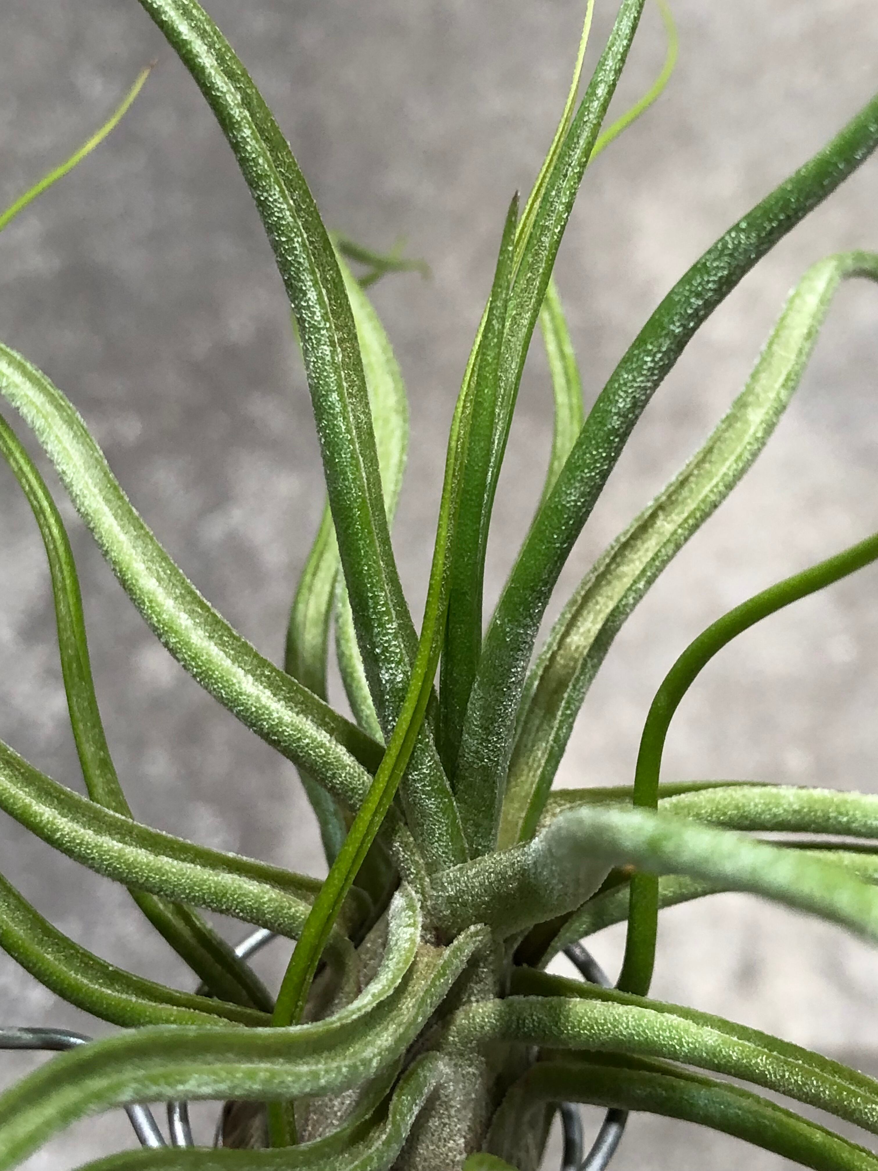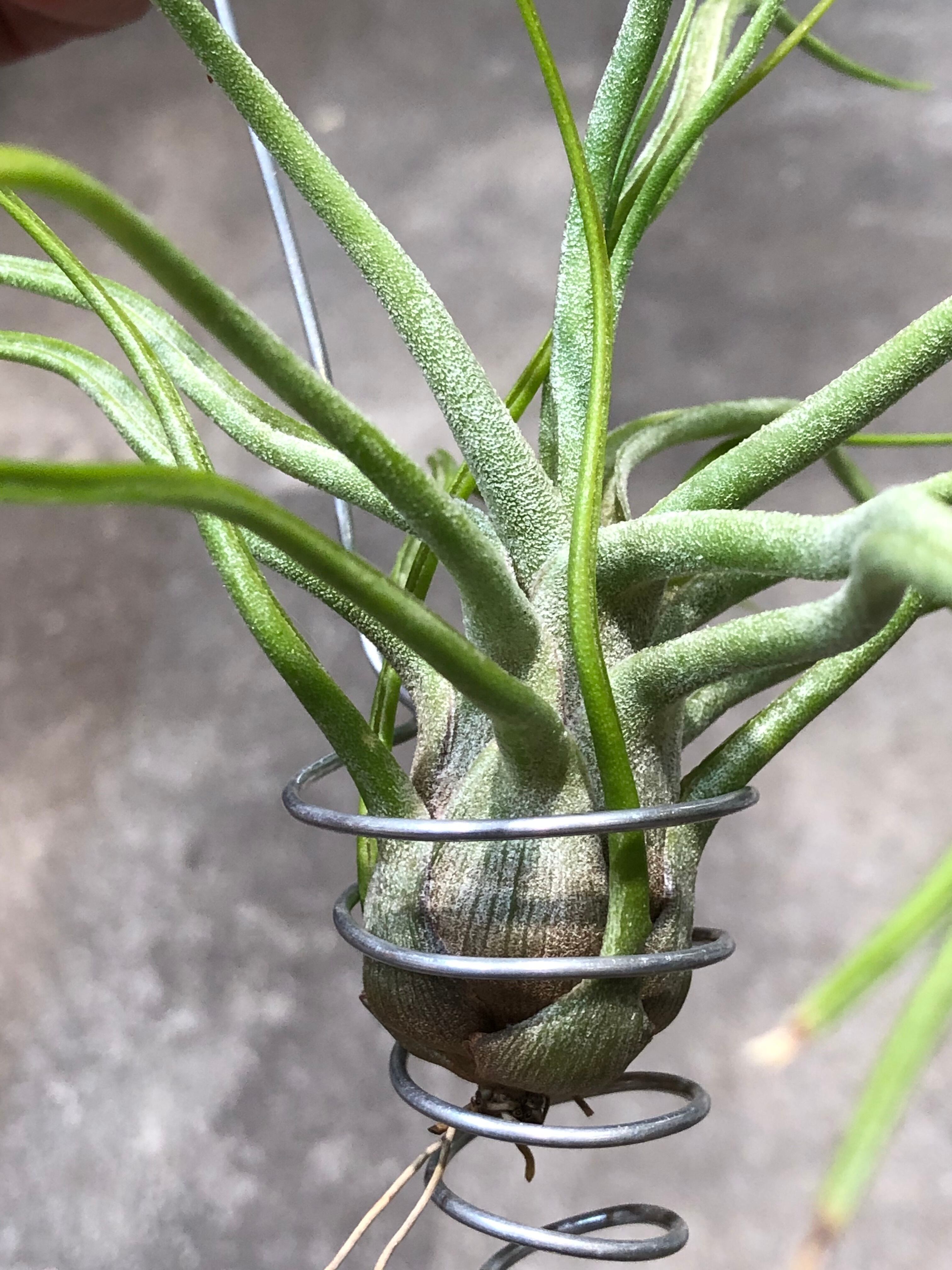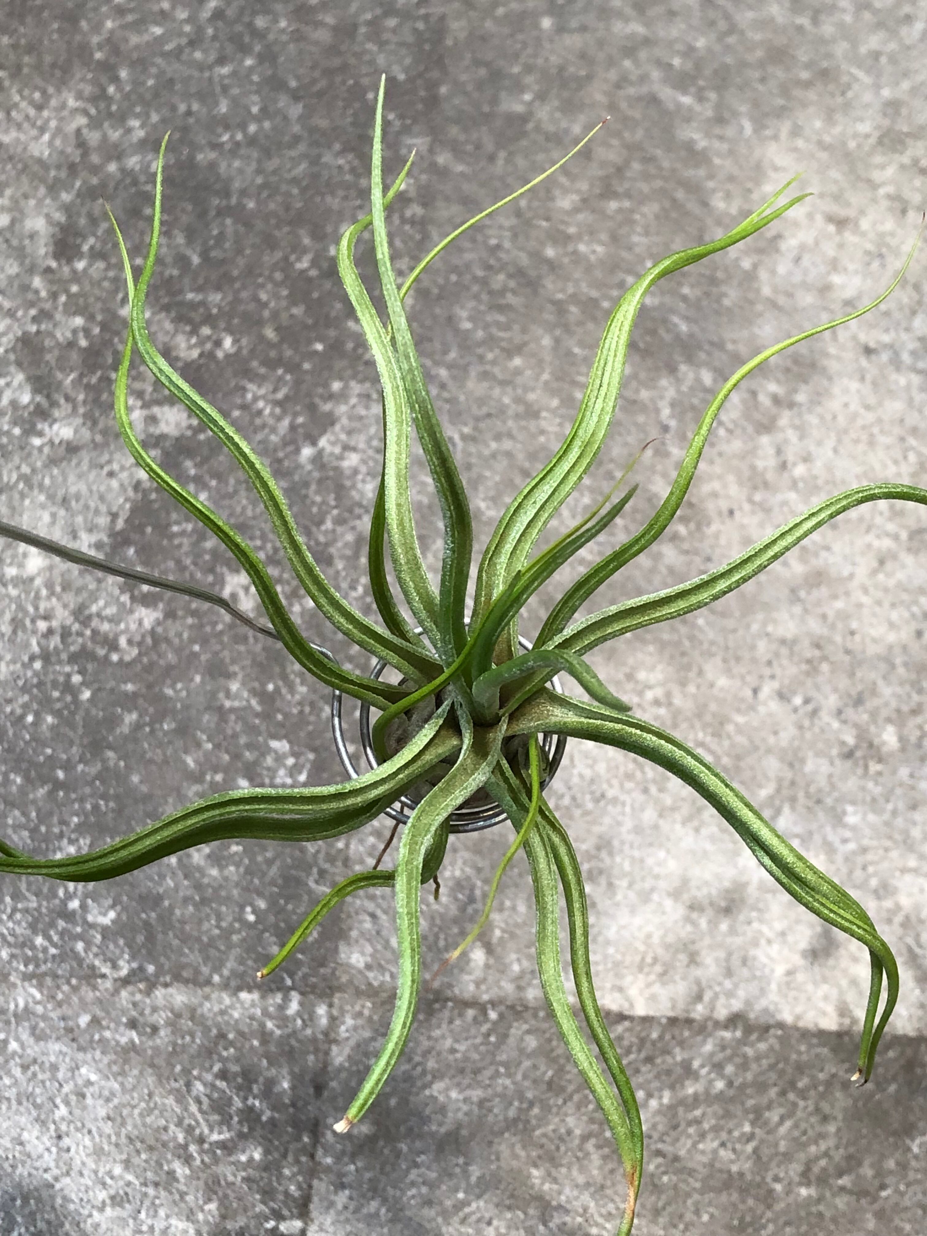 ティランジア・ブルボーサと別の品種の交配種で詳細は不明ですが、通常のブルボーサよりも葉色は黄緑色が強く基部の壺の部分も少し白っぽい見た目で性質は丈夫で育て易い印象があります。