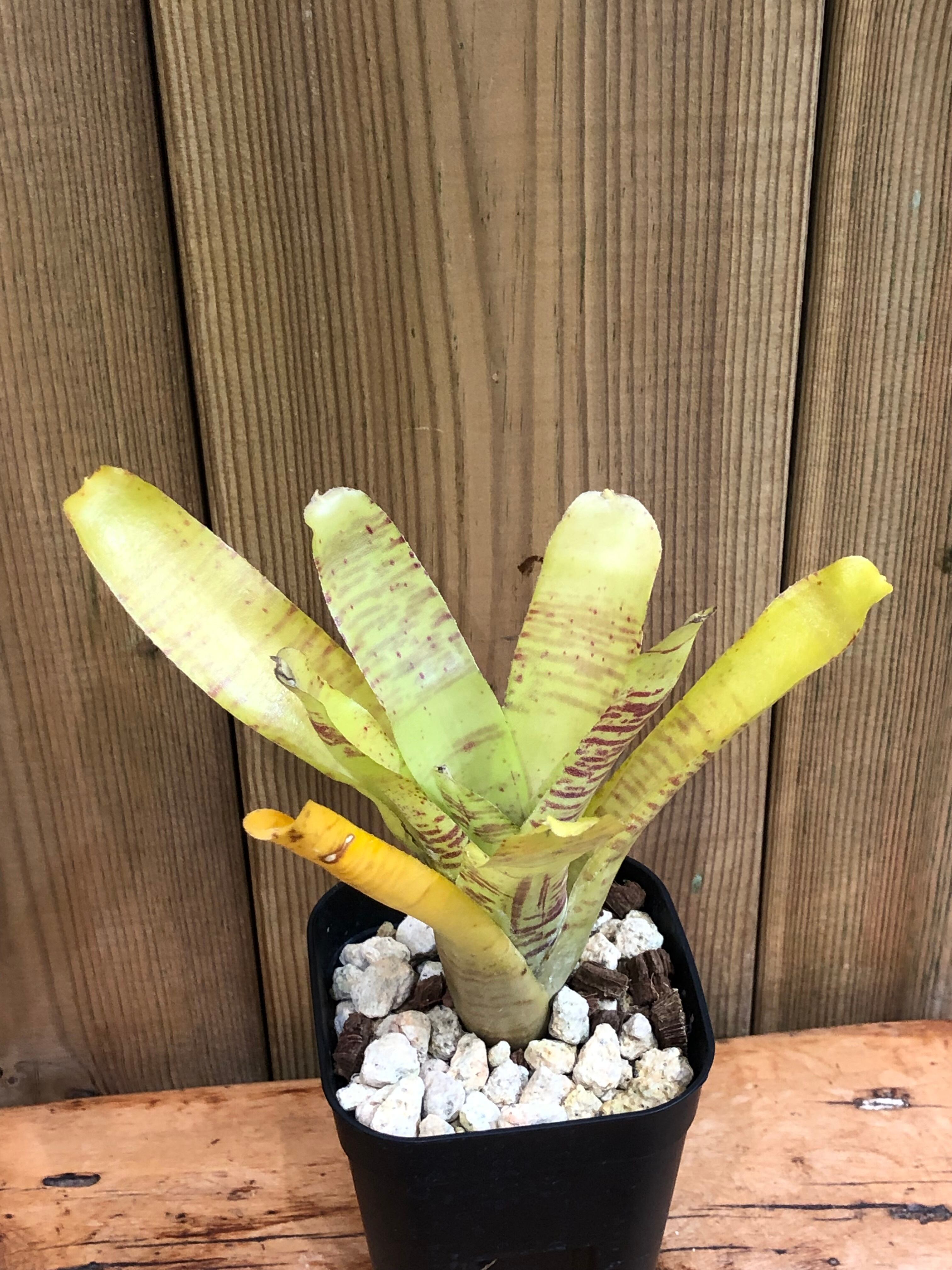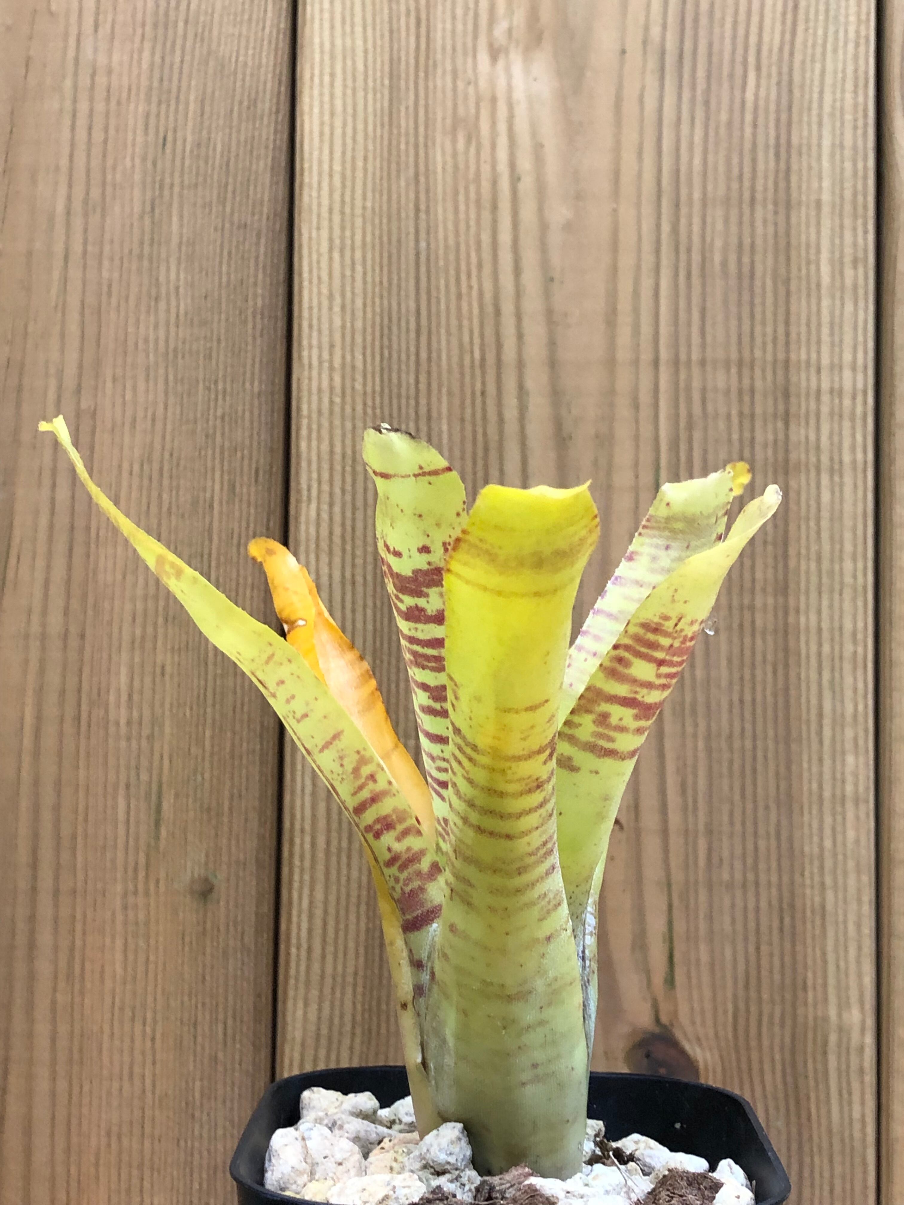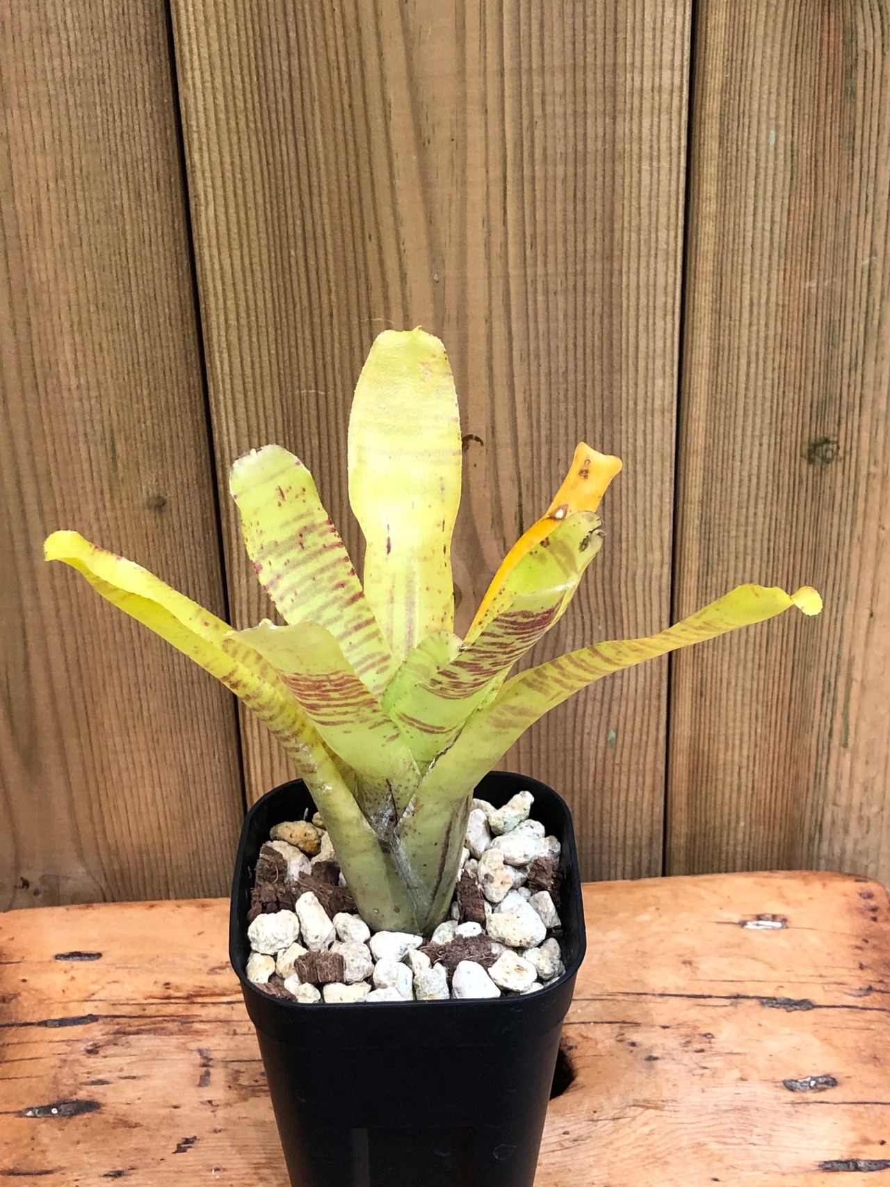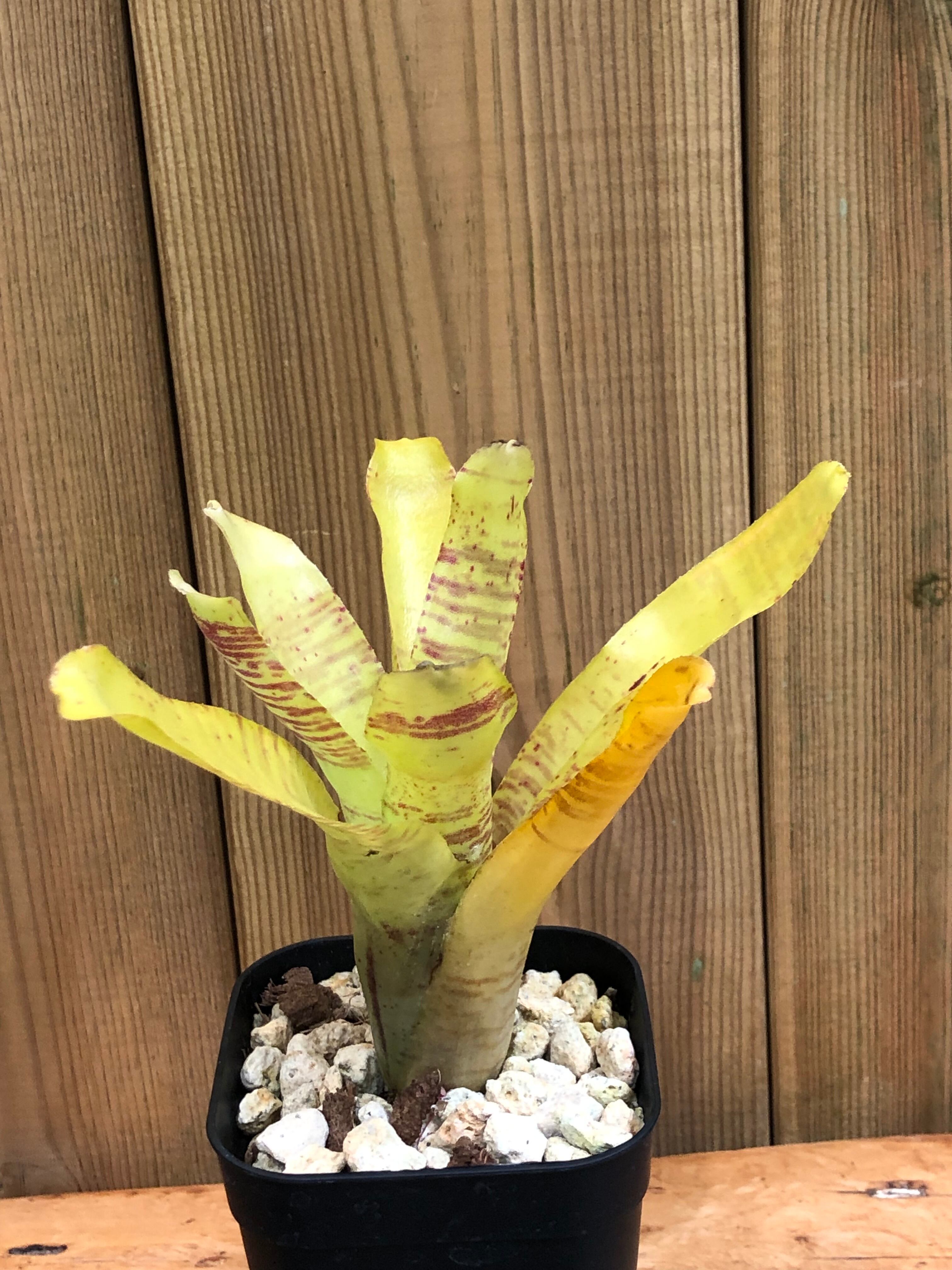 南米原産のネオレゲリアの交配種で葉は硬めですが柔軟性があり、黄色に発色し赤い縞模様やドット柄が入る存在感のある品種です。