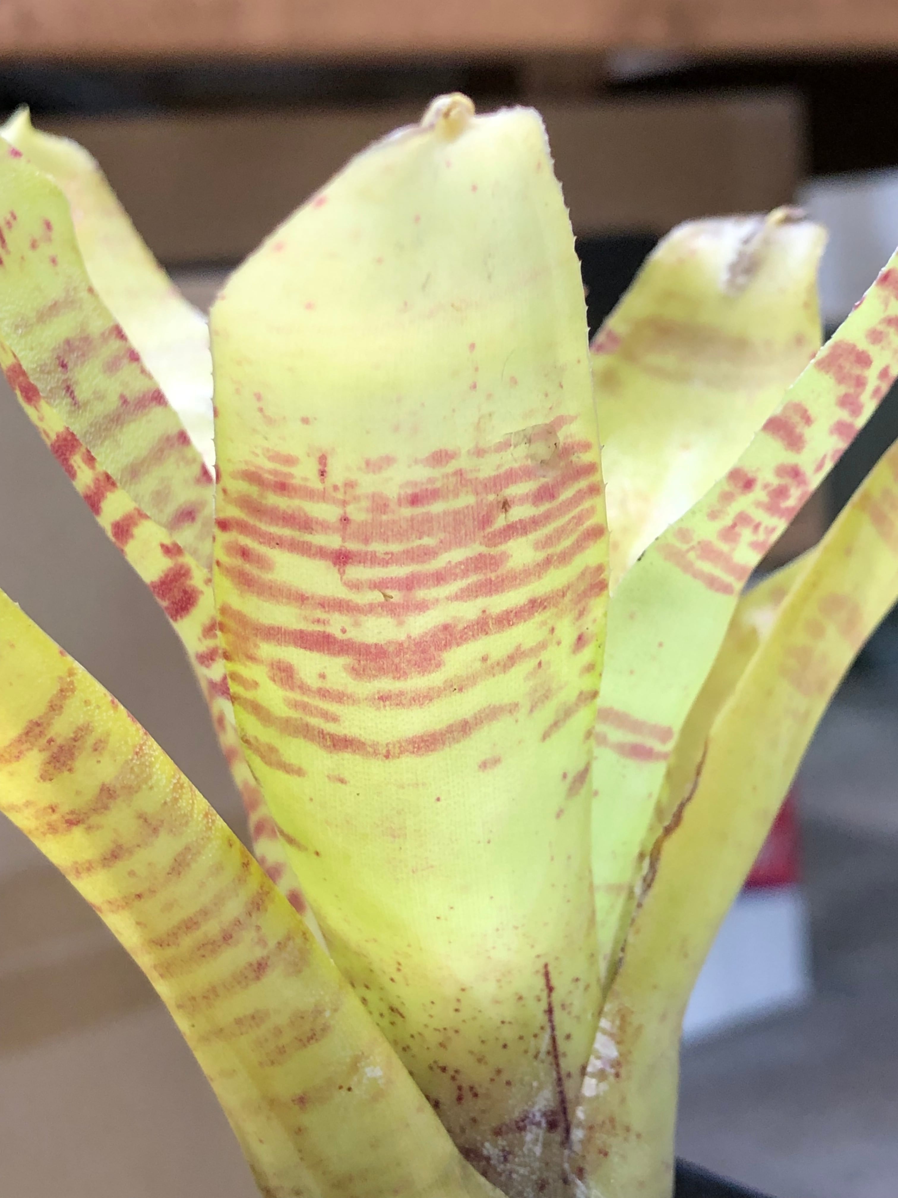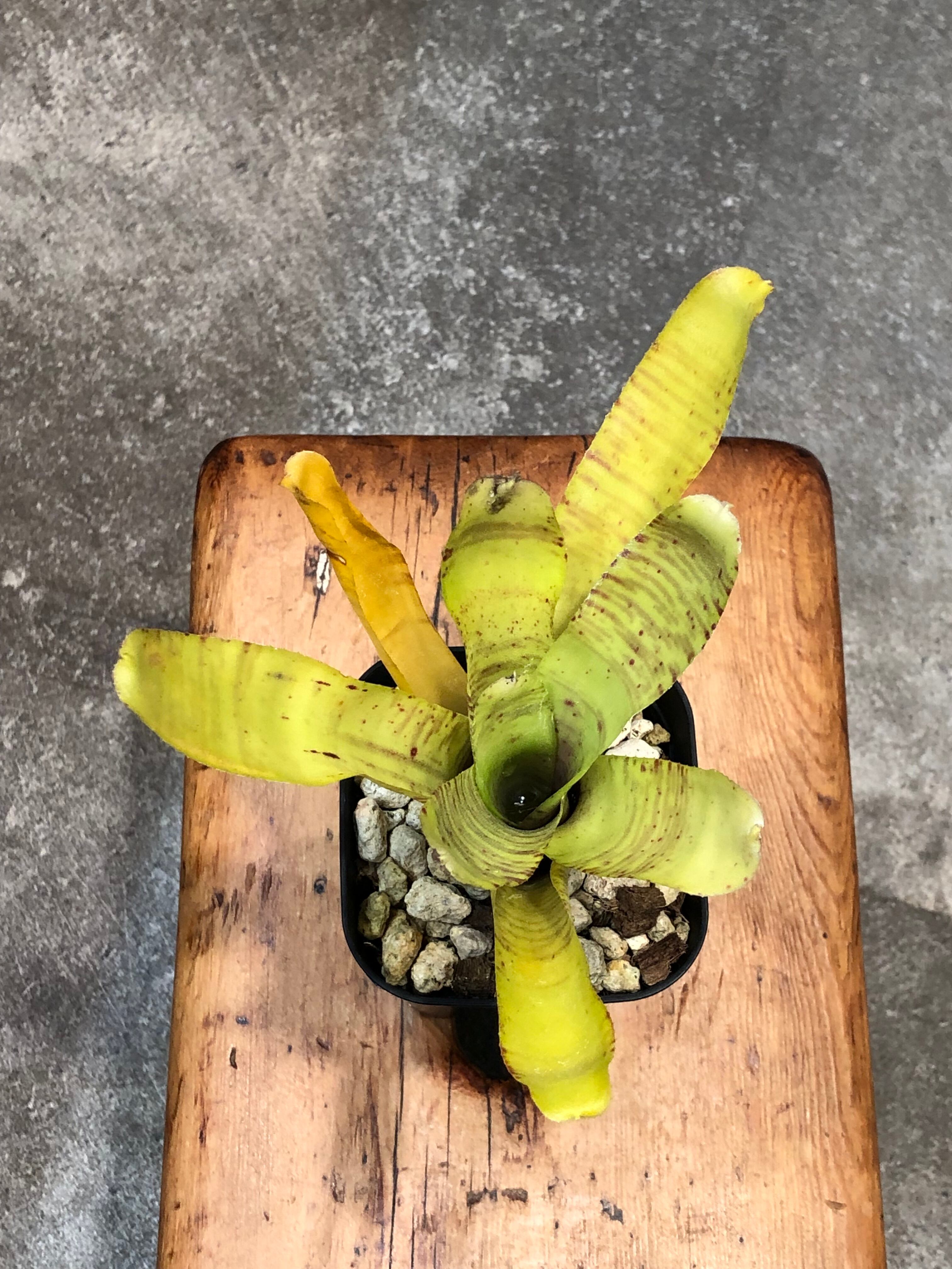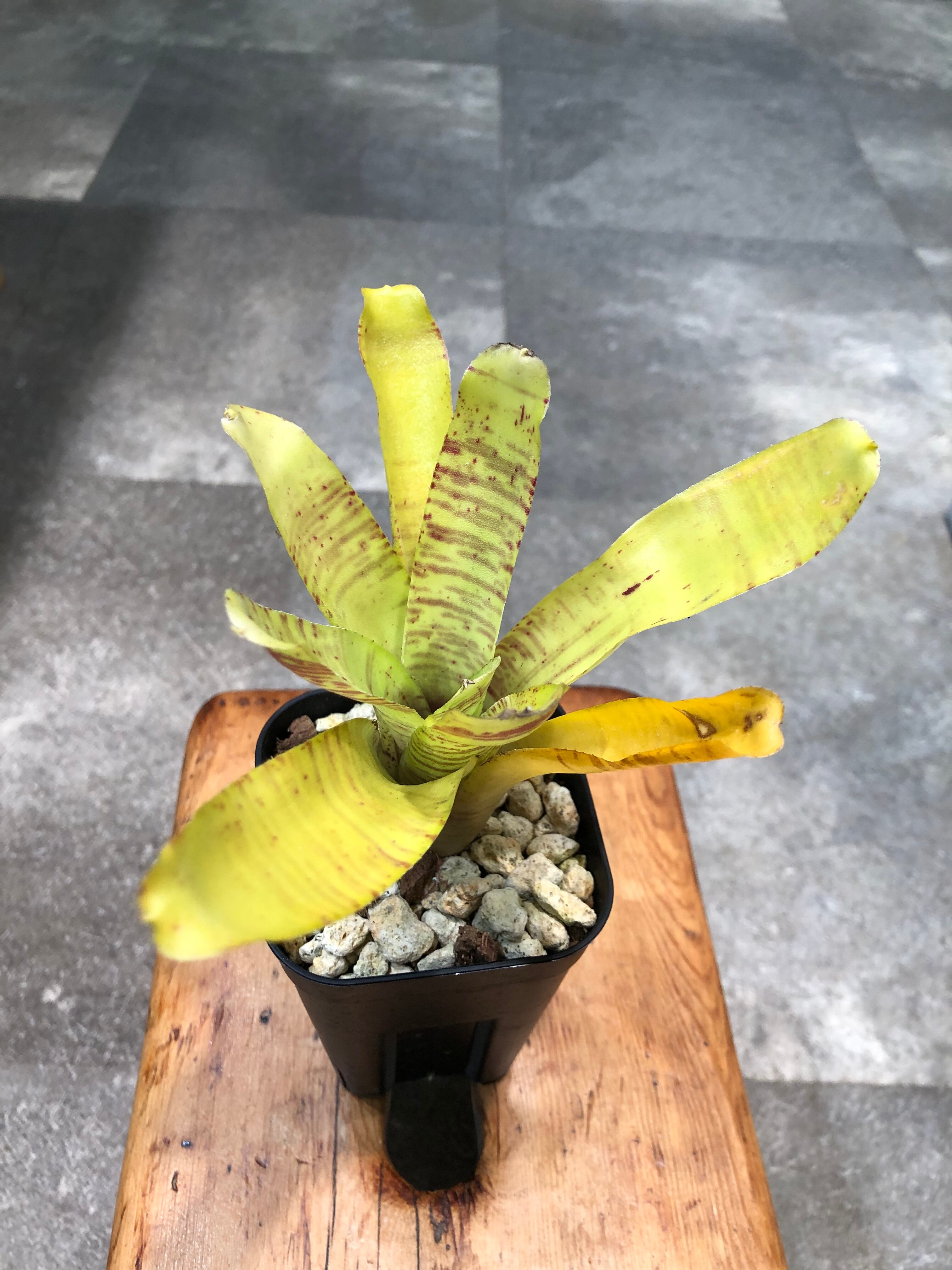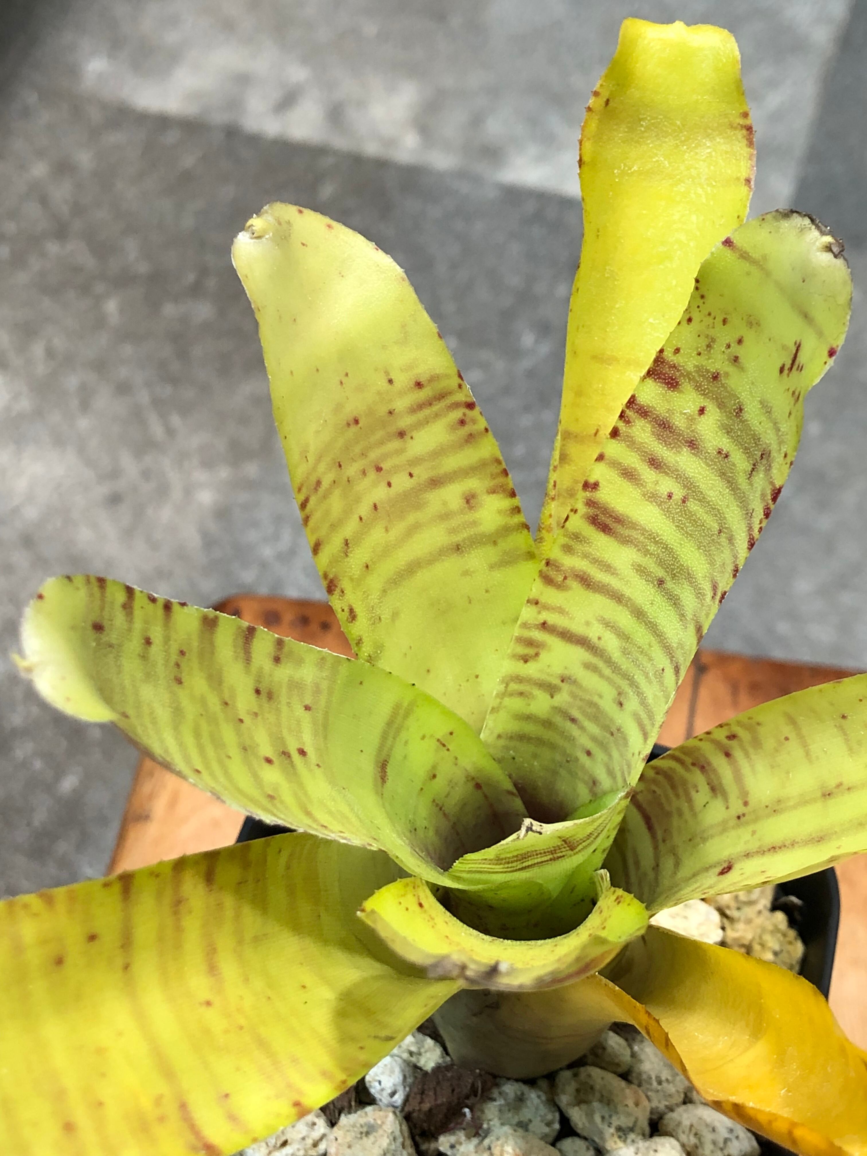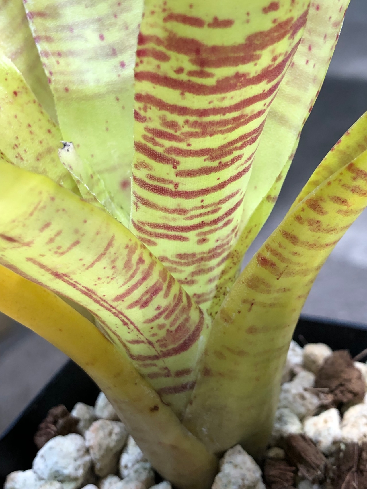南米原産のネオレゲリアの交配種で葉は硬めですが柔軟性があり、黄色に発色し赤い縞模様やドット柄が入る存在感のある品種です。