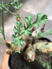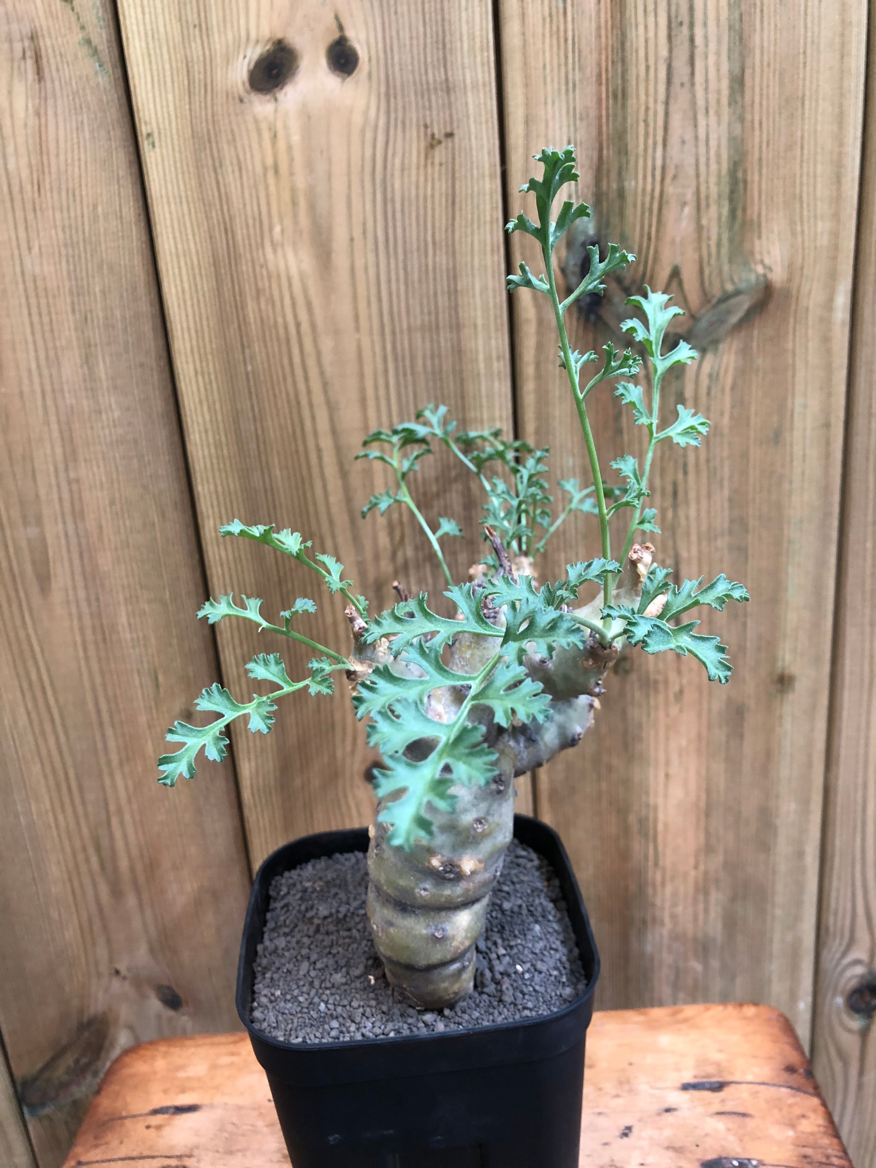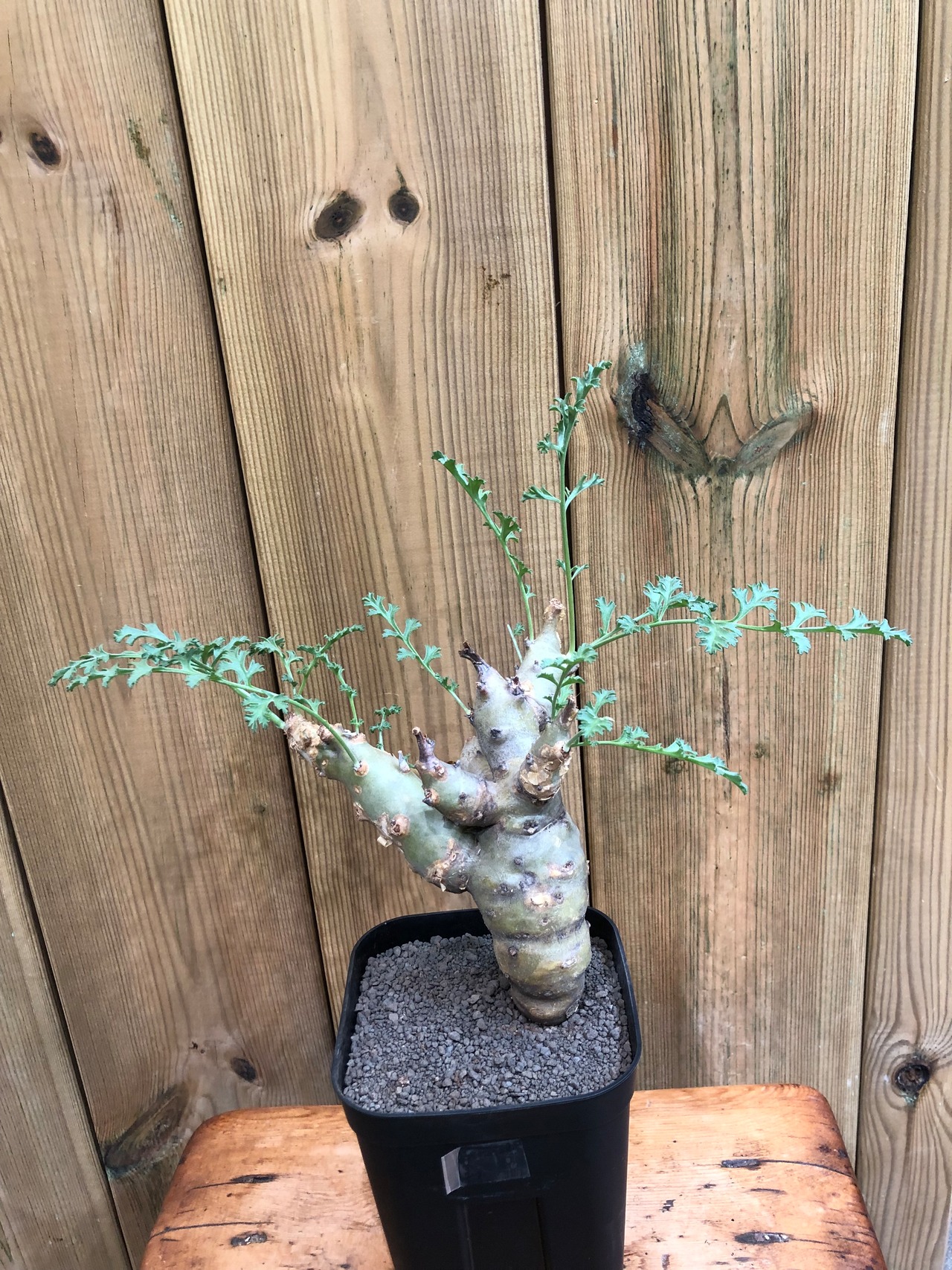 塊根部は滑らかな表皮ですがモコモコとしており少し青白く、深い切れ込みのある柔らかい葉を展開します。