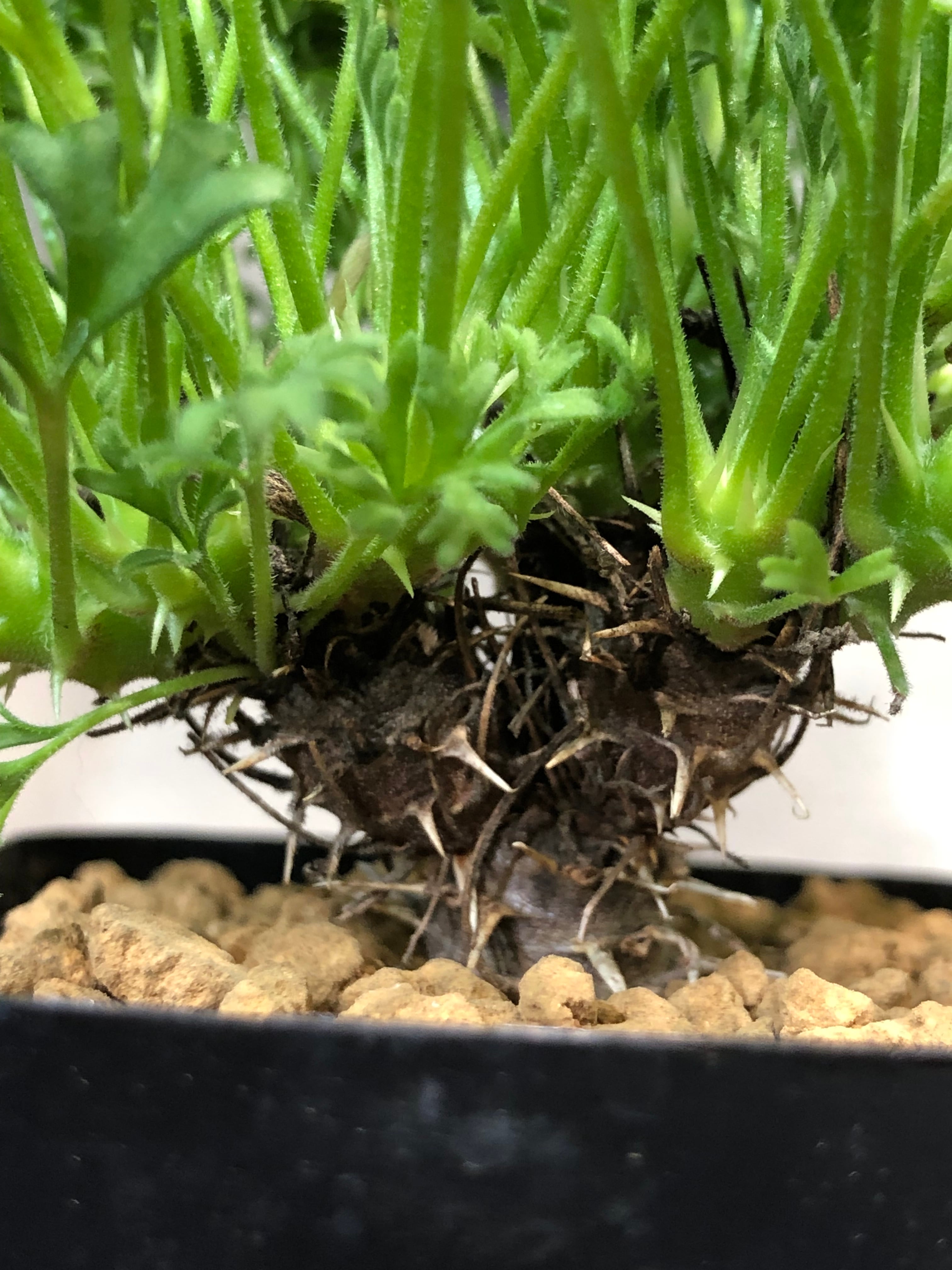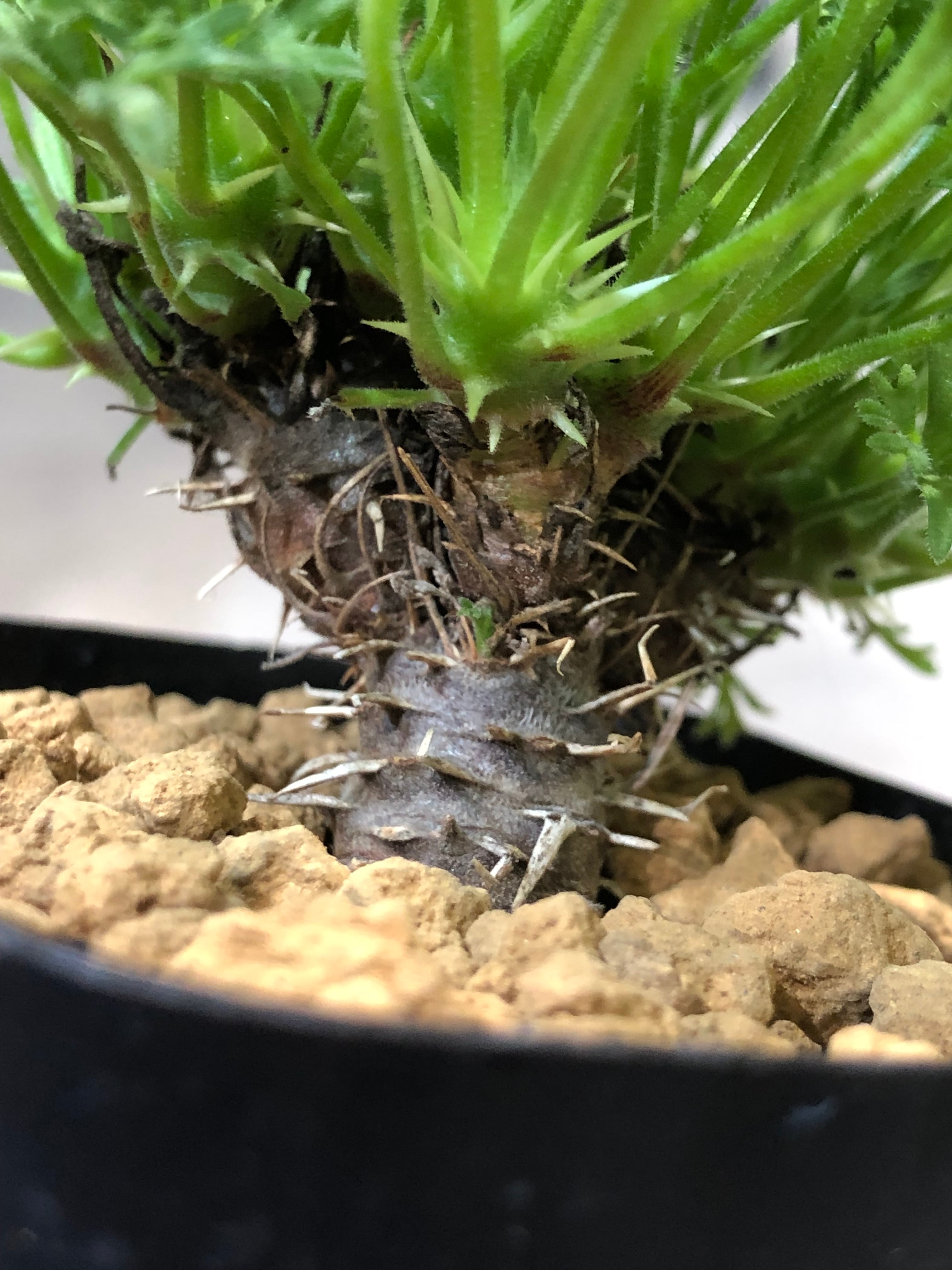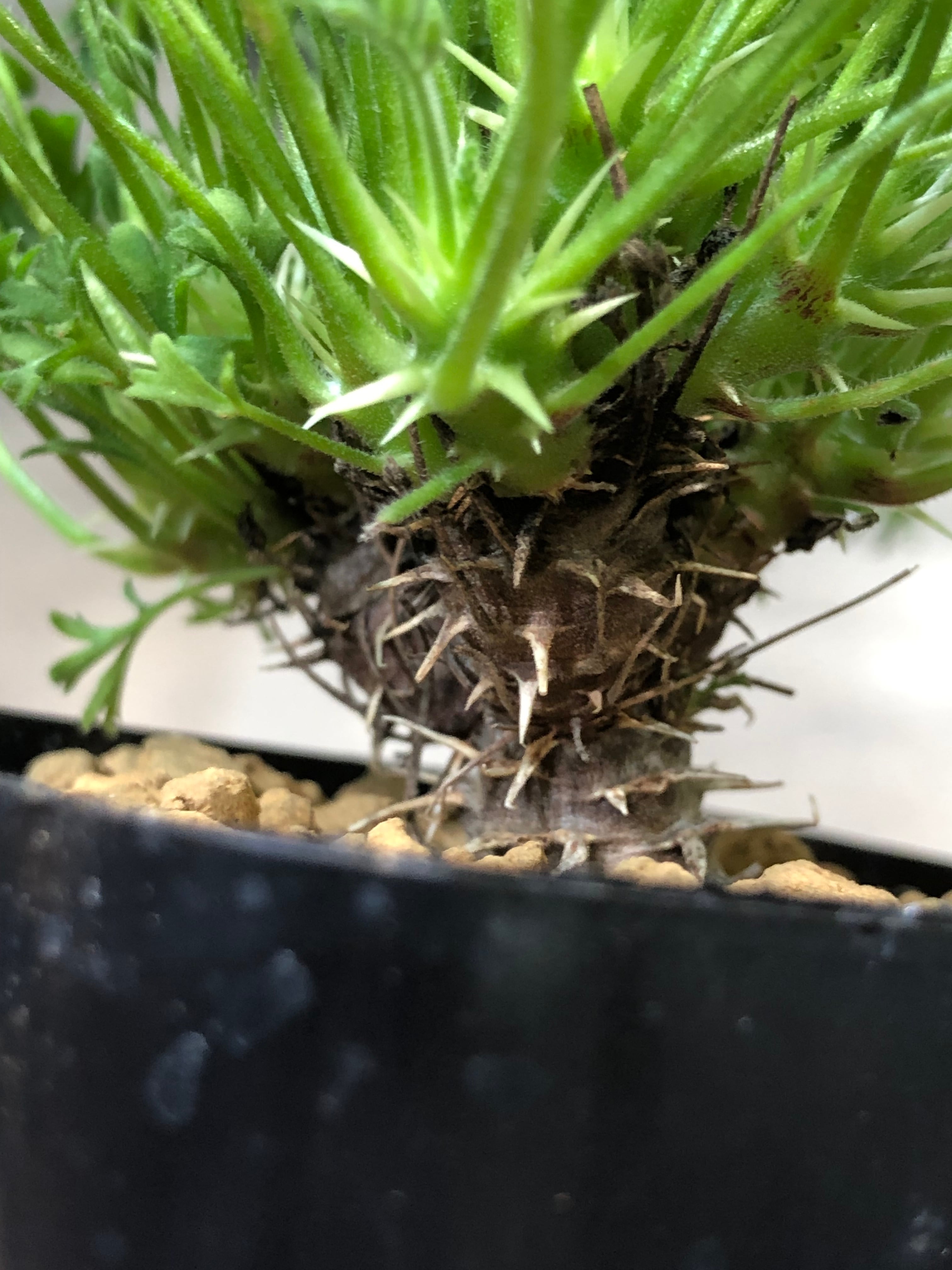 南アフリカ原産の冬型塊根植物で、黒くて刺々しい塊根部から深い切れ込みの入った柔らかい葉を展開します。