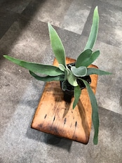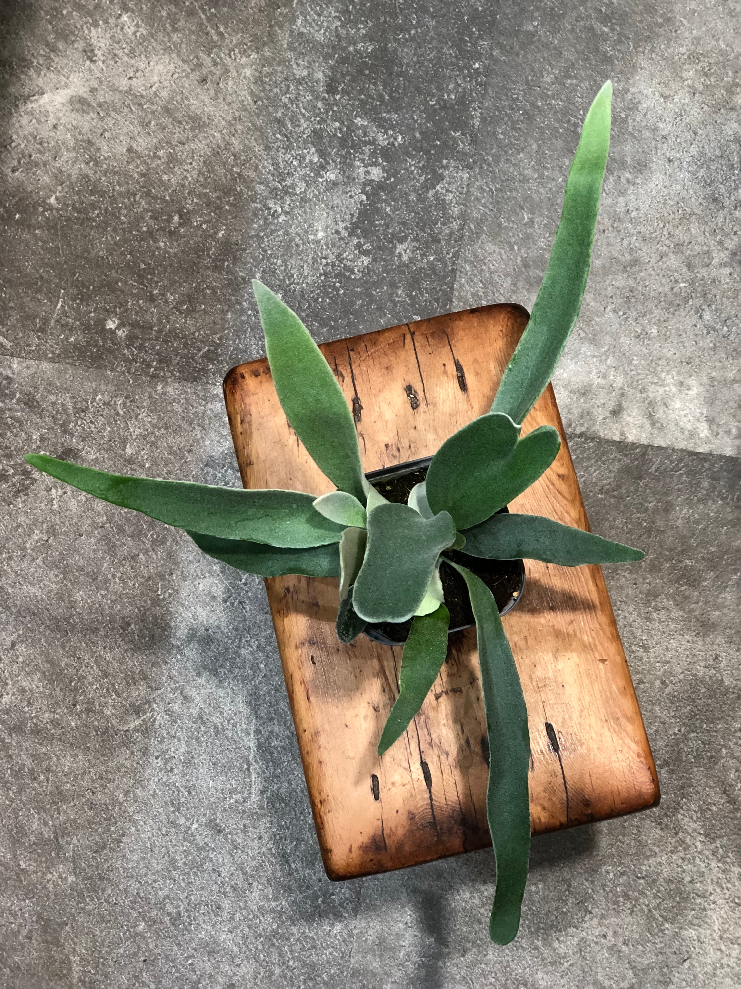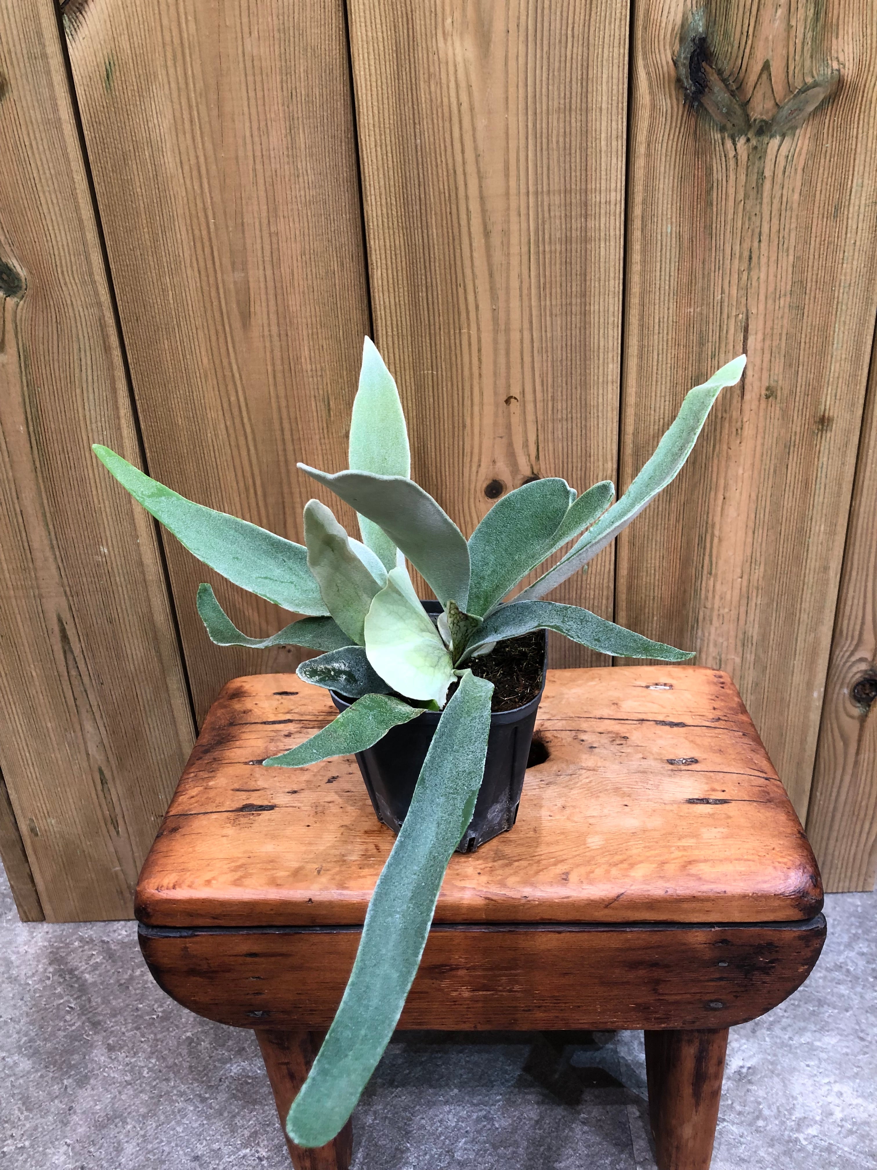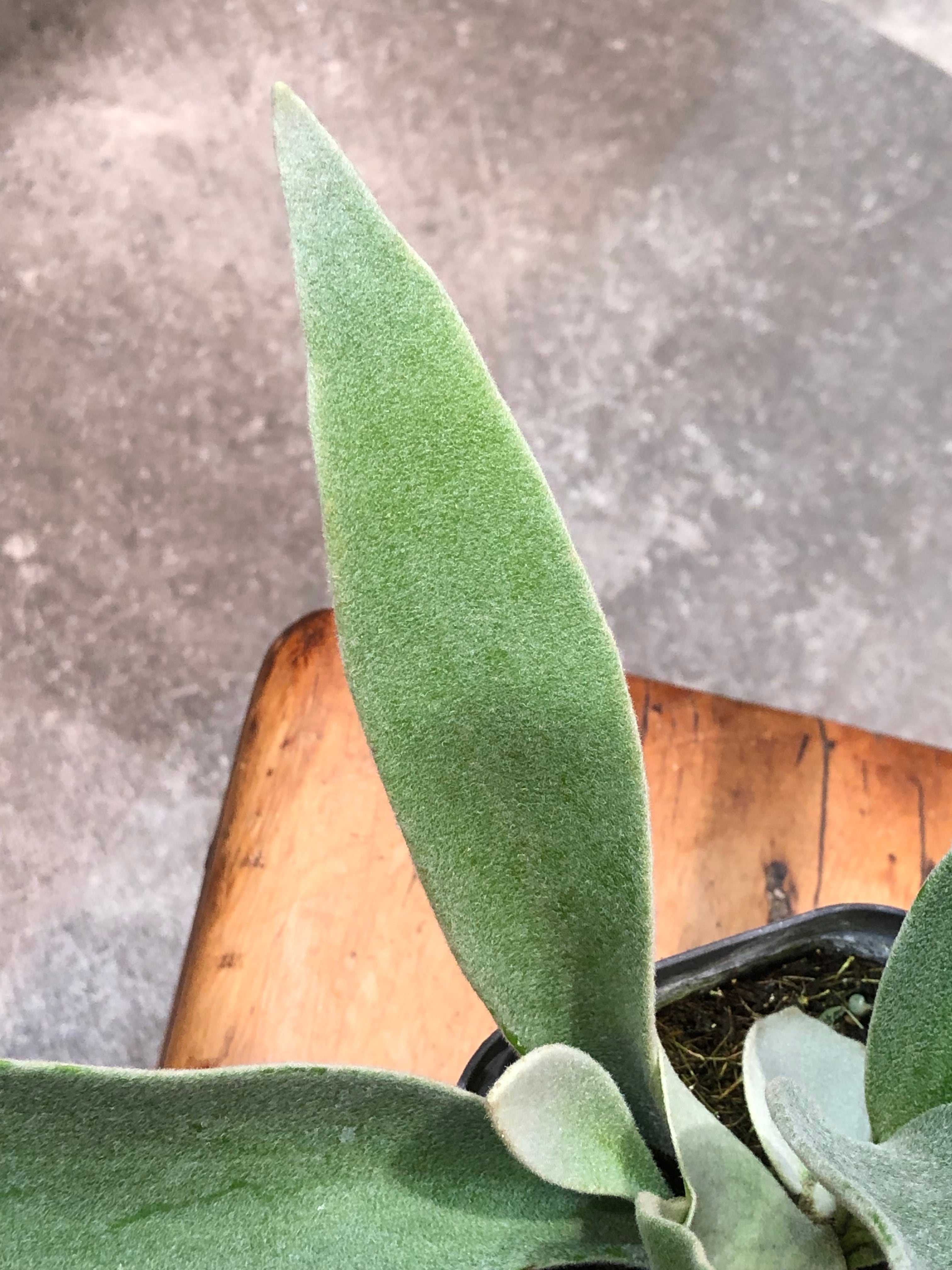 オーストラリア原産のビカクシダで、胞子葉はトリコームに覆われ白っぽく見え肉厚で陽射しや乾燥にも強く育て易い品種です。