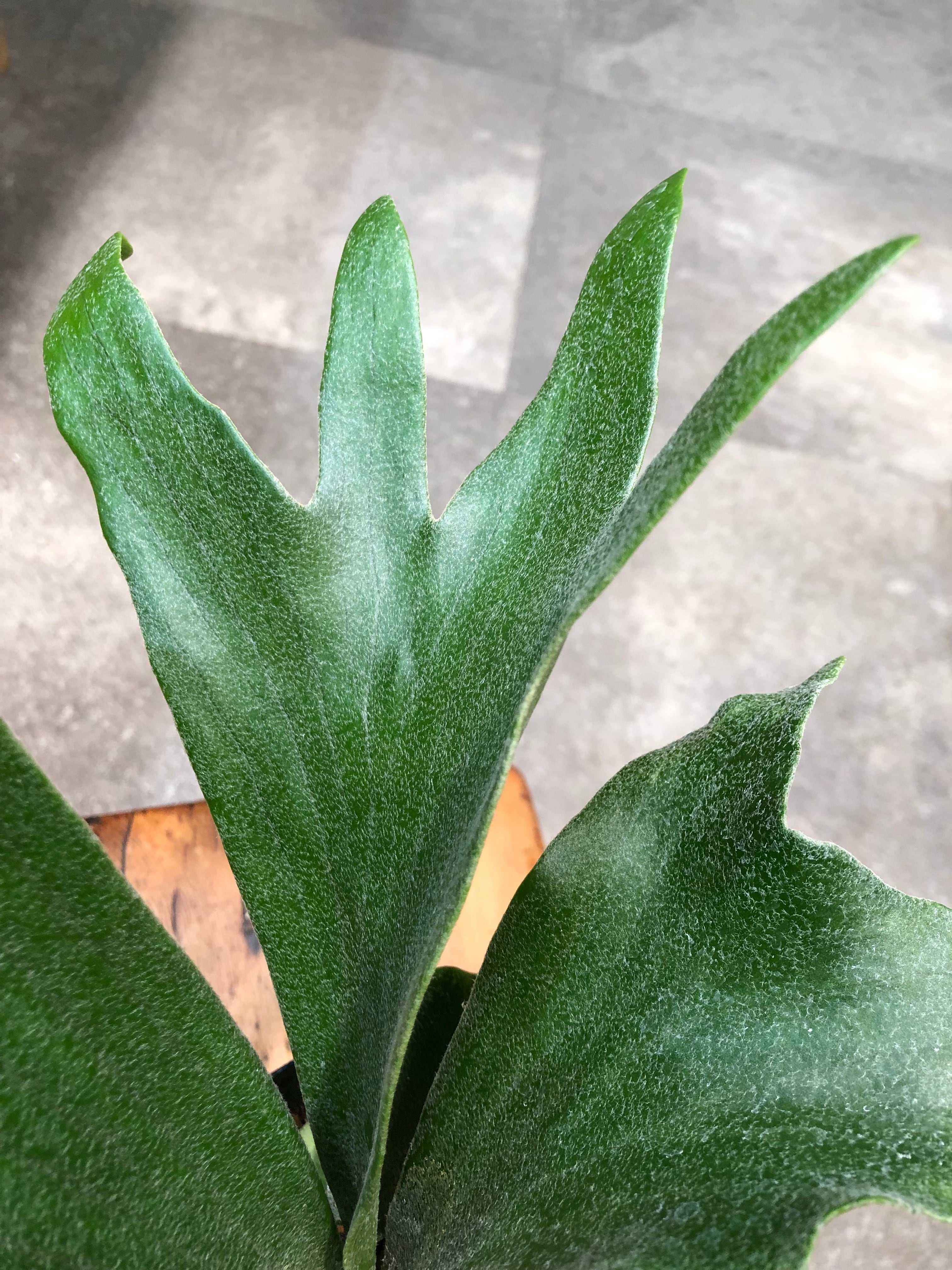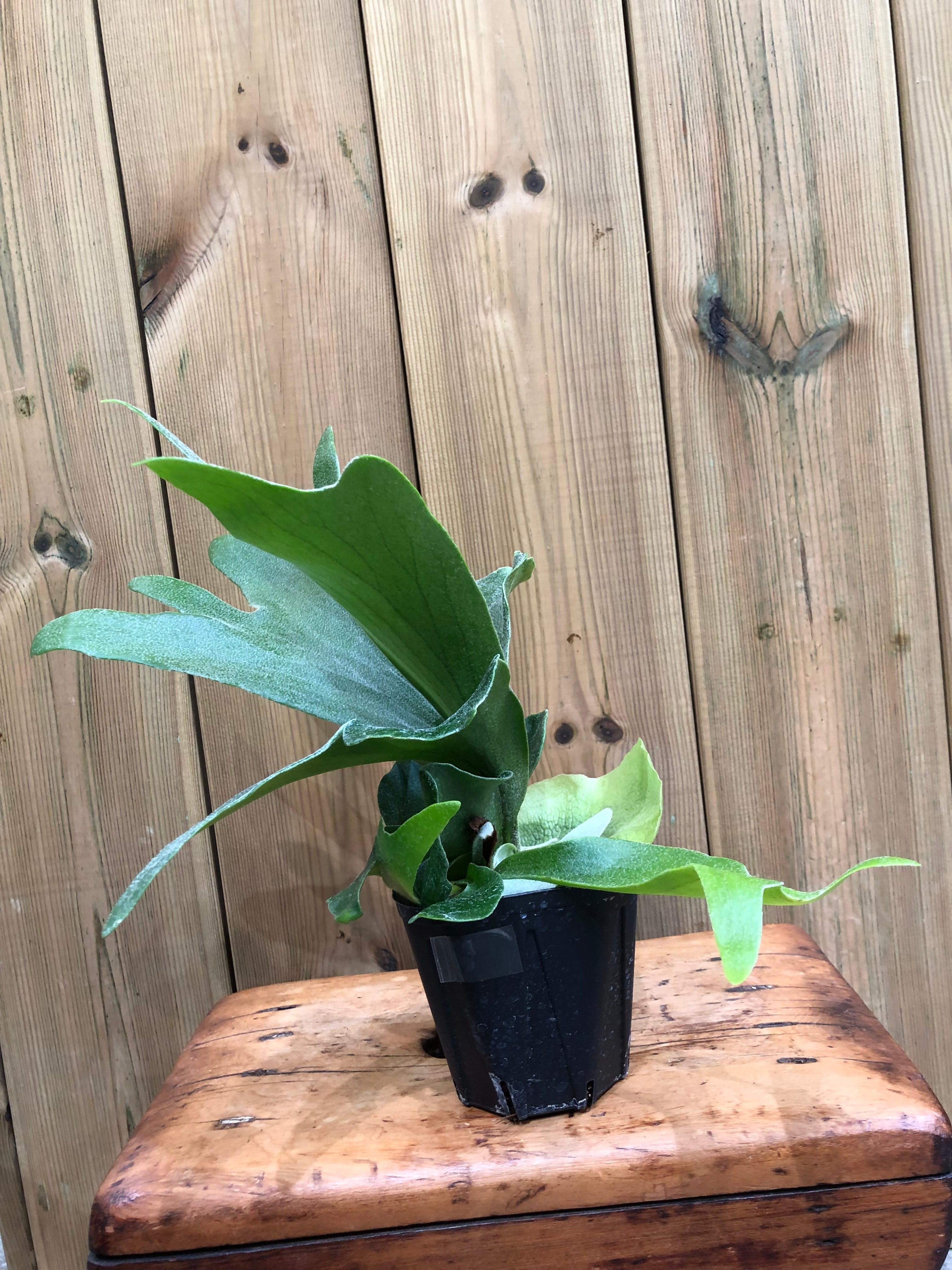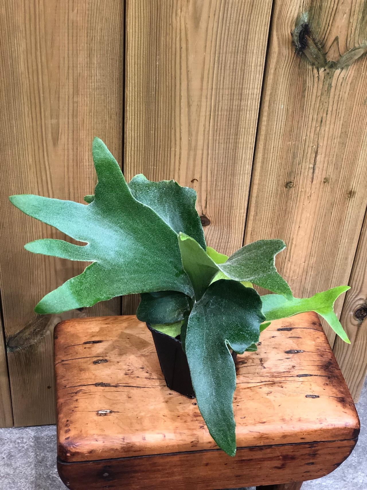 アフリカ大陸原産のビカクシダで胞子葉は肉厚で幅広く葉先は深く切れ込みが入ります。