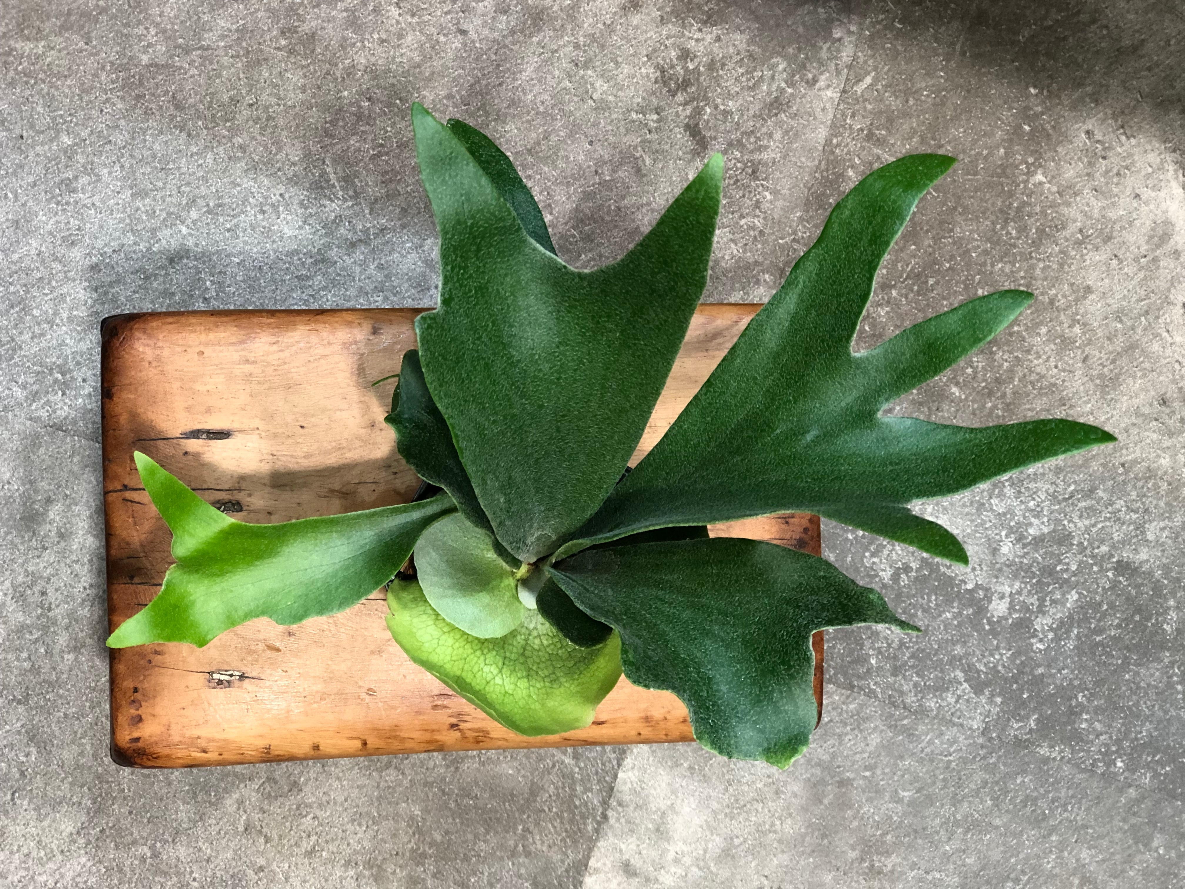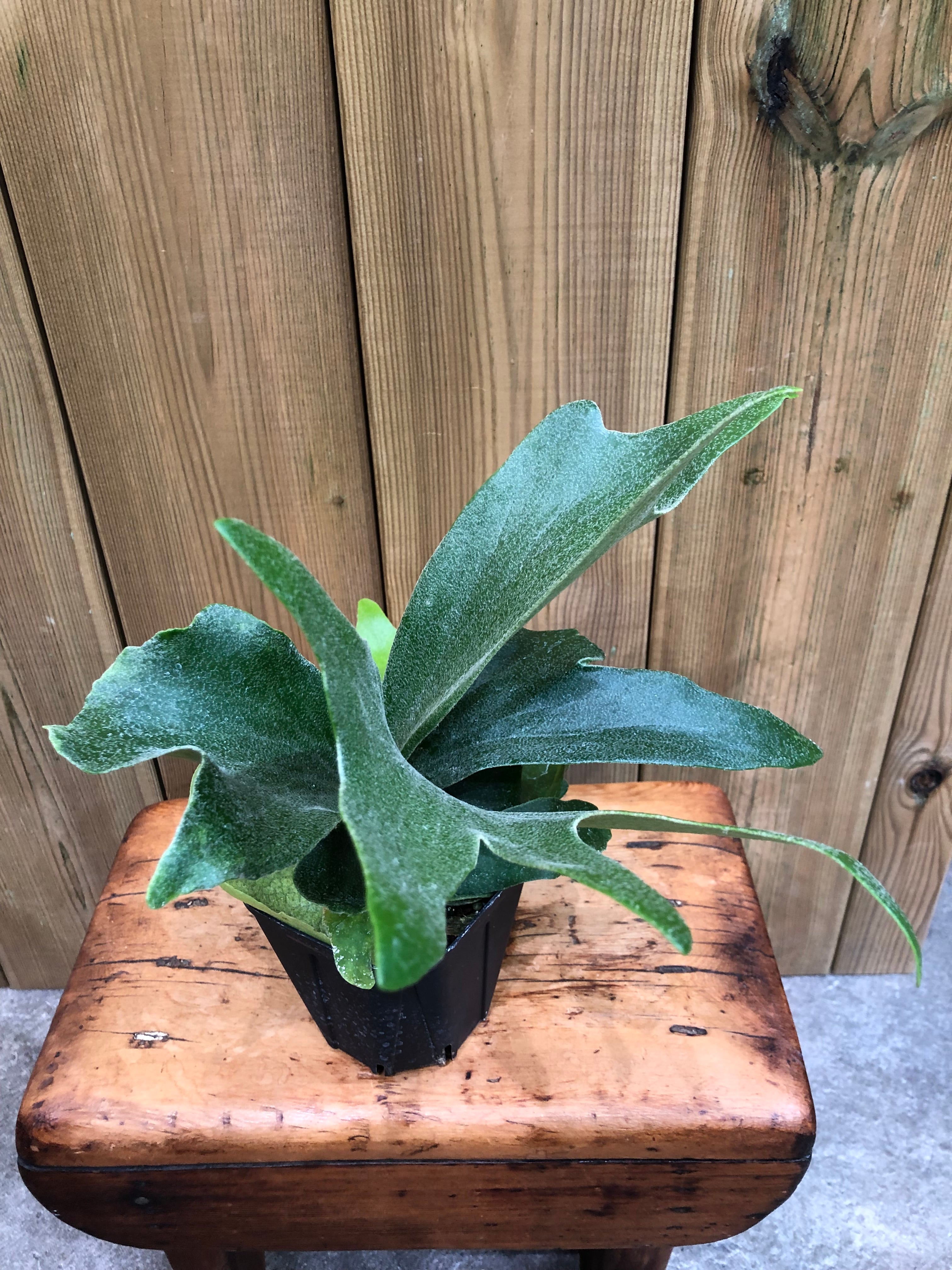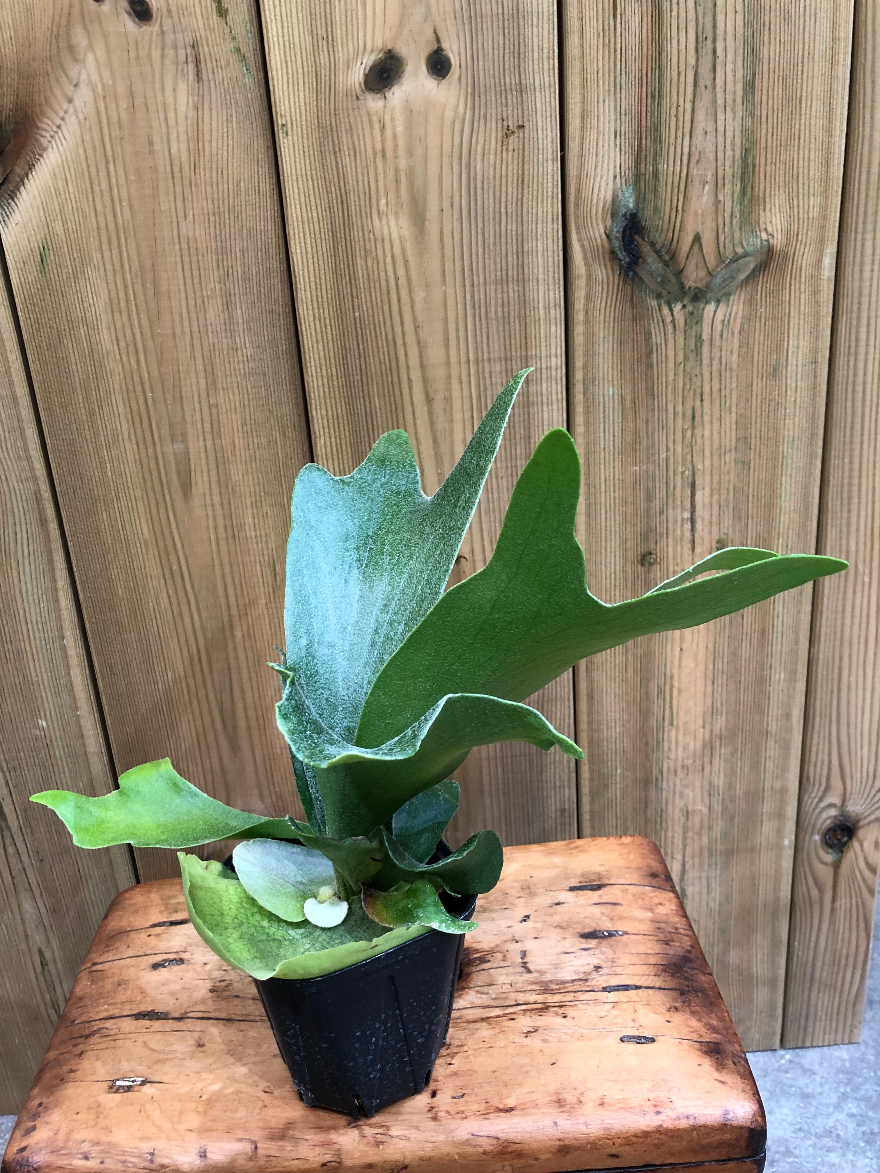 アフリカ大陸原産のビカクシダで胞子葉は肉厚で幅広く葉先は深く切れ込みが入ります。