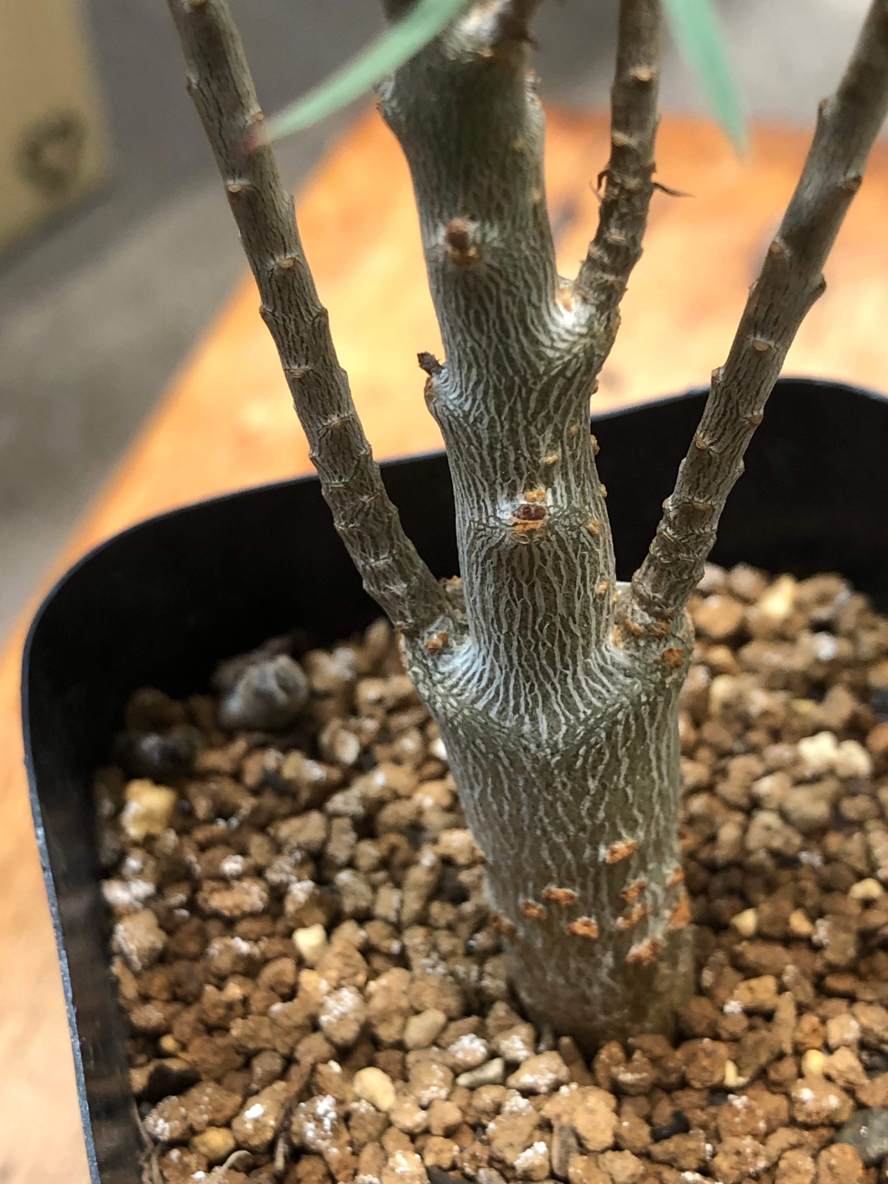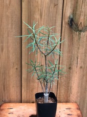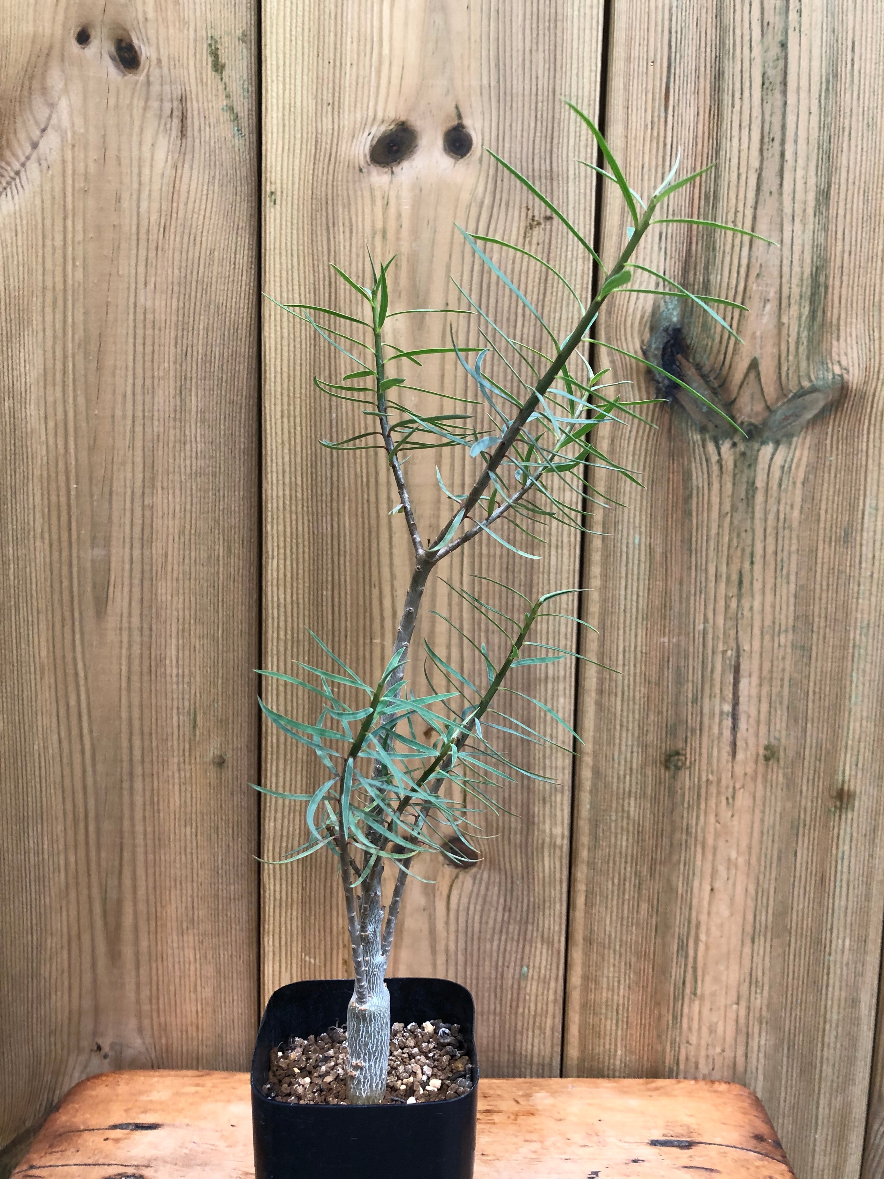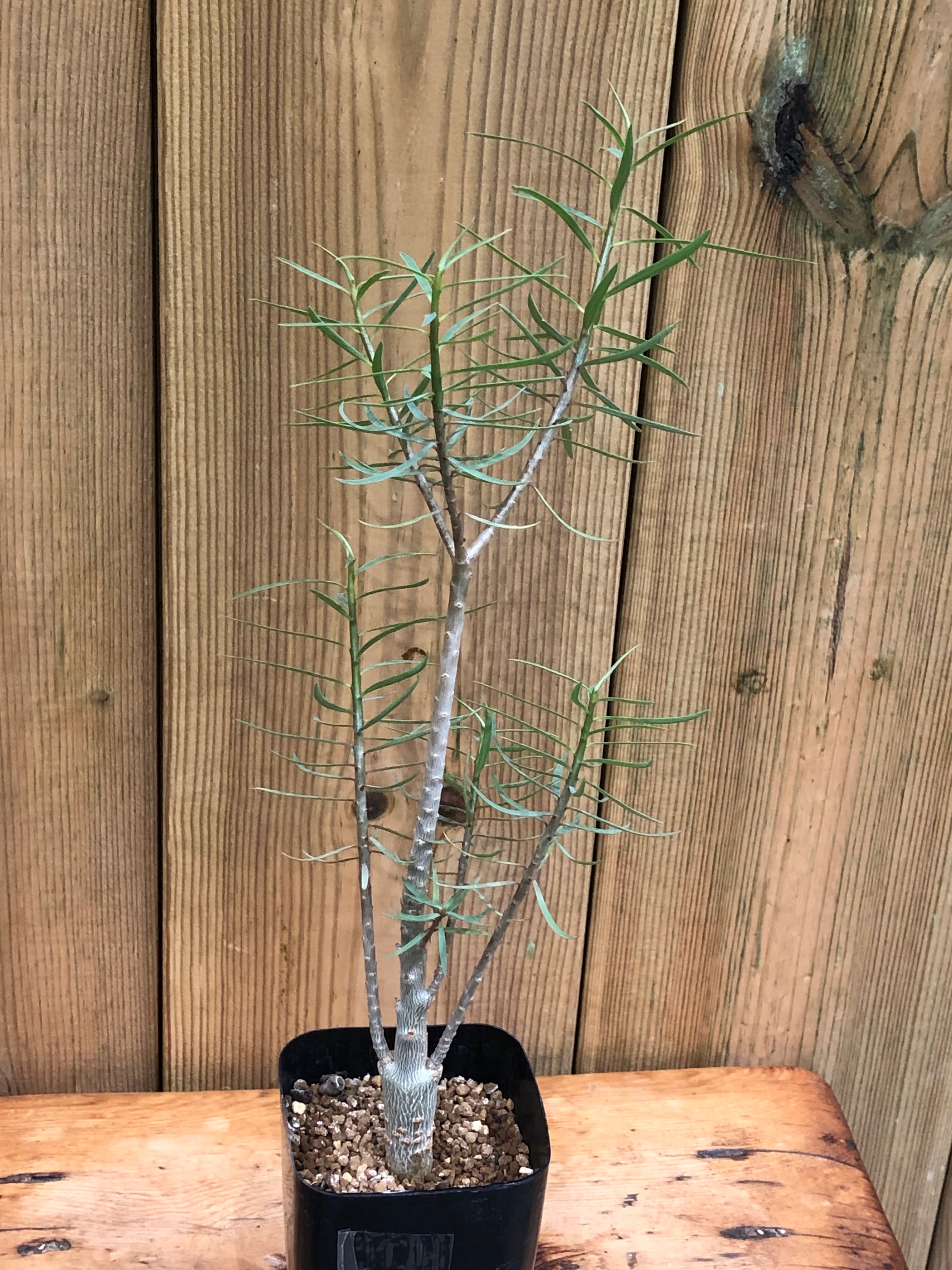 カナリア諸島原産の冬型塊根植物で、幹はツルッとした表皮で夏型塊根植物のアデニウムの様な質感で徐々に太っていき、塊根部から枝を伸ばし細長く青白い葉を繁らせます。