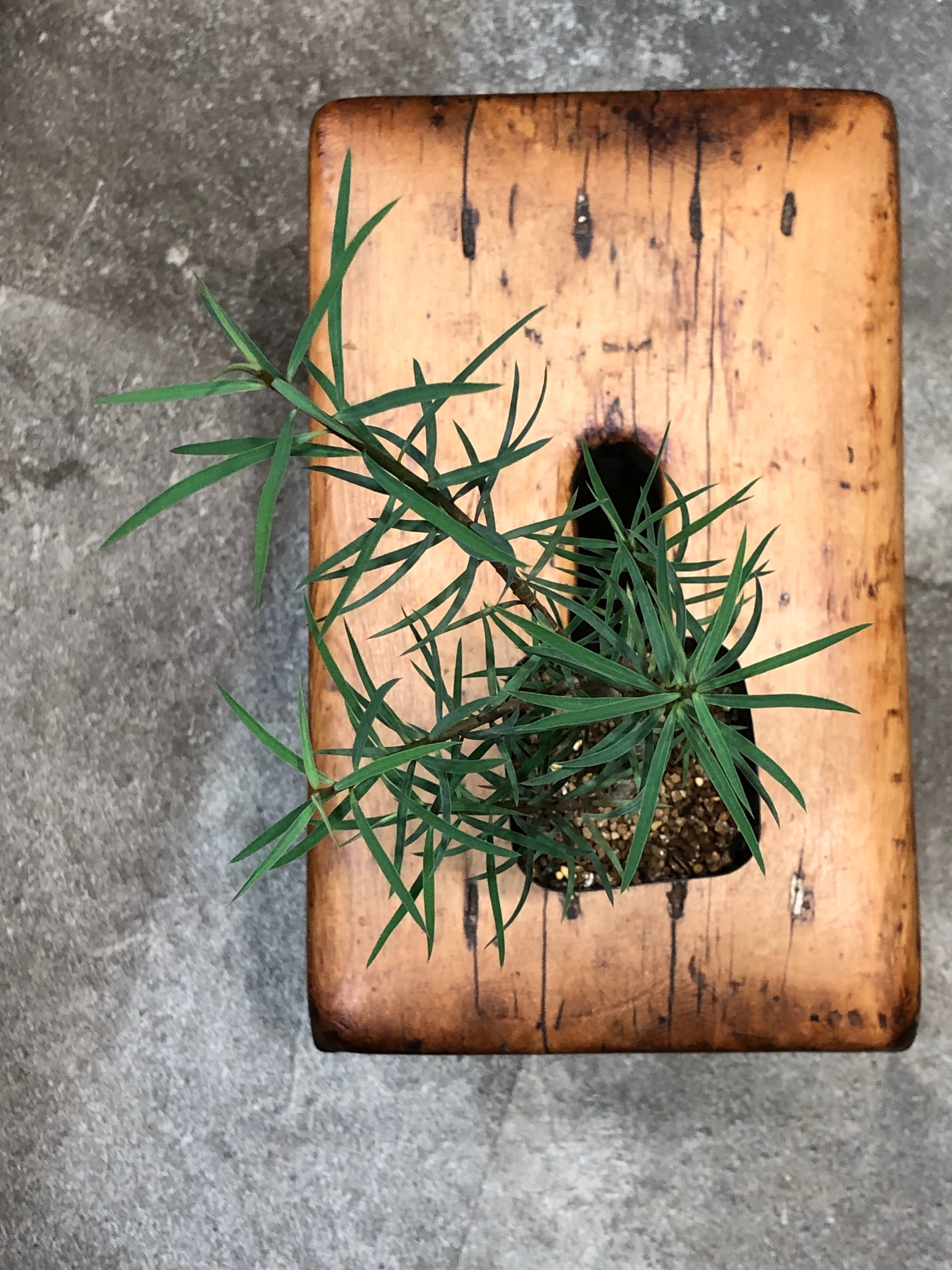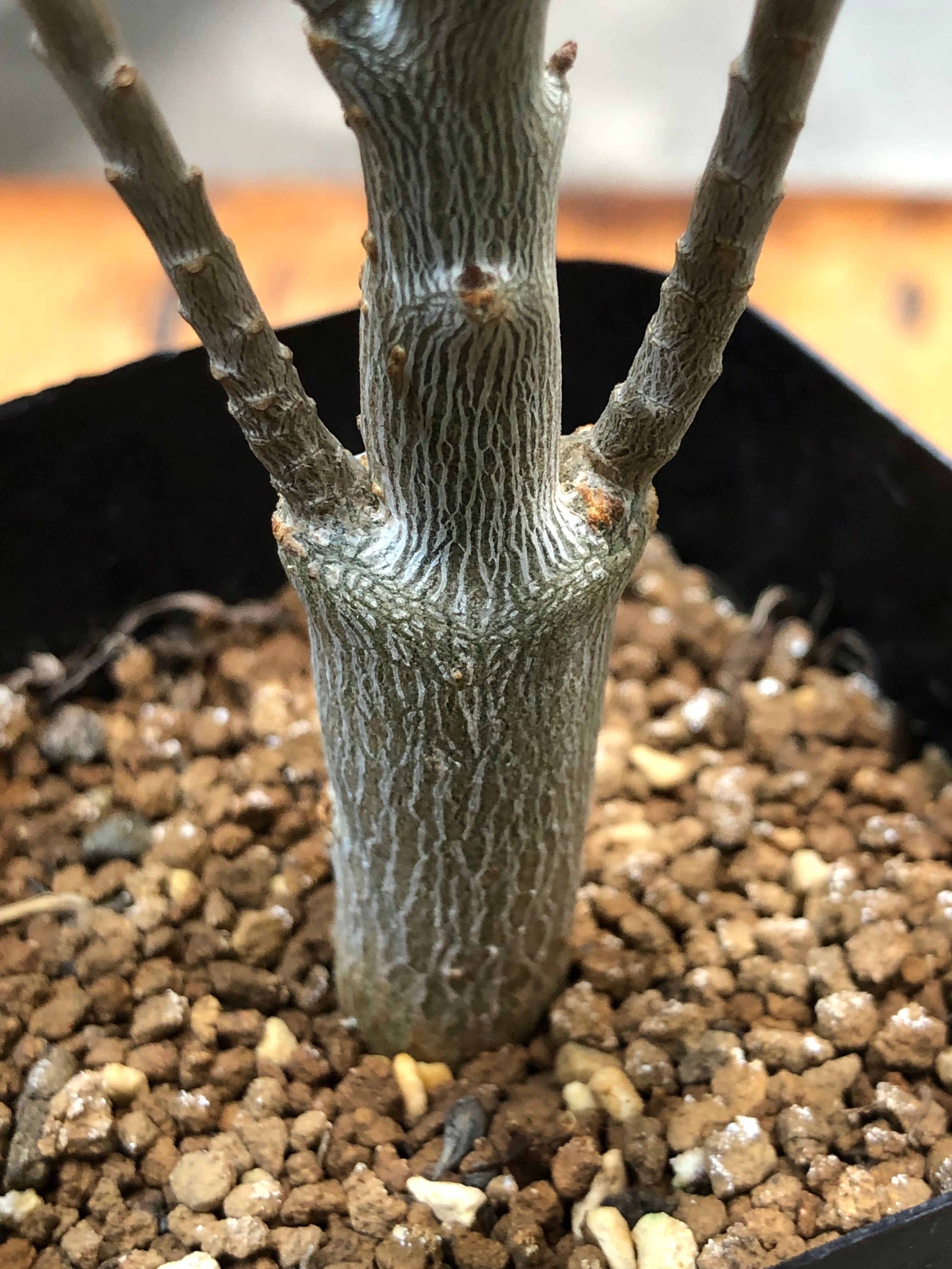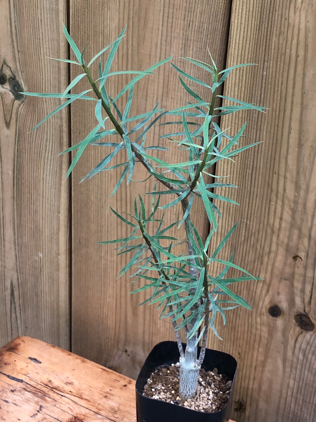 カナリア諸島原産の冬型塊根植物で、幹はツルッとした表皮で夏型塊根植物のアデニウムの様な質感で徐々に太っていき、塊根部から枝を伸ばし細長く青白い葉を繁らせます。
