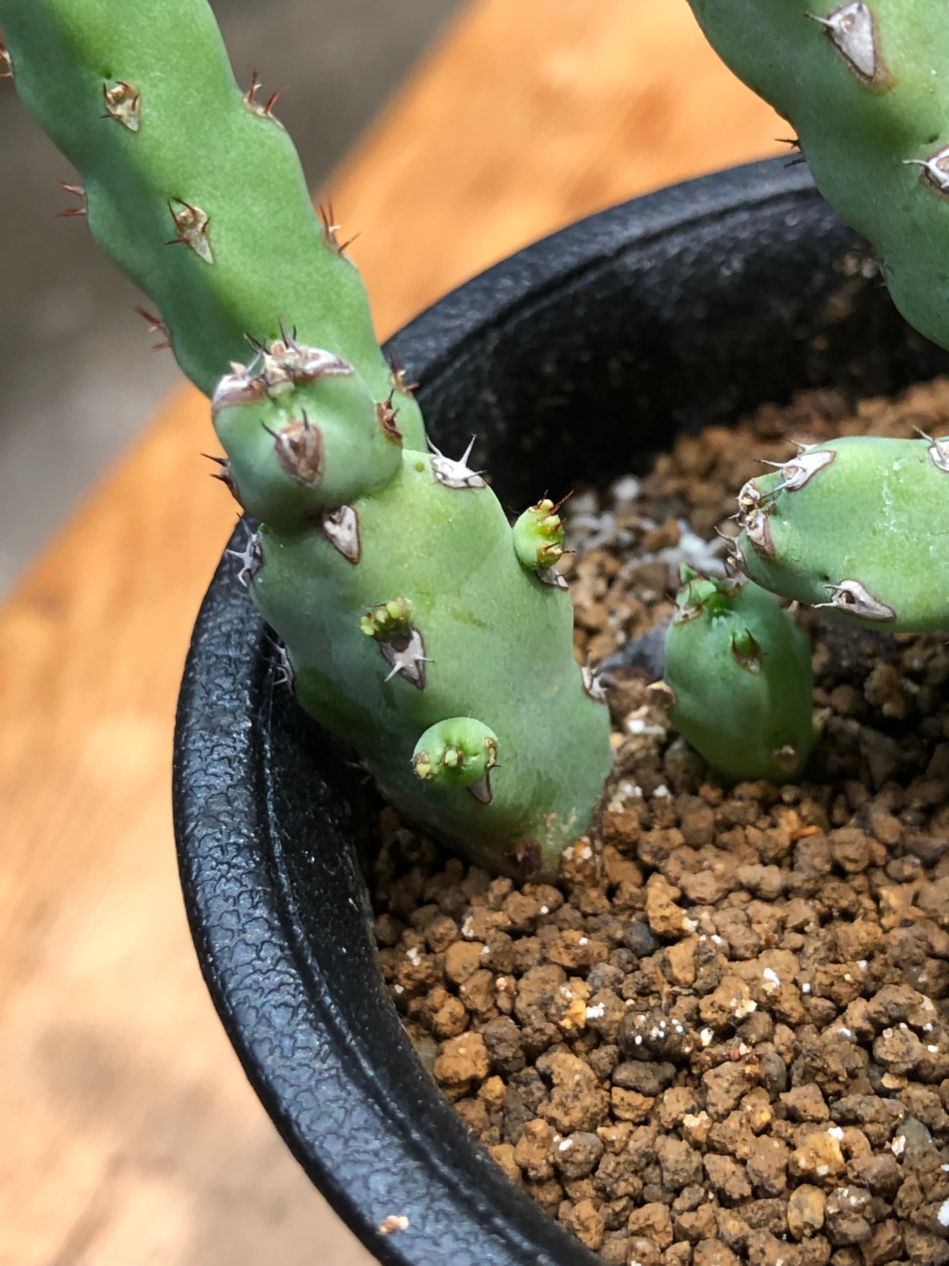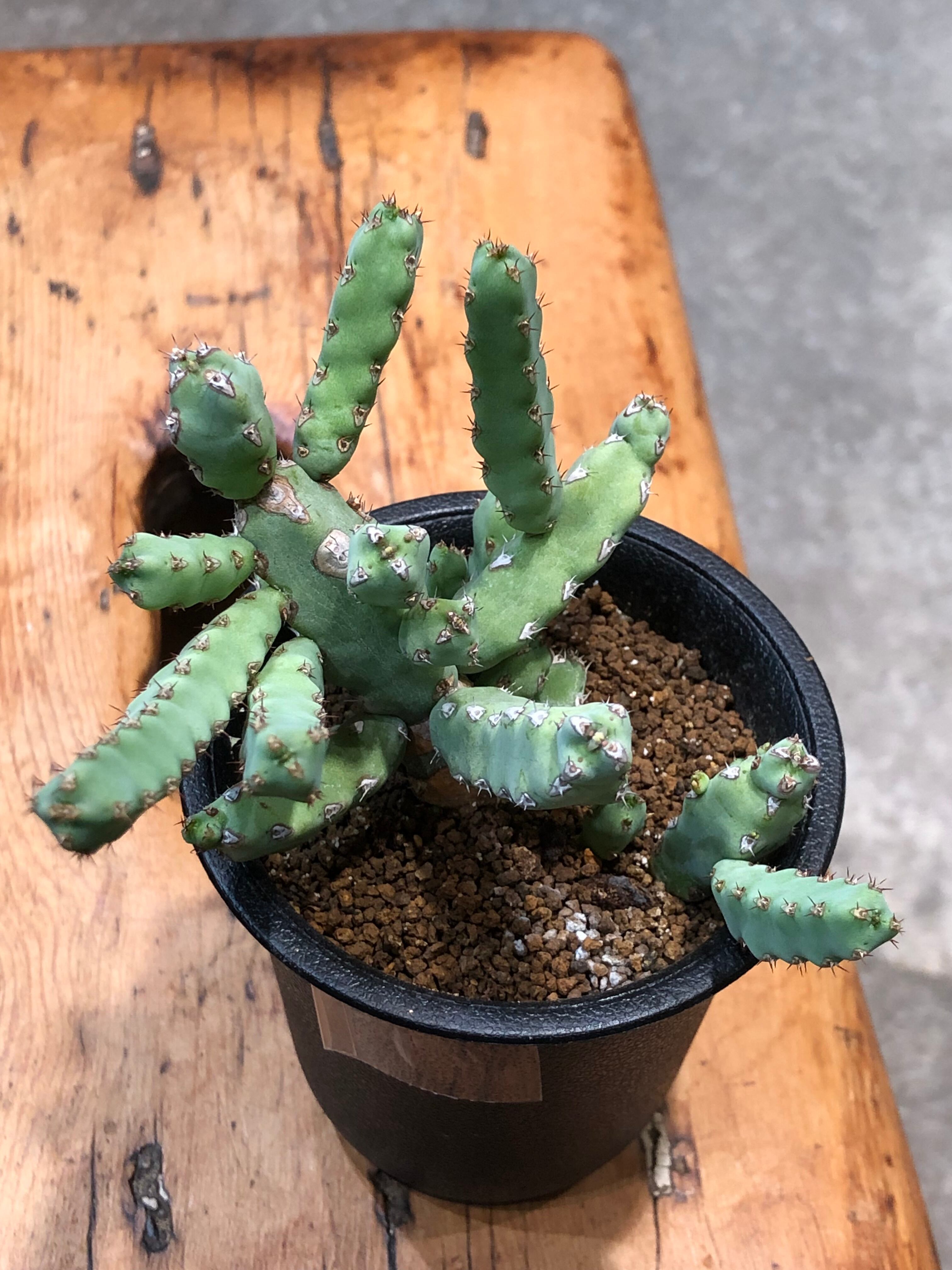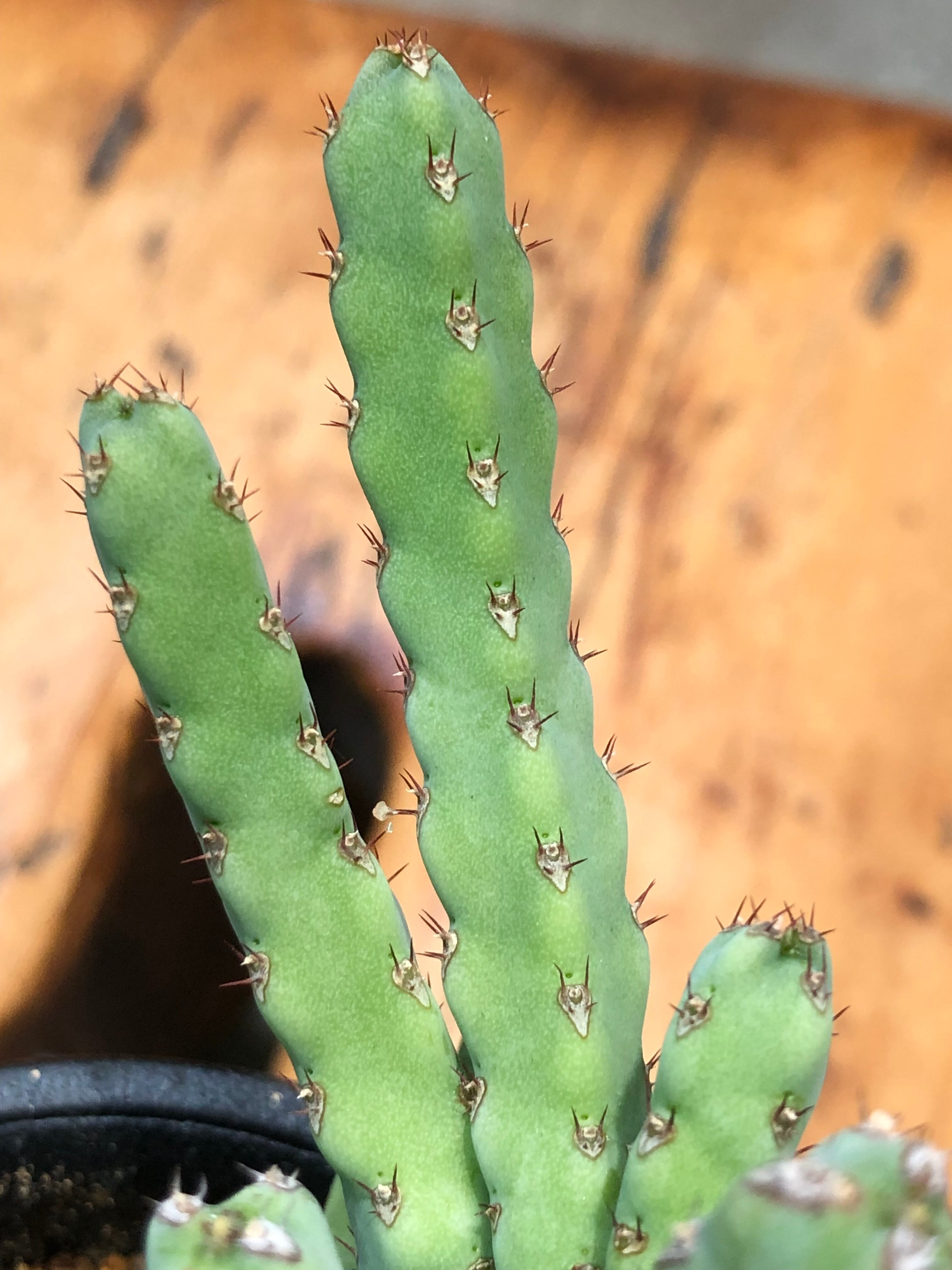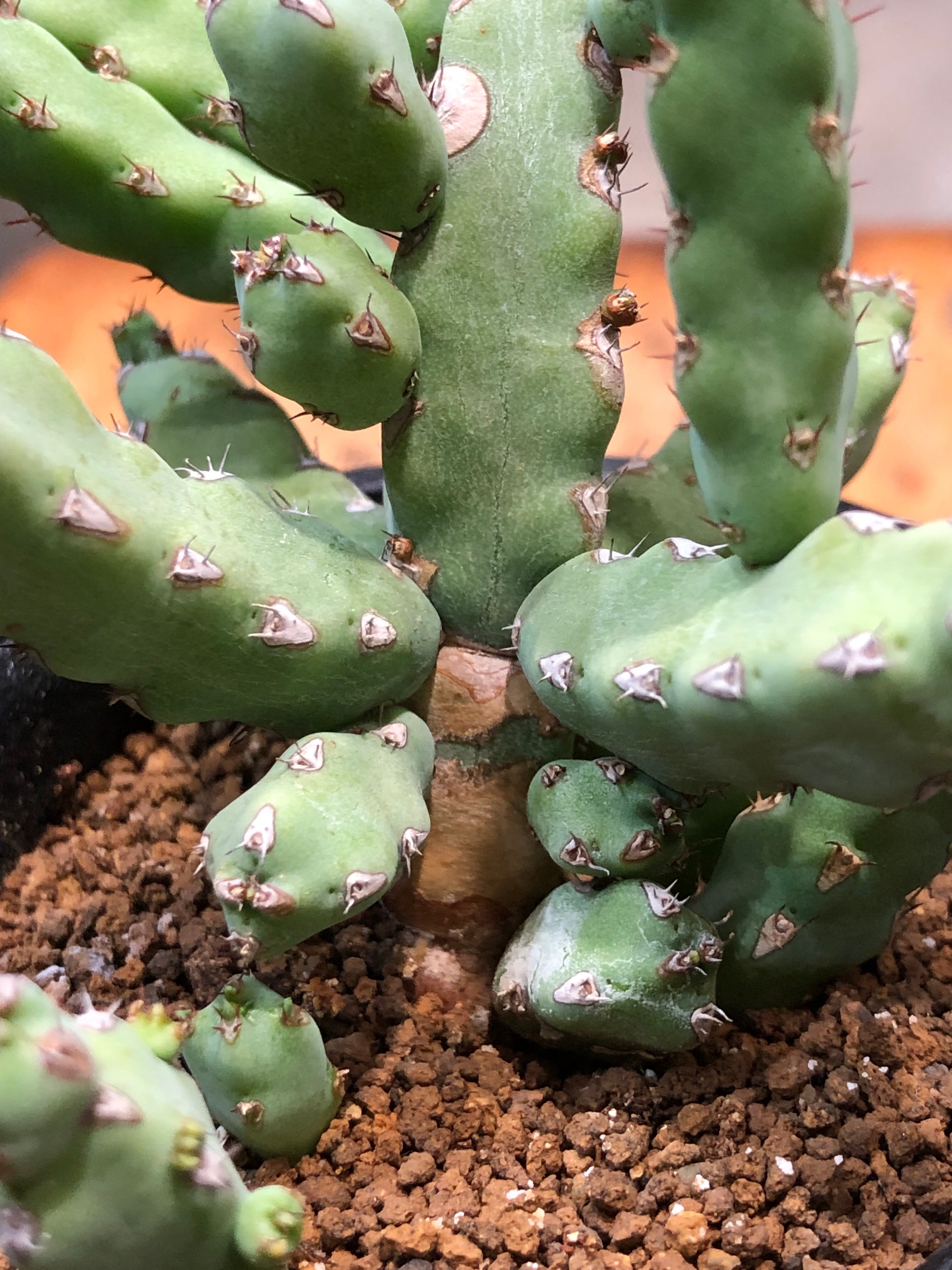 稜に沿って小さな棘があり小さなサボテンの様でもあり、株元から木質化します。