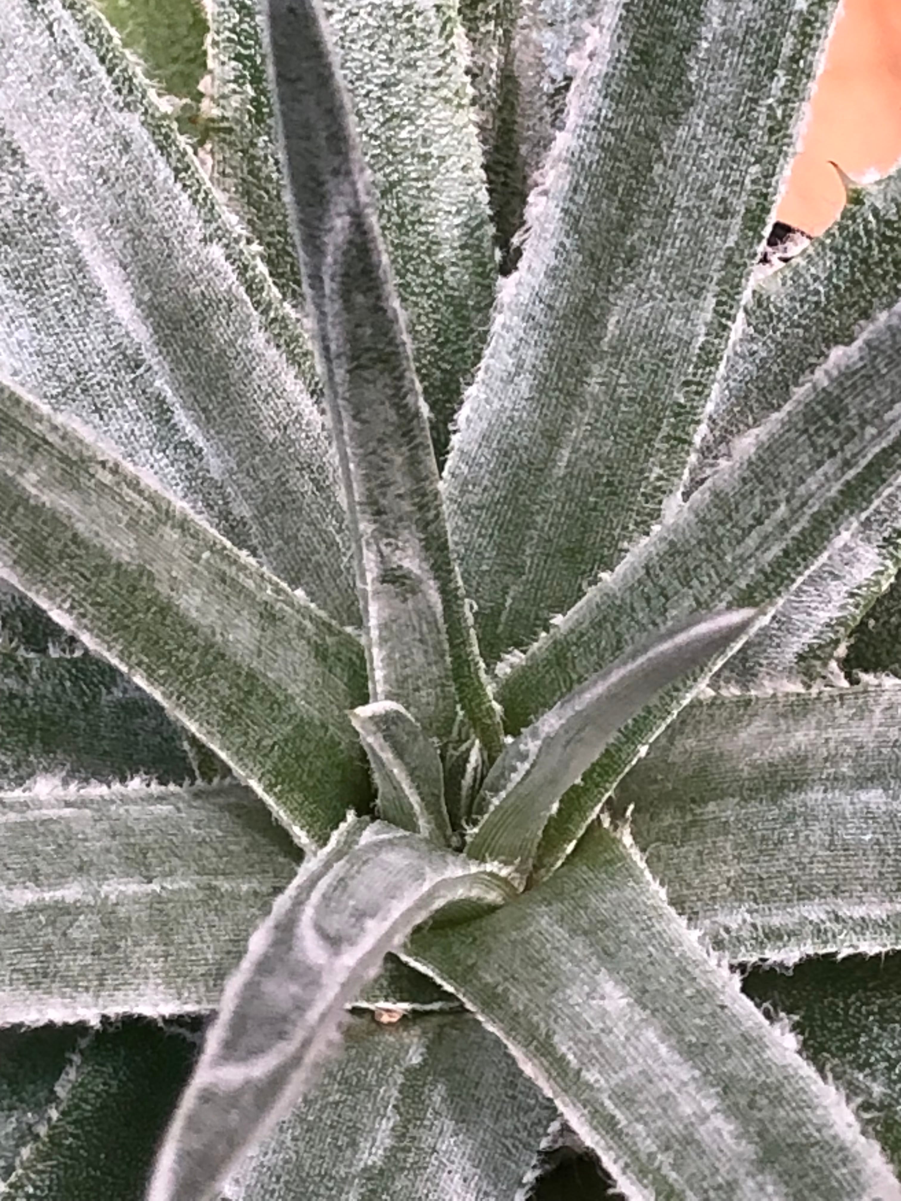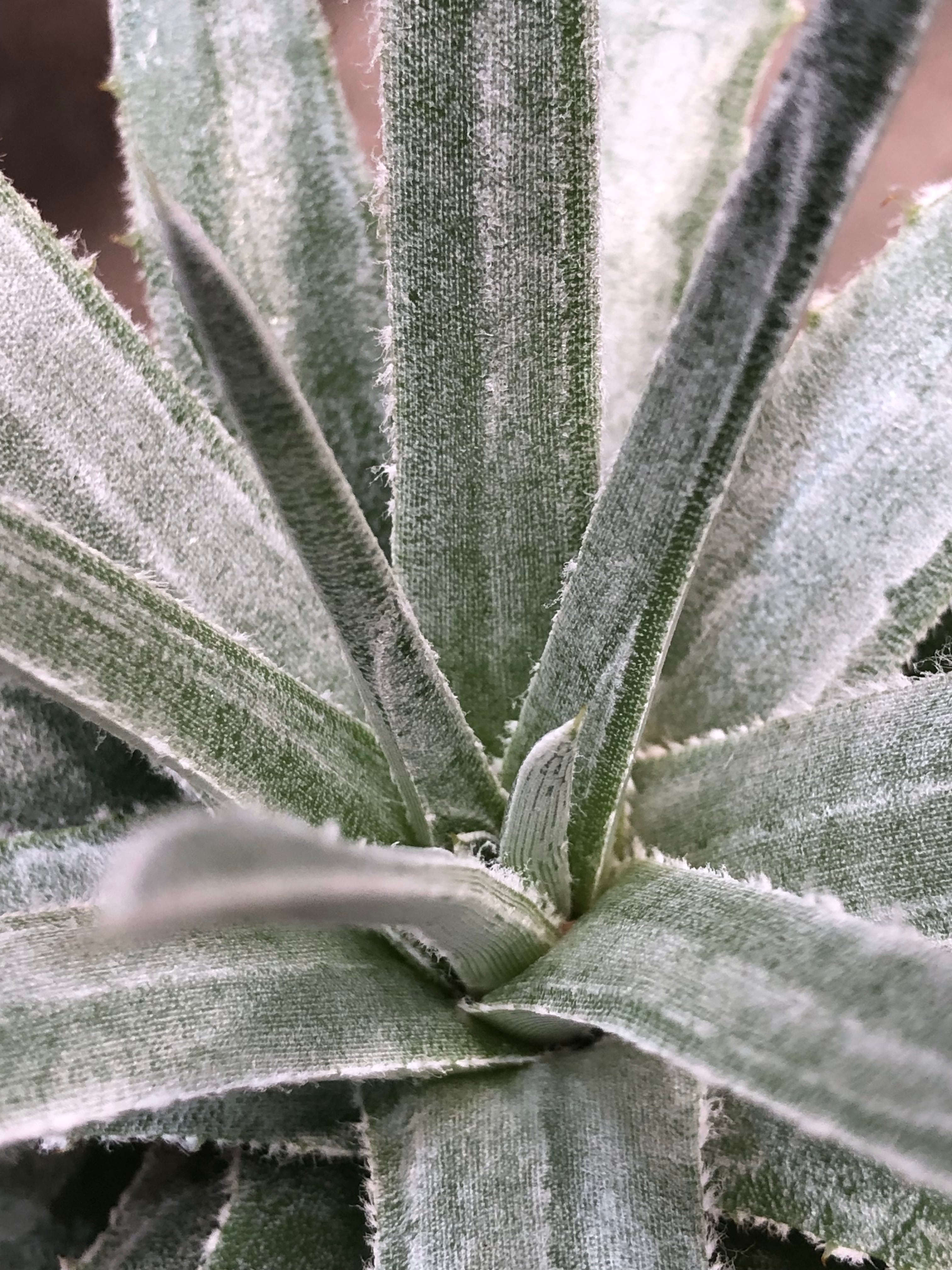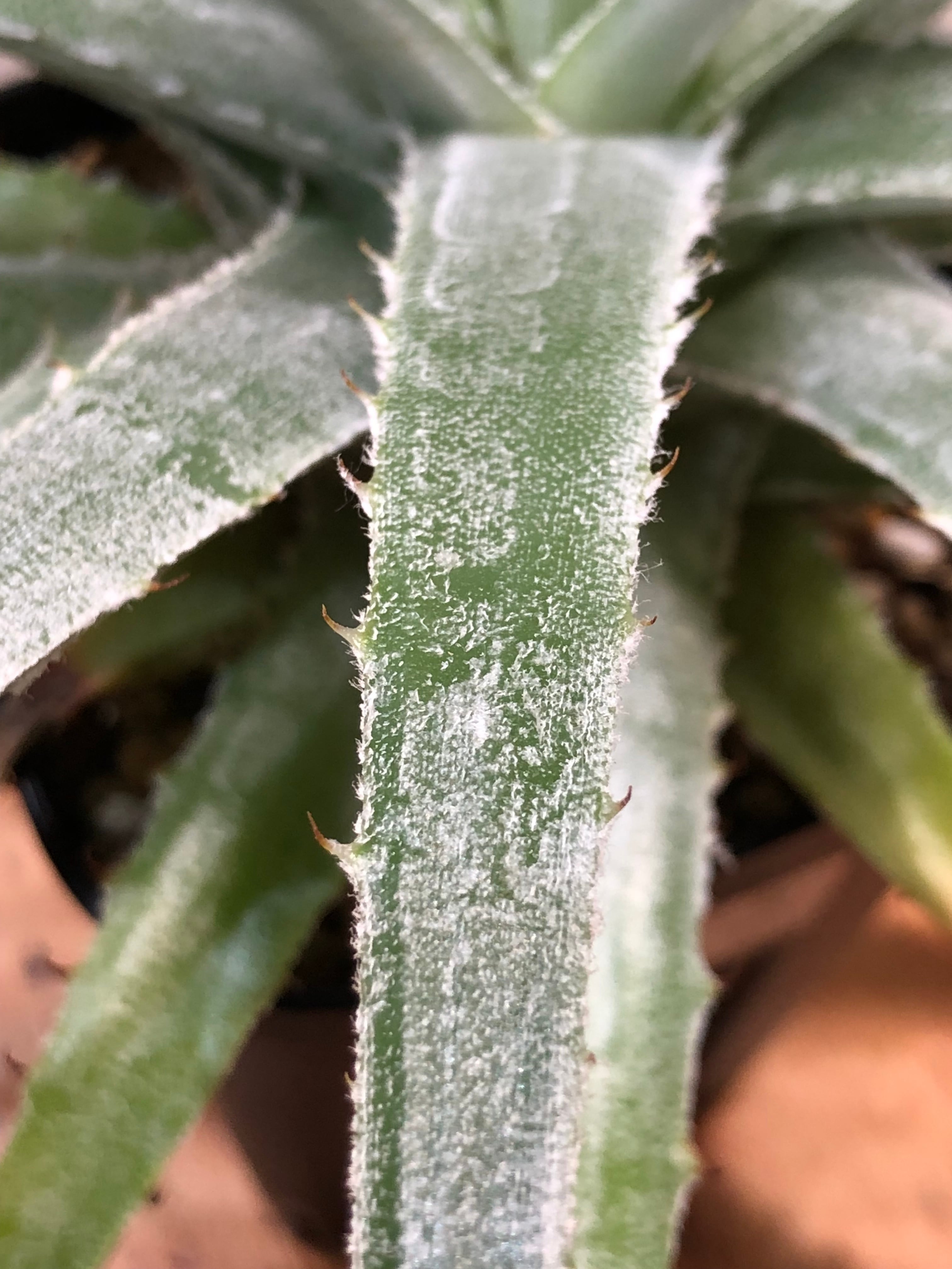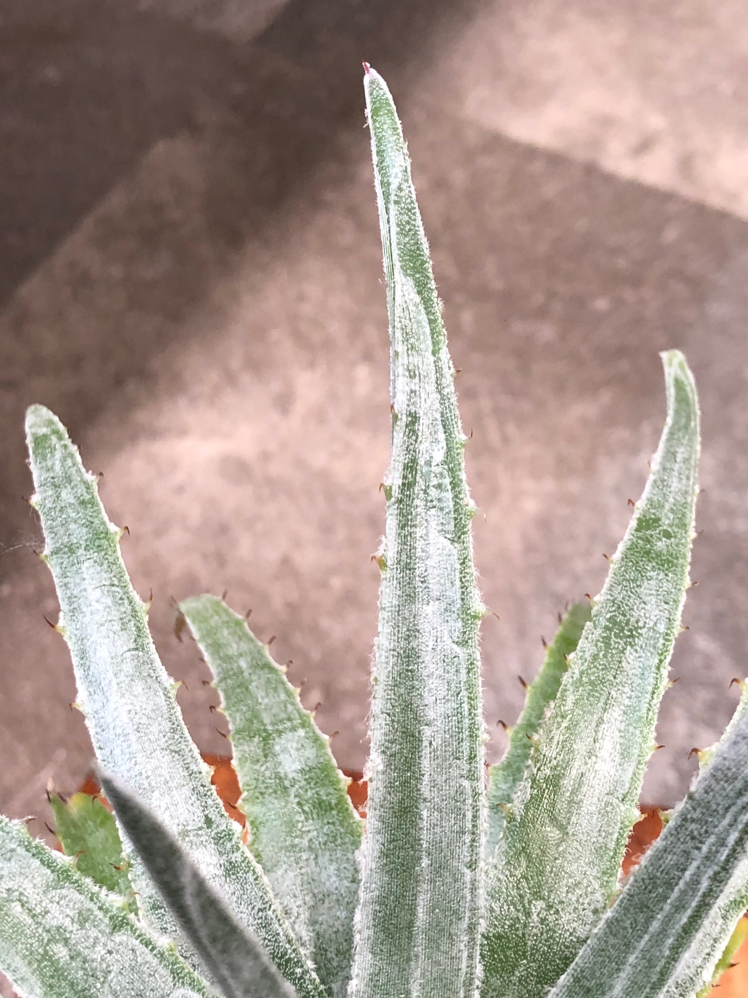 肉厚で硬い葉は薄くトリコームがあり縁には鋭い鋸歯が並んでいます。