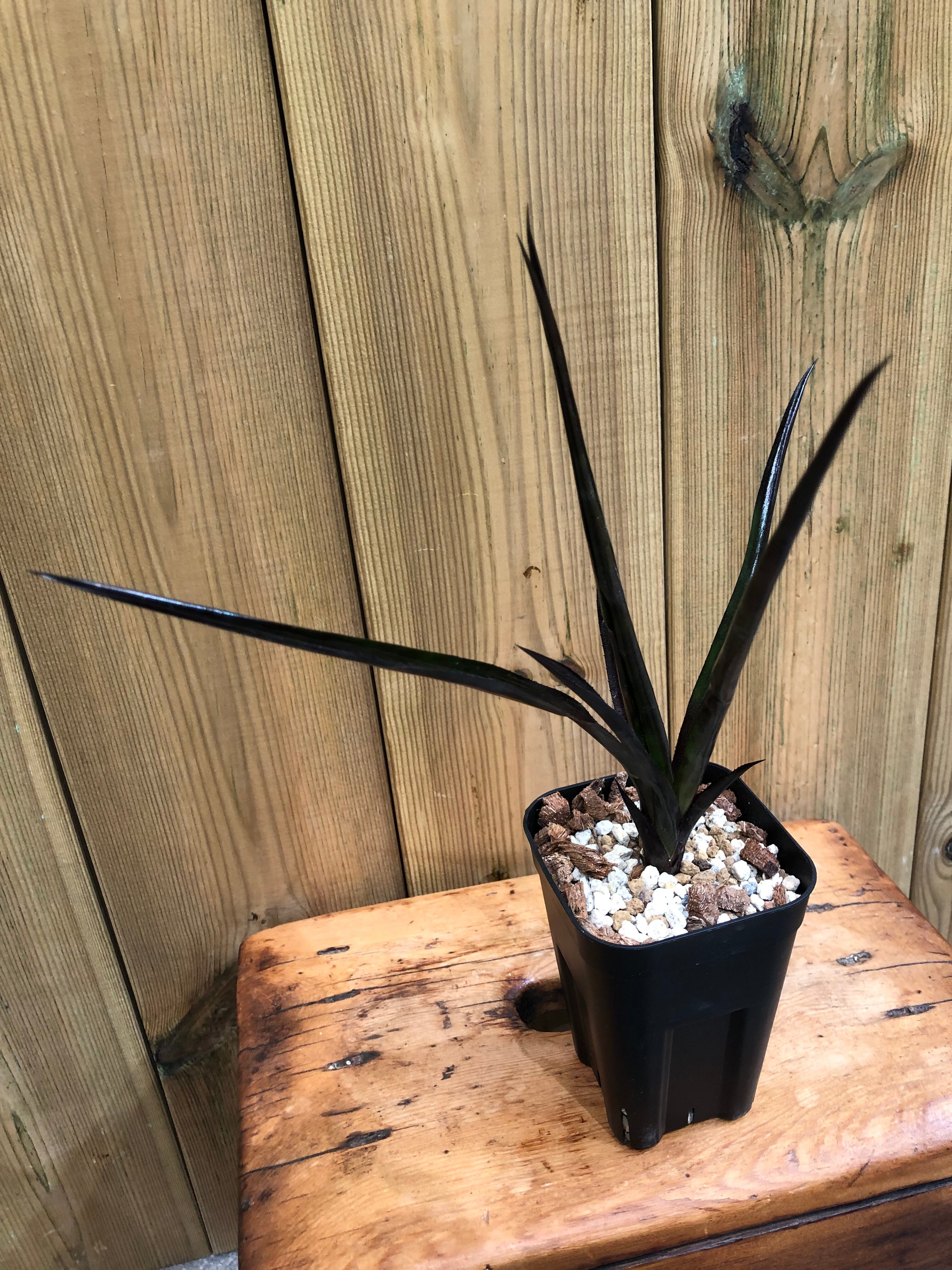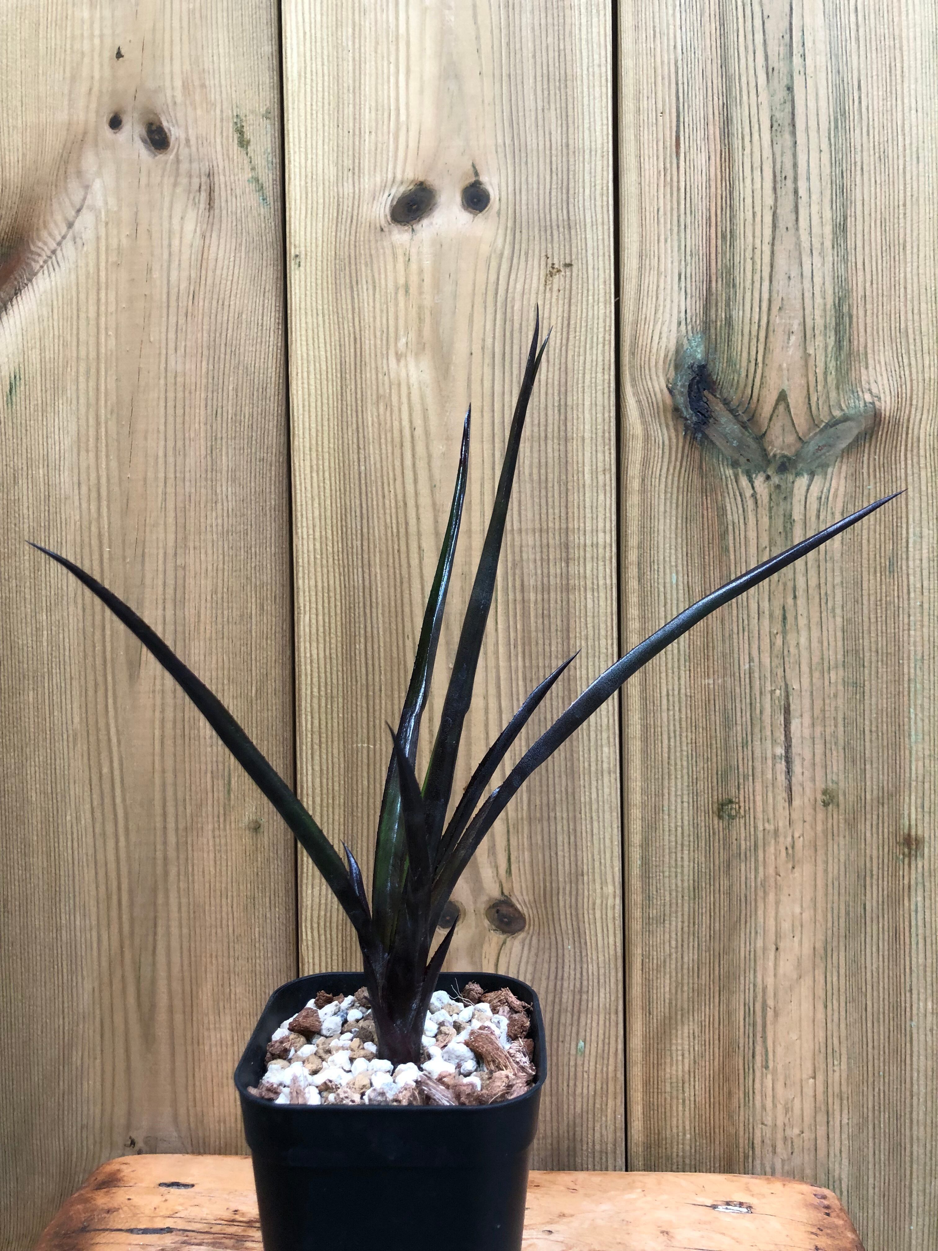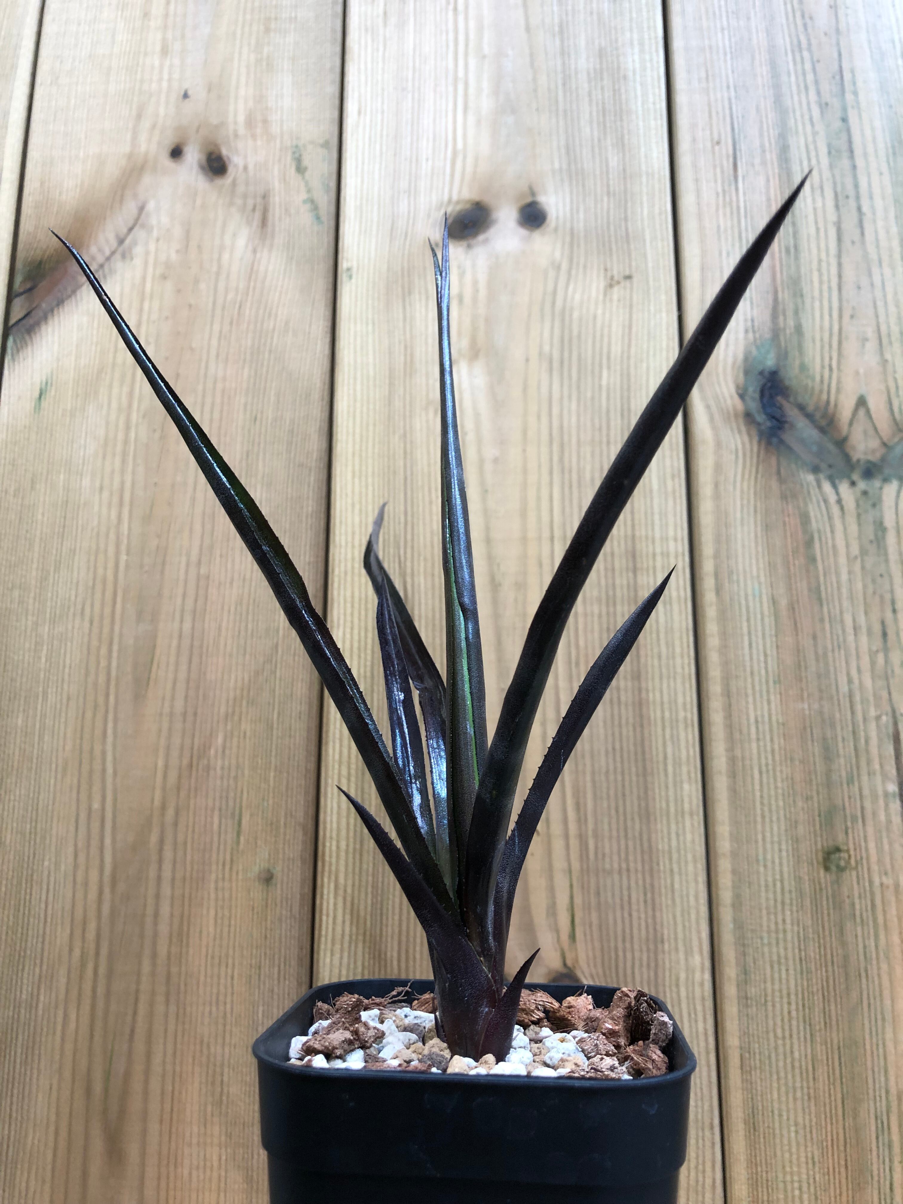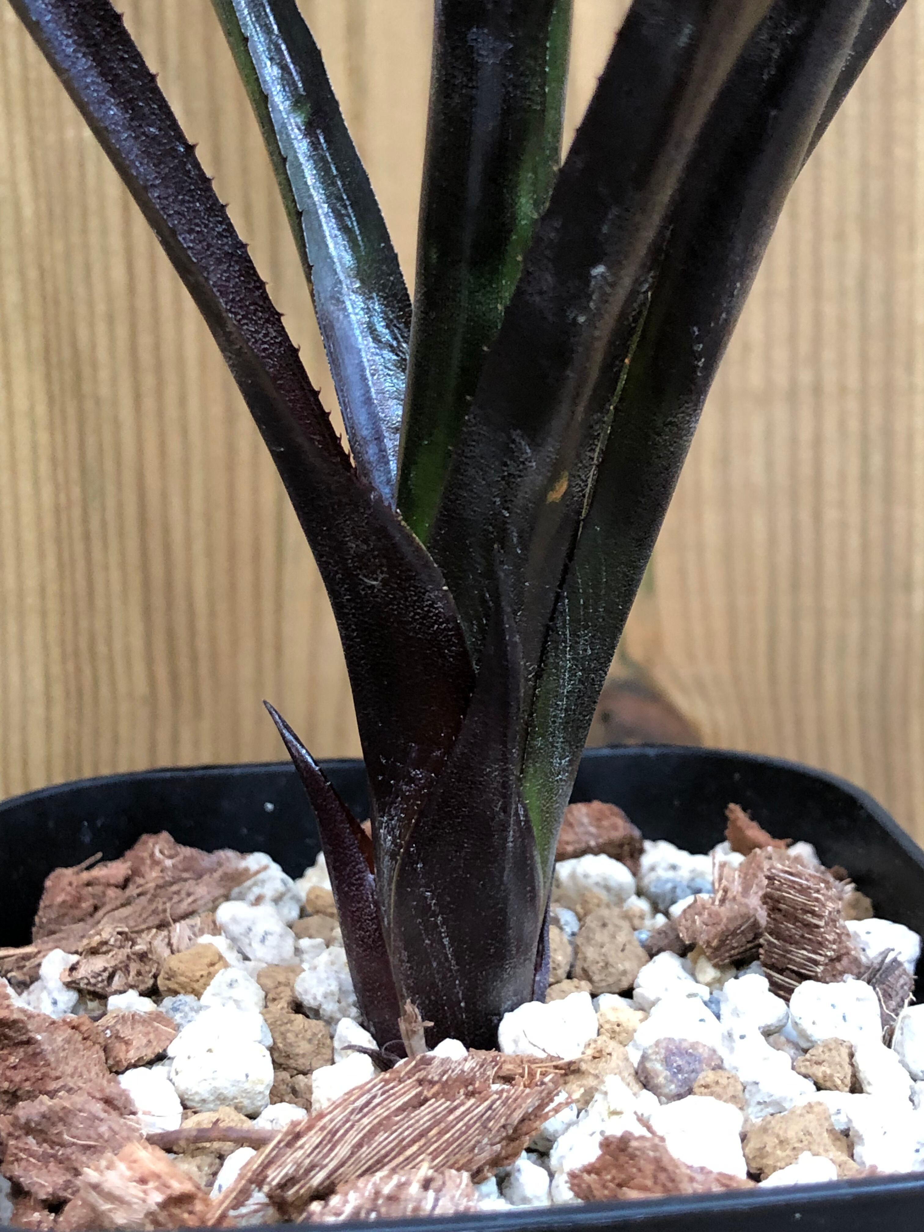 真っ黒で艶があり硬いシャープな葉で縁には小さな鋸歯があり発色すると赤茶色になります。