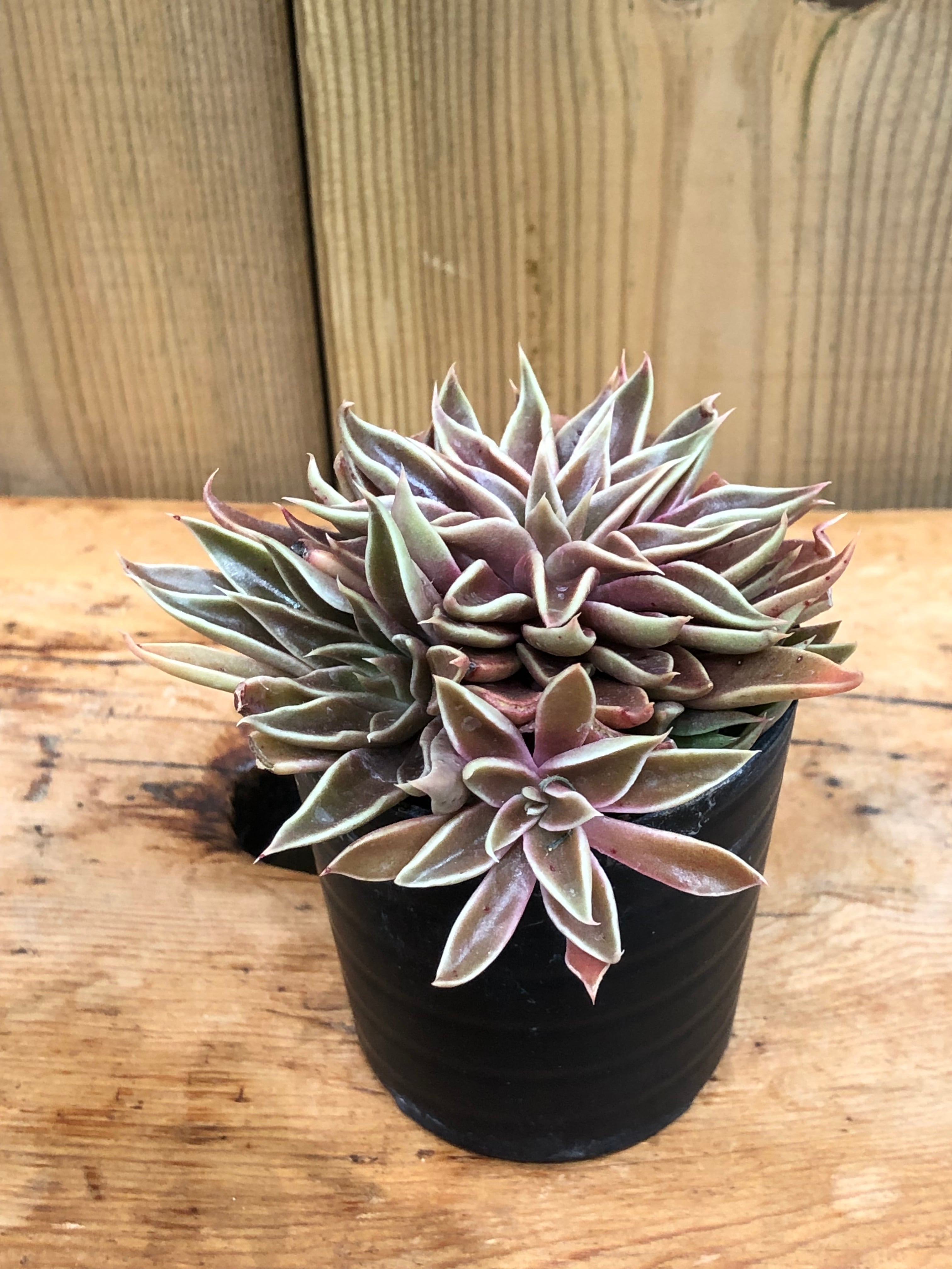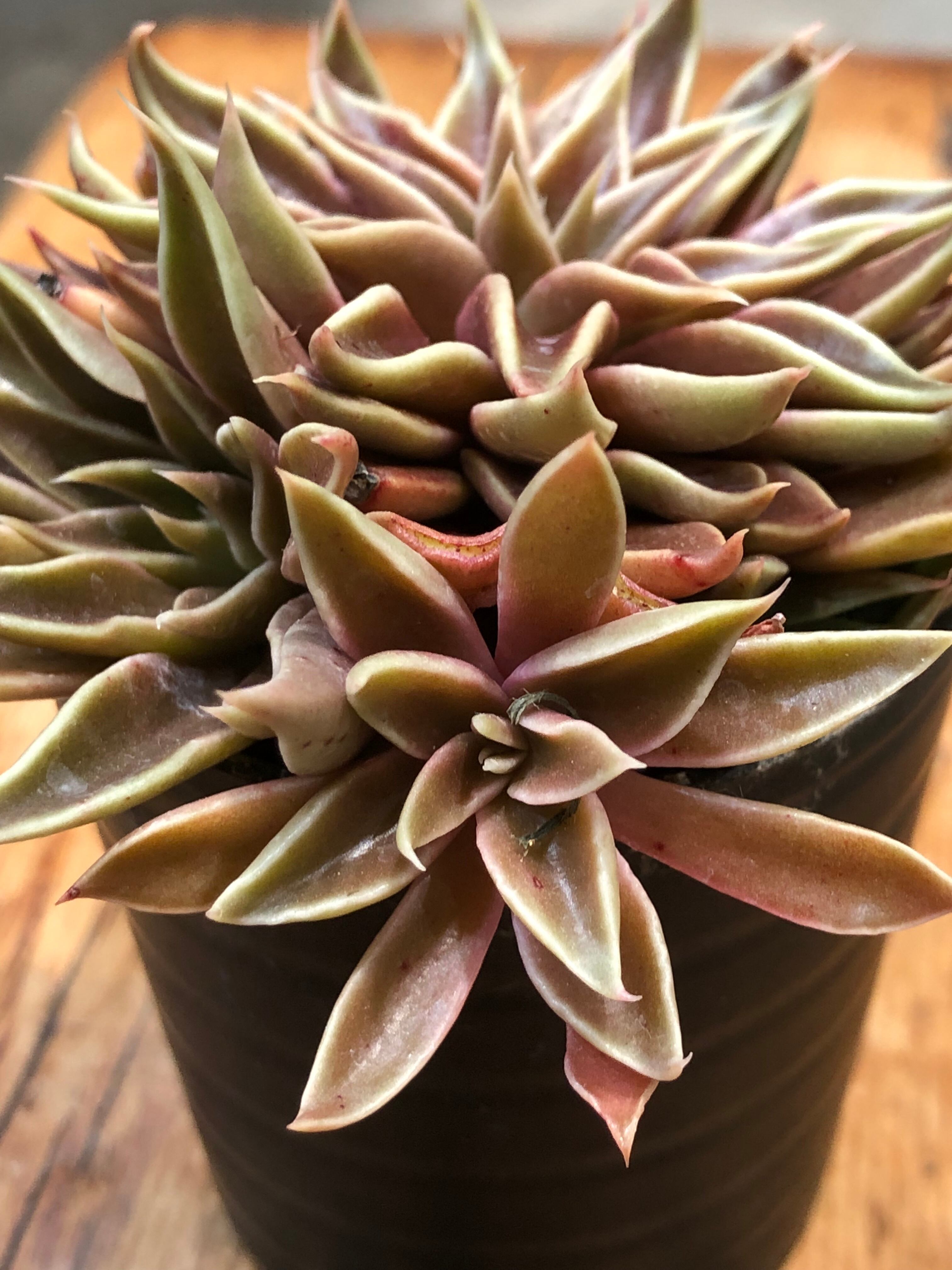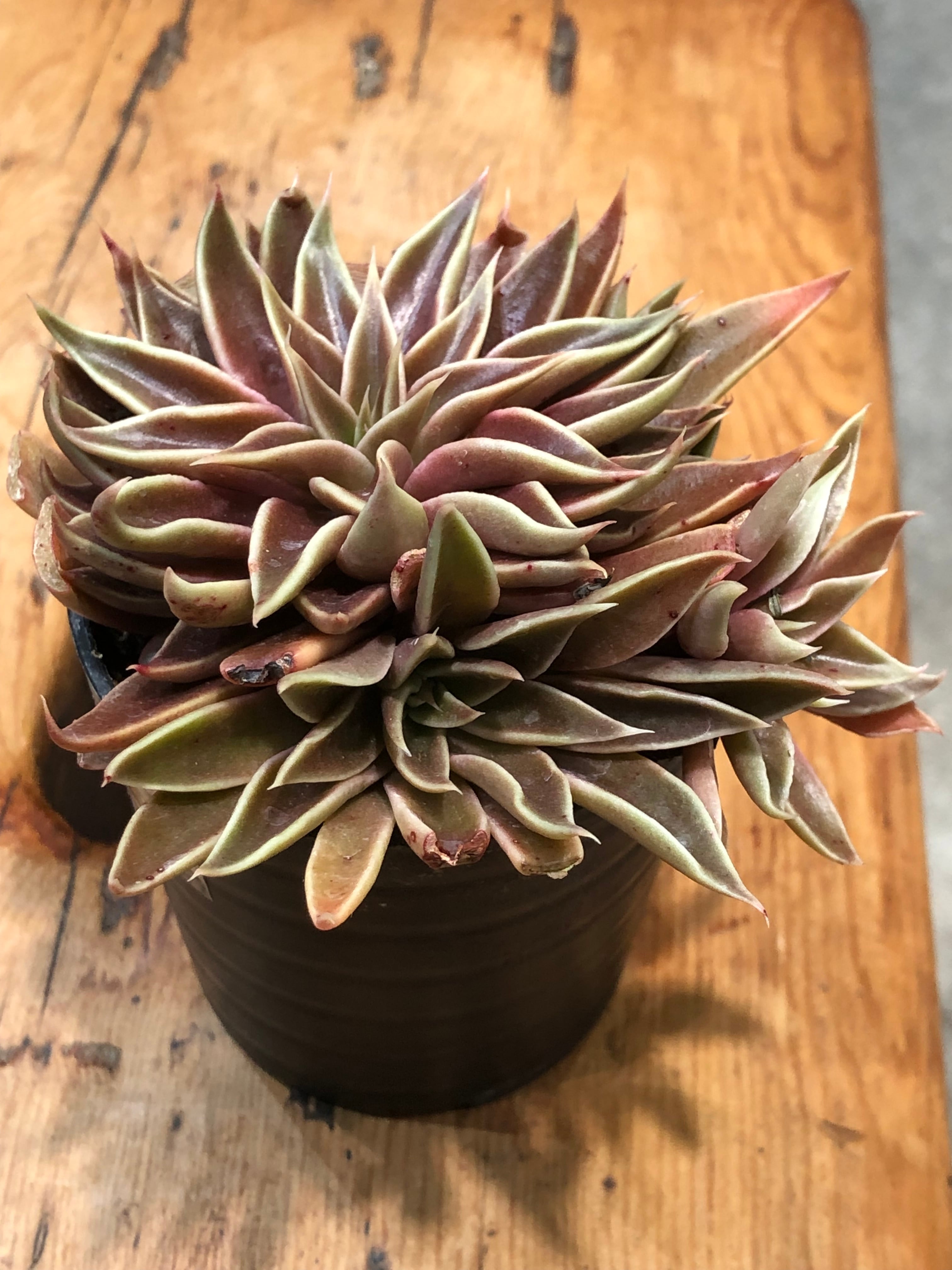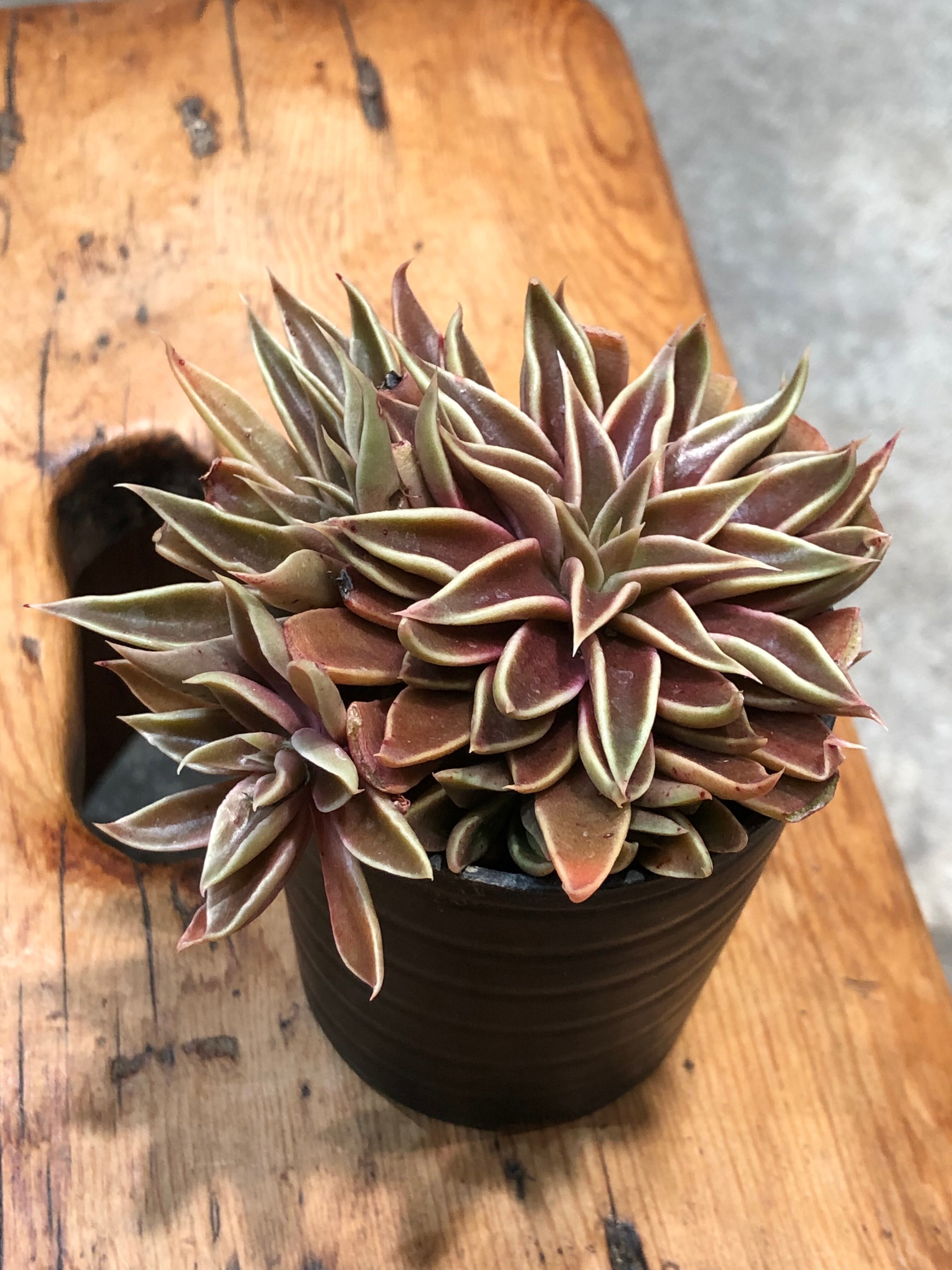 エケベリアの交配種の希少な品種で細長く少し内側にカールし縁が少し白っぽく先端が沿り上がった赤茶色の葉をロゼット形に展開します。