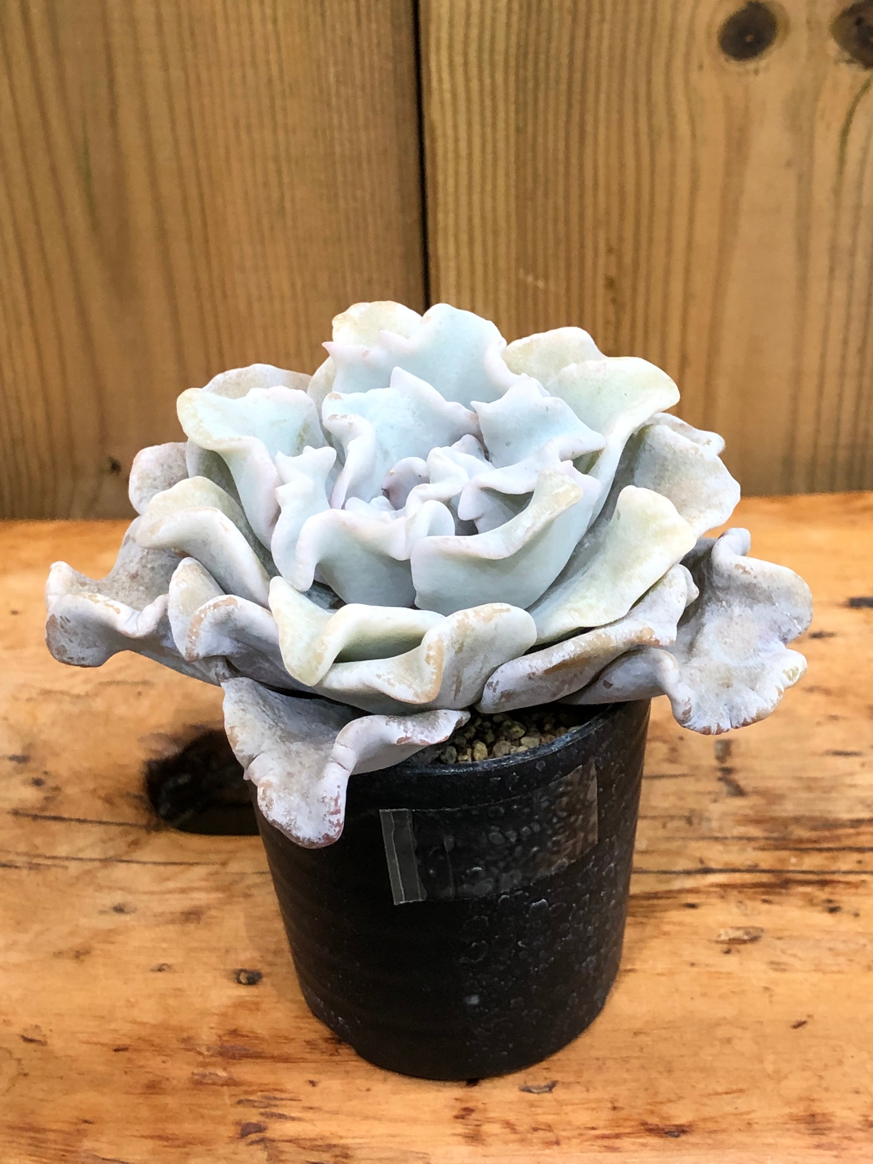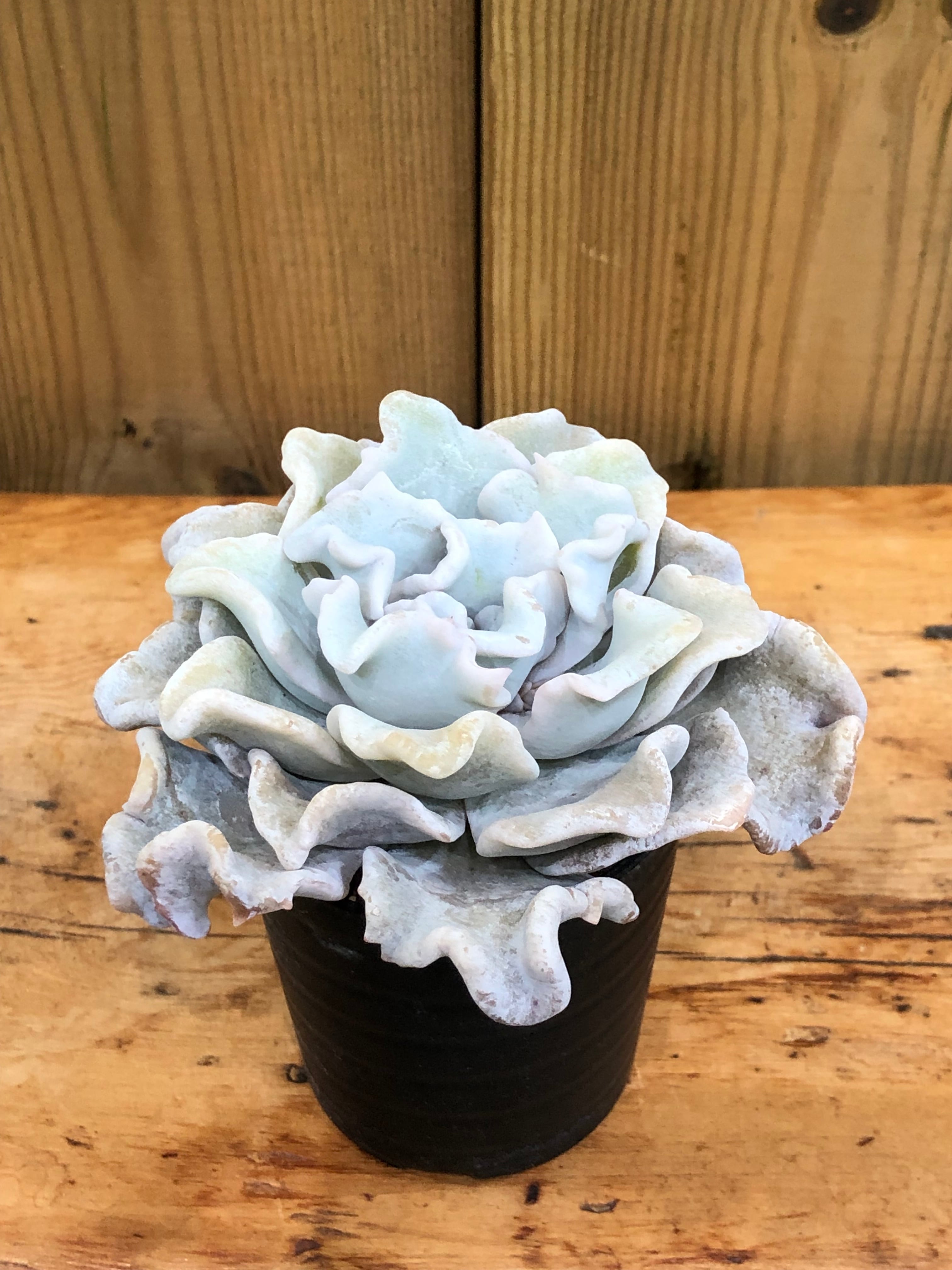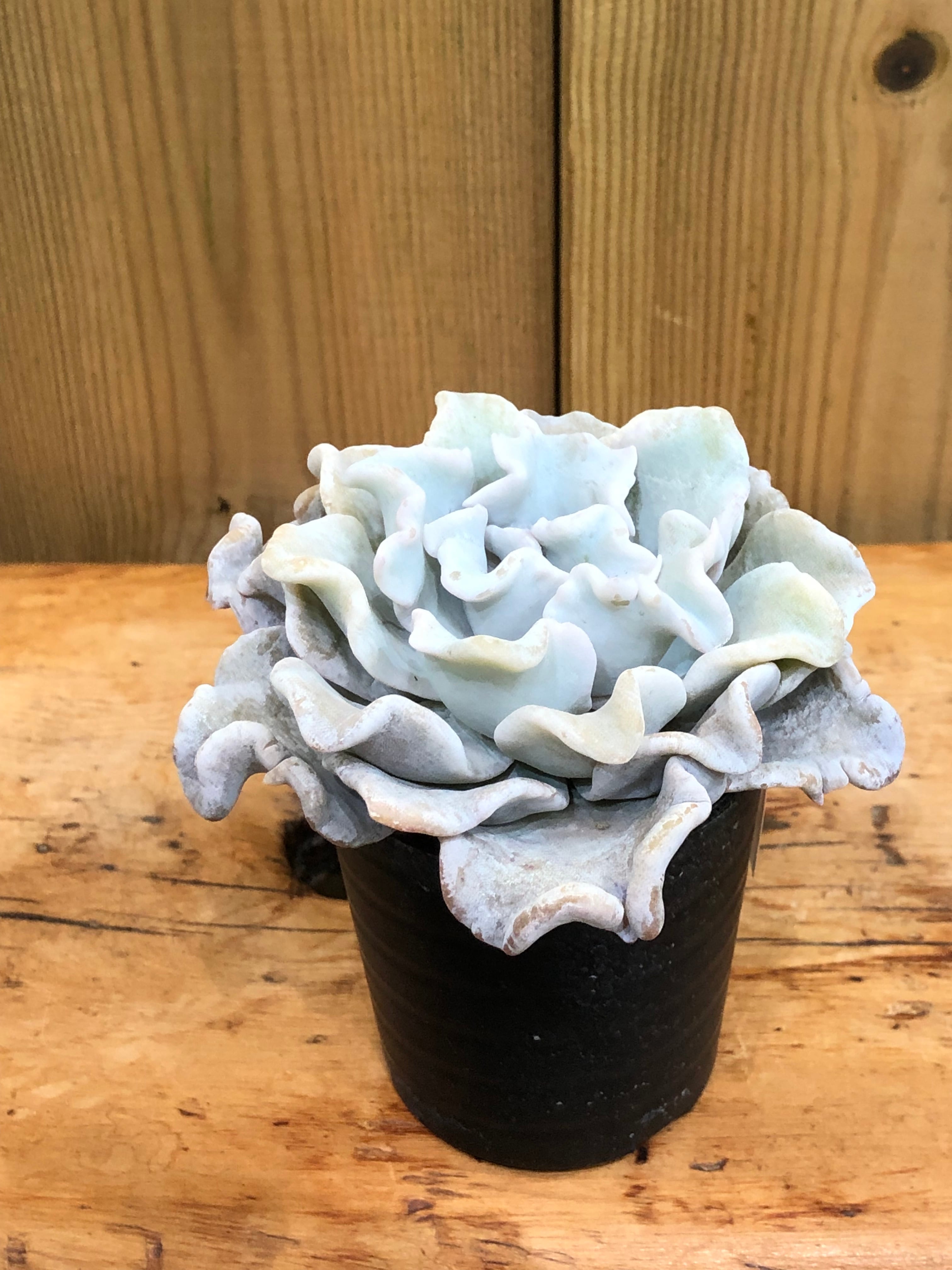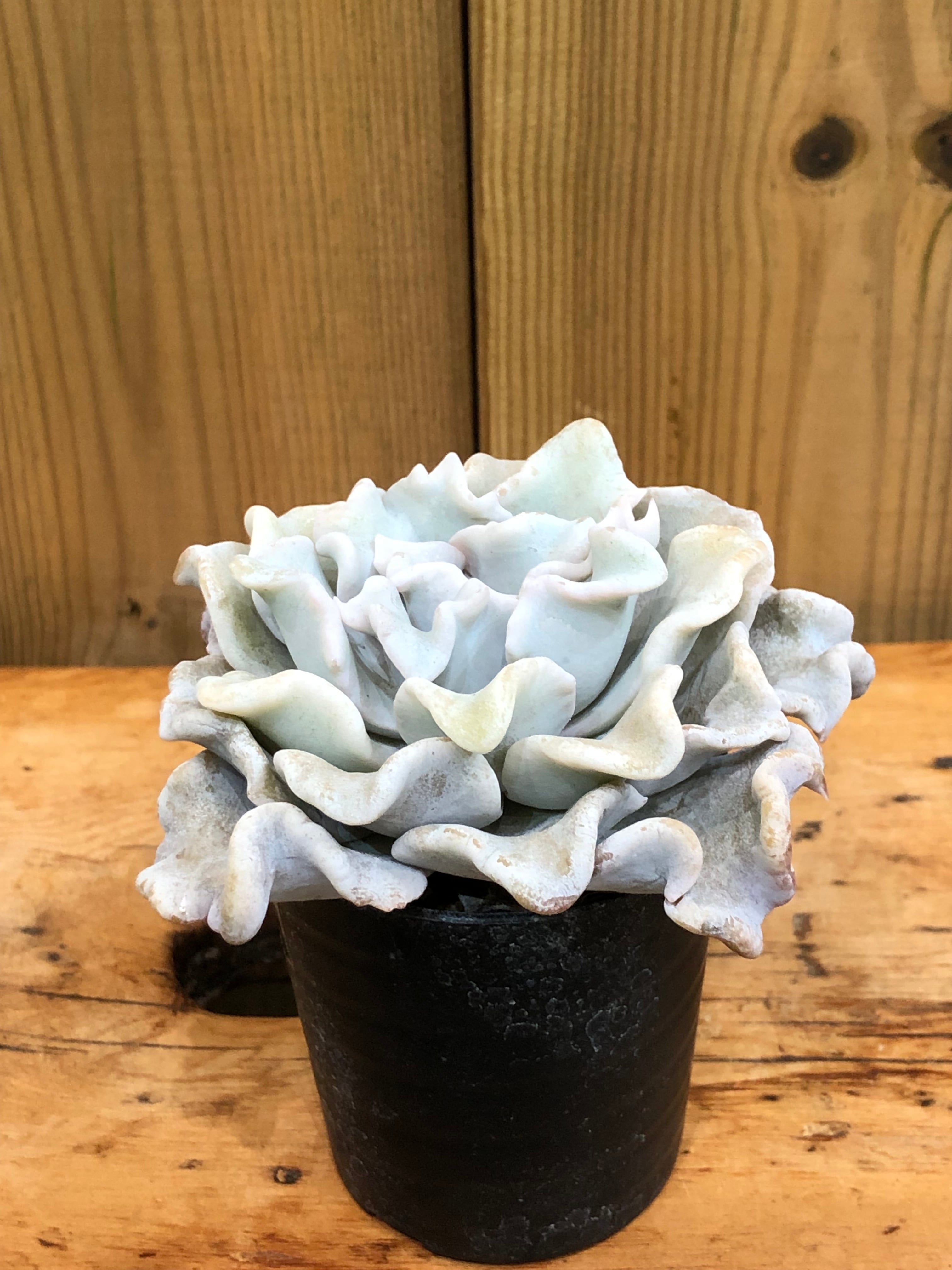 エケベリアの交配種の希少な品種でリラシナが親なだけあり、白く美しい色味で肉厚な葉の縁はフリルになっており上品な印象を受けます。