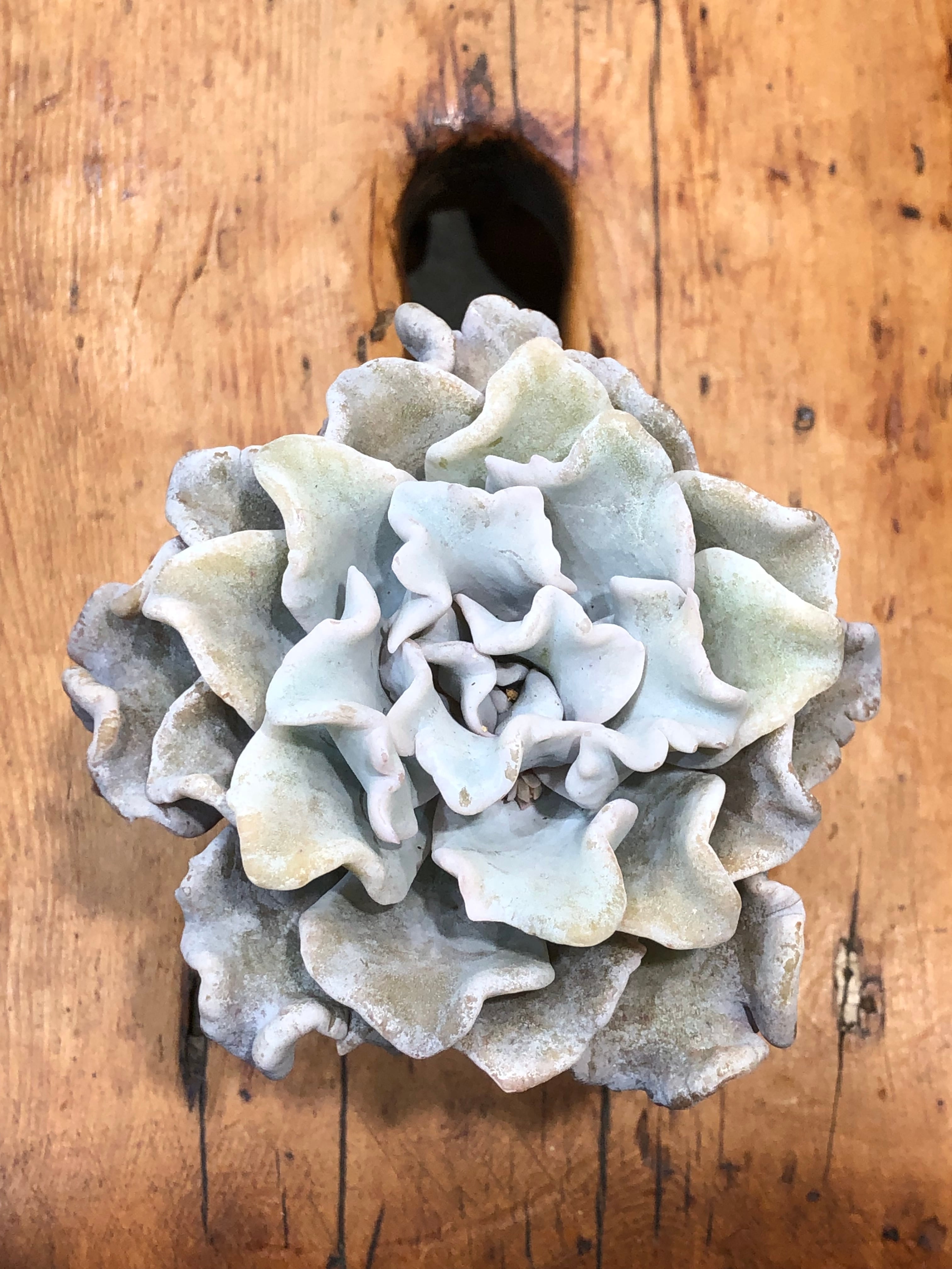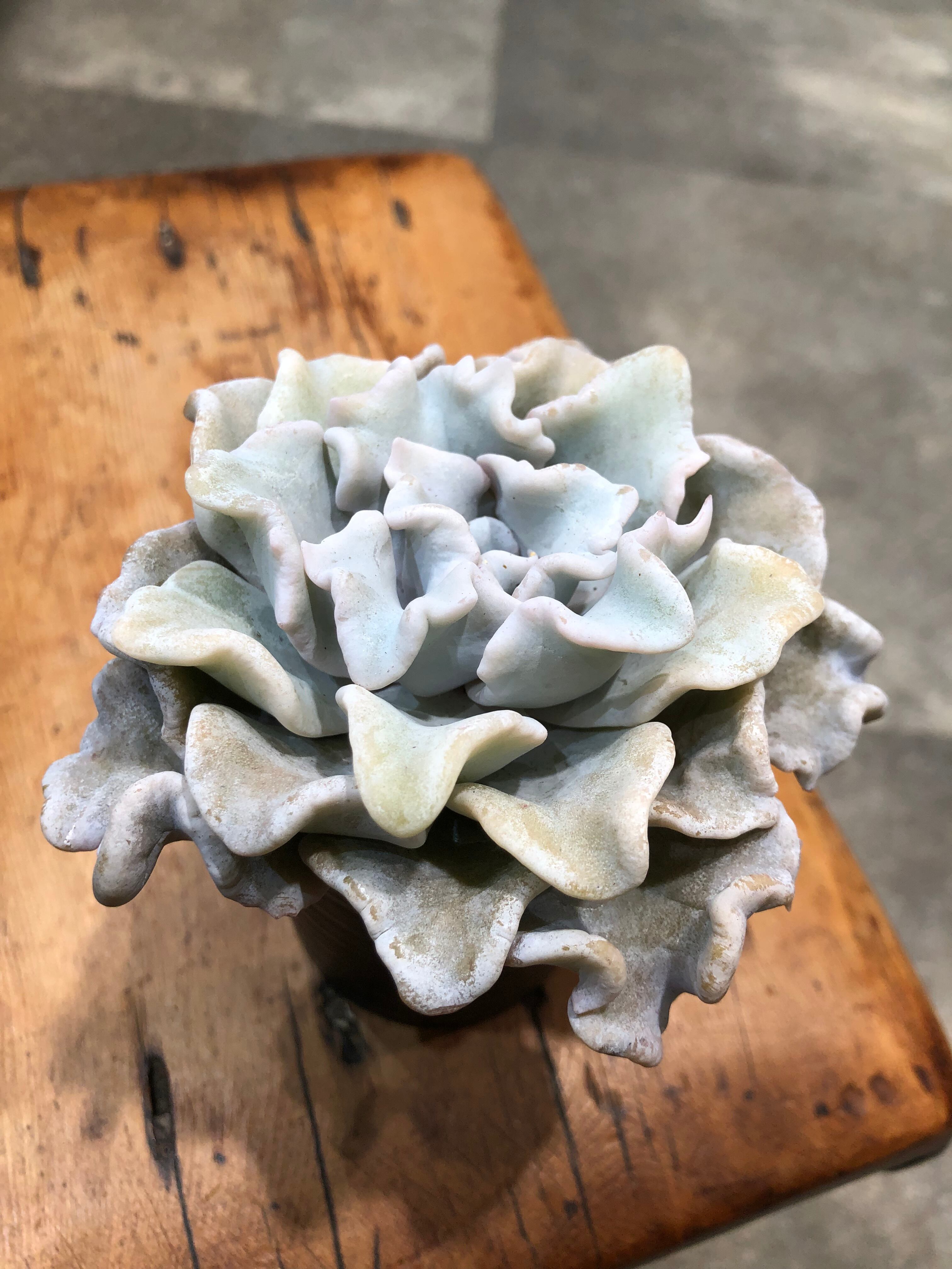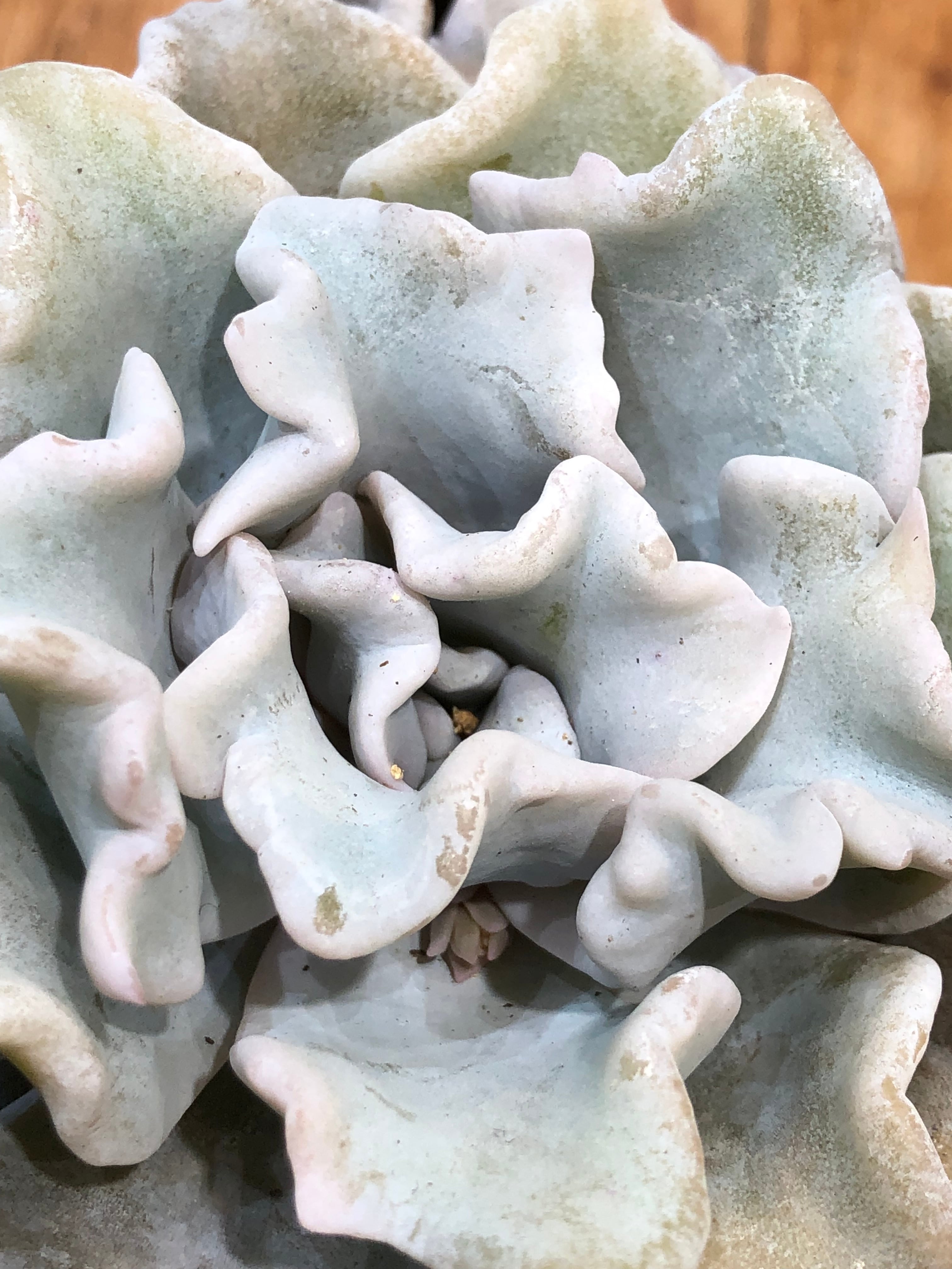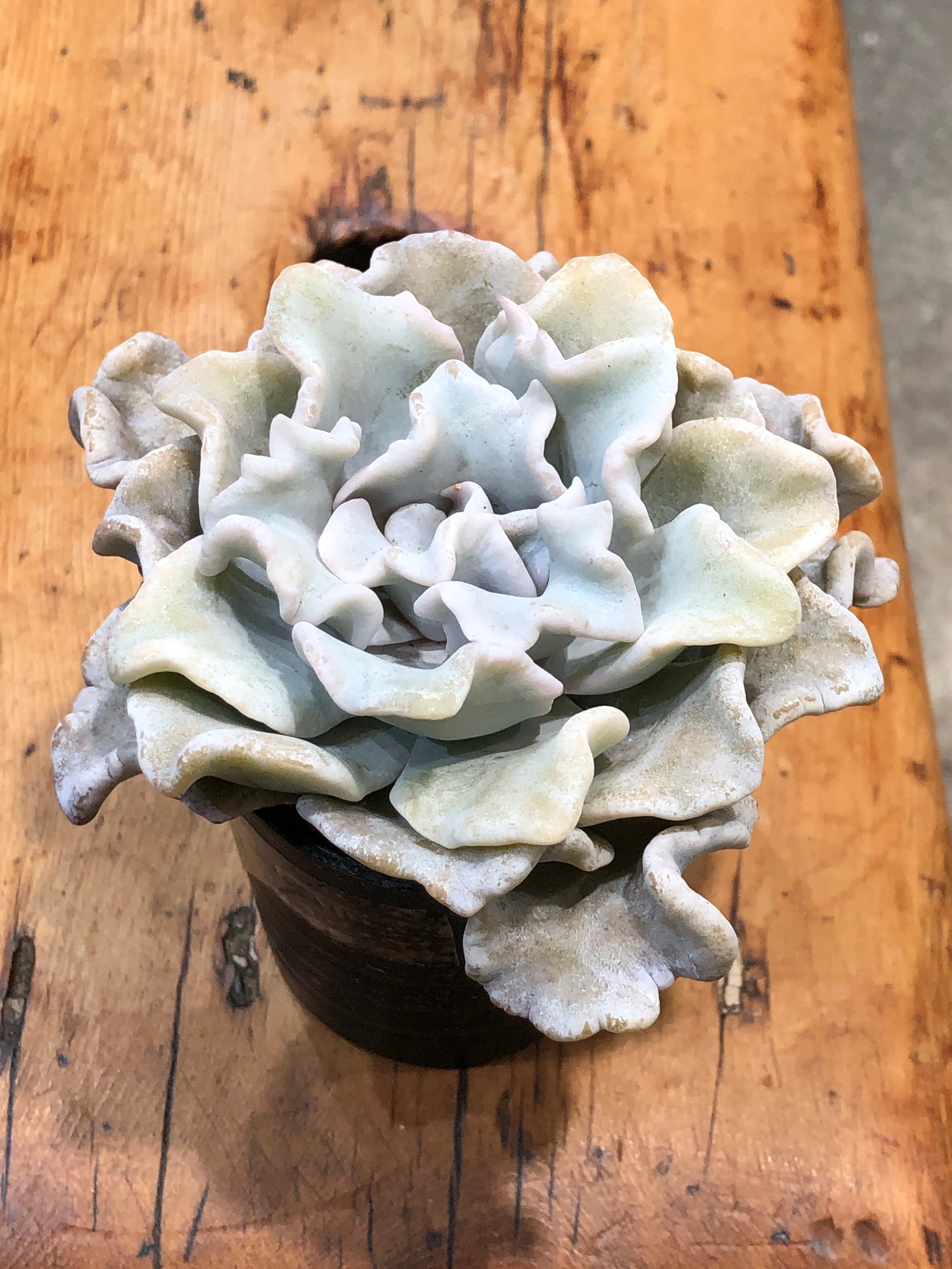エケベリアの交配種の希少な品種でリラシナが親なだけあり、白く美しい色味で肉厚な葉の縁はフリルになっており上品な印象を受けます。