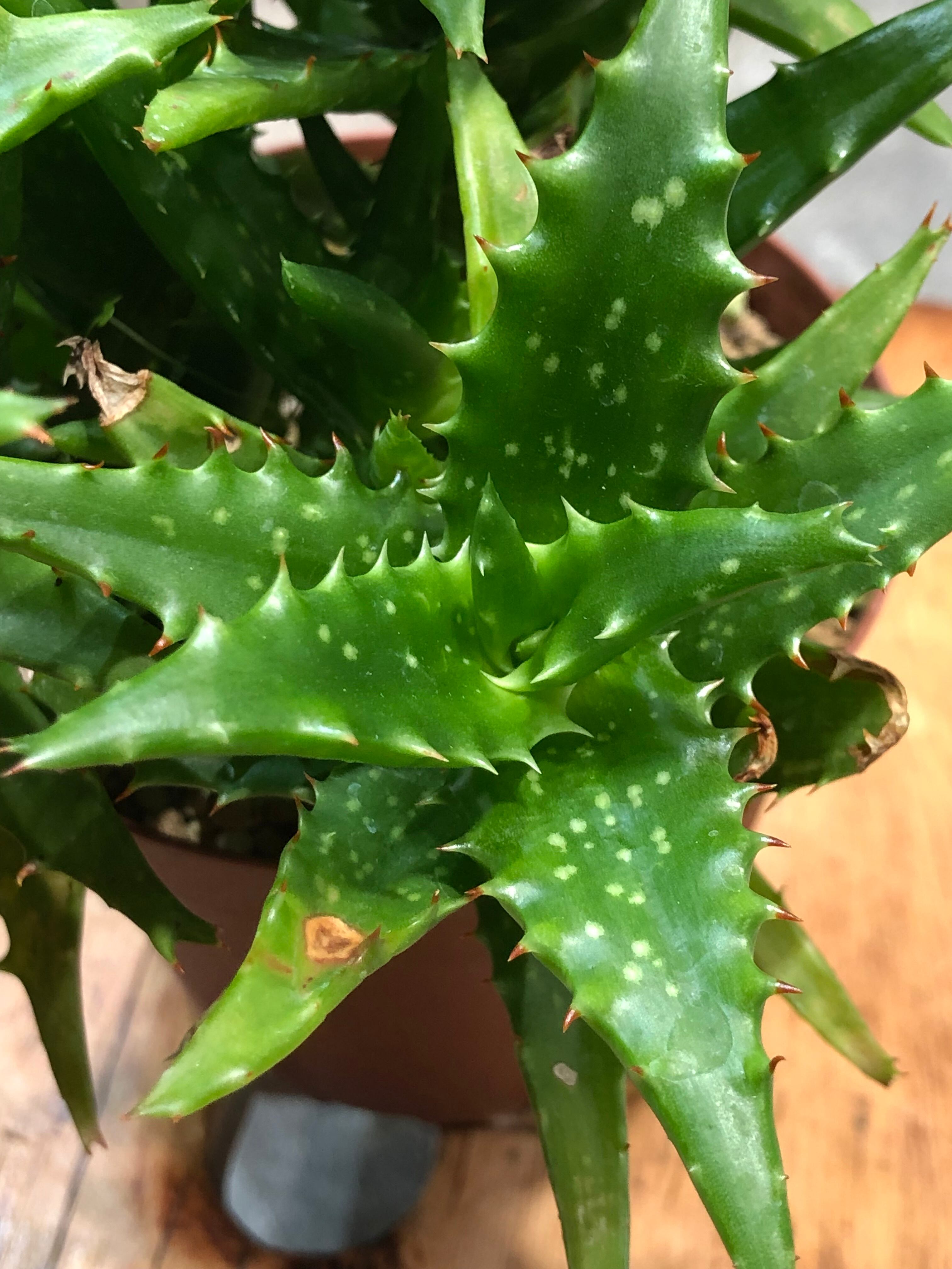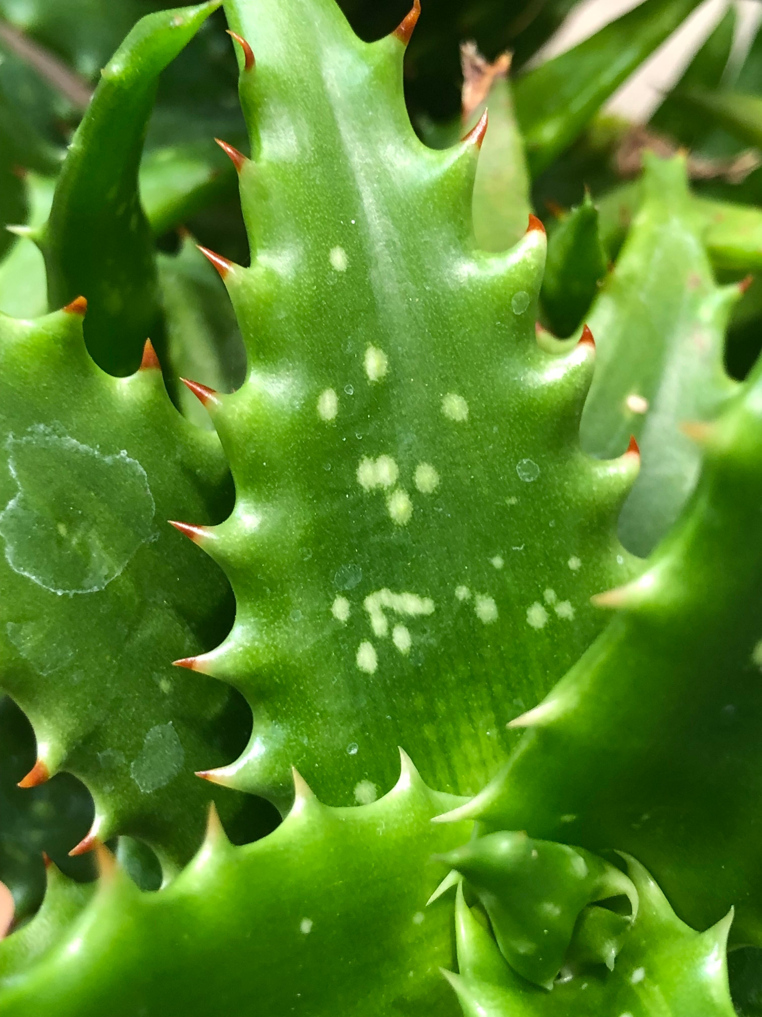 タンザニア原産で葉は肉厚で縁には赤茶色の鋸歯が並んでおり、白い斑点模様が入ります。