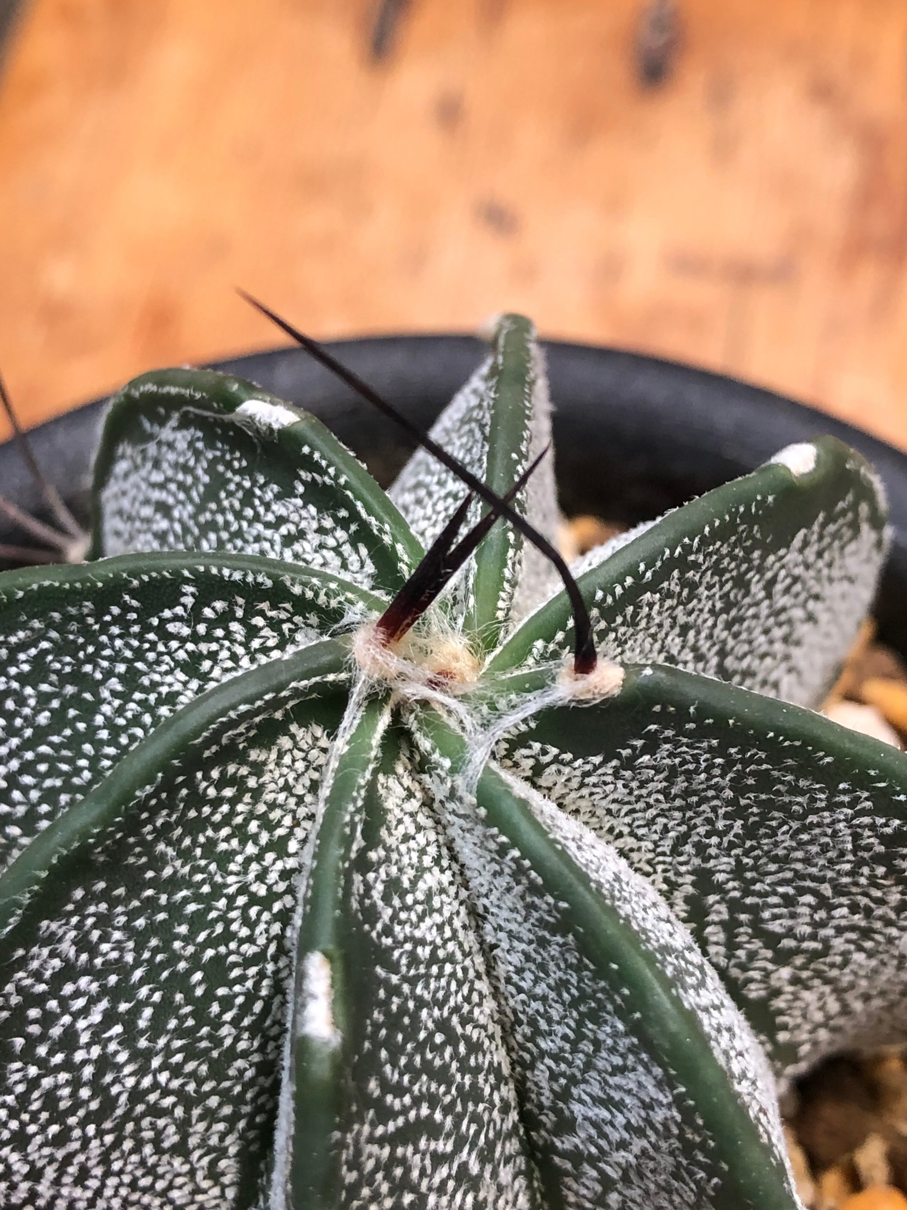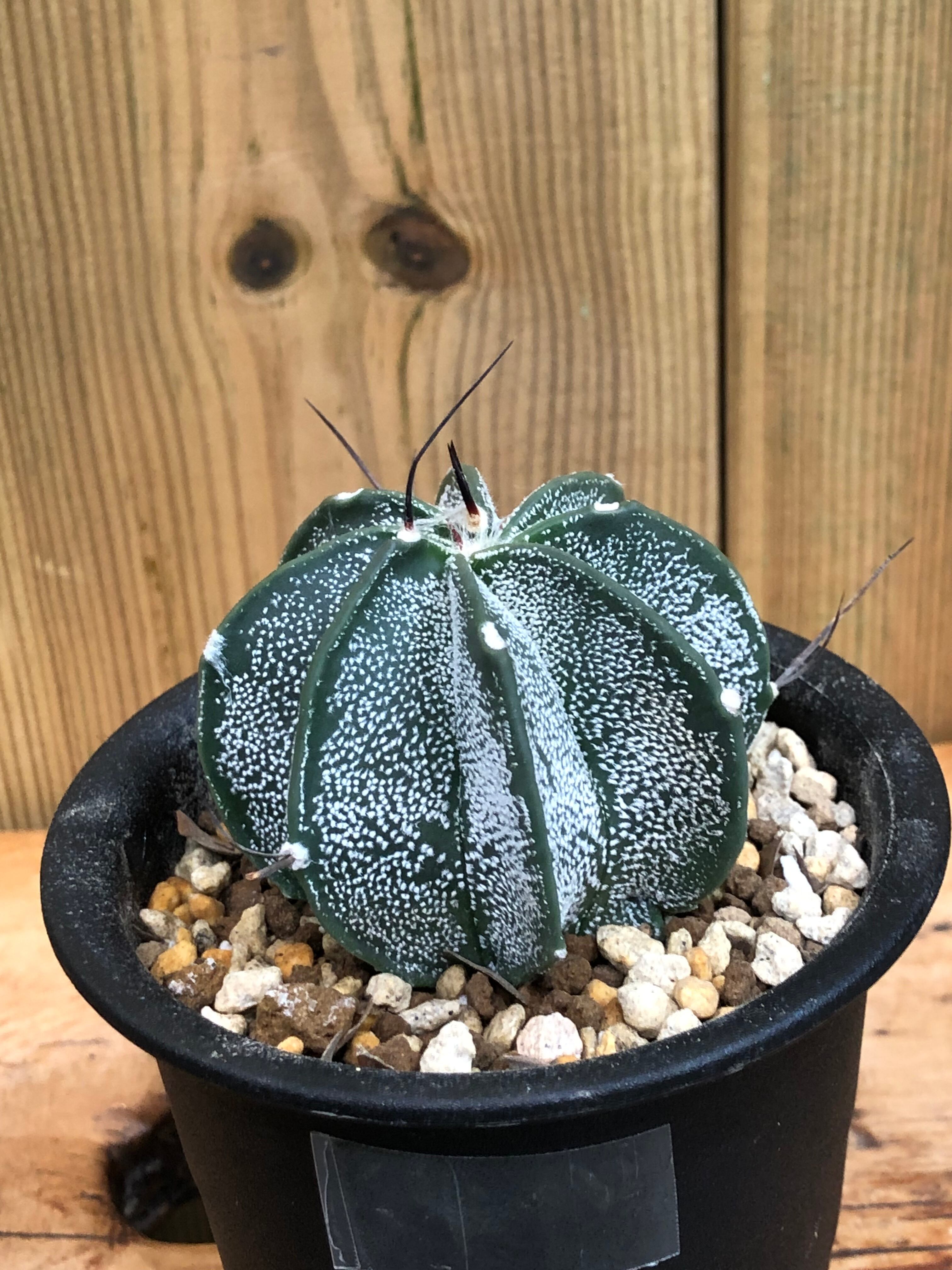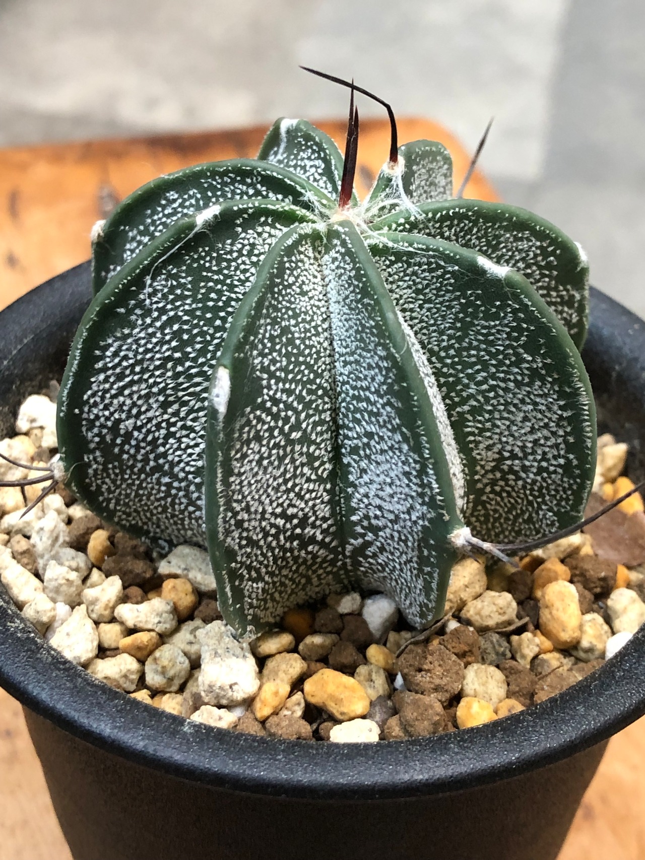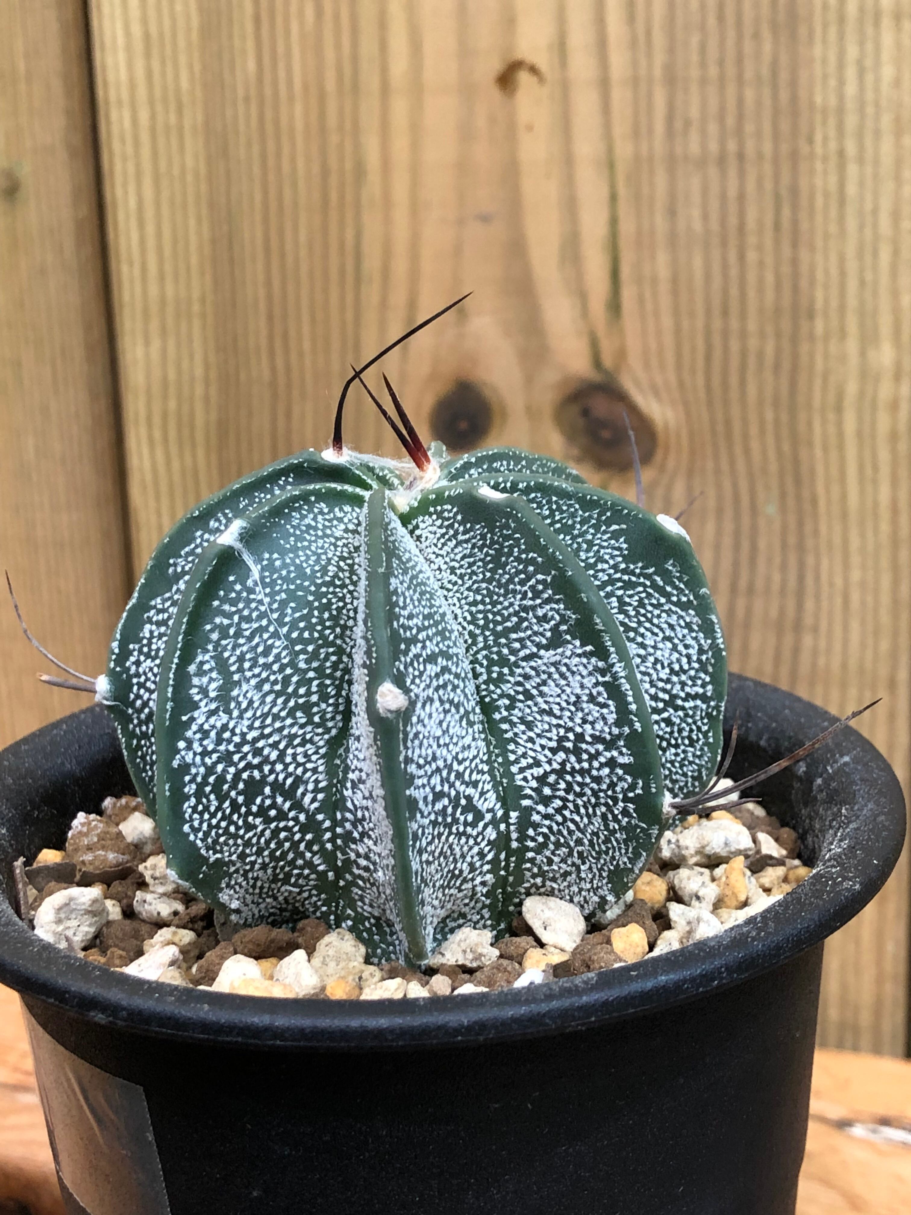 メキシコ原産のサボテンで稜に沿って長く曲がった黒い棘がありますが生えていたり、無かったりします。