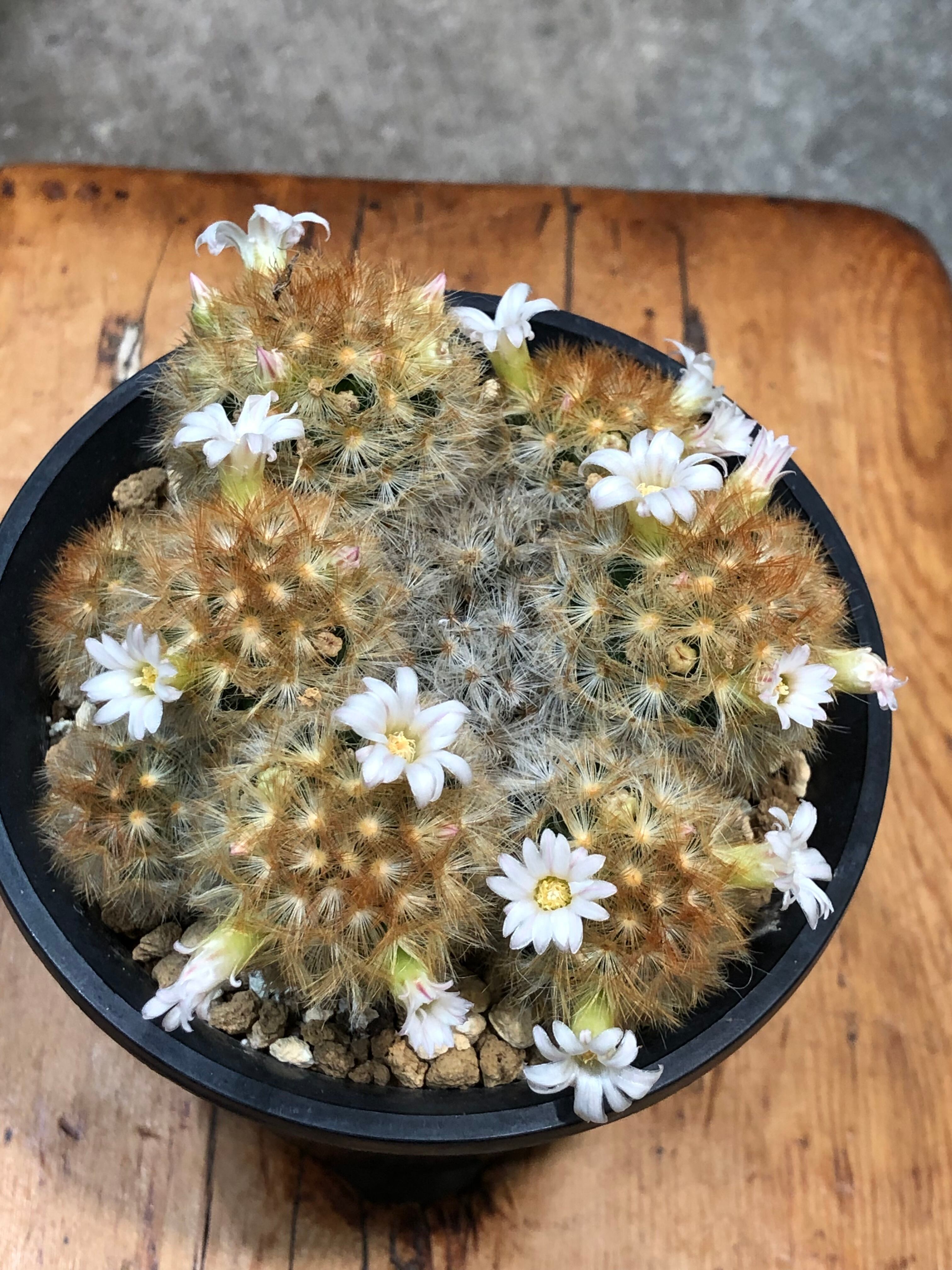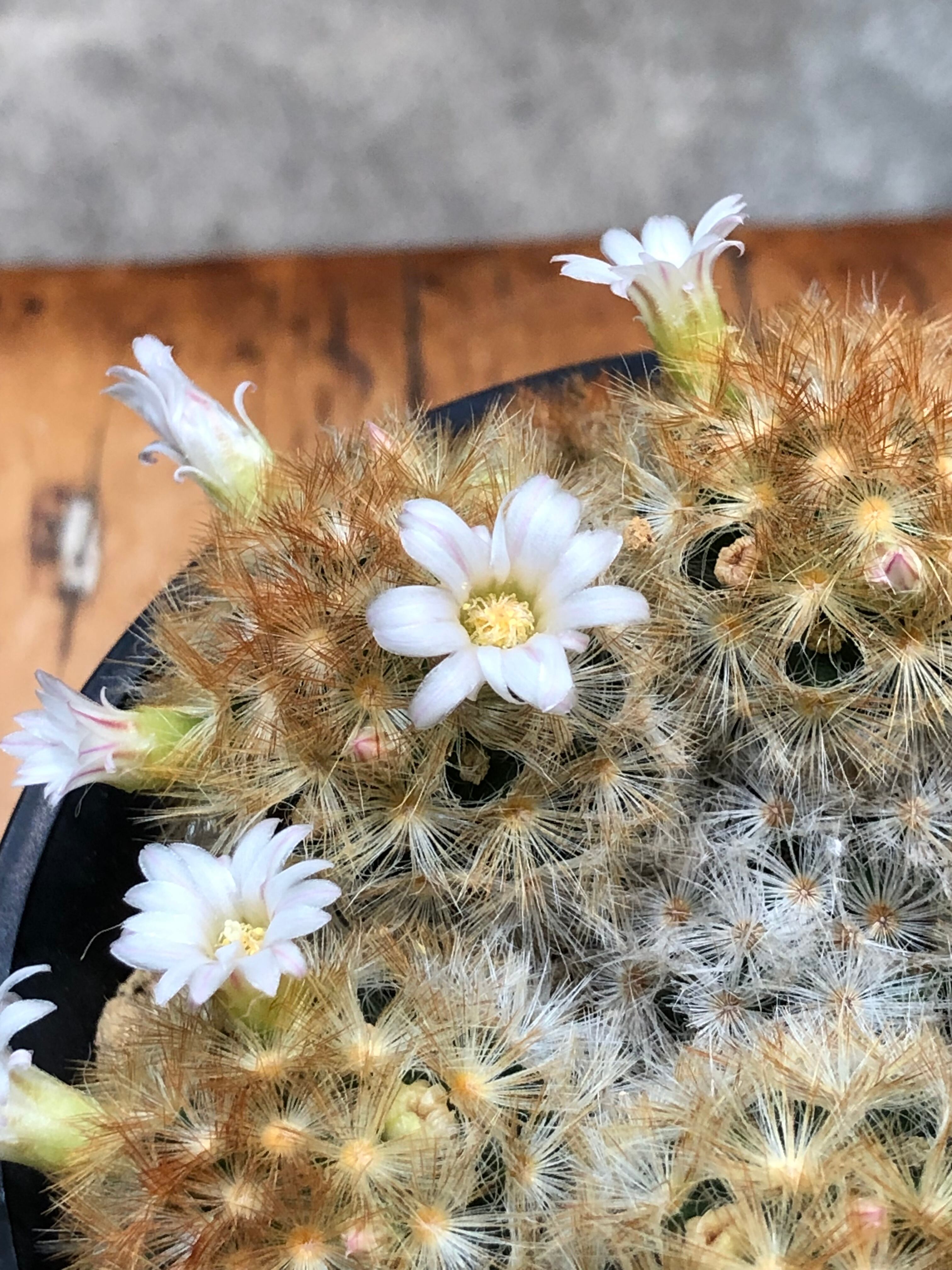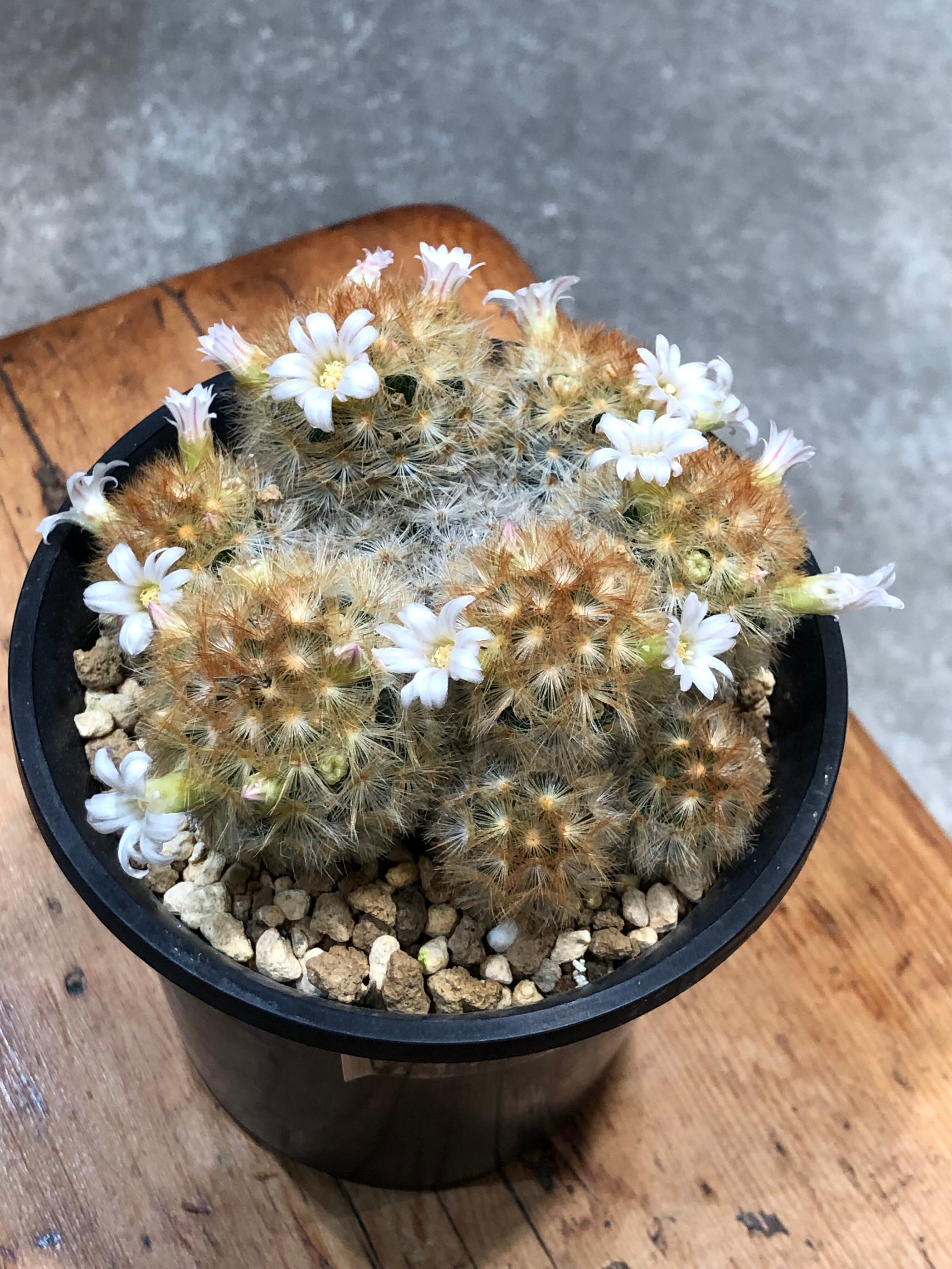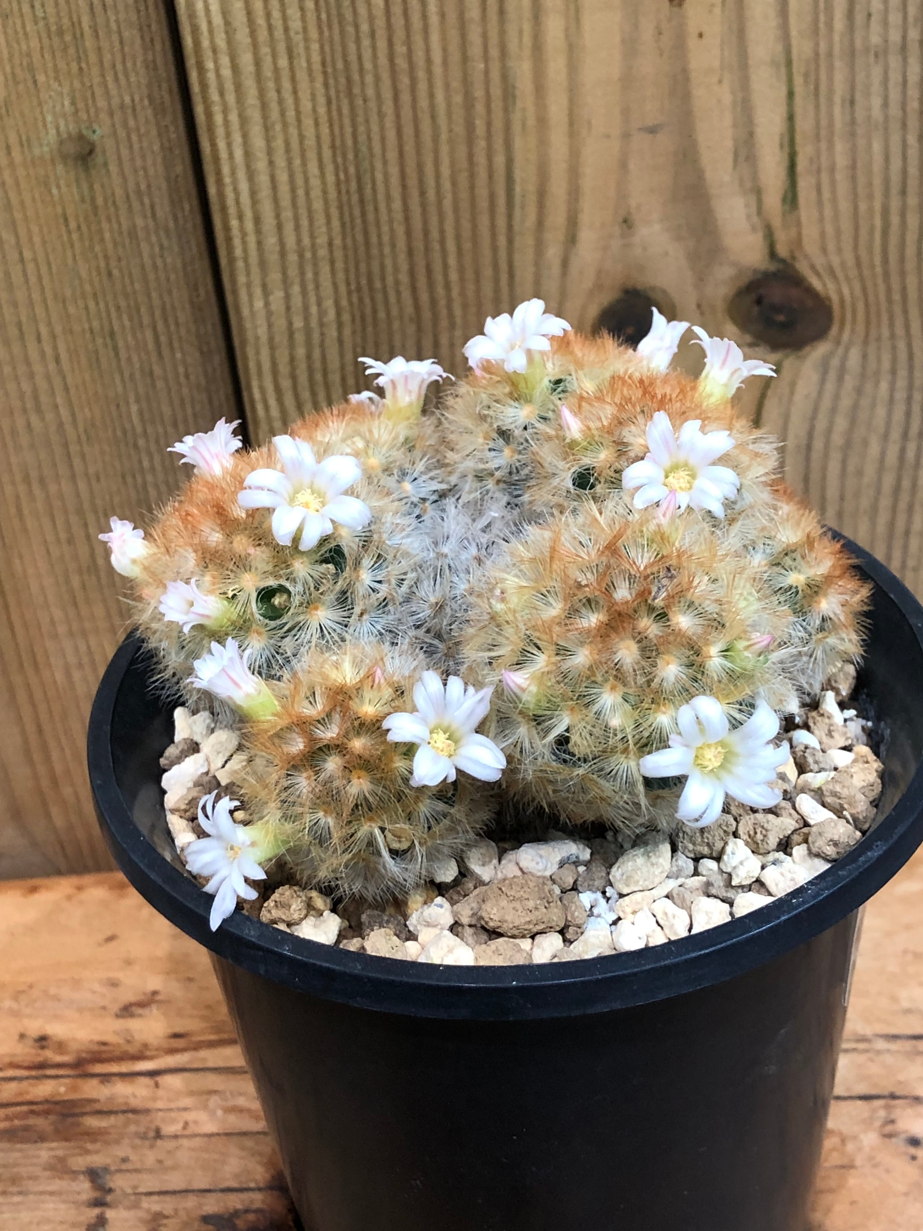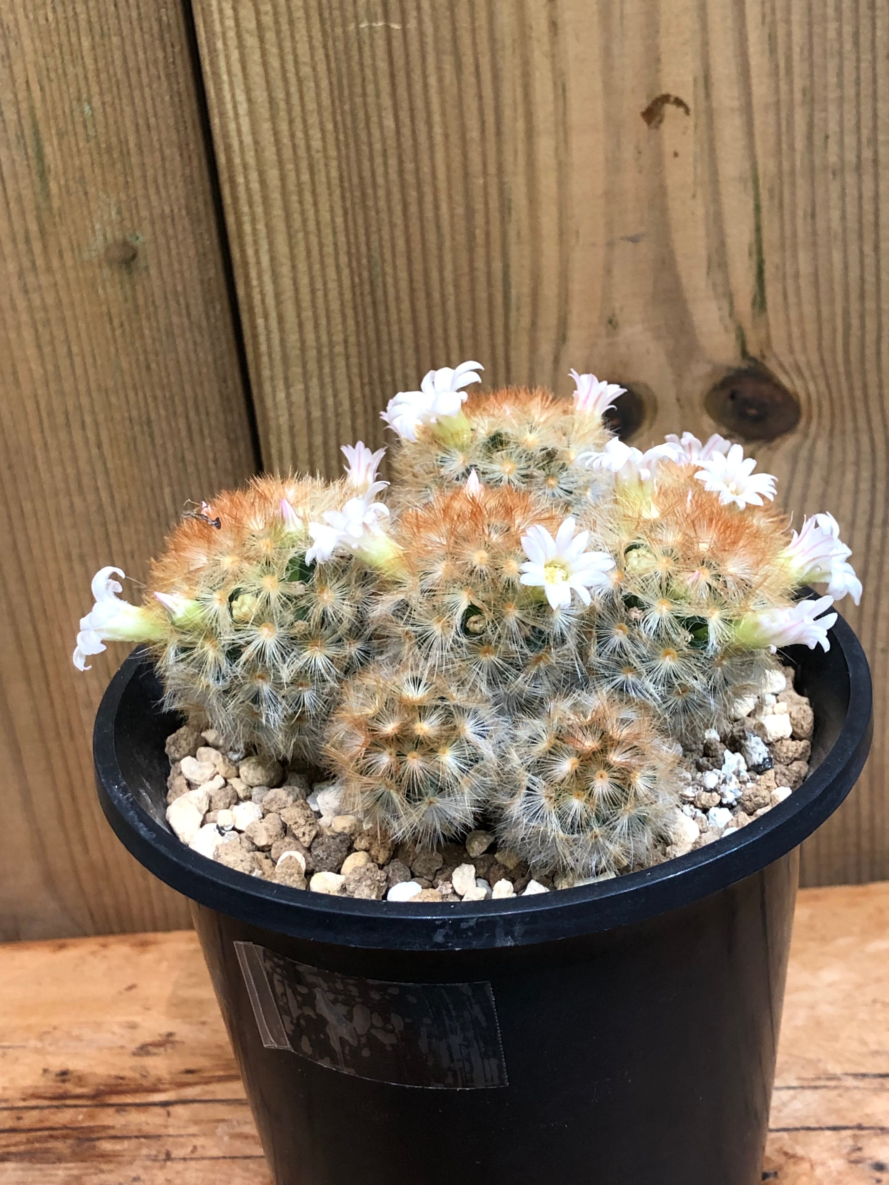 メキシコ原産の小型のサボテンで群生しやすく棘が密集して毛玉の様な見た目も可愛い品種で、あちらこちらで花が咲いて華やかです。