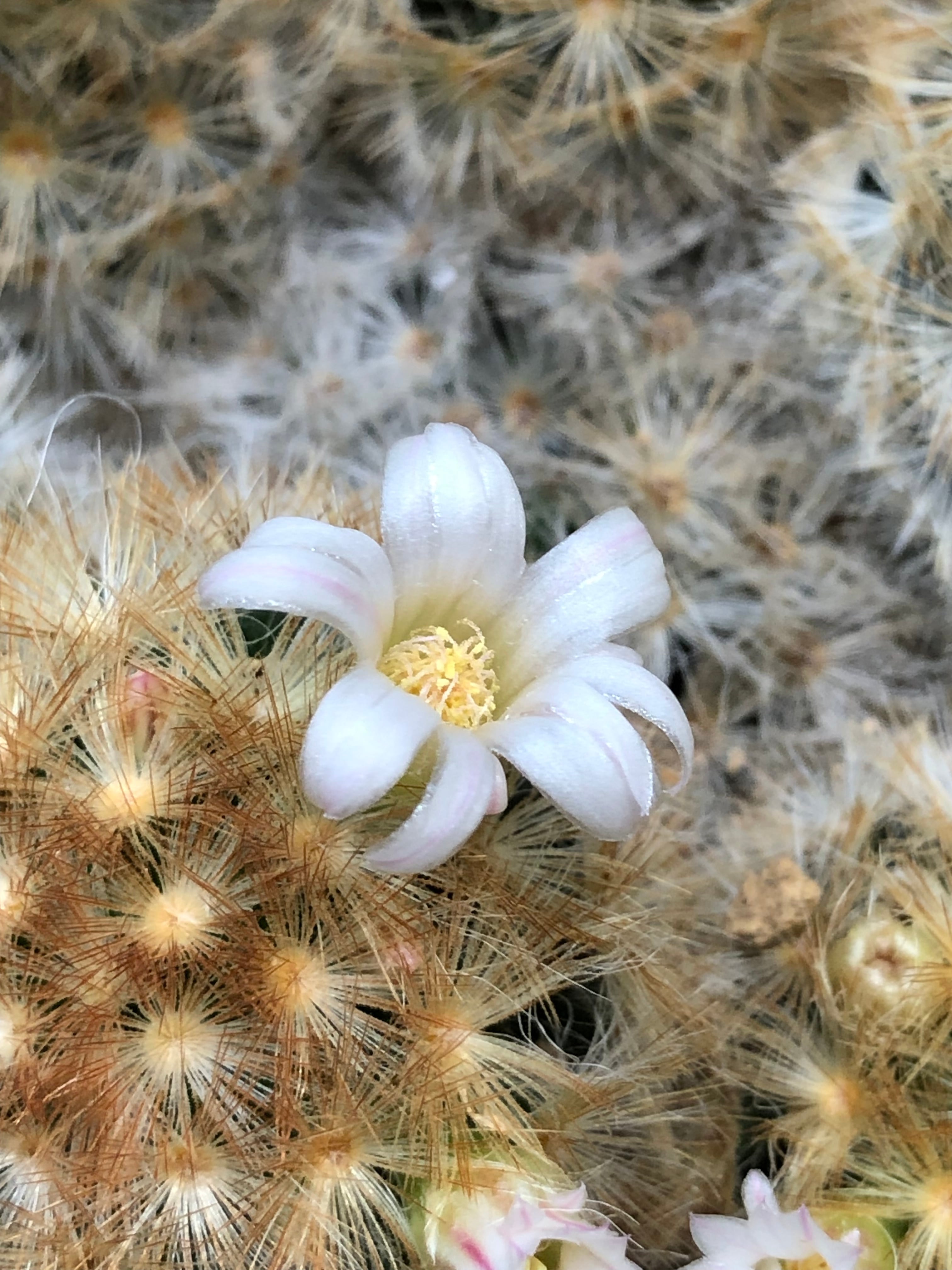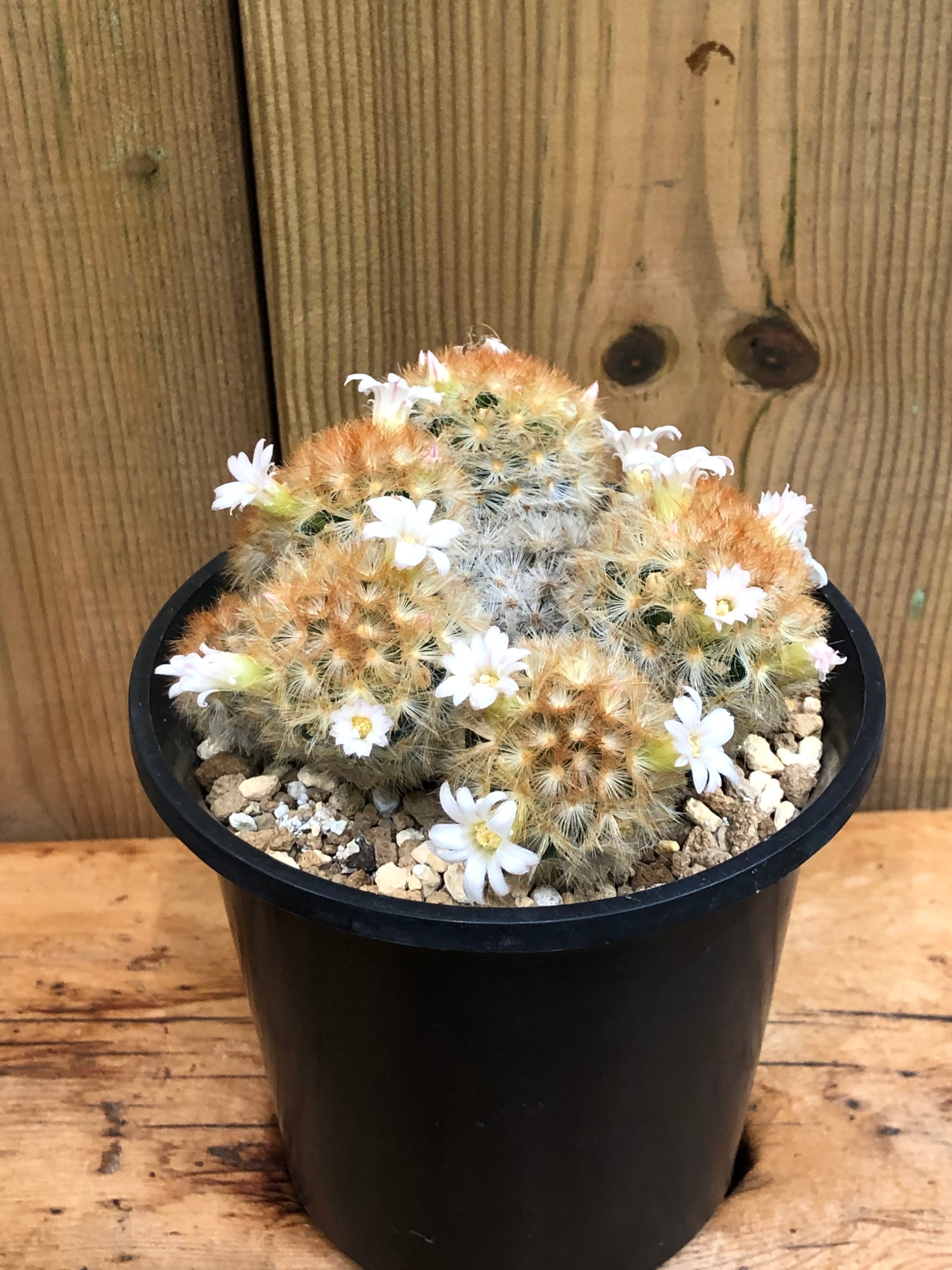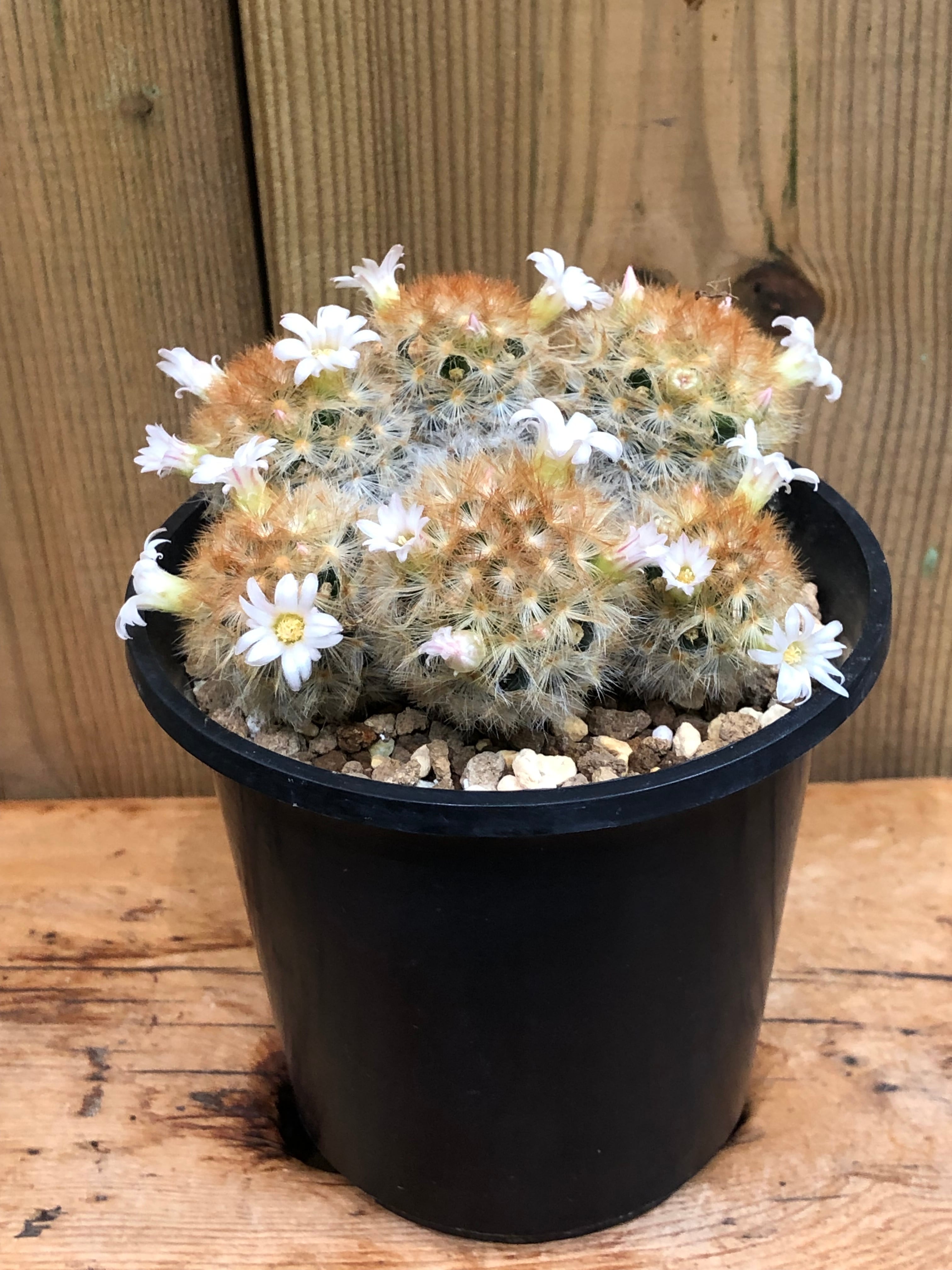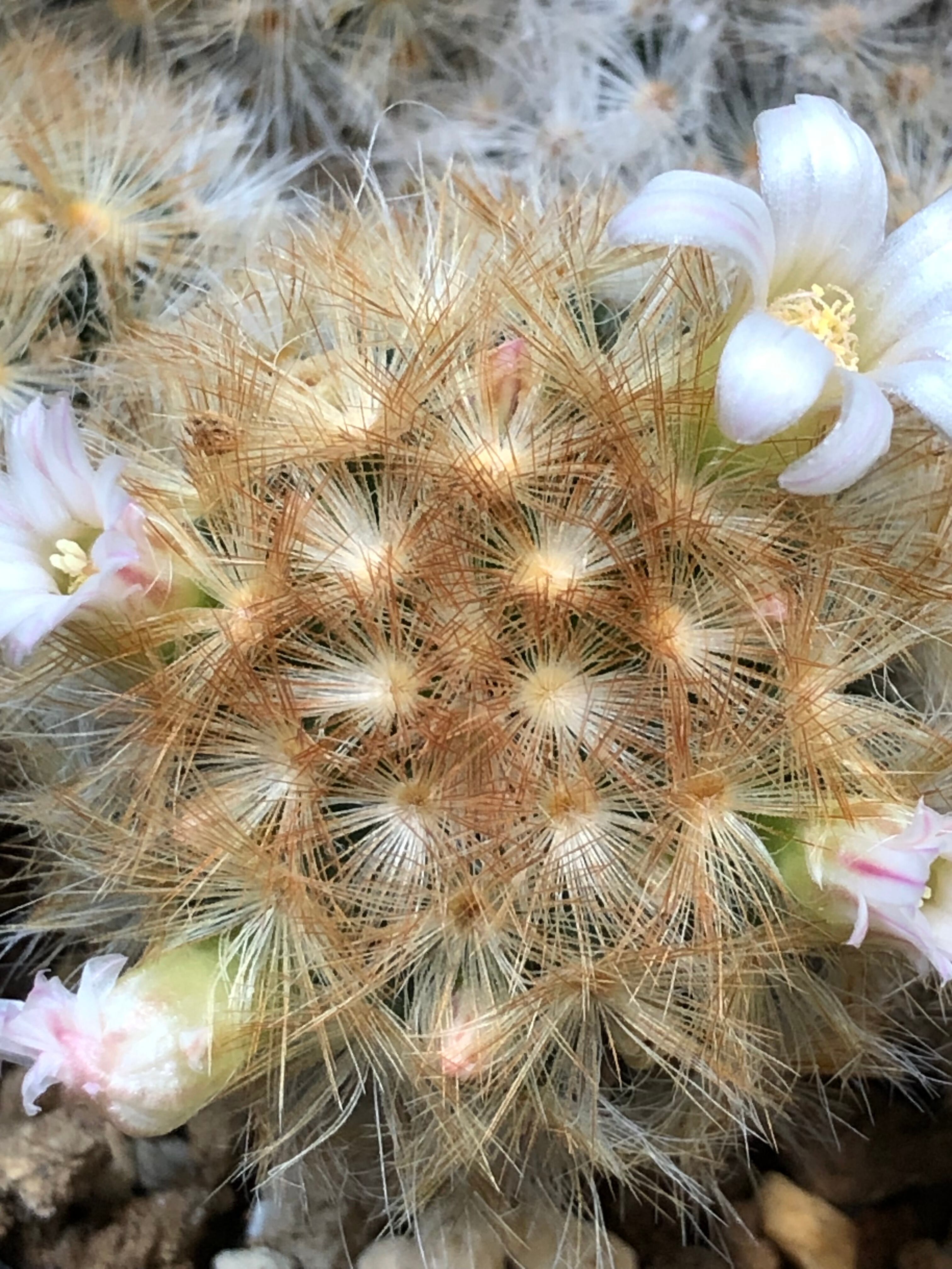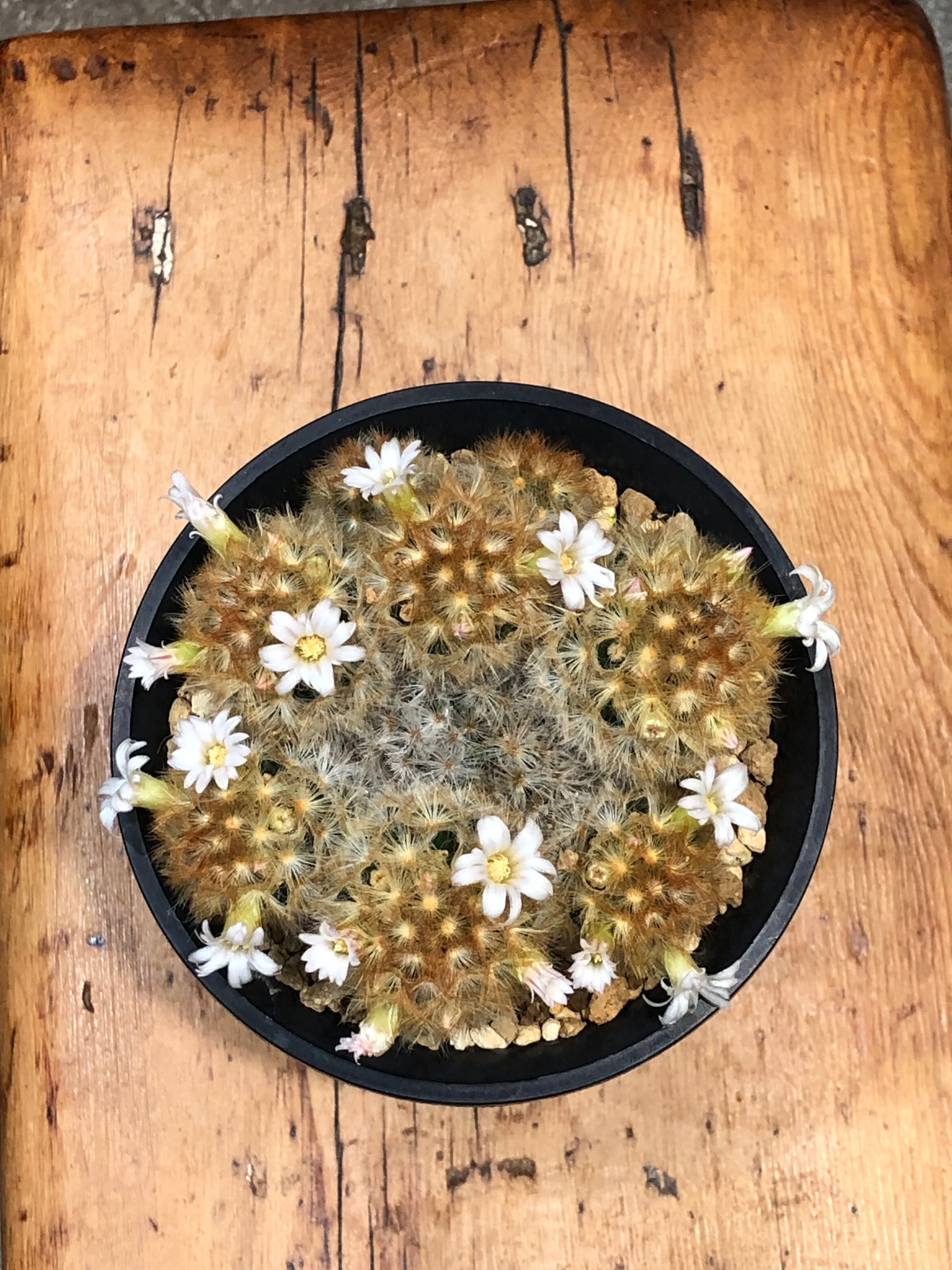 メキシコ原産の小型のサボテンで群生しやすく棘が密集して毛玉の様な見た目も可愛い品種で、あちらこちらで花が咲いて華やかです。