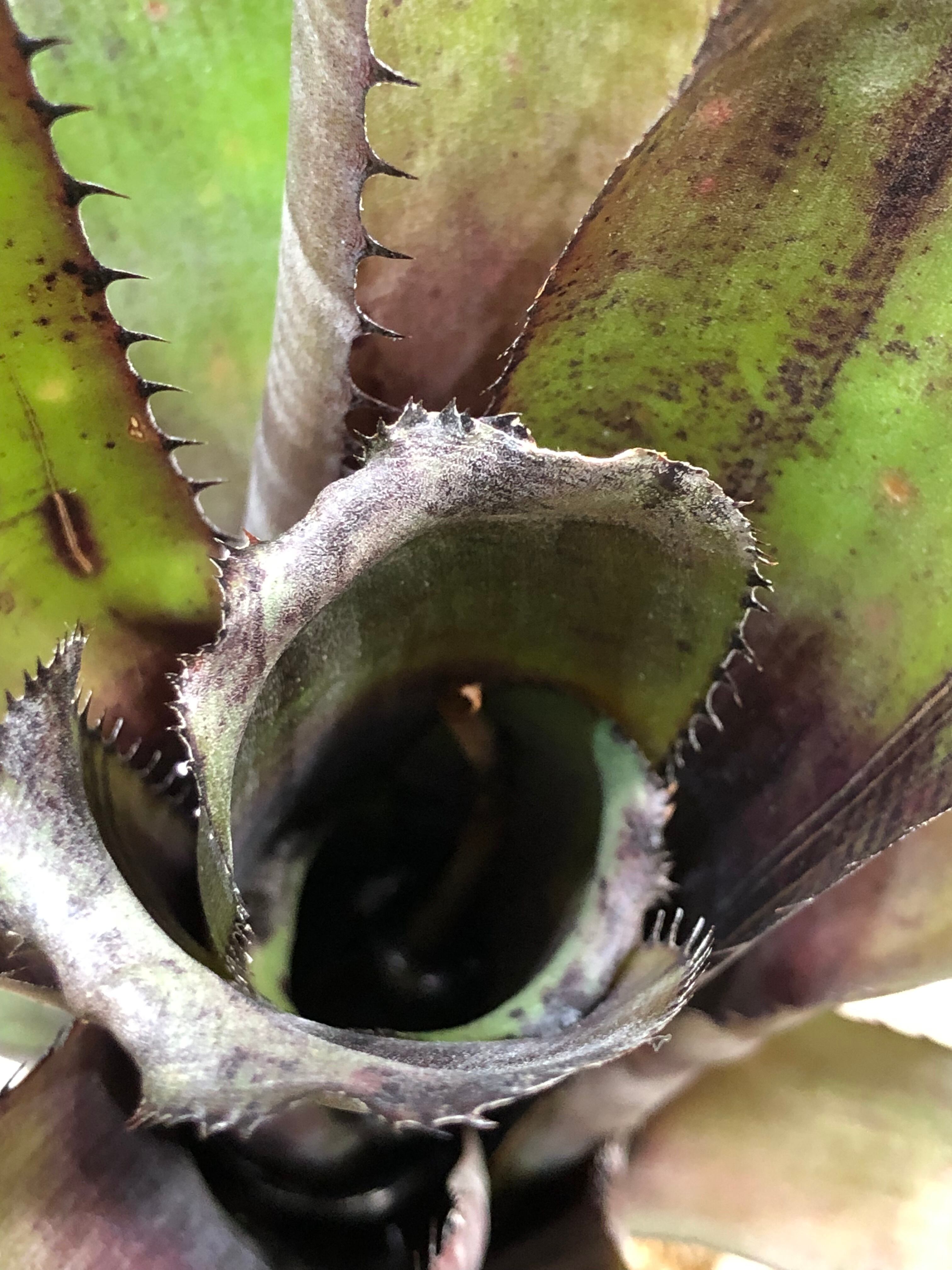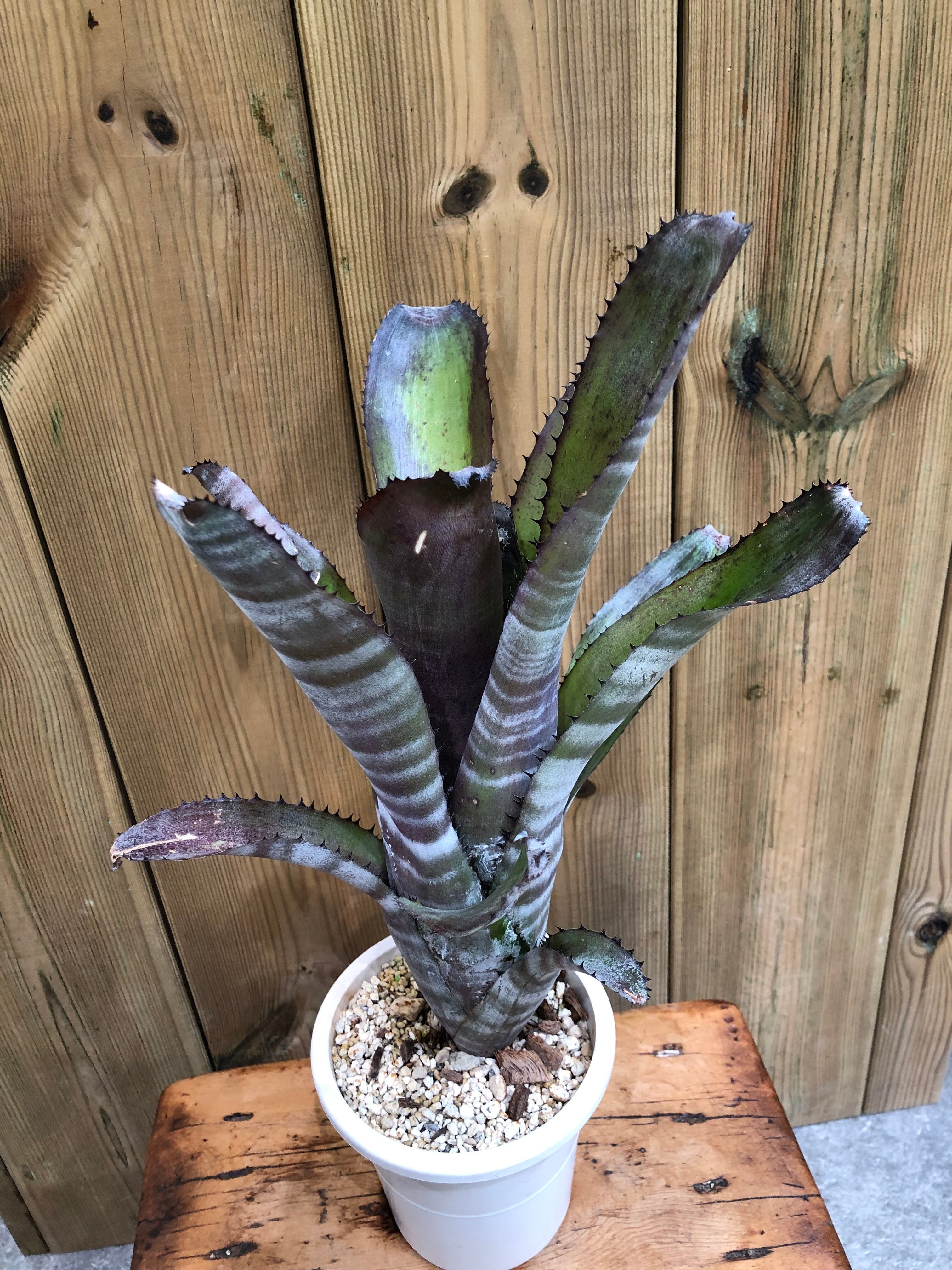 南米原産のビルベルギアの交配種で黒紫色に白いバンド模様が入ります。