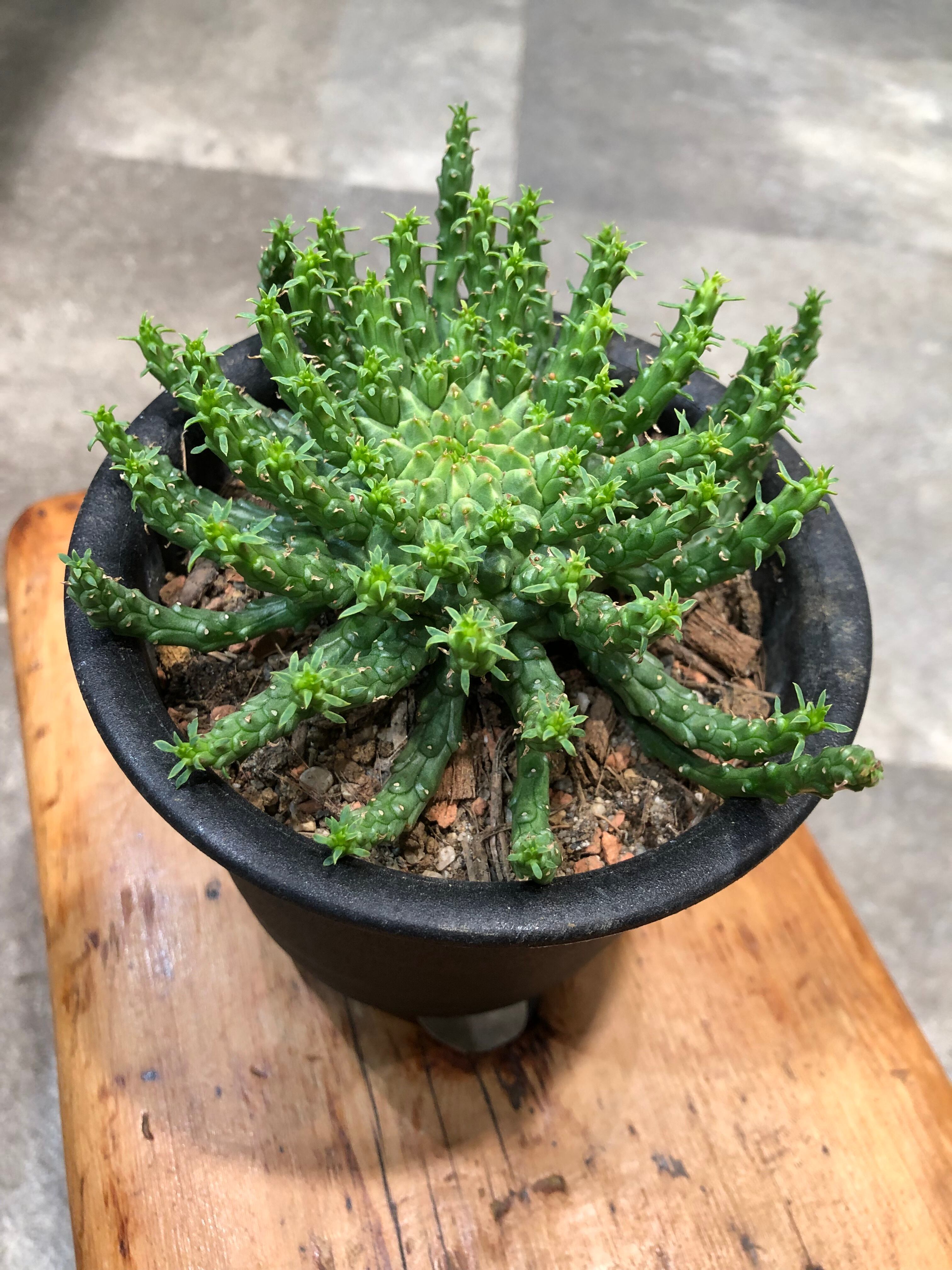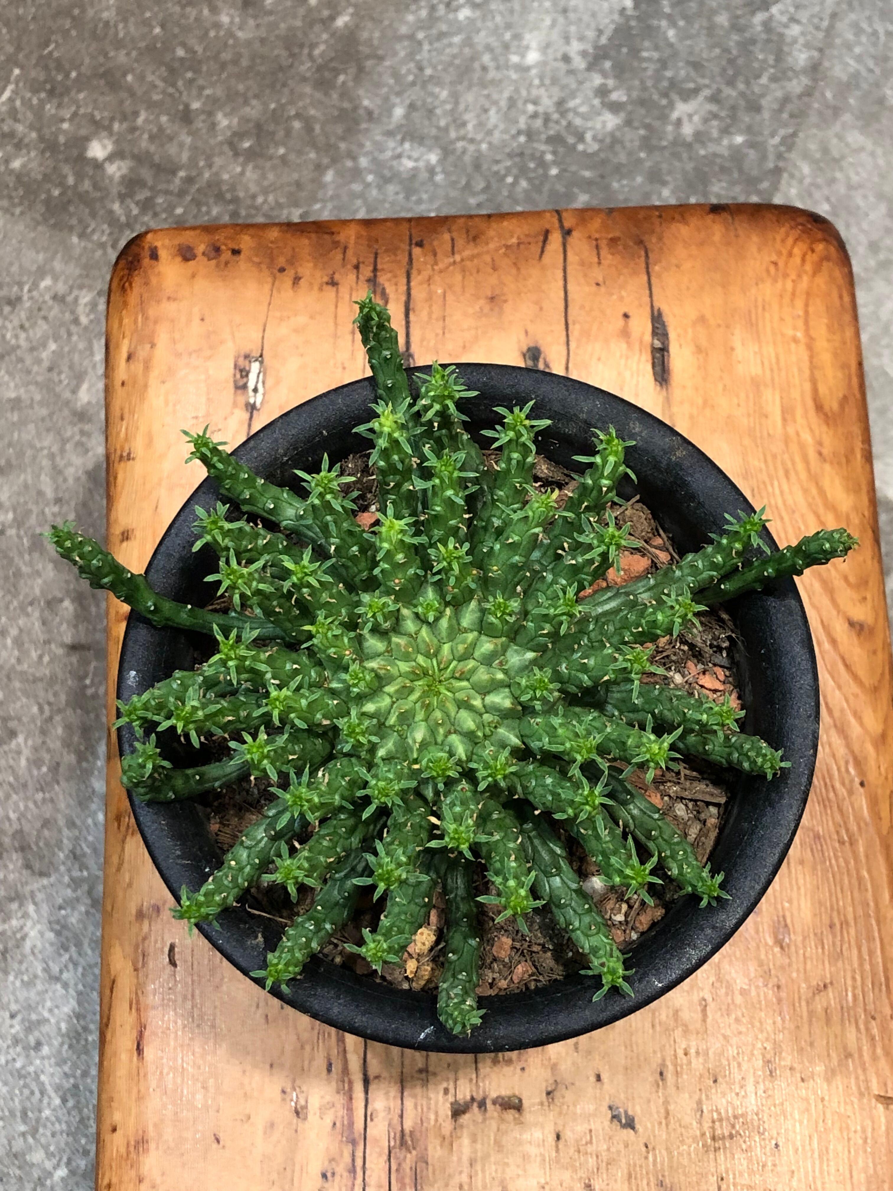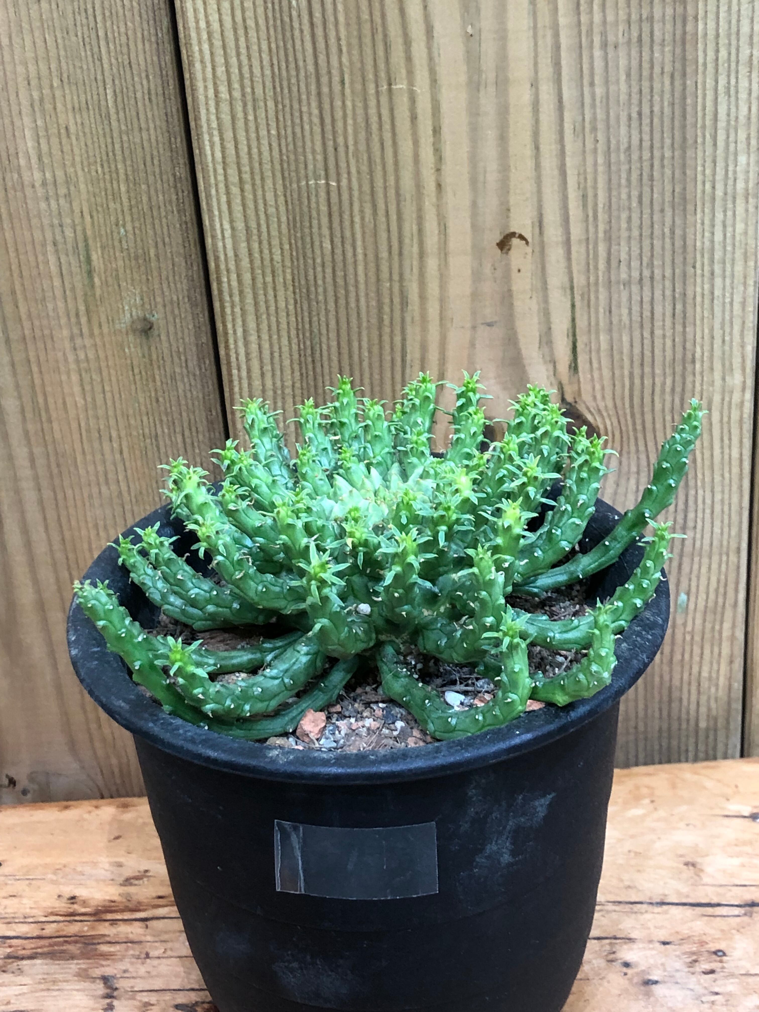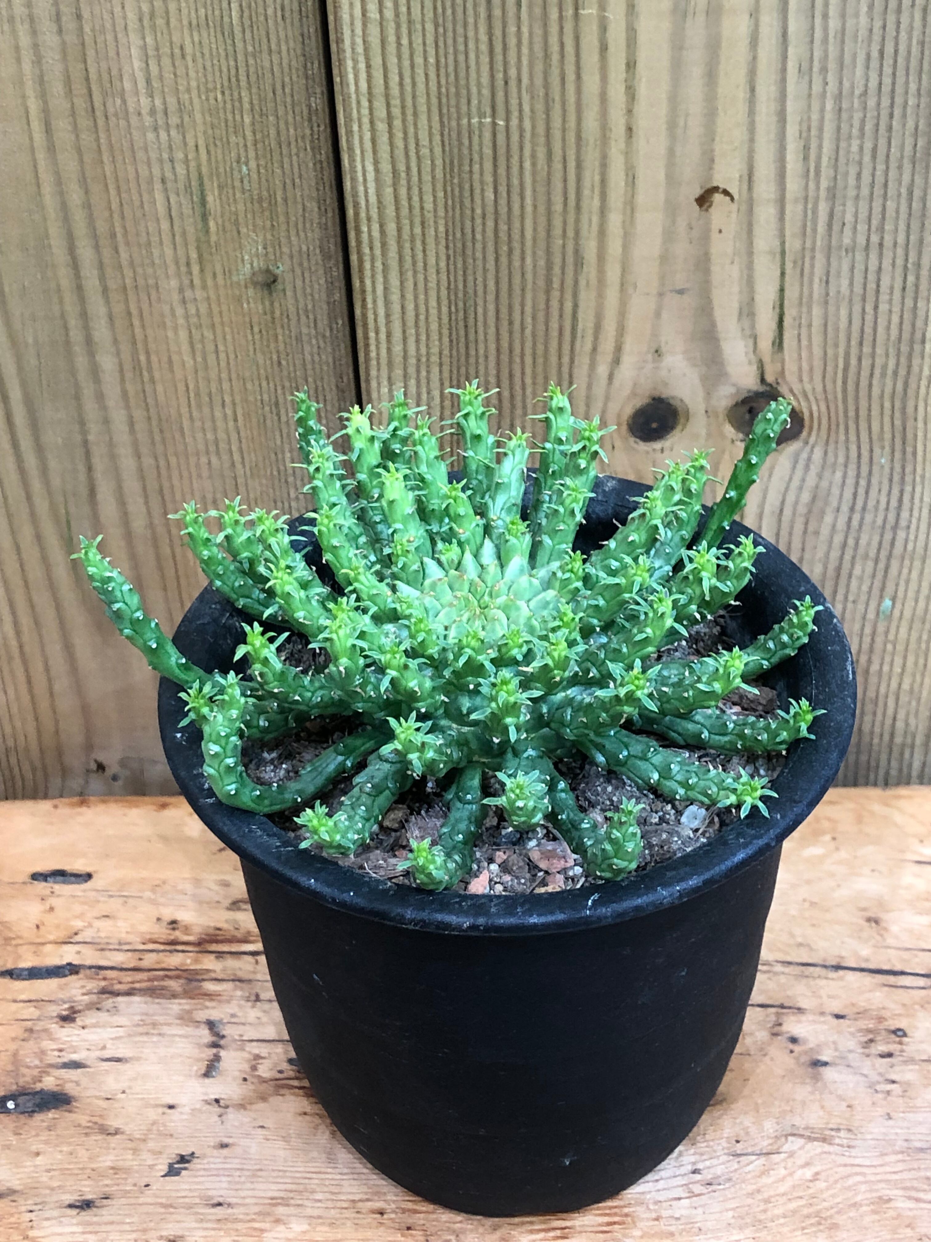 南アフリカ原産のタコものユーフォルビアでボコボコした塊根部から鱗に覆われた様な枝を四方八方に伸ばしながら成長します。
