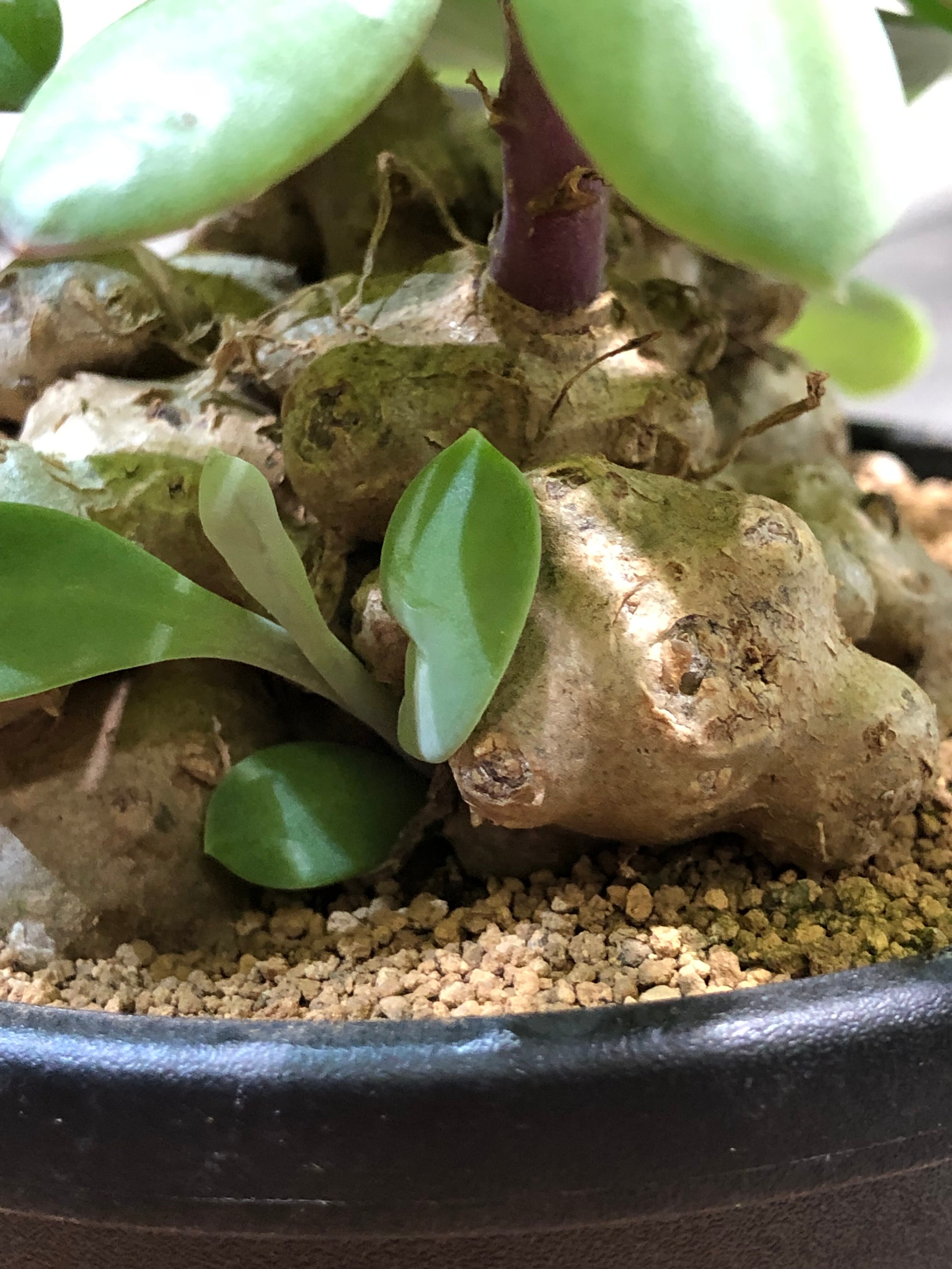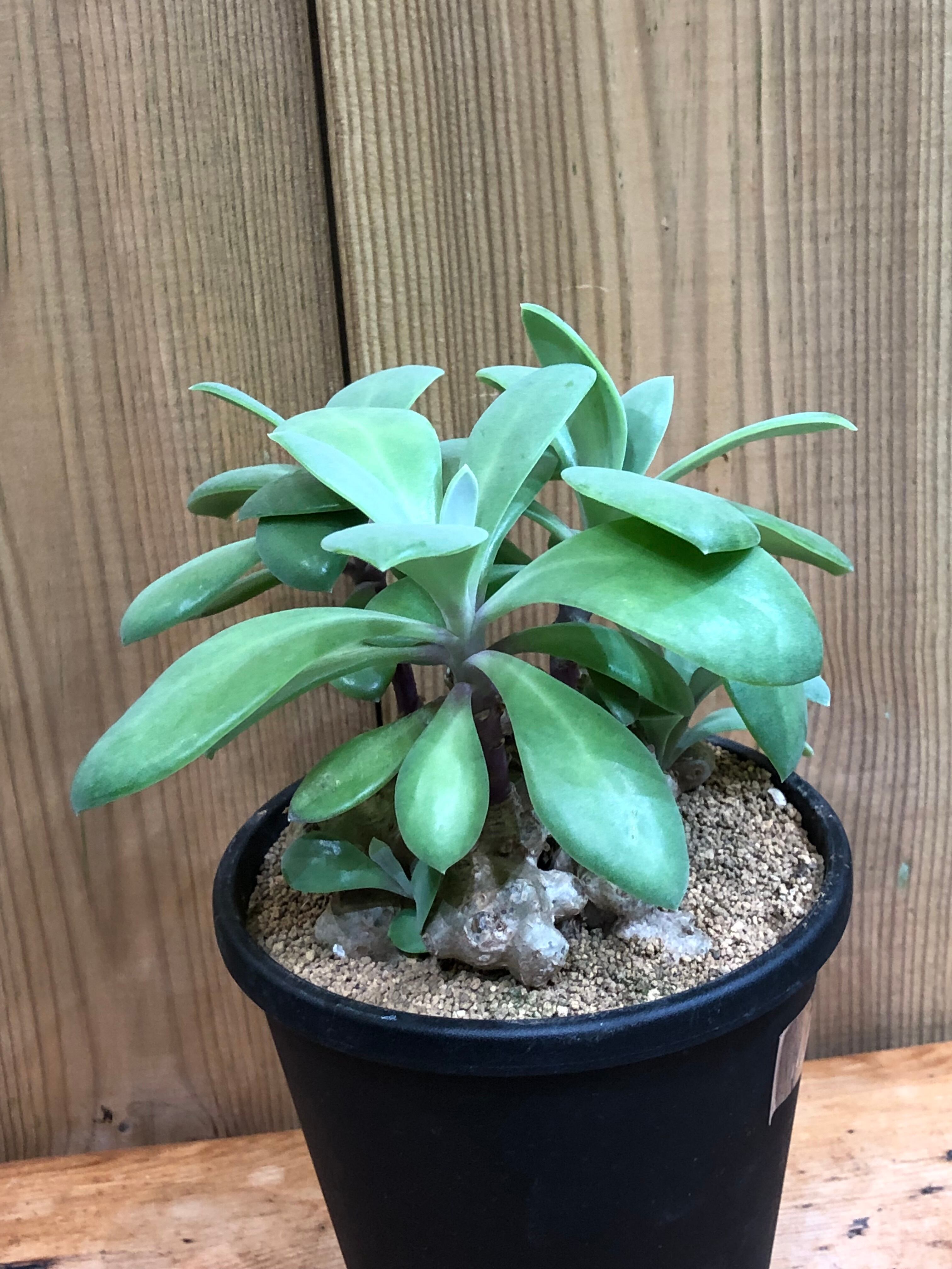 カナリア諸島原産のクレイニアの交配種で、塊根部はいくつかの球体の塊根が連なった様な奇妙な形状で、肉厚な艶のある多肉質な葉を展開します。
