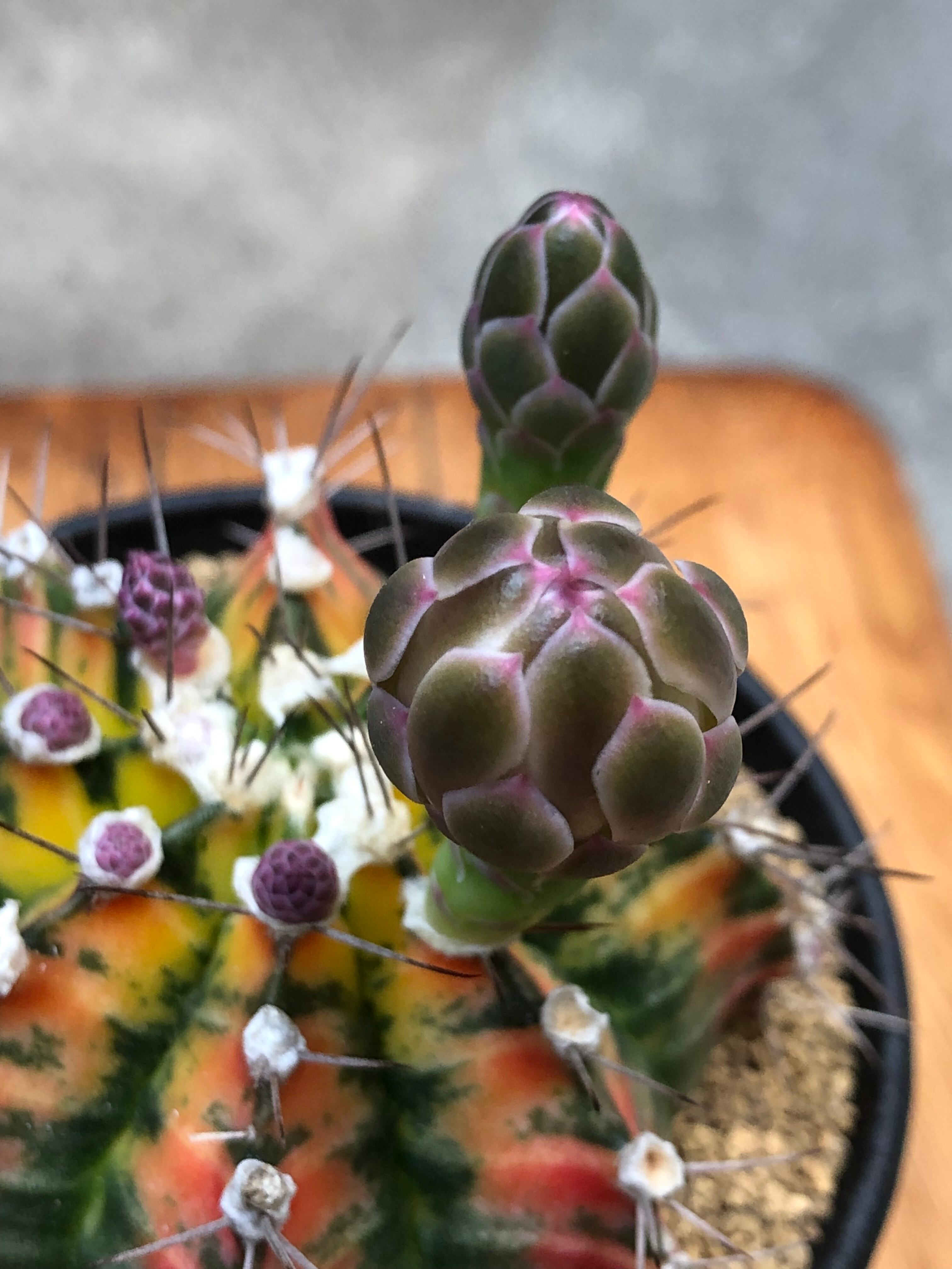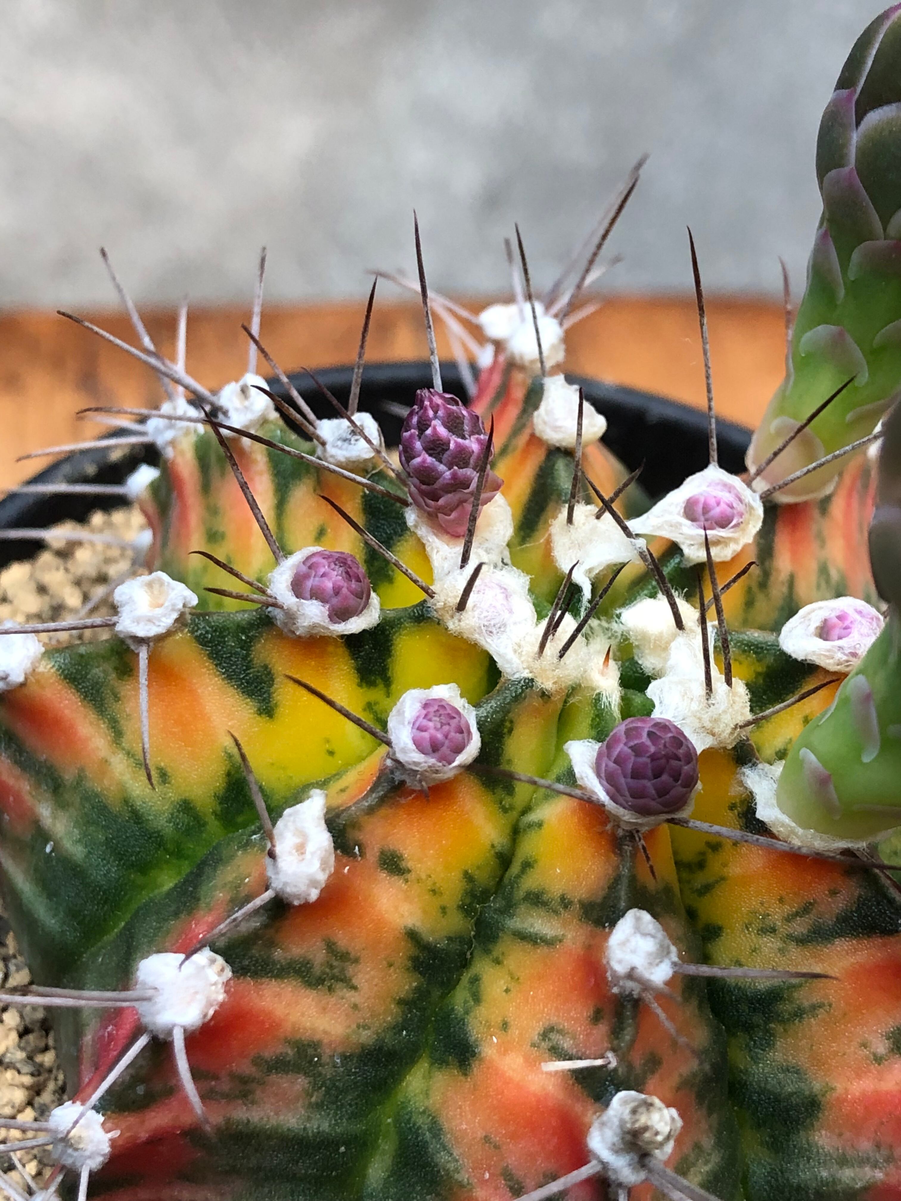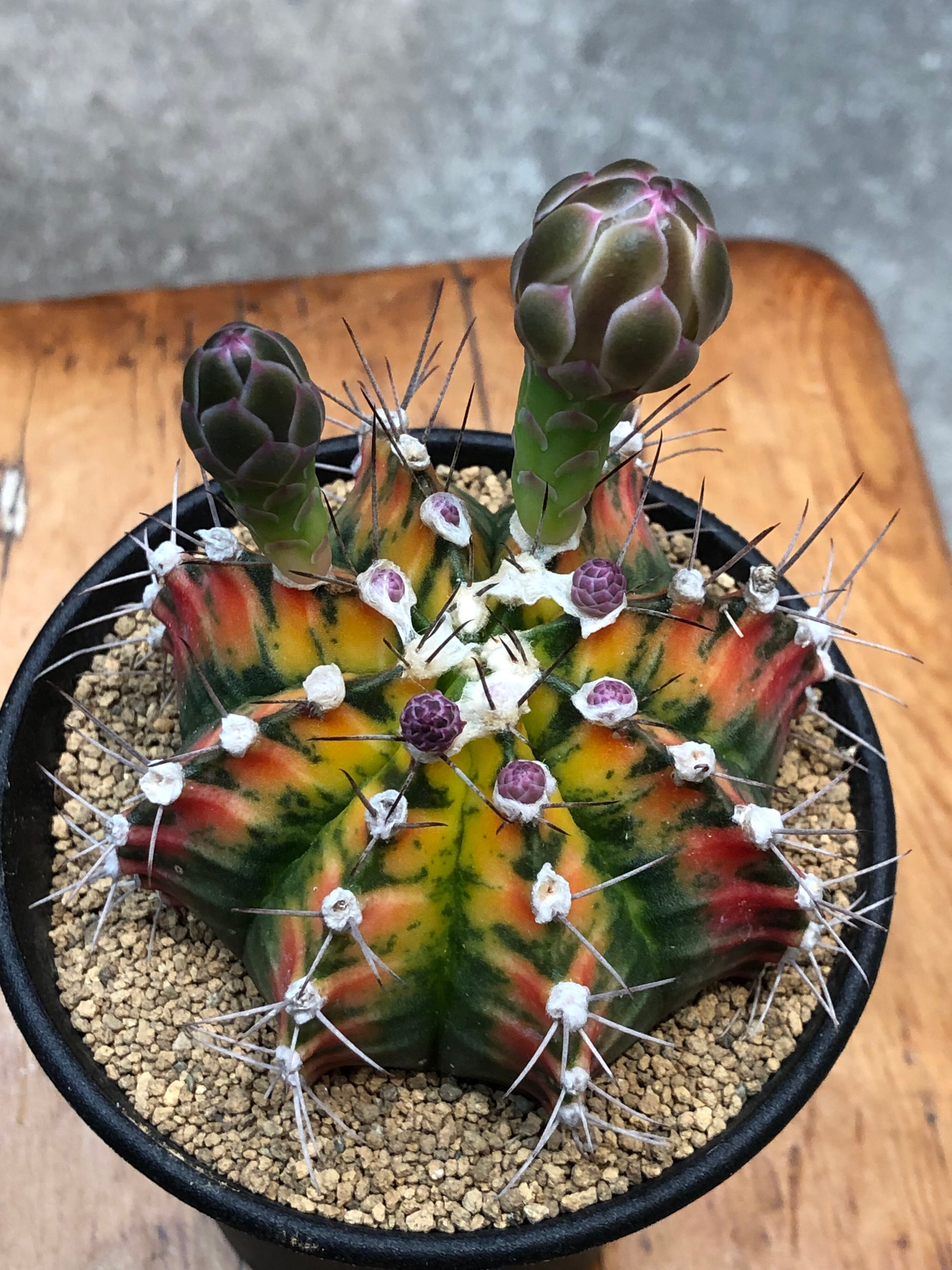 南米原産のギムノカリキウムの牡丹玉等の交配種で赤色・黄色・オレンジ・紫がかった深い緑色等の様々な色味の個体があり、グラデーションが美しいサボテンです。