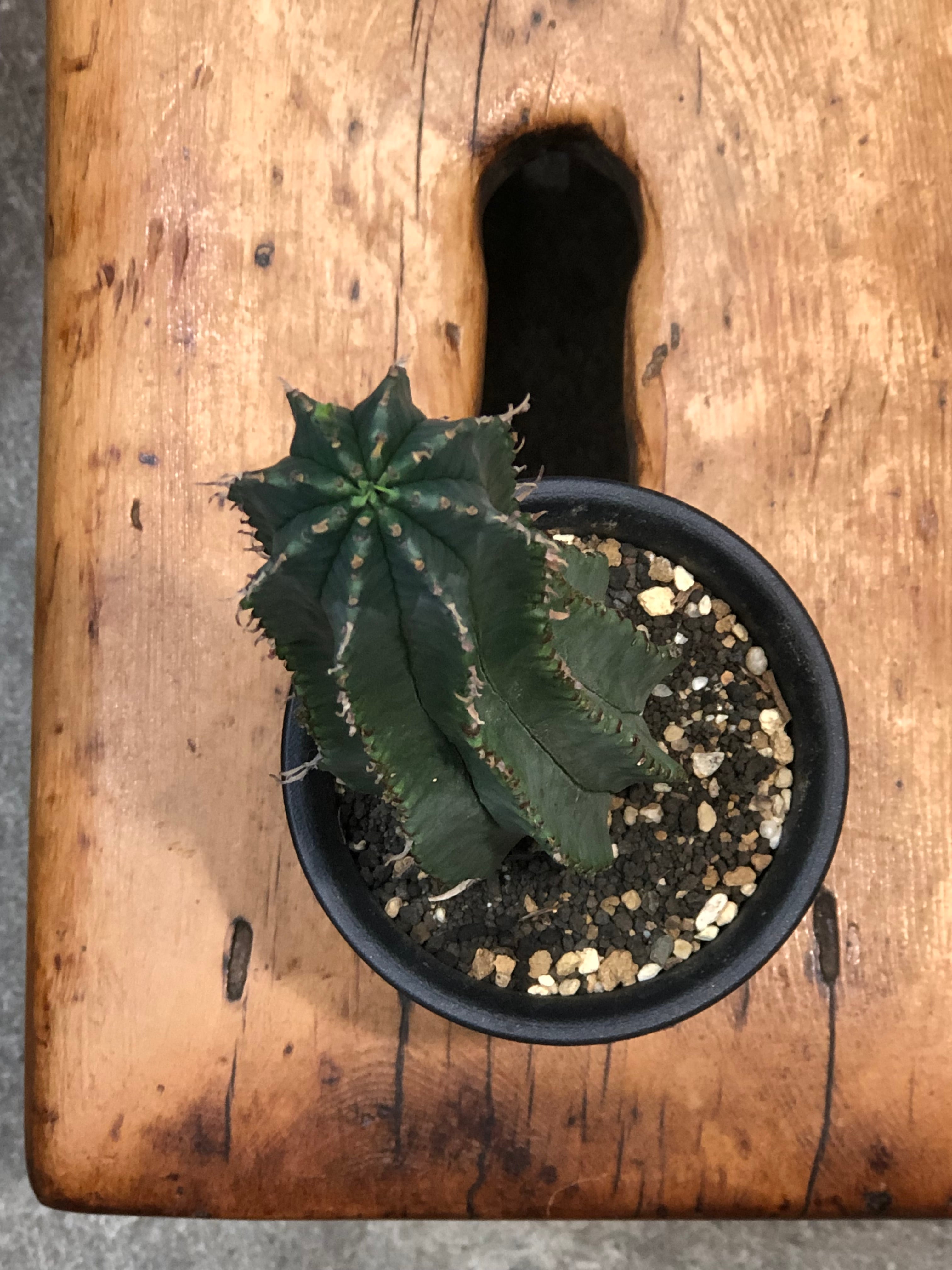 南アフリカ原産のユーフォルビア・ホリダとバリダの交配種で、成長点付近から稜に沿って小さな葉を生やし、年月と共に株元から木質化します。