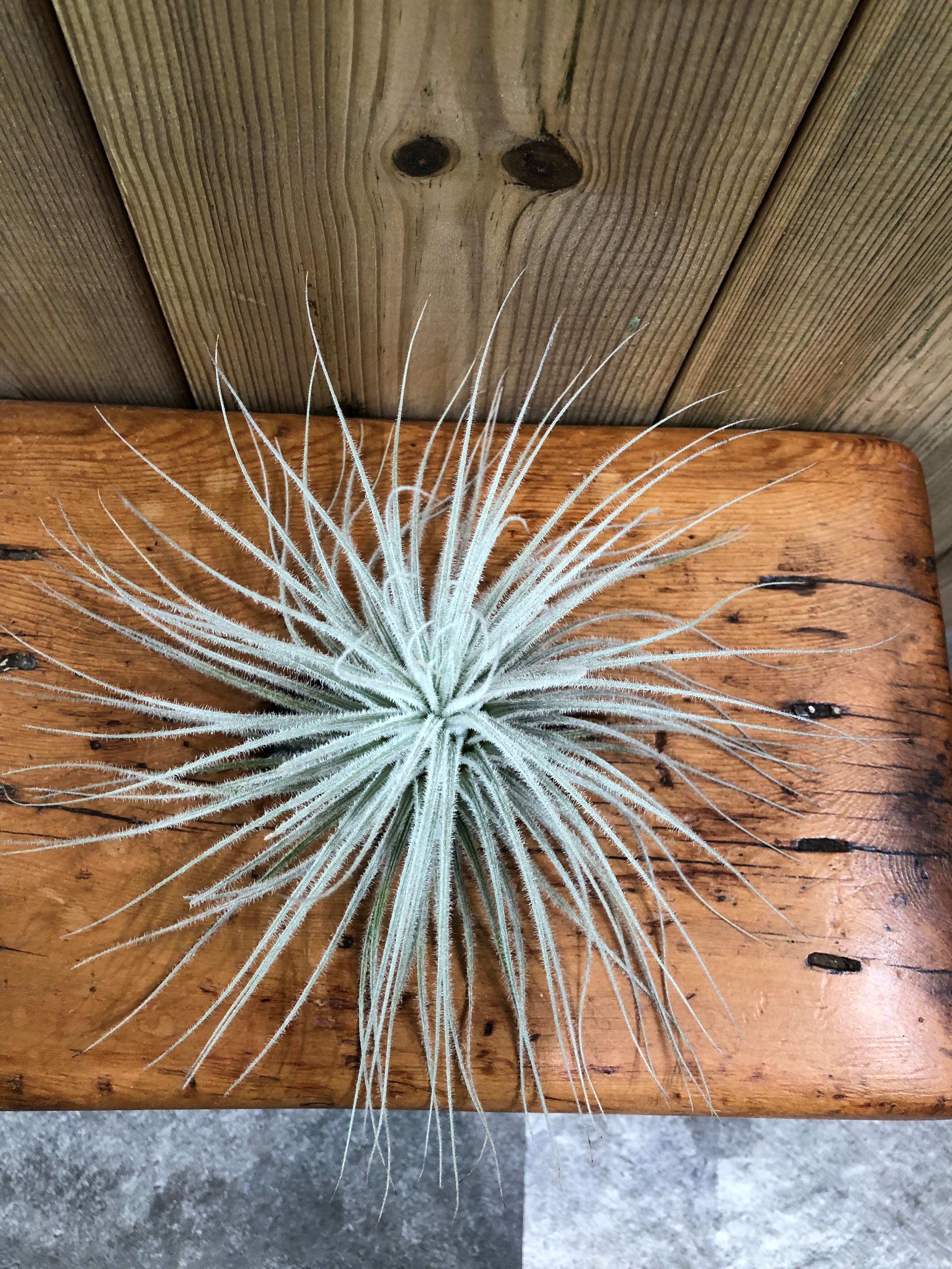 成長期の水遣りは屋外で真夏であれば、夕方以降の涼しくなってくる時間帯に株全体を濡らす様に週に2回〜3回を目安にします。他の品種に比べて乾燥にはかなり強いのと、水をあげ過ぎるとトリコームが剥がれてしまい、テクトラムの特徴の白くてフワフワした見た目が損なわれてしまいます。水遣りが足りていない場合は葉先から茶色く傷んでくるので、その場合は頻度を増やします。水遣りは基本的に株全体が濡れるぐらいにあげます。風通しが良ければ蒸れの心配も無いので出来る限り風通しを意識します。冬は屋内管理にして、週に1回〜3回ぐらいの水遣りにします。屋内の場合は水遣り後に水は逆さにして完全に切った状態にしてから元の位置に戻します。出来ればサーキュレーター等で軽く風を当ててあげると蒸れにくく管理しやすいです。エアープランツのエアーは風が必要なエアーだという認識で管理します。