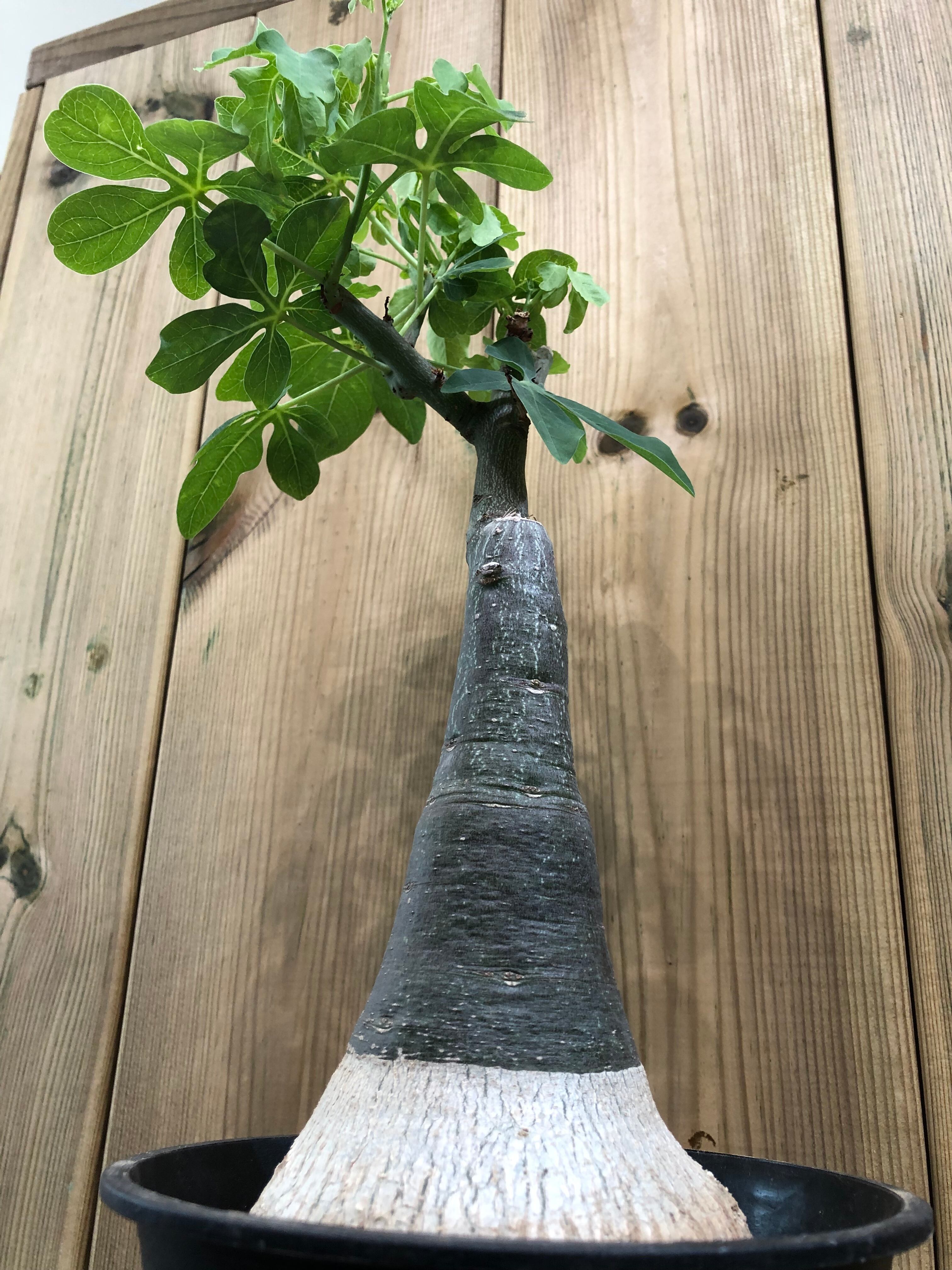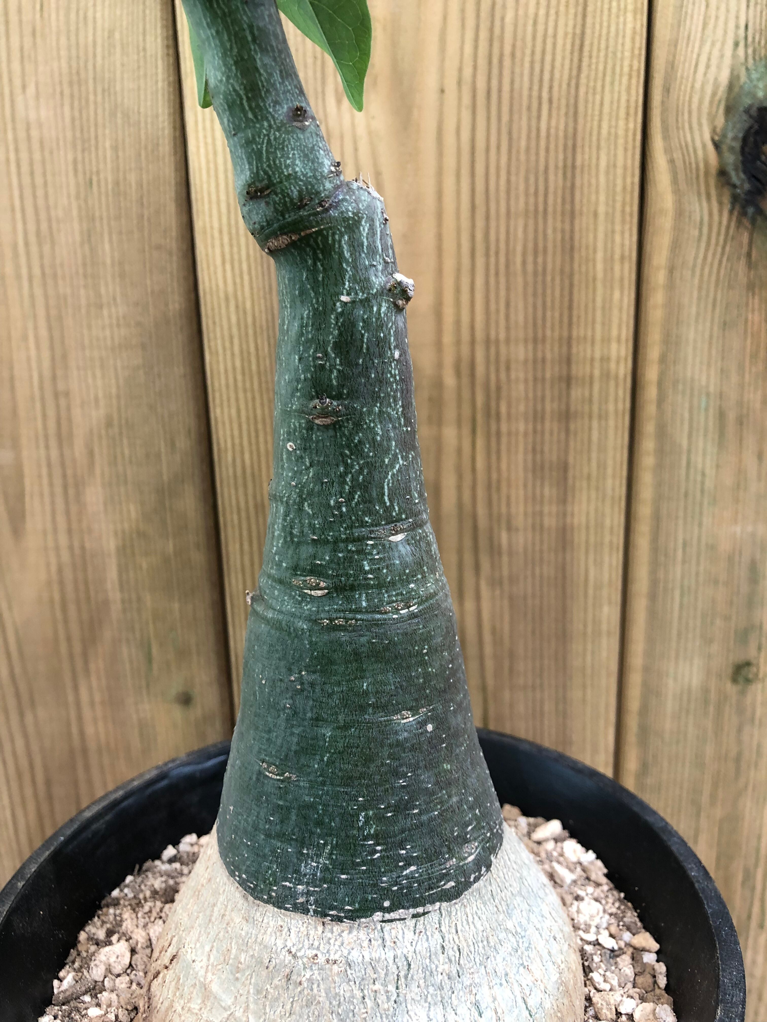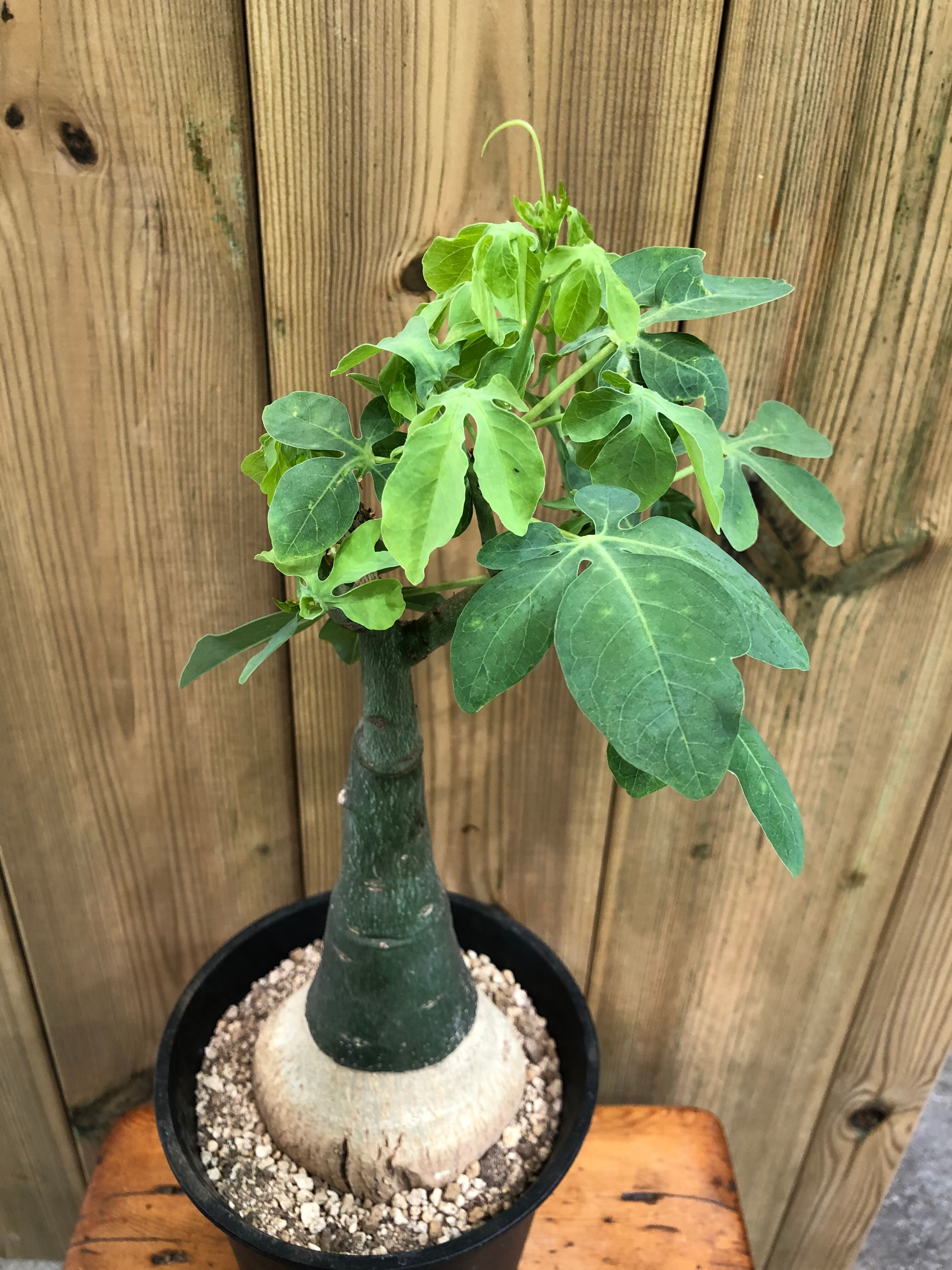 南アフリカ原産の蔓性の塊根植物です。性質は強健で育て易く、成長も早めです。和名は幻蝶かずらといわれ葉の形が蝶の様に見える事からそう呼ばれている様です。蔓の伸びるスピードが早く育てがいのある植物で成長期は他の塊根植物よりも水は欲しがる傾向があります。水遣りの頻度が多過ぎると縦方向に伸びやすくなるので、あげ過ぎない方が良いです。直射日光に塊根部が長く当たると日焼けして赤くなるので、塊根部は直射日光に長時間当てない様に注意します。
