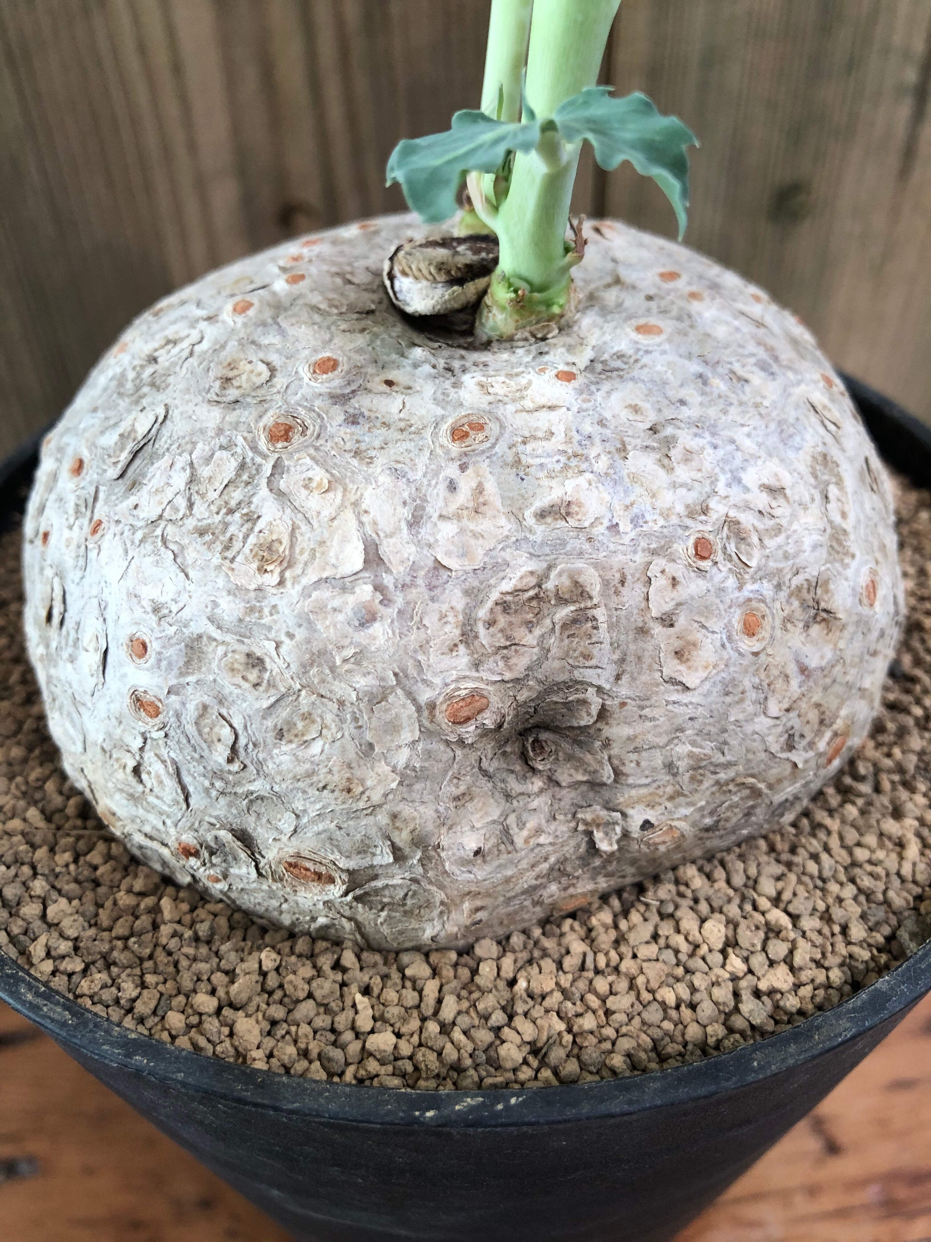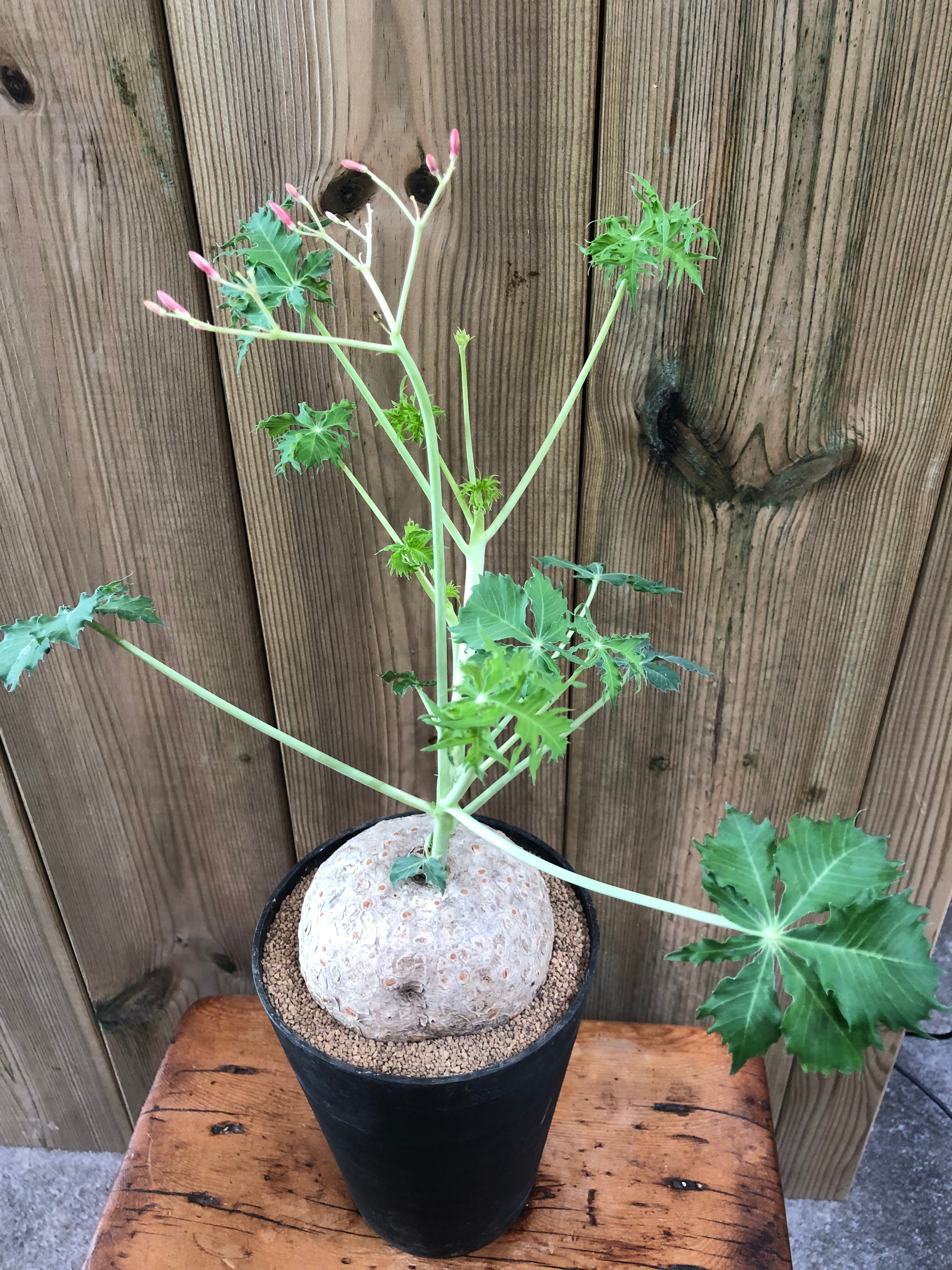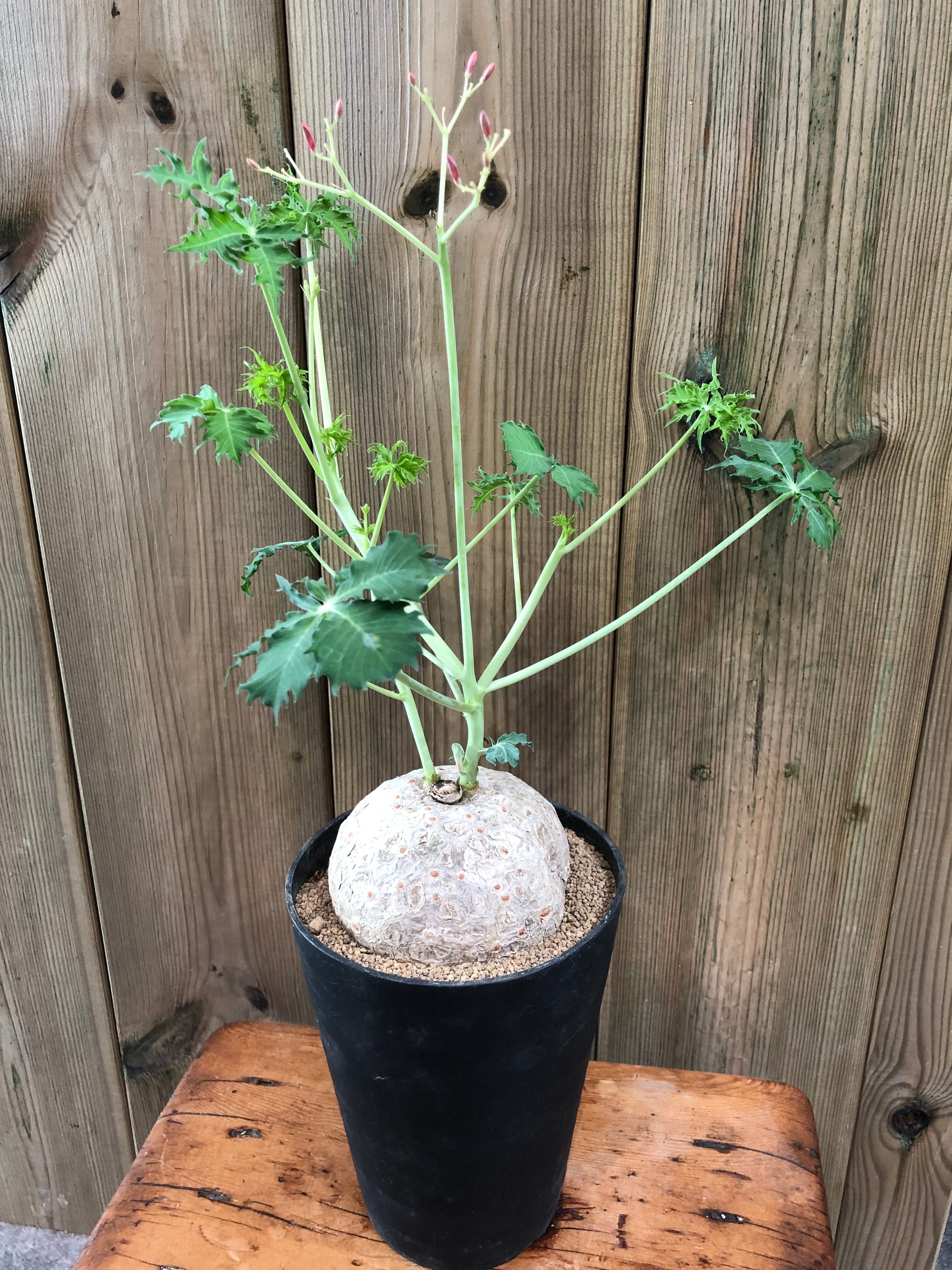 アメリカ原産の塊根植物です。まんまるな白肌の塊根と深い切れ込みの入った涼しげな葉に小さいピンクの花が咲き、綺麗な塊根植物といった印象です。育て易い塊根植物なのでオススメできます。