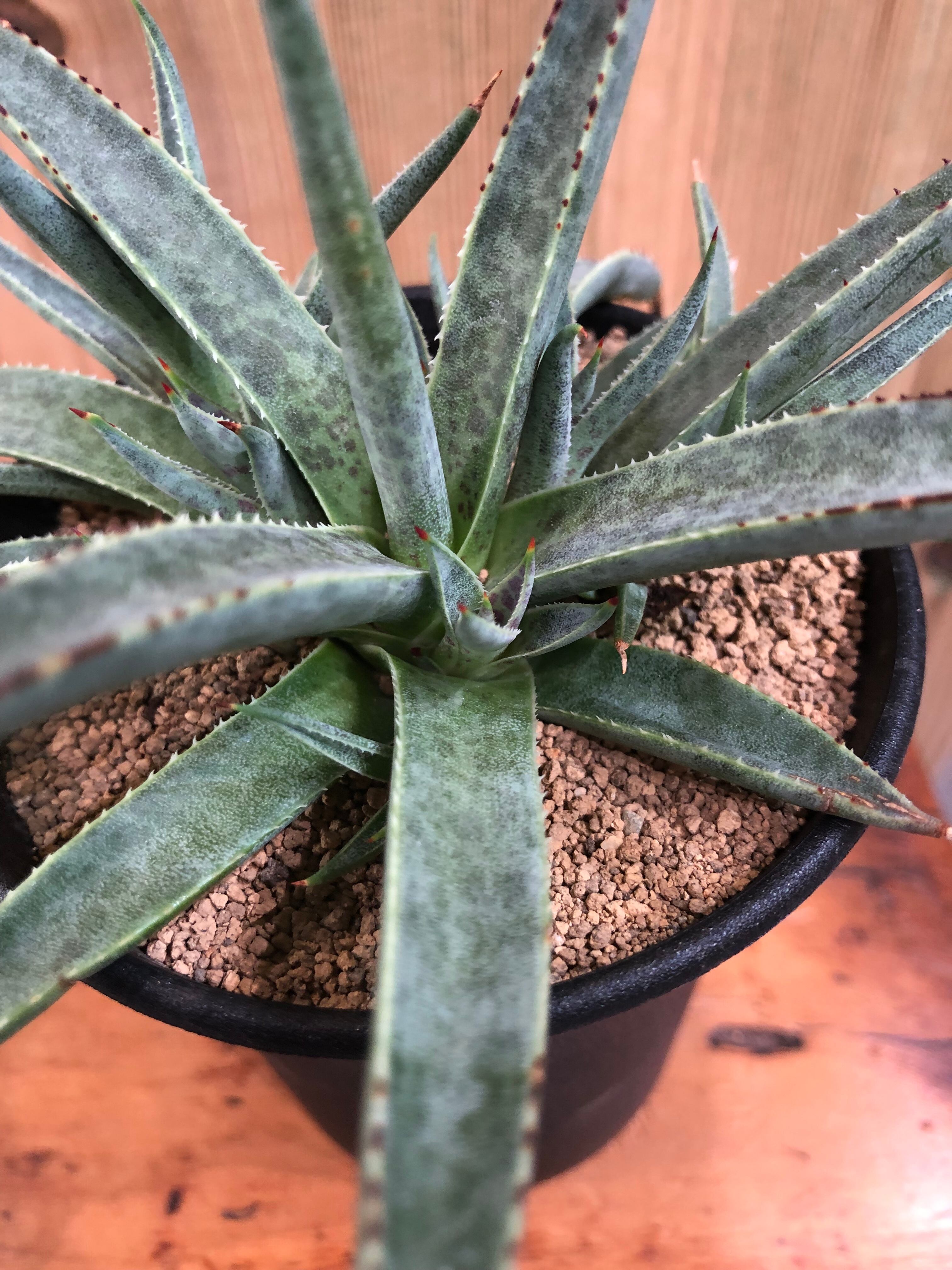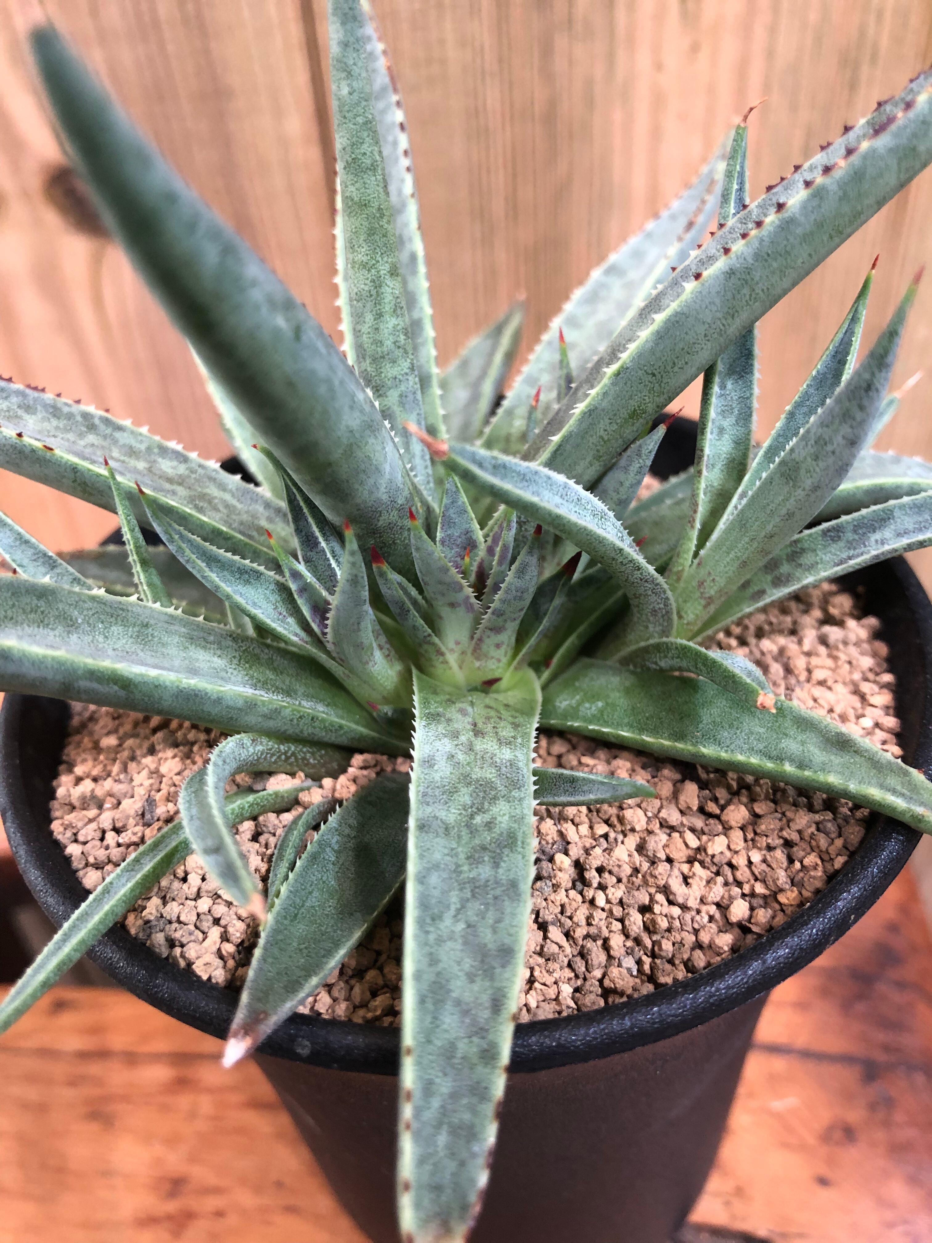アガベとマンフレダの交配種で、アガベよりも葉は柔らかくスポット模様が入っています。育て方はアガベと同じで問題ありません。鋸歯もアガベに比べて鋭さは無く少し優しい印象です。