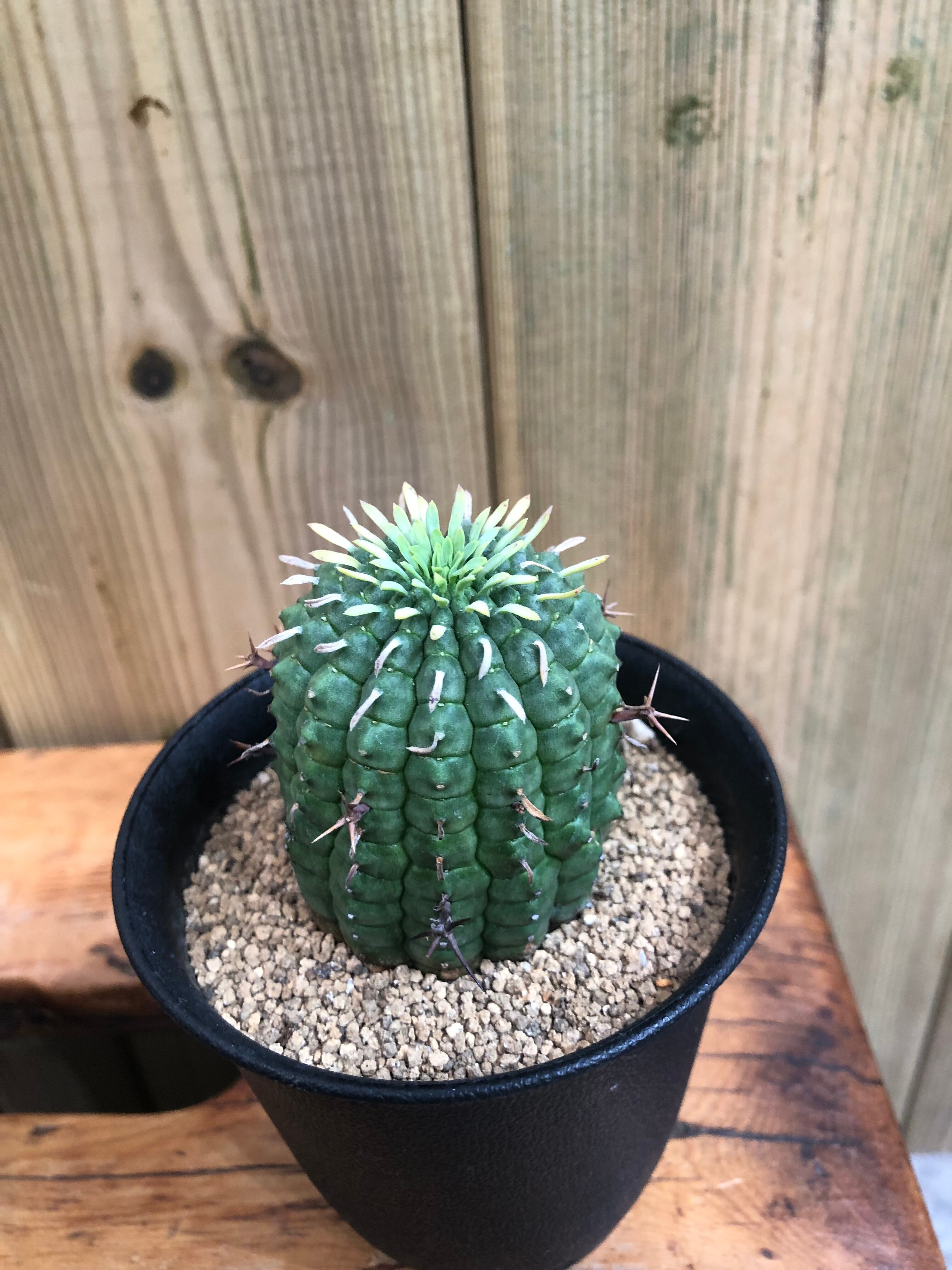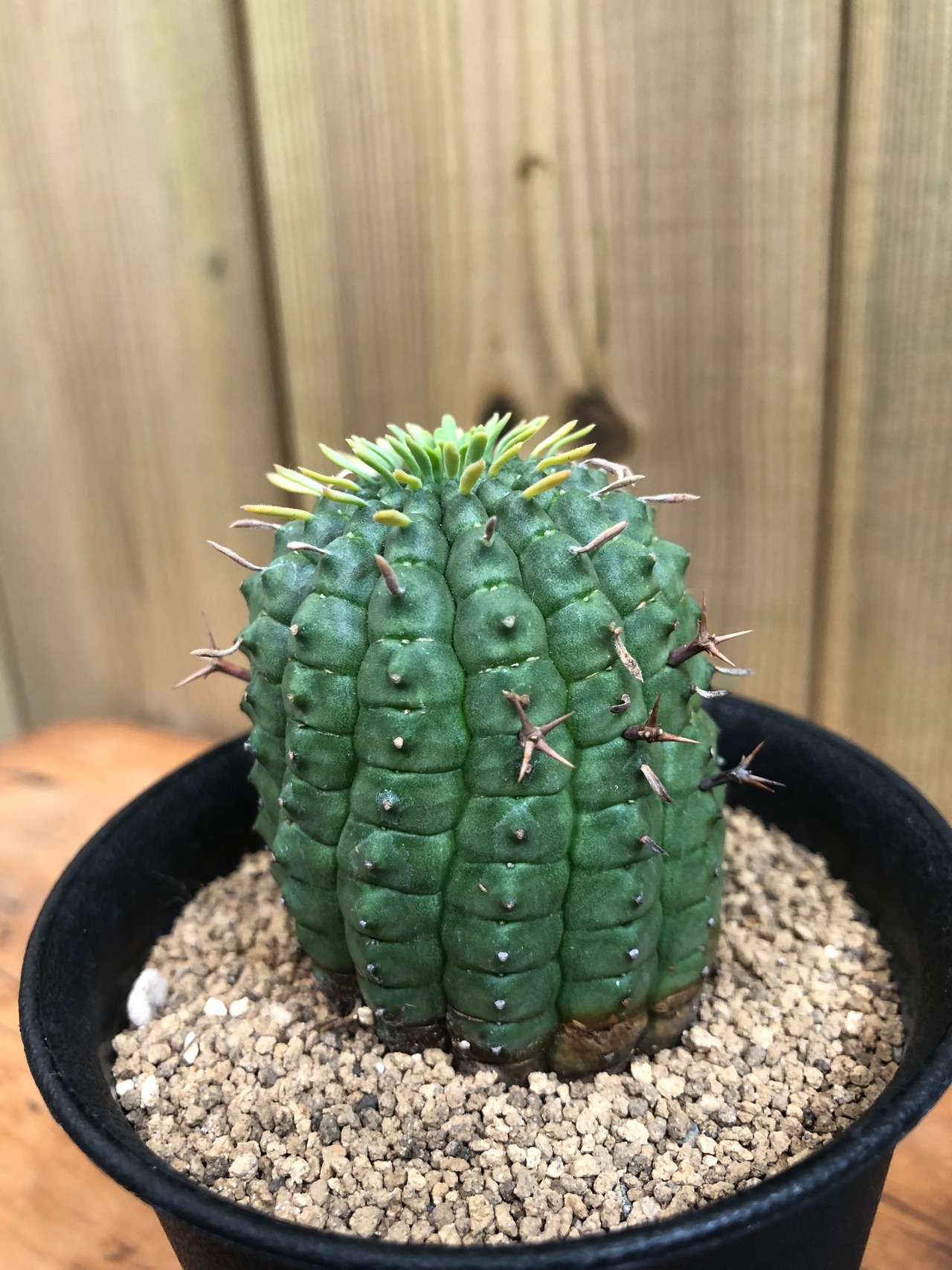 南アフリカ原産のユーフォルビアで花が終わった跡に花柄が星形に残る珍種です。成長点付近に葉を生やし四角いブロックを積み重ねた様な幹肌をしています。