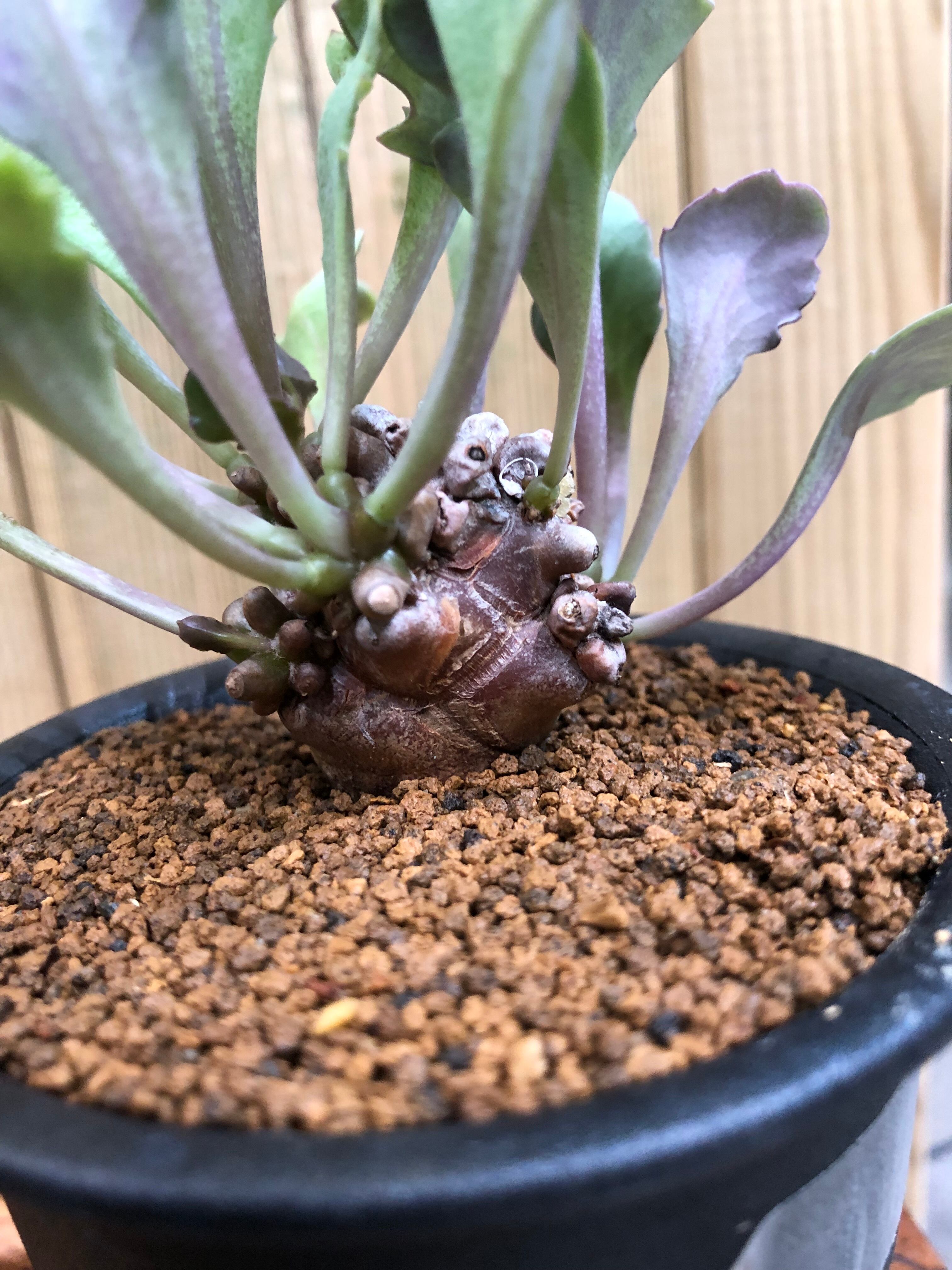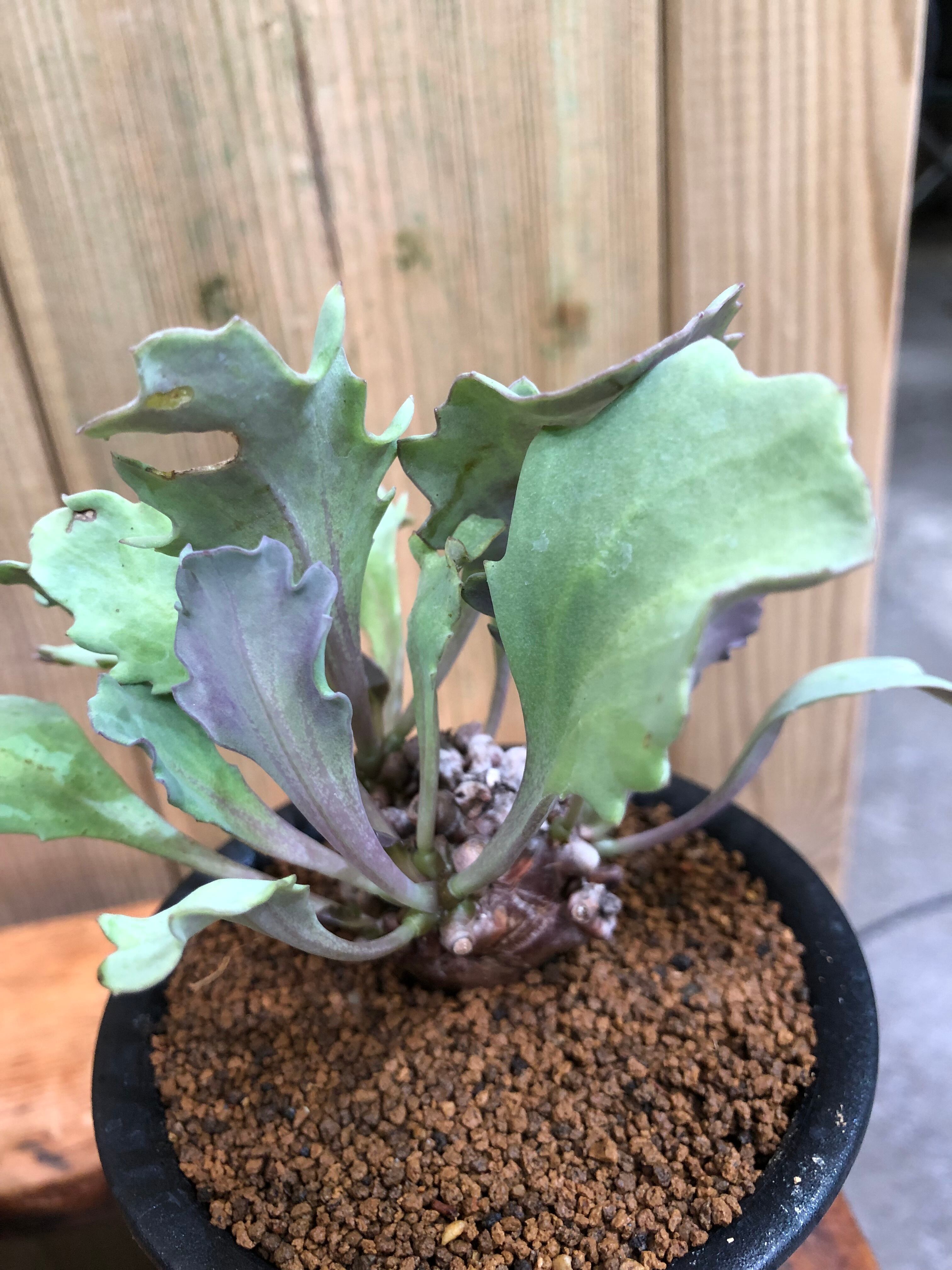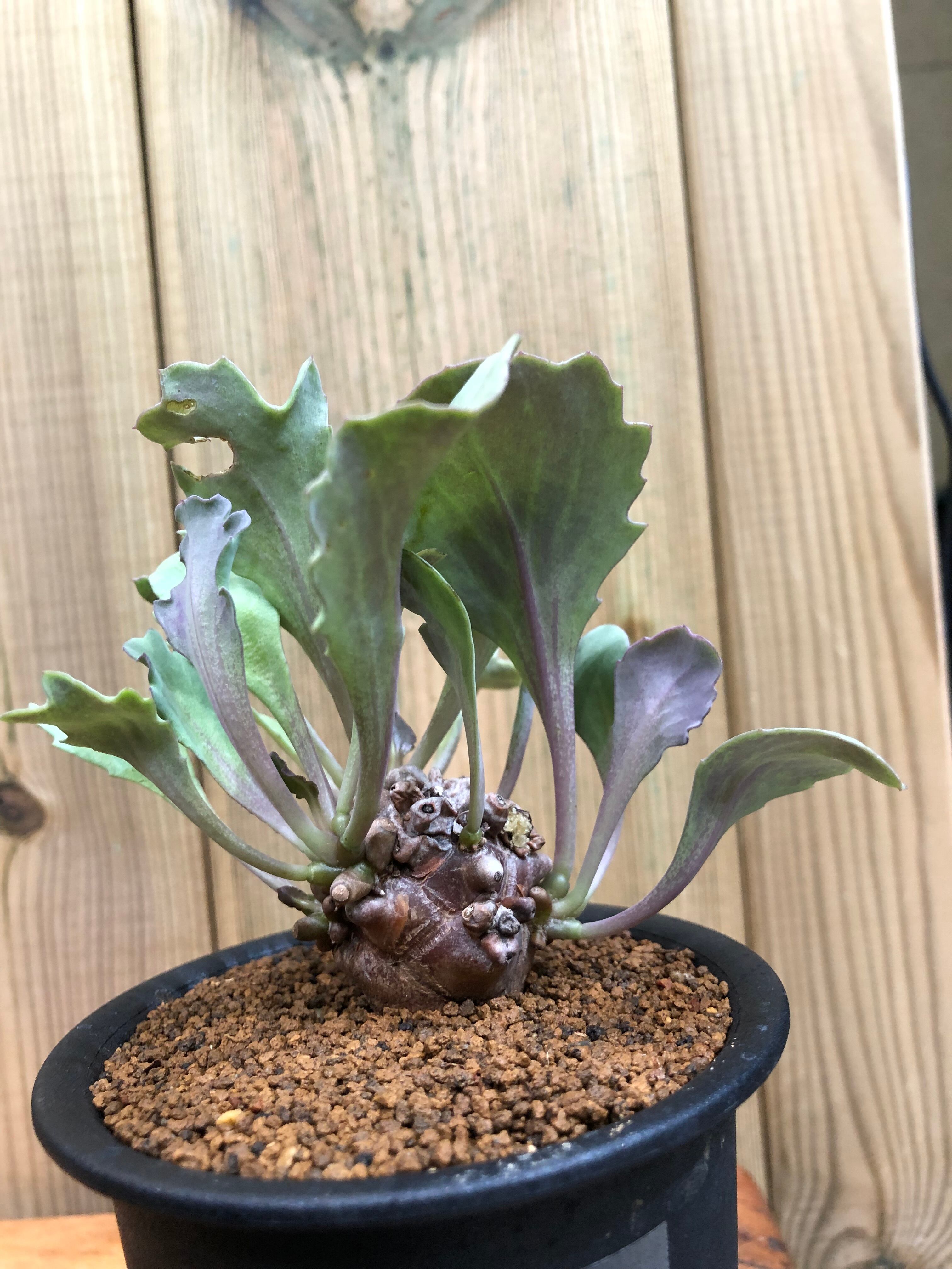 南アフリカ原産のオトンナ・へレイとオトンナ・アルミアナの交配種です。葉は丸い個体もあれば縁のギザギザが強い個体もあり、塊根部はかなり特徴的で株元はツルッとしていますが頭頂部はボコボコしていてかなり個性的です。