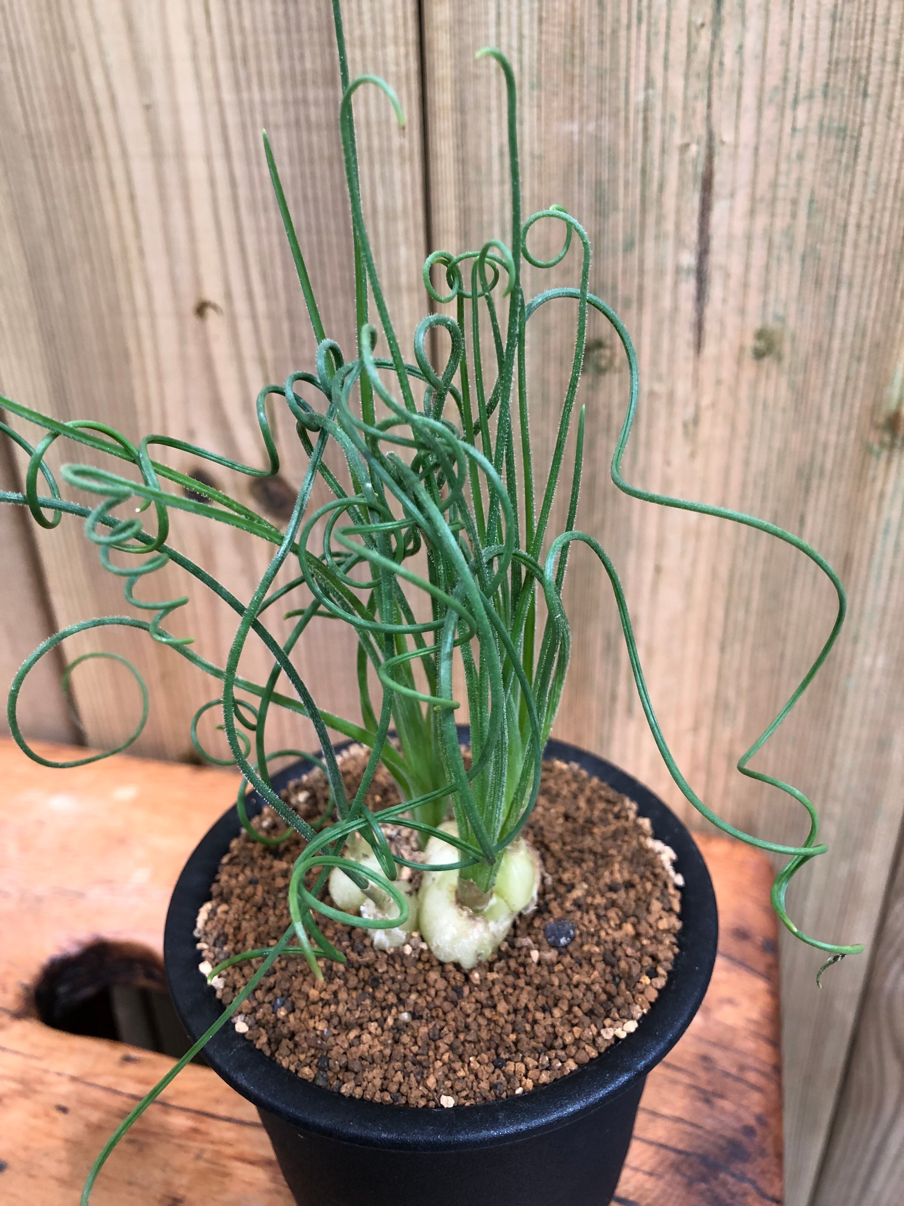 南アフリカ原産の球根植物で、葉は硬めで細長く薄い繊毛が生えていて先端からクルクルと巻く習性があります。日照不足になると巻きが弱くなるので陽当たりの良い場所に置きます。