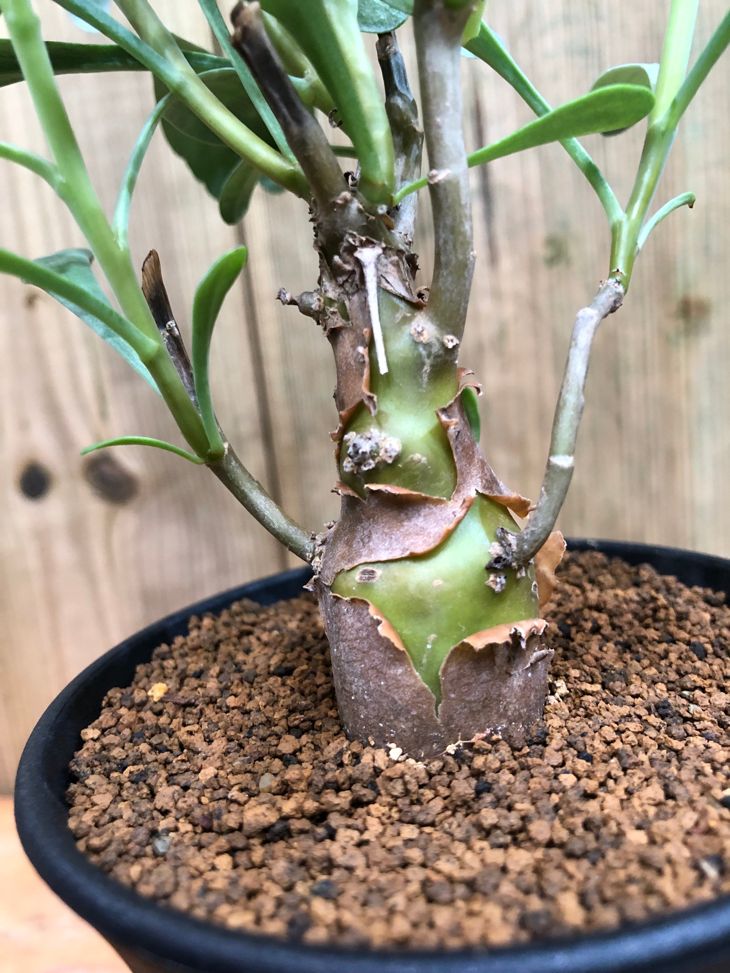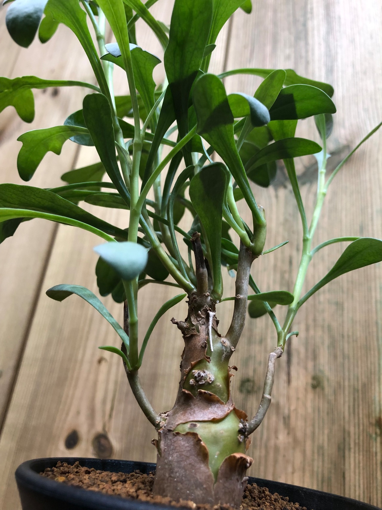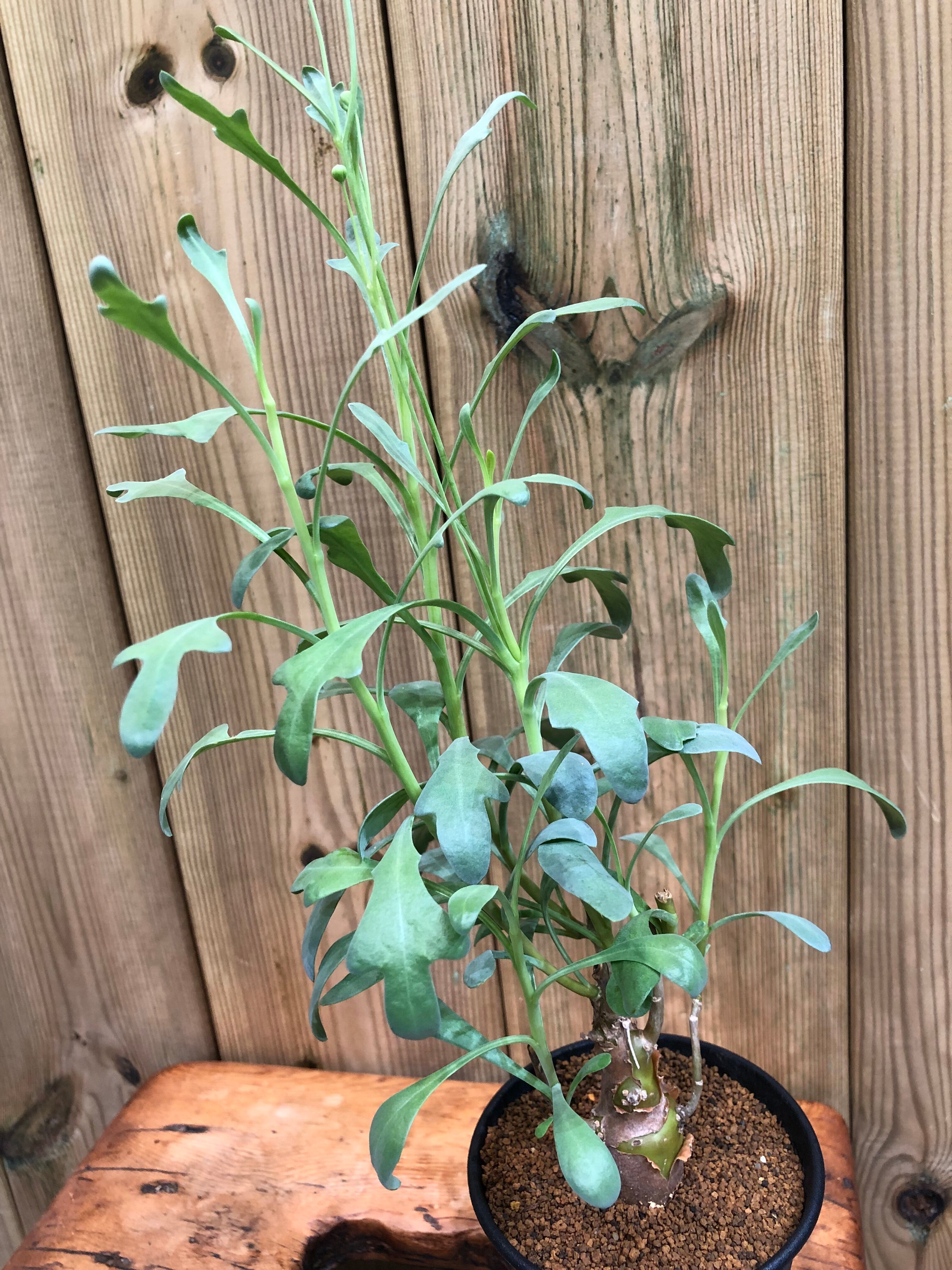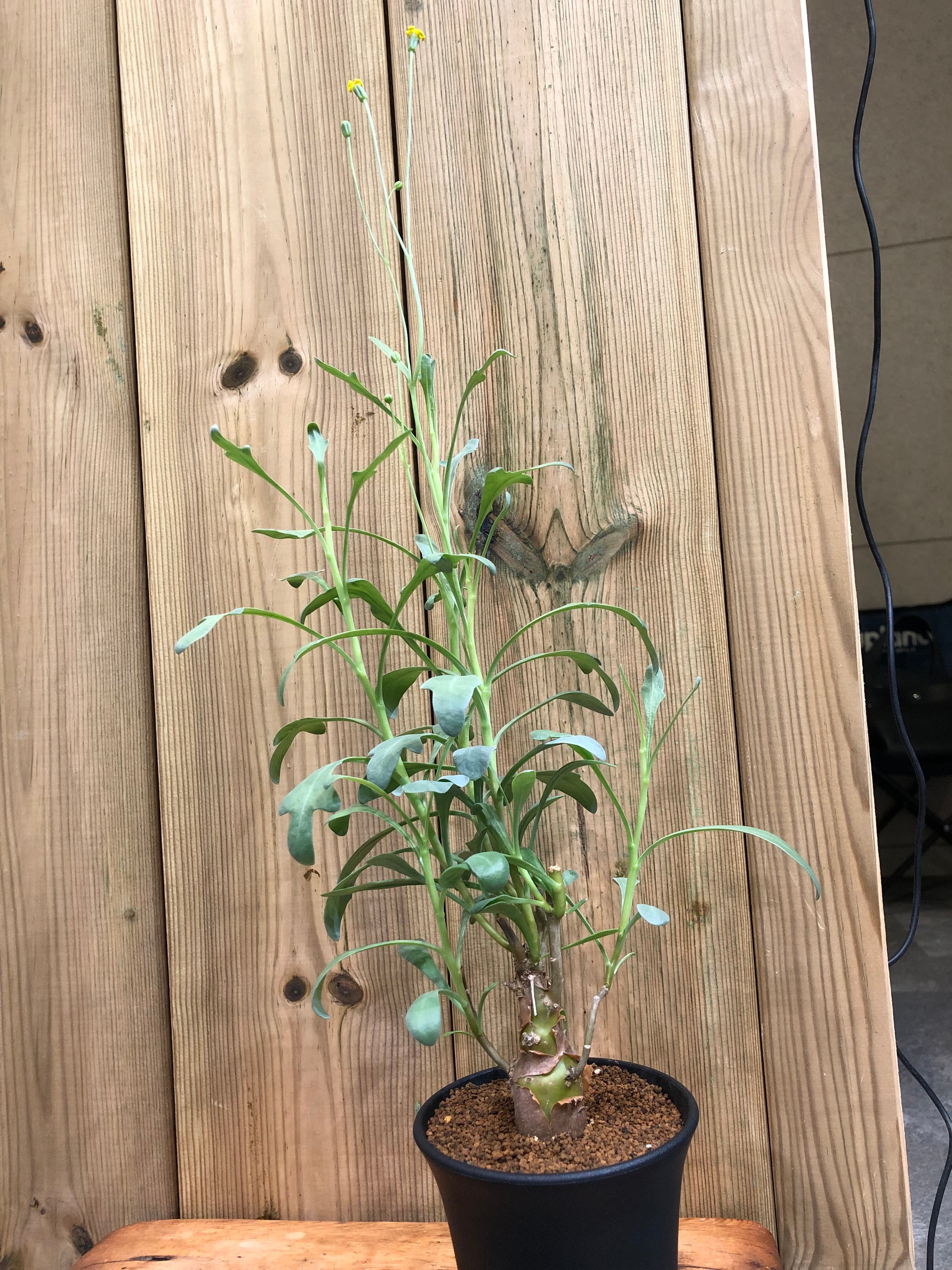 南アフリカ原産の冬型塊根植物です。塊根部は成長と共に表皮が剥がれていき黒っぽい色味になり、葉は薄くて柔らかく、小さな黄色い花が咲きます。