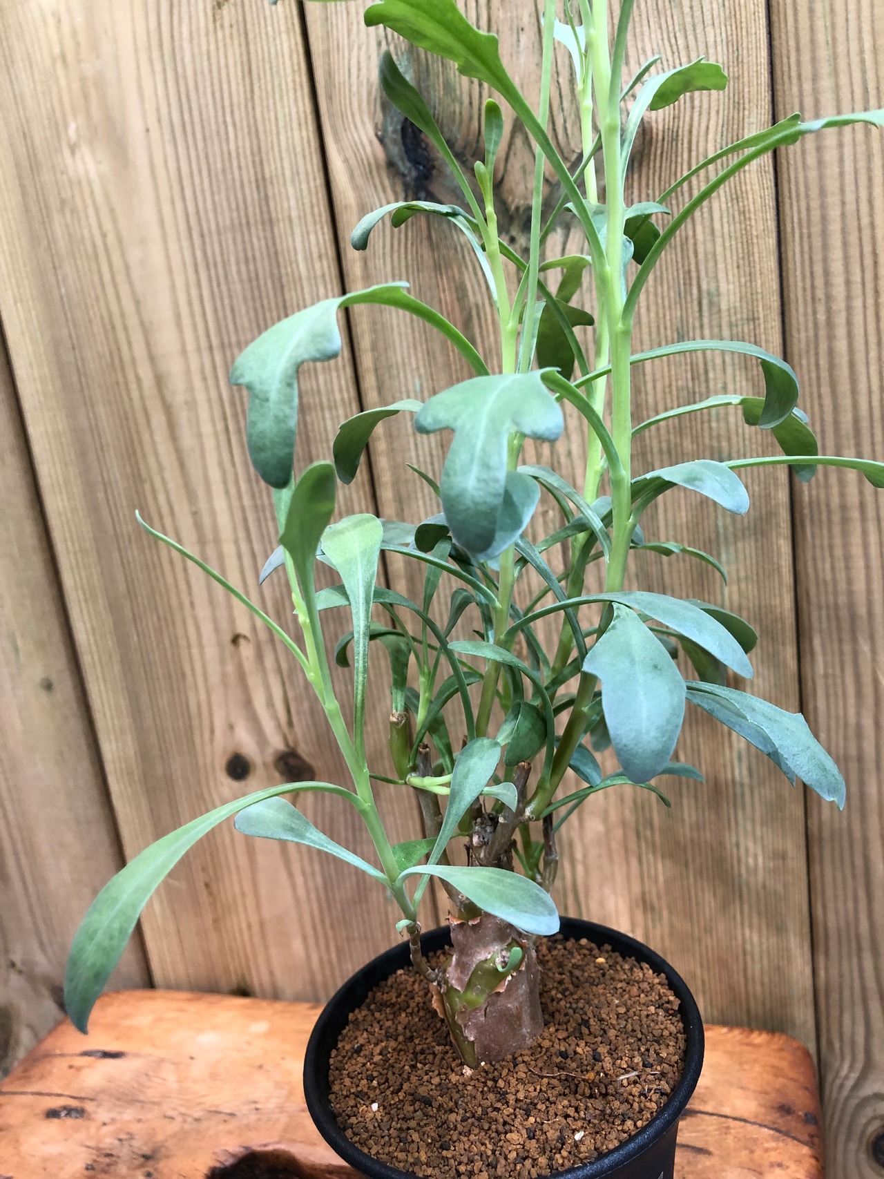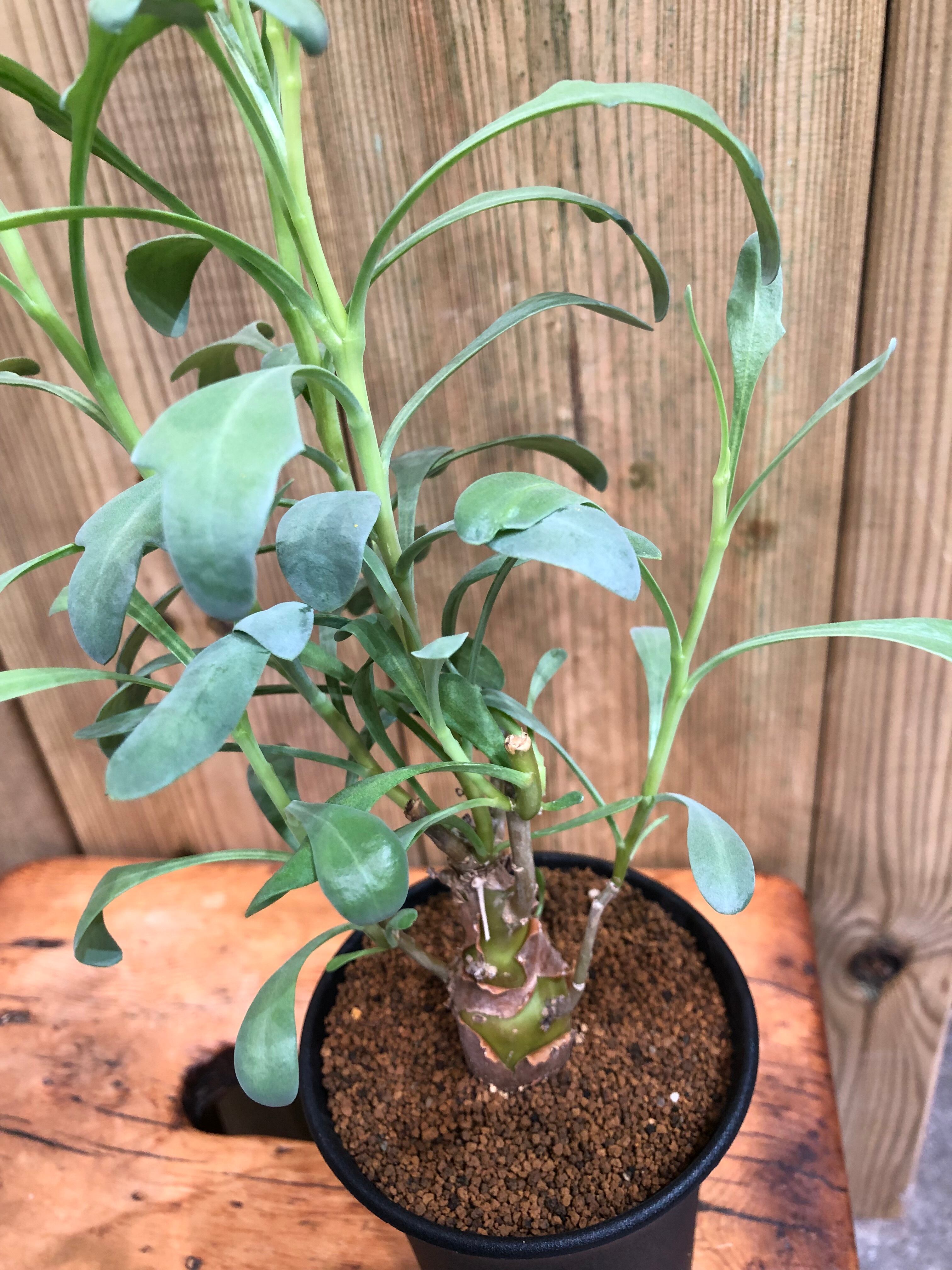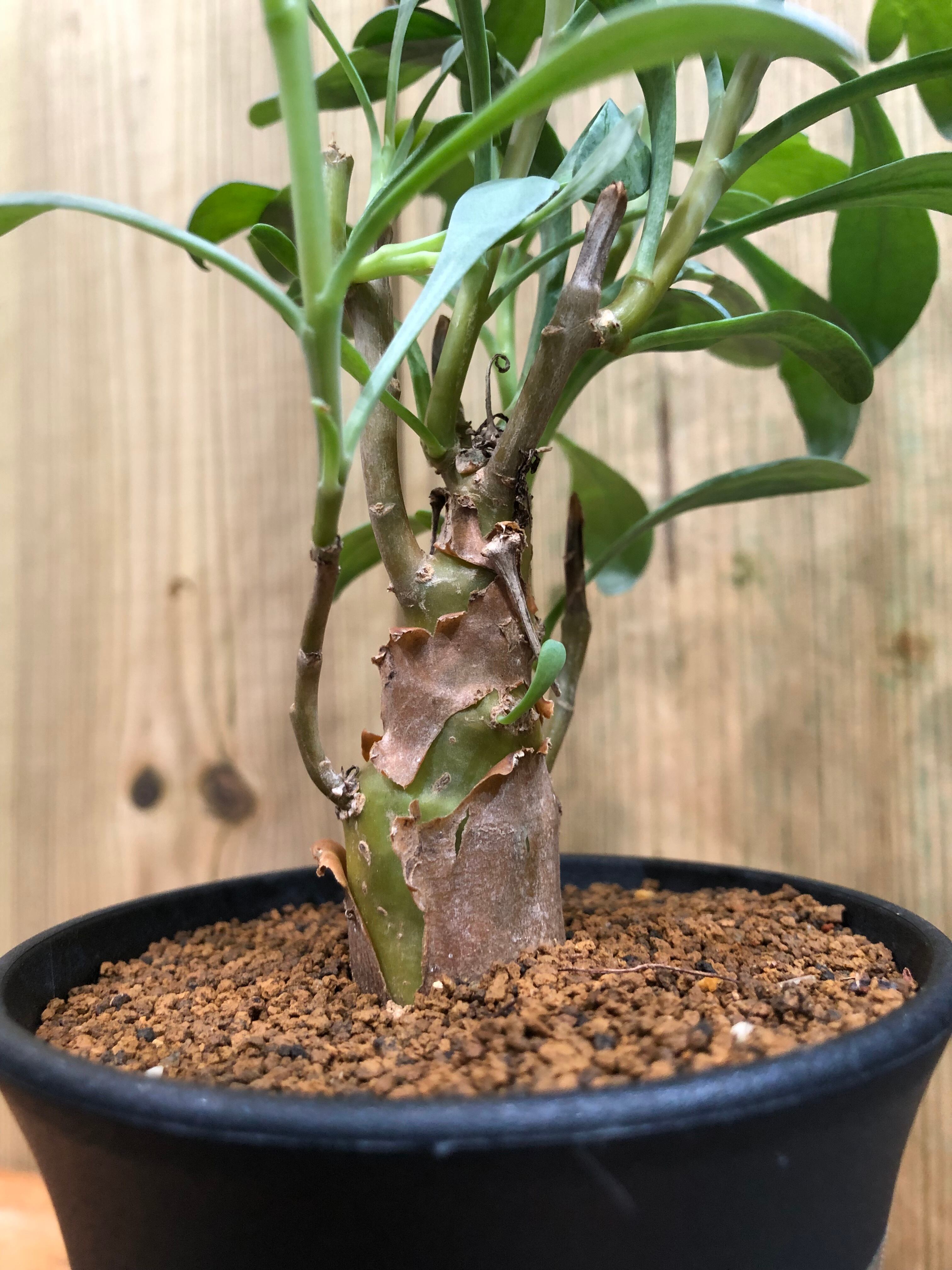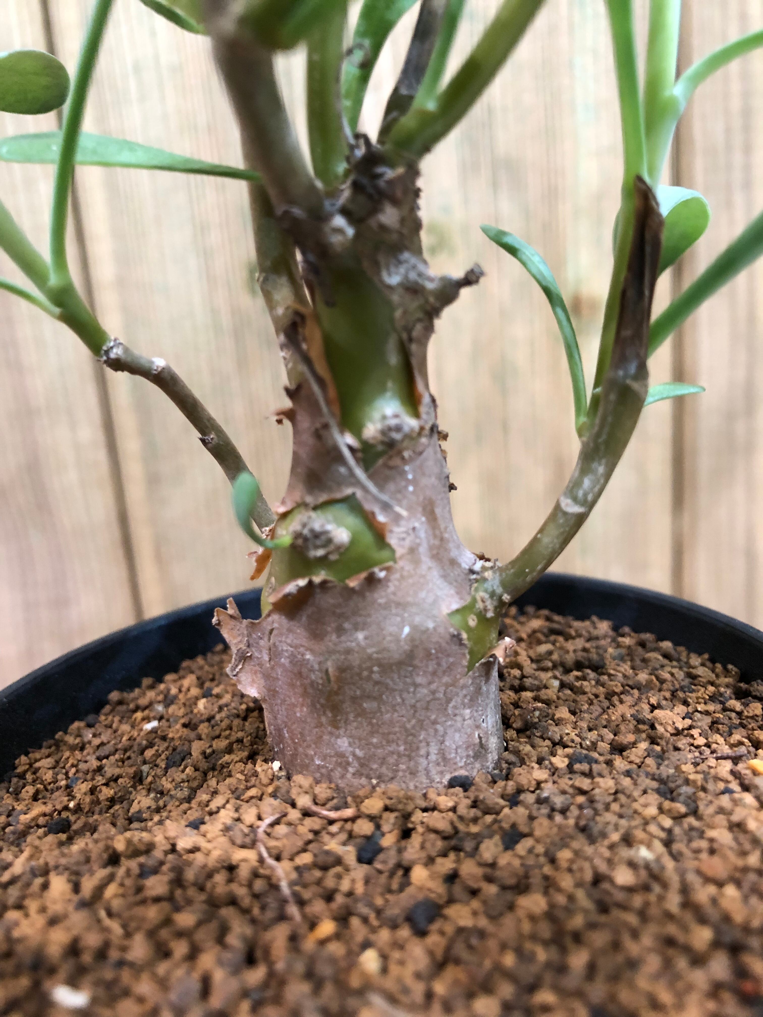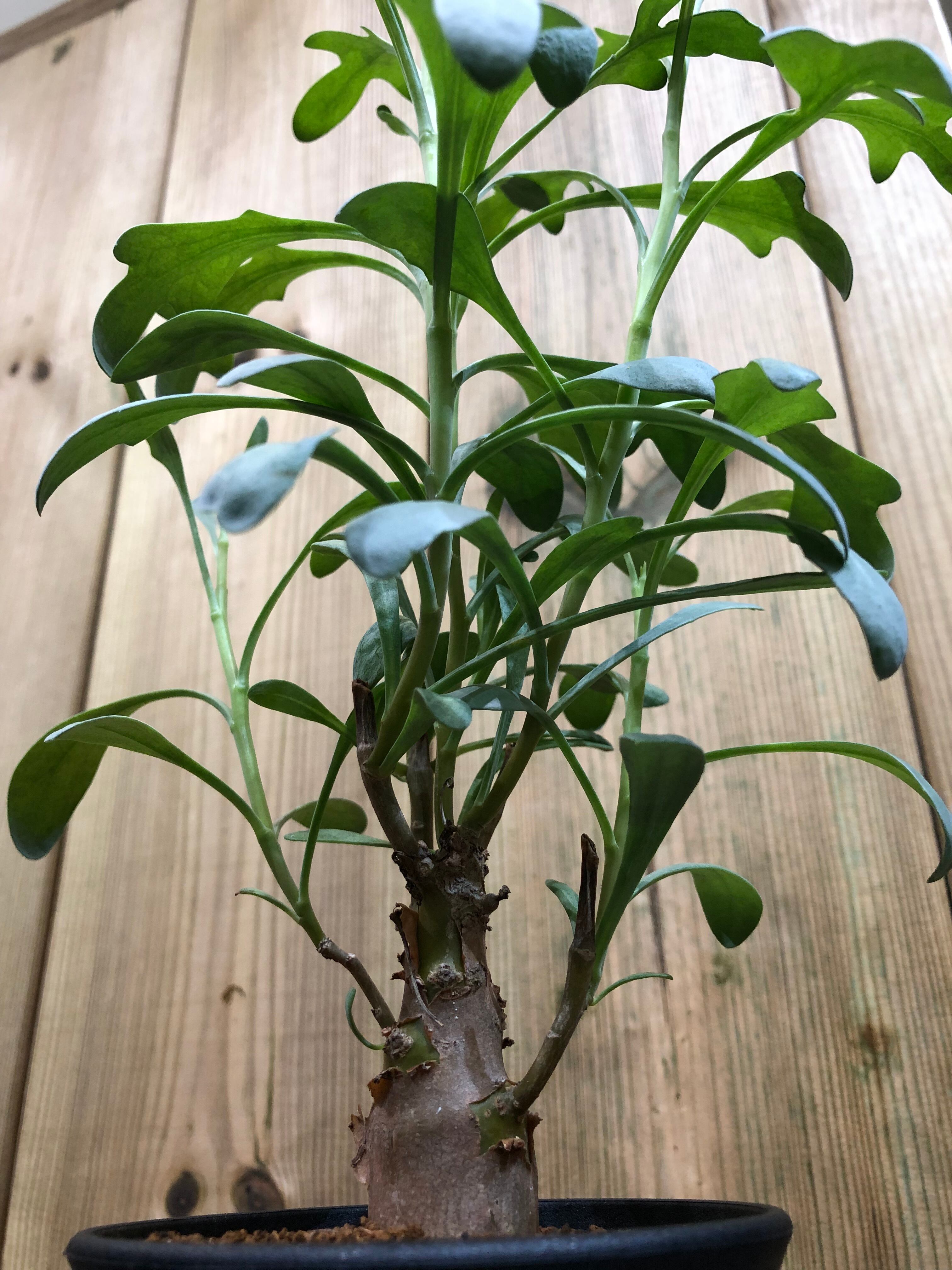 南アフリカ原産の冬型塊根植物です。塊根部は成長と共に表皮が剥がれていき黒っぽい色味になり、葉は薄くて柔らかく、小さな黄色い花が咲きます。