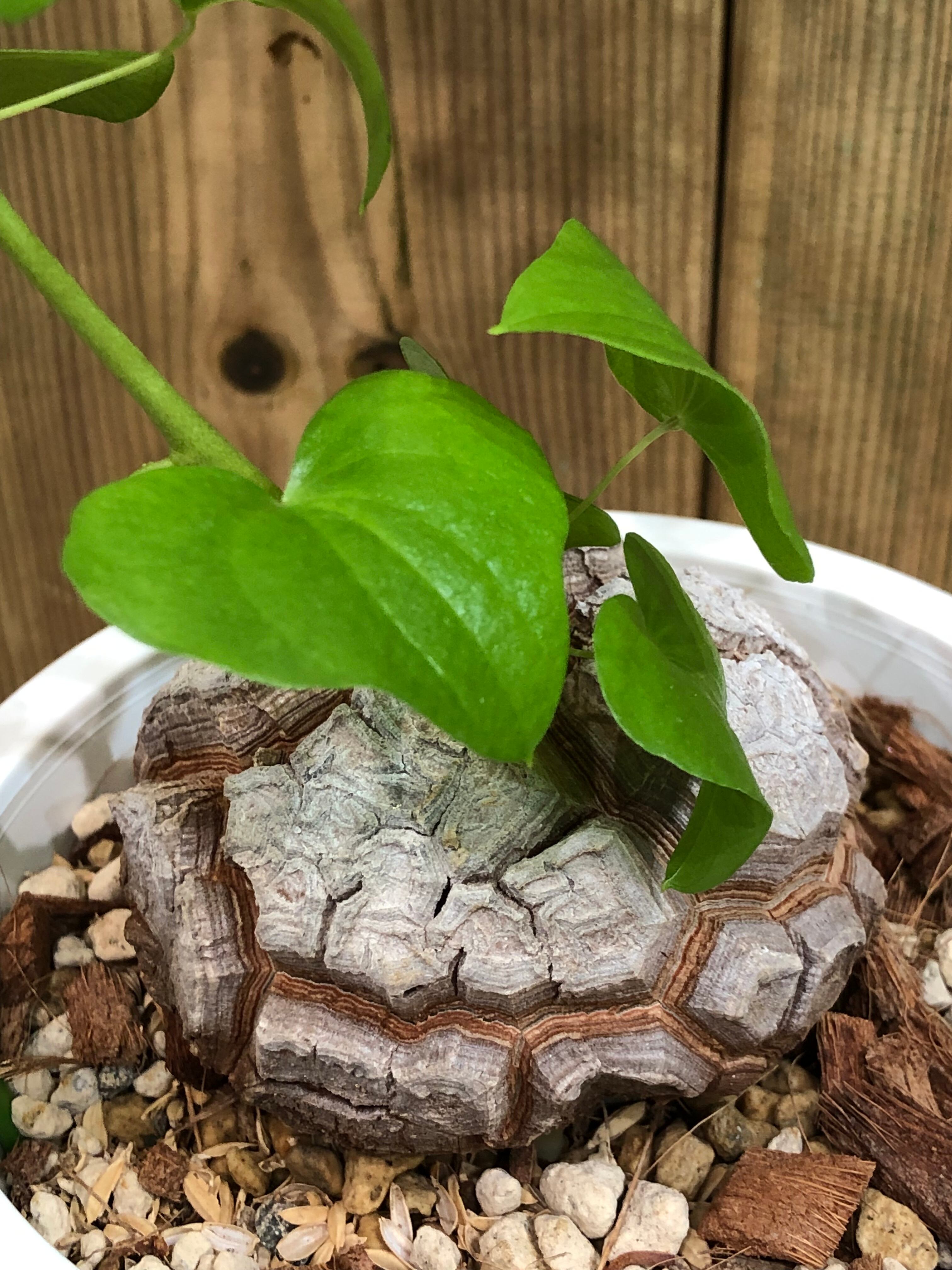 南アフリカ原産の冬型塊根植物です。亀甲竜の名前で広く知られており、冬型塊根植物の中ではかなりメジャーな品種になります。コルクの様な質感の塊根部はその名の通り陸亀の甲羅の様にひび割れて、ゴツゴツしていきます。葉はハート型で蔓を伸ばし巻き付いていきます。