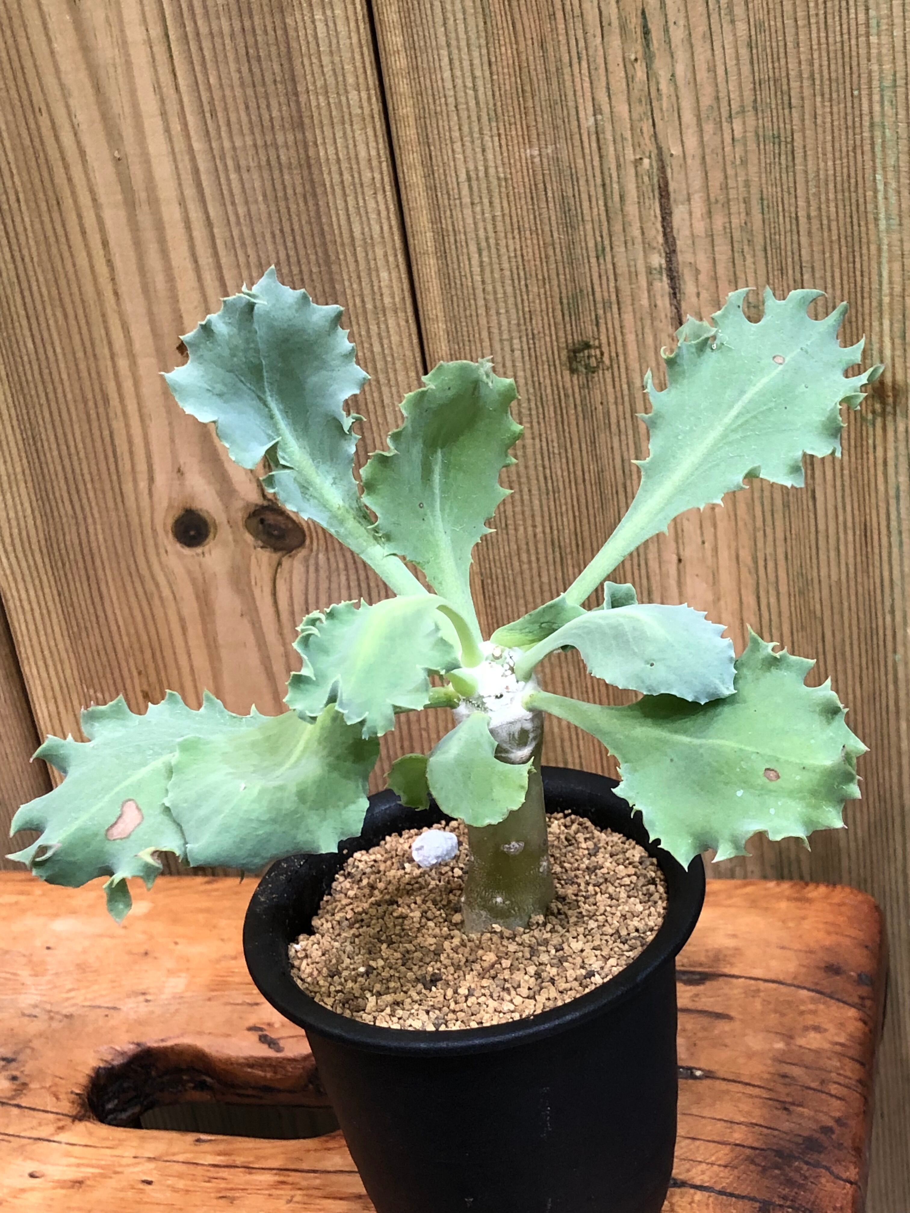 南アフリカ原産の冬型塊根植物で、幹はツルツルとした肌質で頭頂部にはモフモフの綿毛が生え、そこから葉を生やします。葉は青白く縁がギザギザと波打っており、小さな黄色い花を咲かせます。