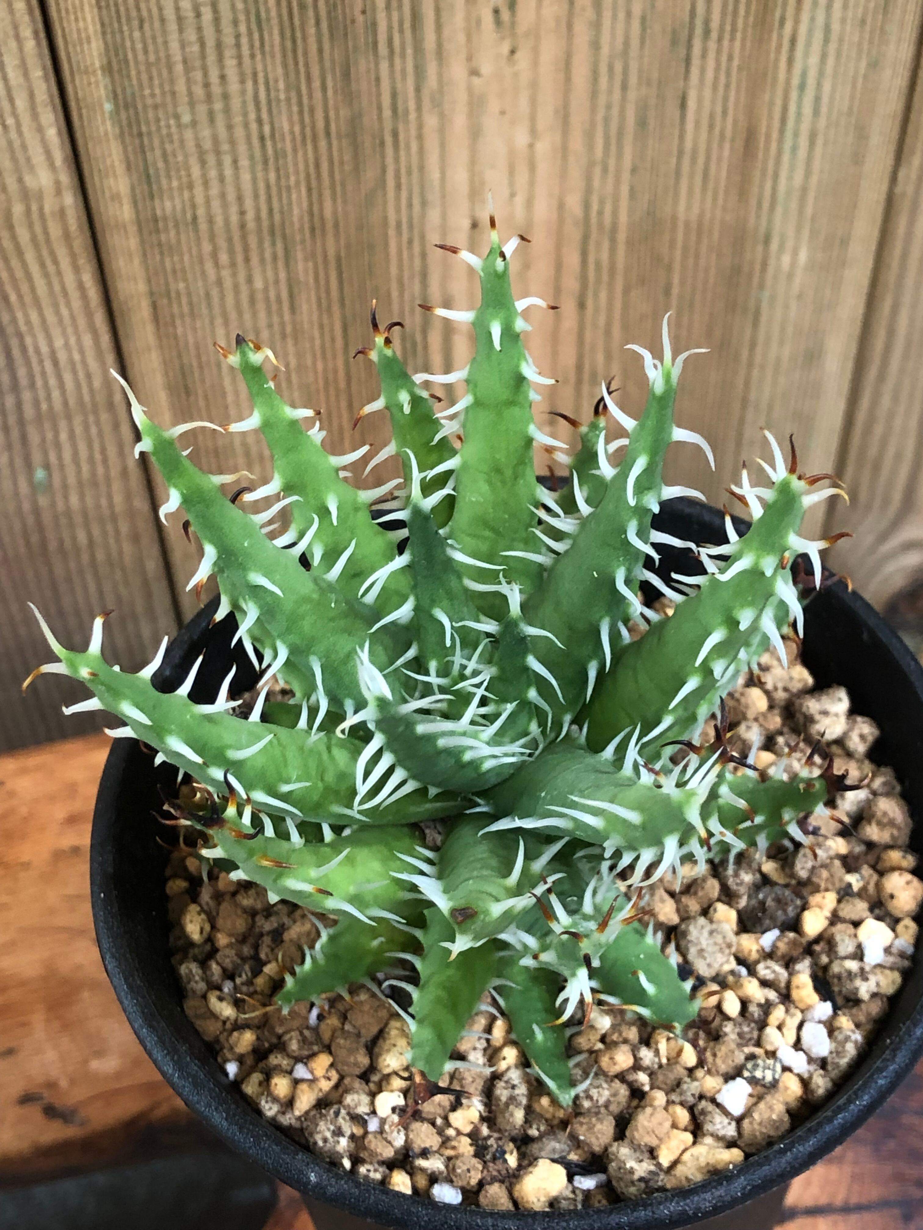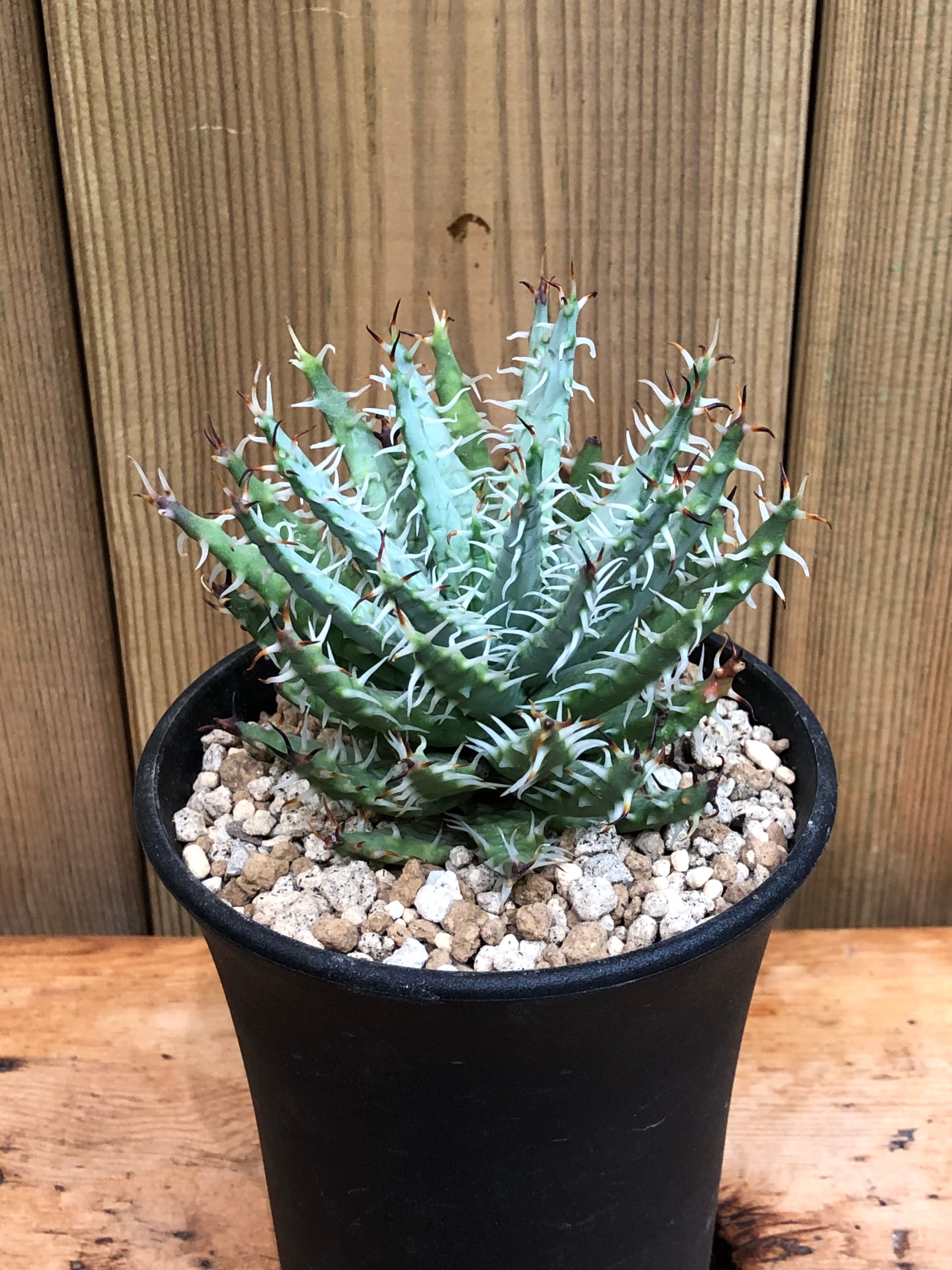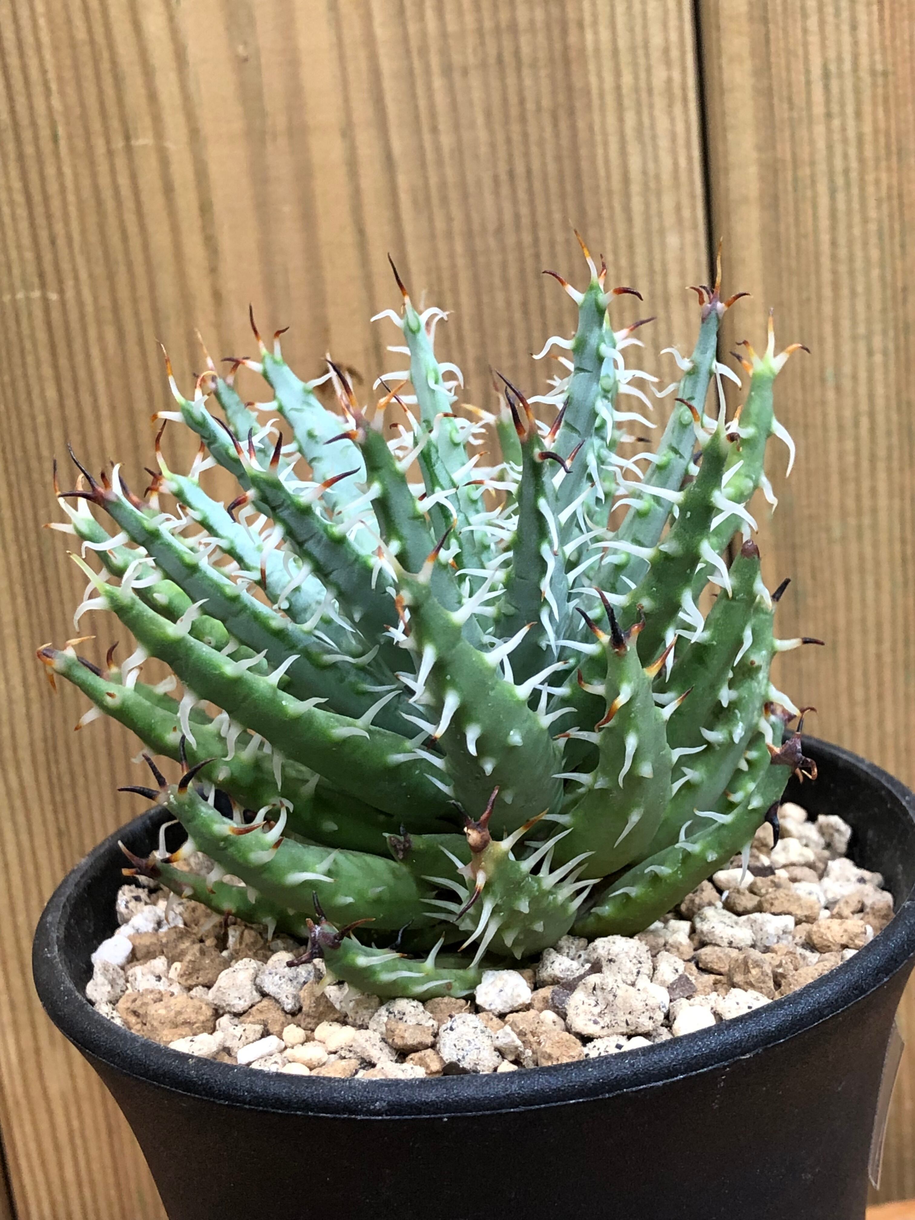 ナミビア原産の小型の希少なアロエです。葉は青白い緑色で白い棘が覆っていて葉先の方は茶色っぽい色味になっています。標高の高い地域に自生している為、真夏の蒸し暑い時期は苦手ですので、春・秋型という感覚で育てます。真夏は動きが鈍りますので、涼しい場所に置き蒸れに注意します。