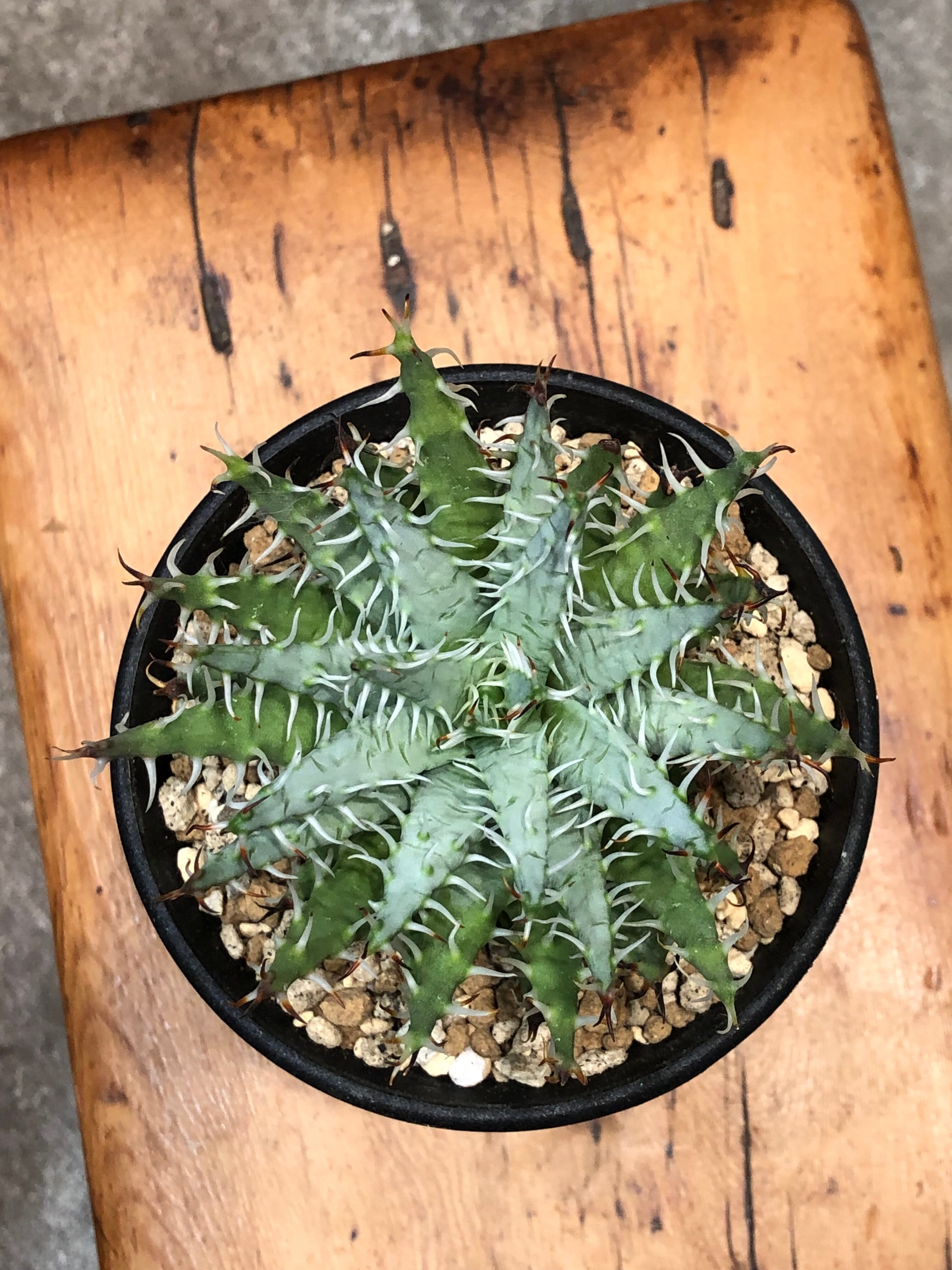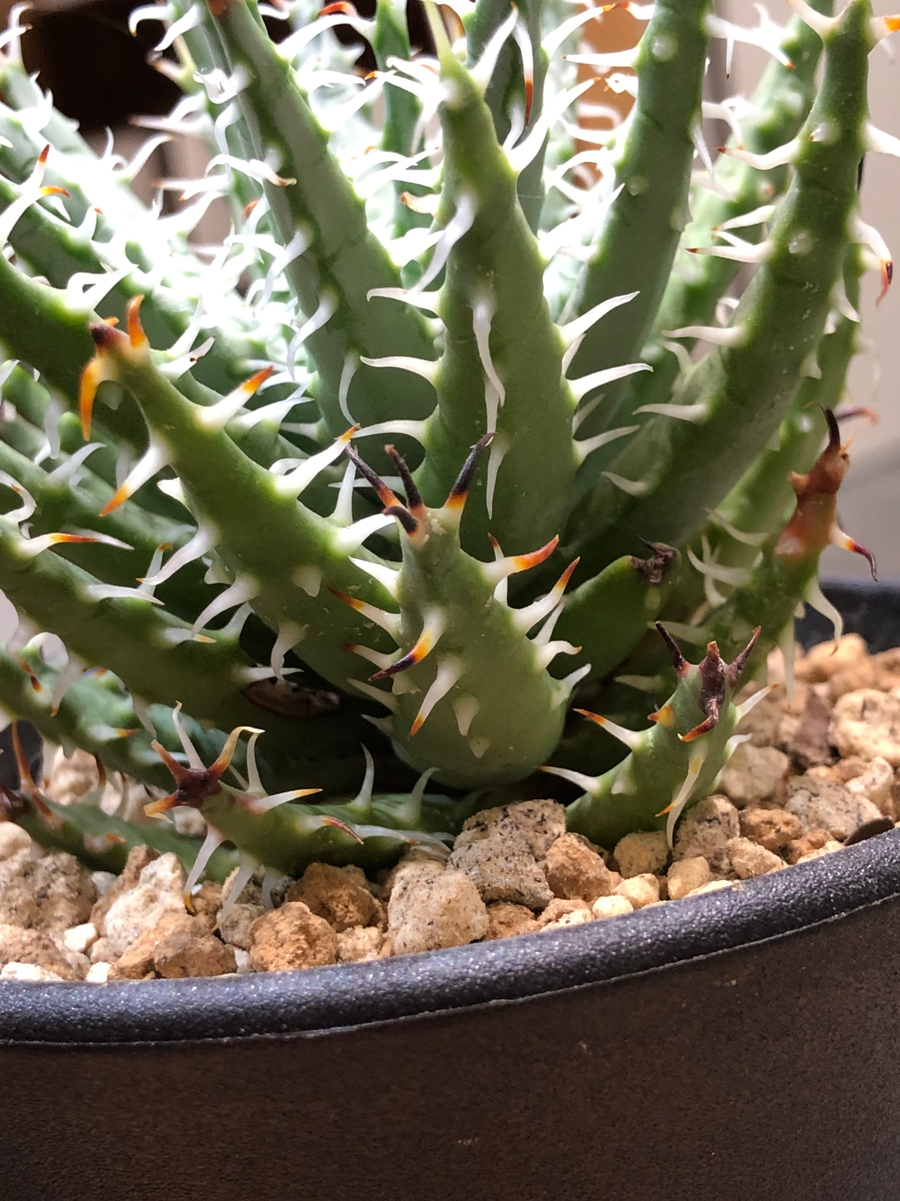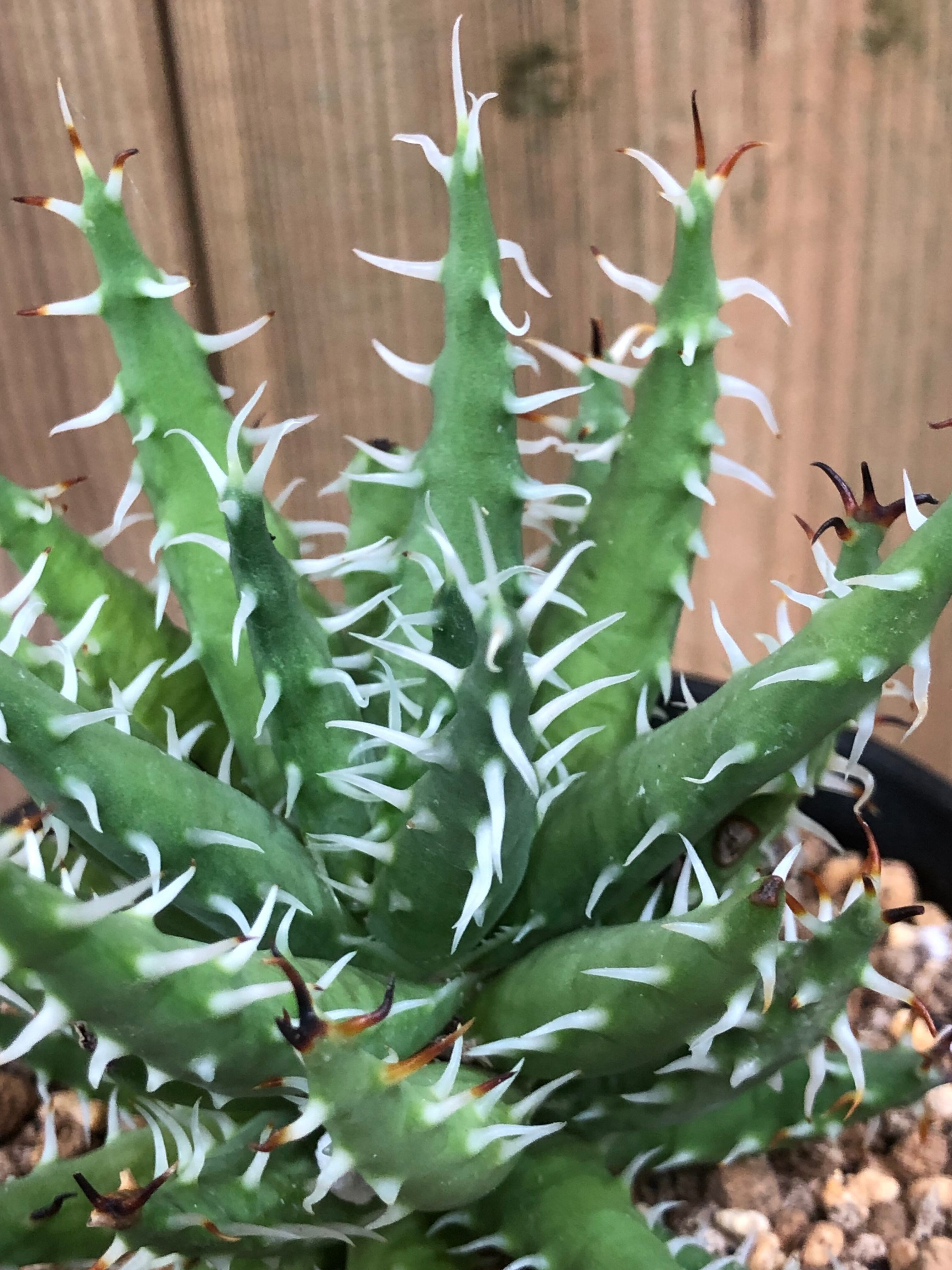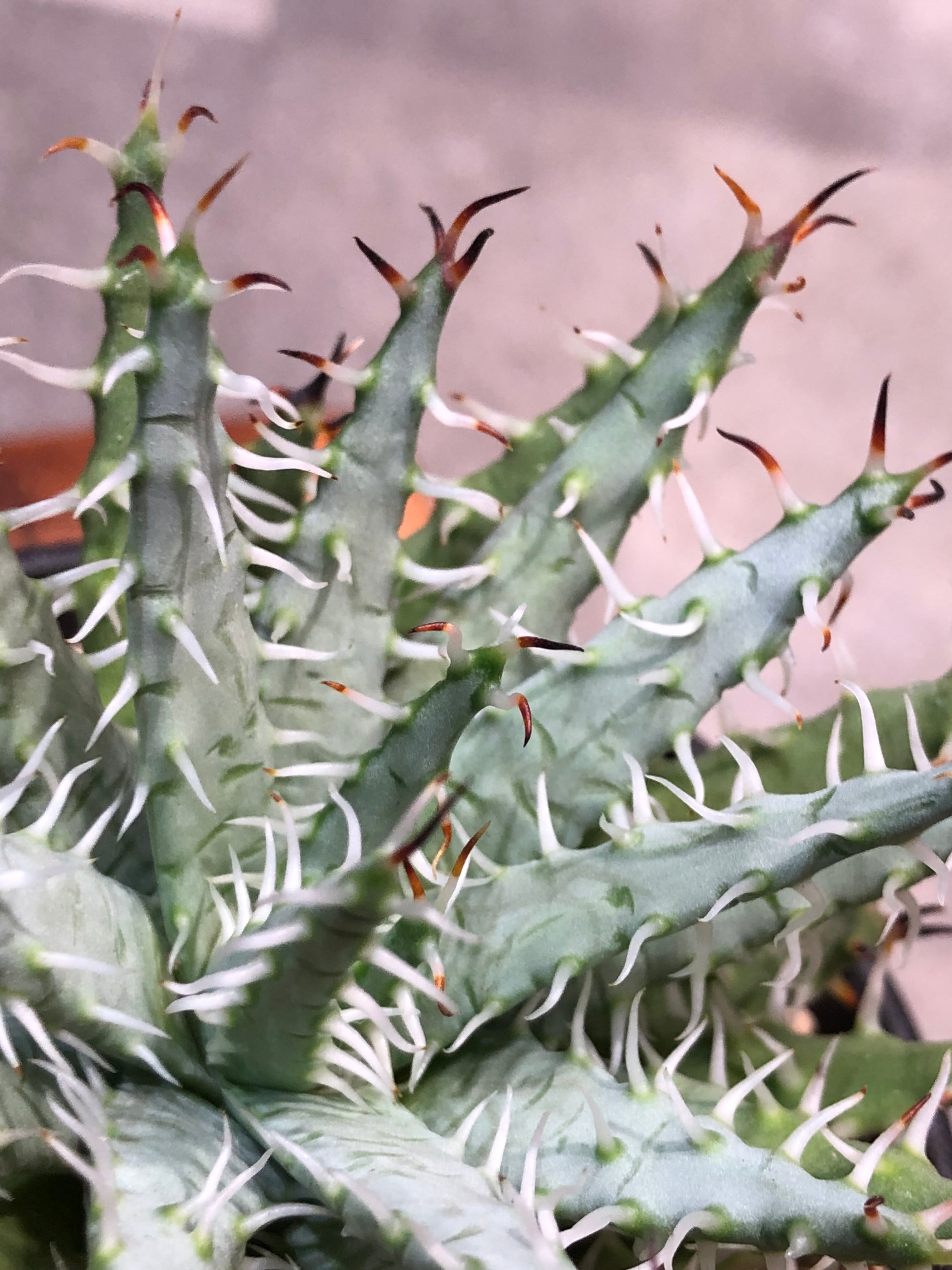 ナミビア原産の小型の希少なアロエです。葉は青白い緑色で白い棘が覆っていて葉先の方は茶色っぽい色味になっています。標高の高い地域に自生している為、真夏の蒸し暑い時期は苦手ですので、春・秋型という感覚で育てます。真夏は動きが鈍りますので、涼しい場所に置き蒸れに注意します。