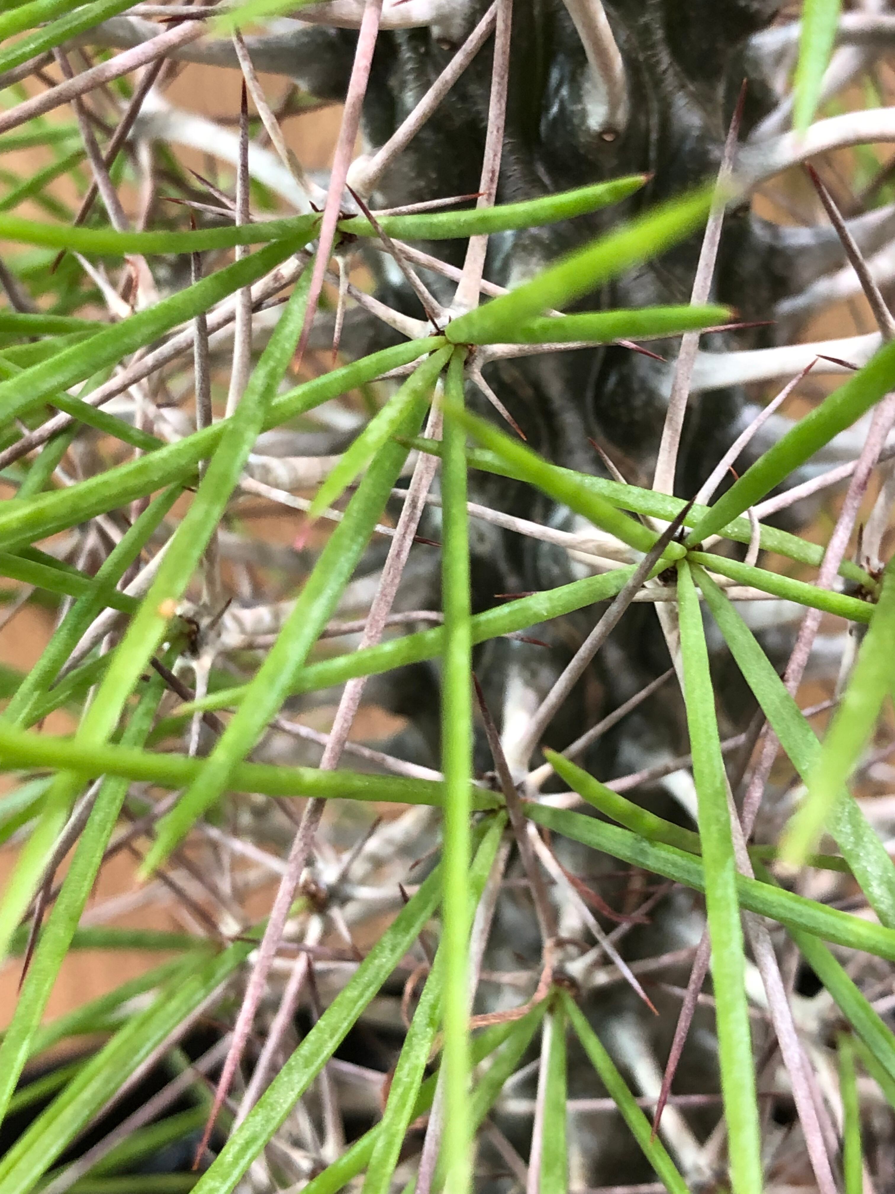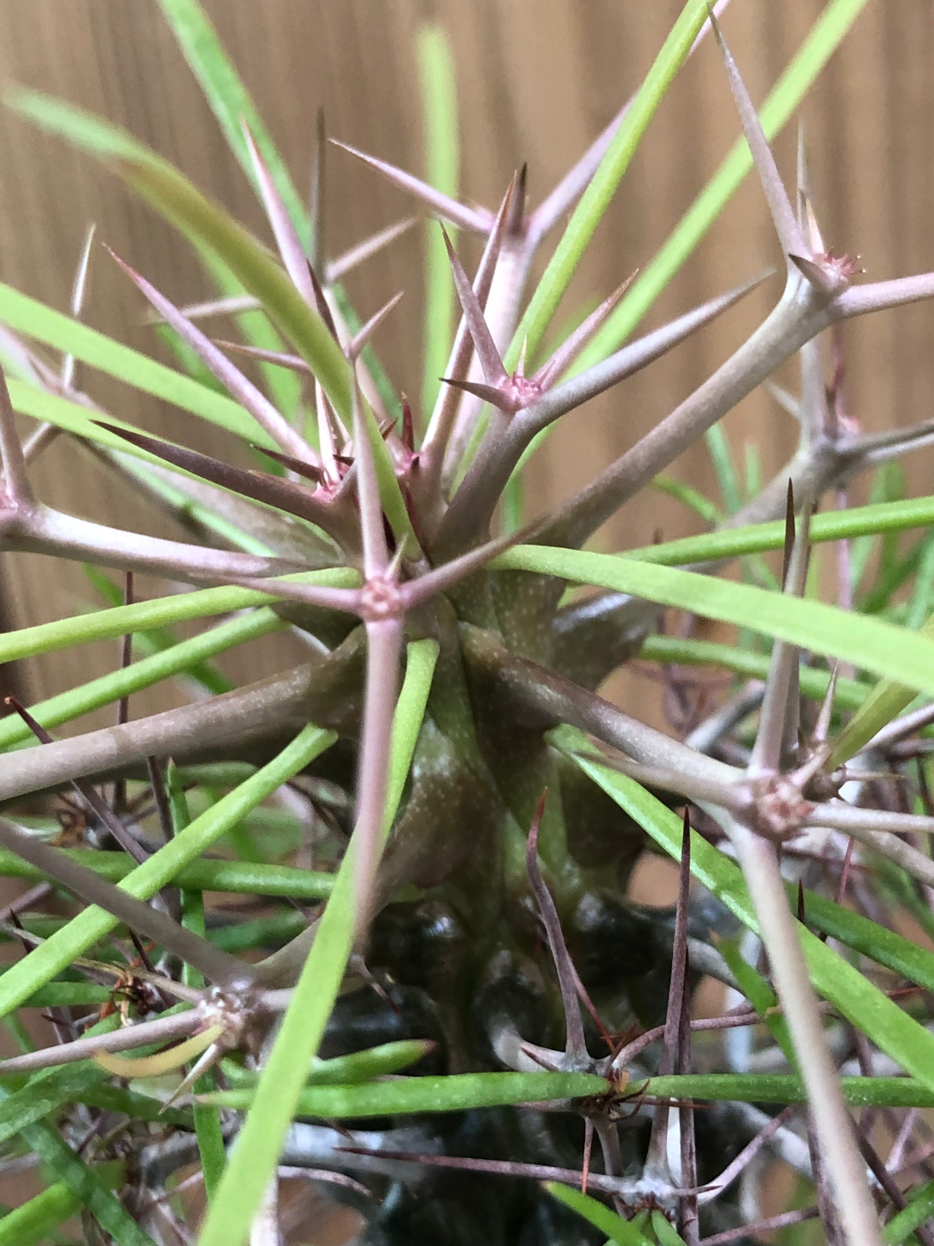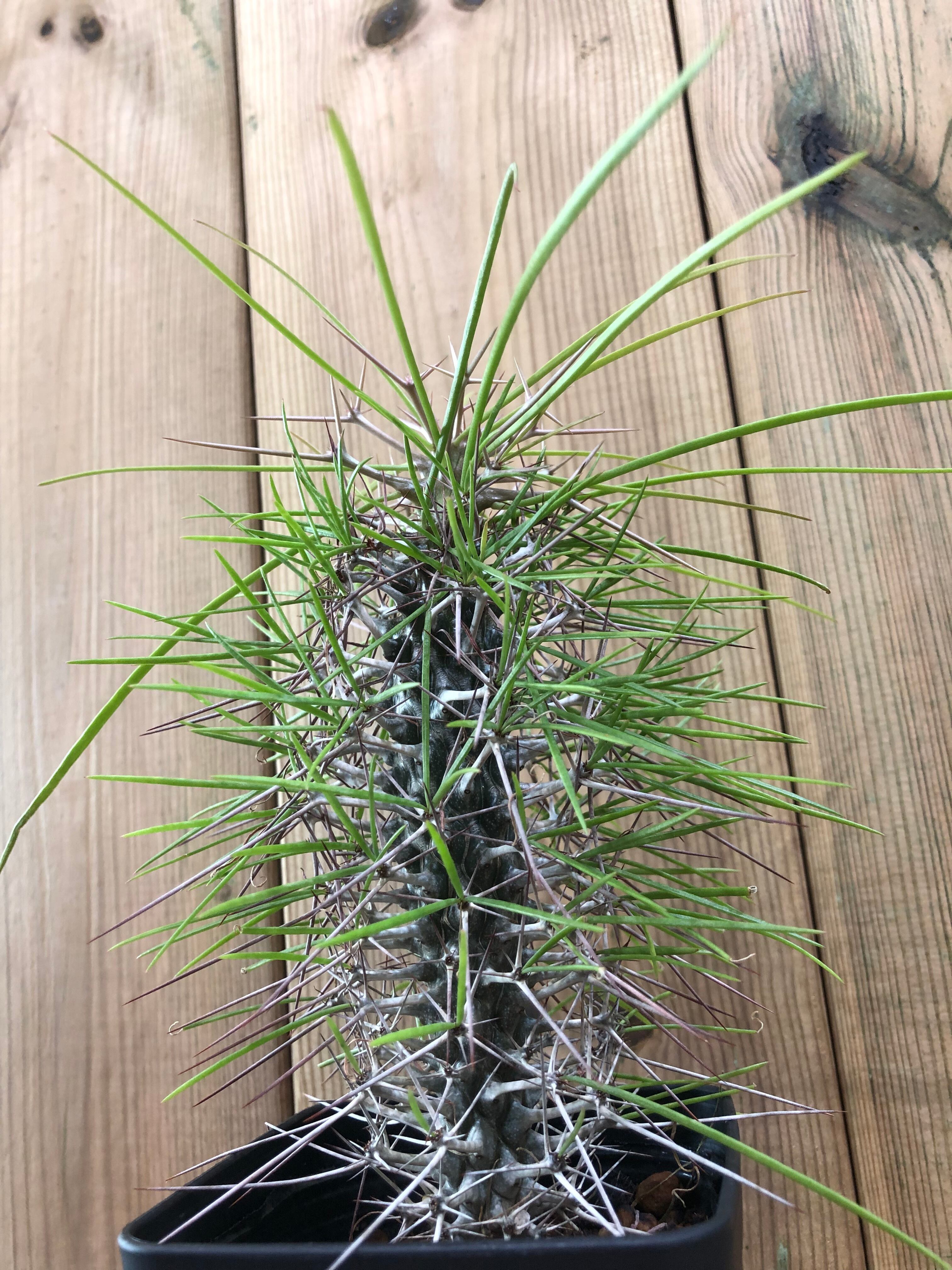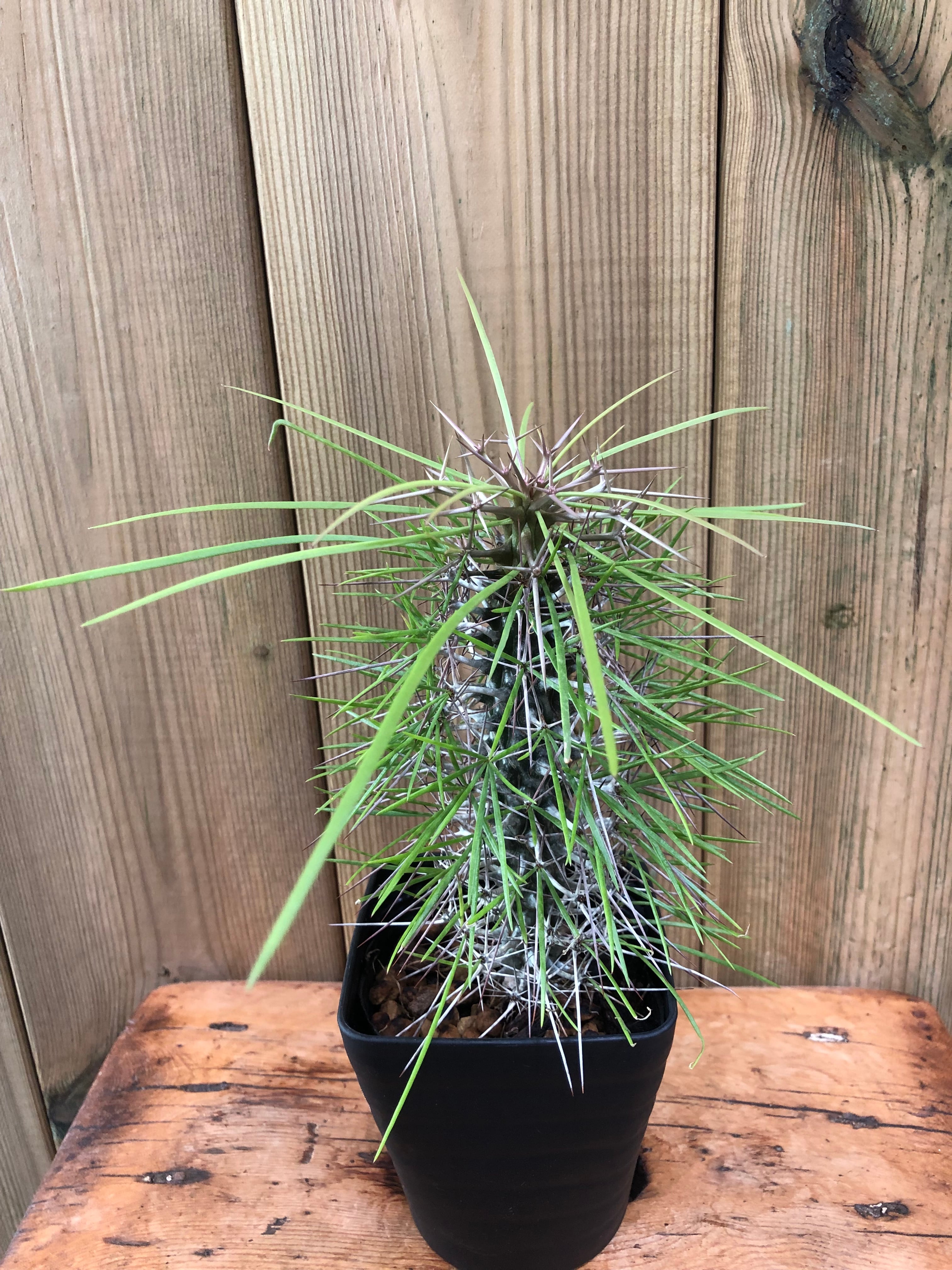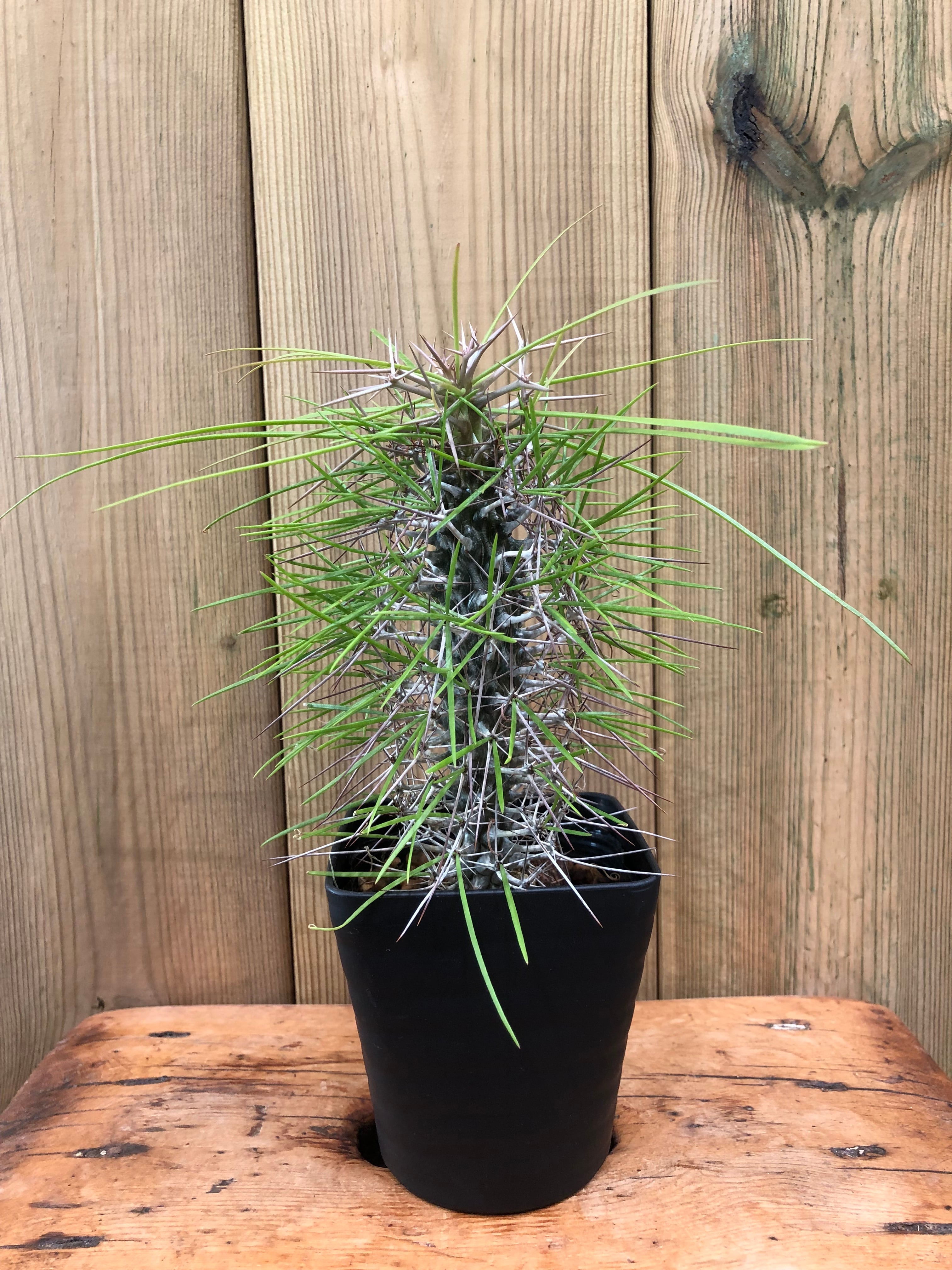 マダガスカル原産の希少な植物です。幹は黒っぽい灰色で長い棘が生えています。葉は多肉質で細長く棘の間から生え、棘との見分けがつきにくくなるほど茂ります。幹は太りながら上に伸びていき、かなり大きくなると分岐し始めます。性質は丈夫で育て易い印象です。