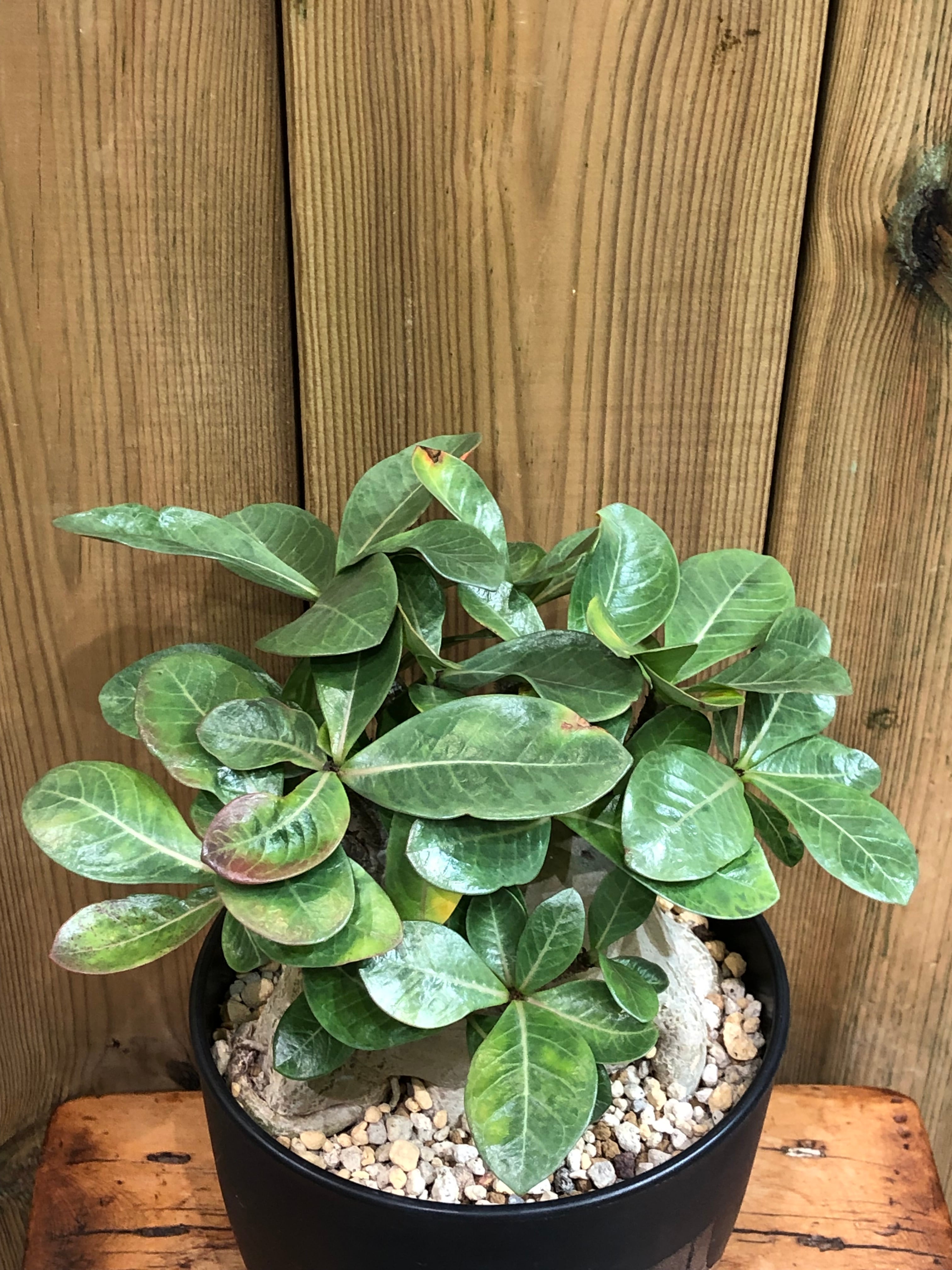 アラビア半島原産で塊根植物の代表的な品種です。幹はツルッとした質感で太りながら枝を増やしたり伸ばしたりしながら成長します。葉は硬めで厚みがあり濃い緑色で卵型をしていますが、個体により少しづつ形状や色味に違いがあります。花はピンク色の綺麗な花が咲きます。塊根植物といえばアデニウムが最初に出てくる程、知名度が高い品種です。
