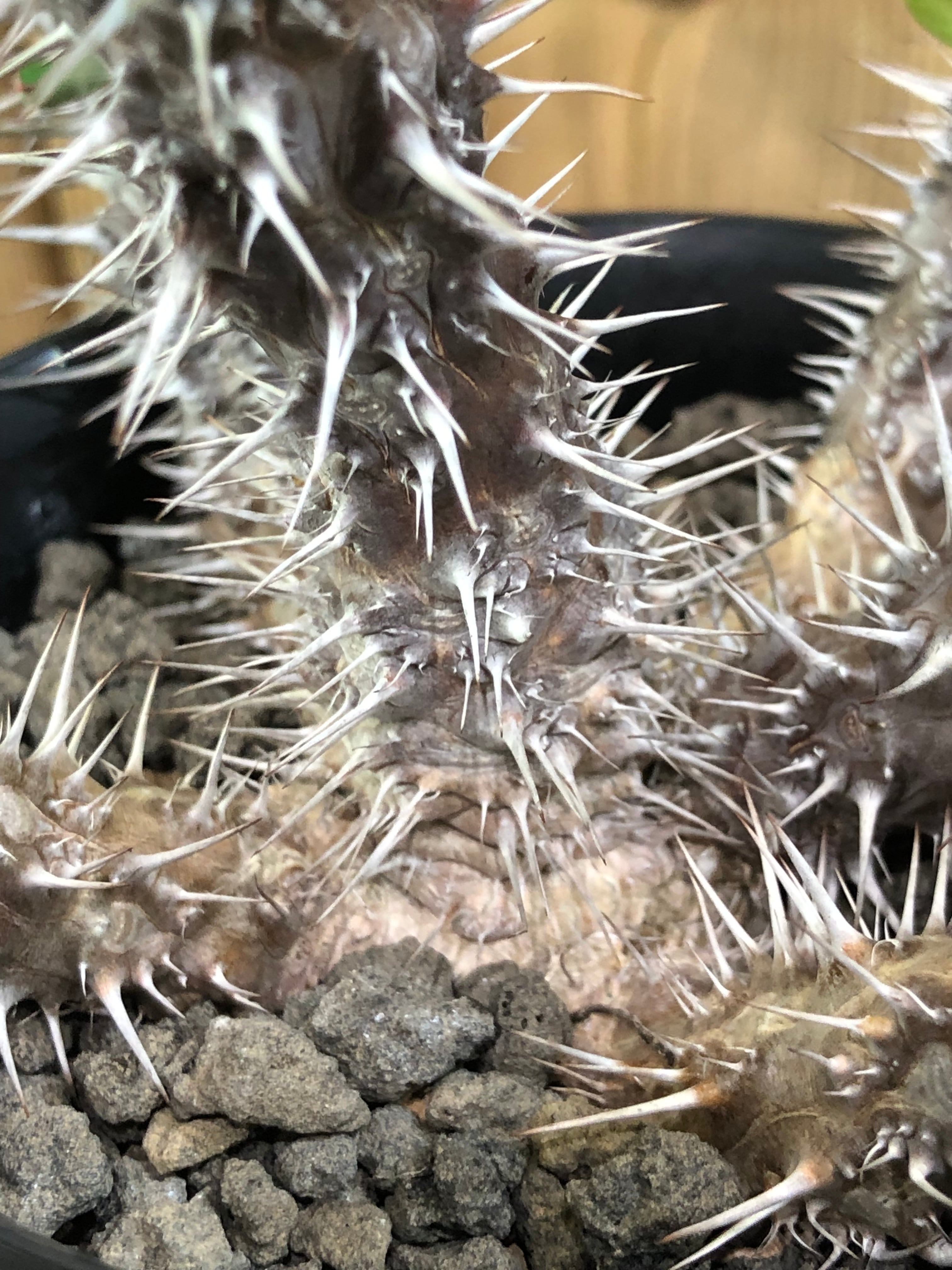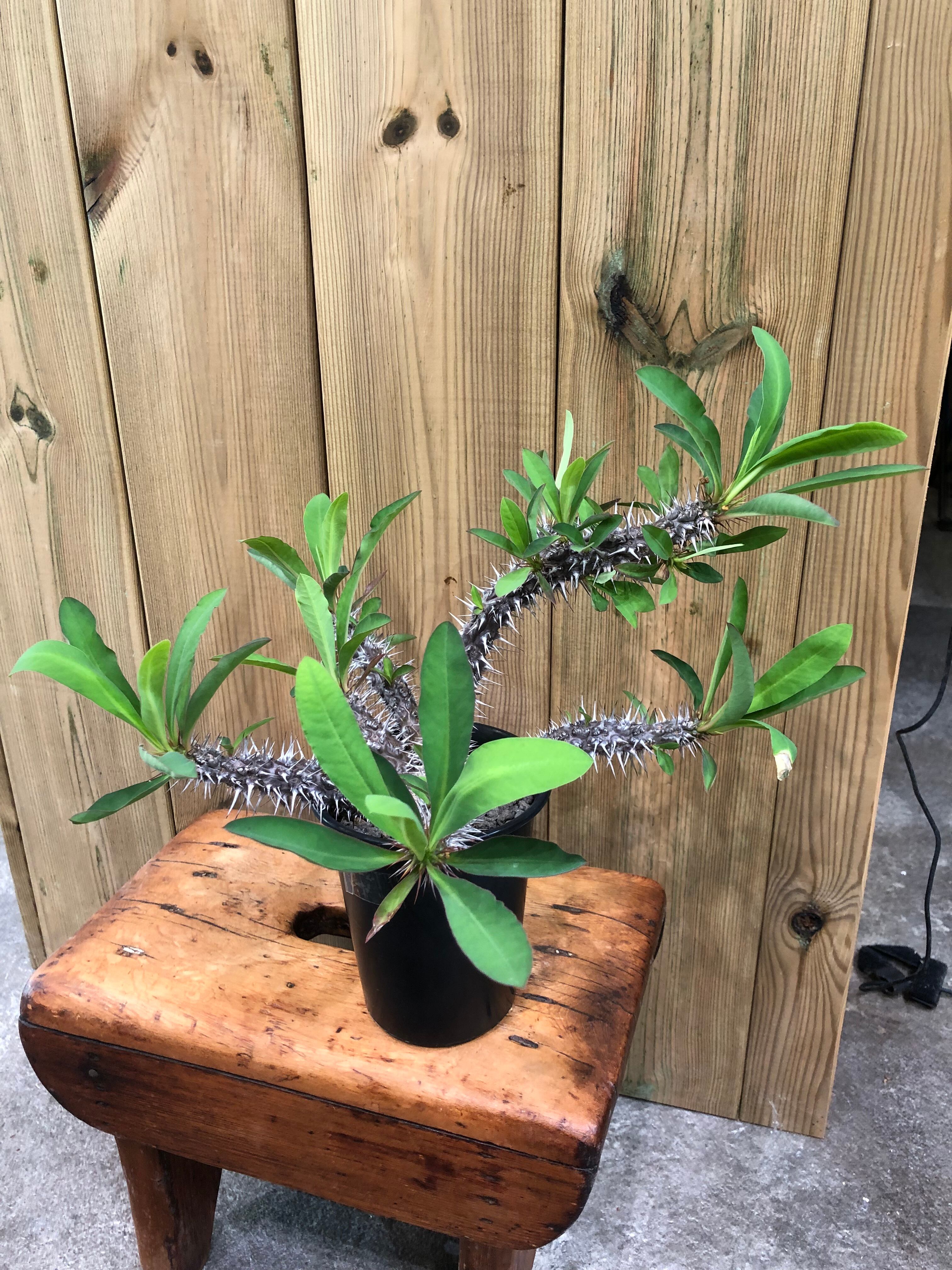 マダガスカル原産の珍しいユーフォルビアです。葉は柔らかめで花キリンの様な細長い葉で幹や枝には鋭い棘が密生しています。幹は黒っぽい灰色で塊根部や枝から新しい枝を増やしながら成長します。花は小さな赤い花が咲きます。