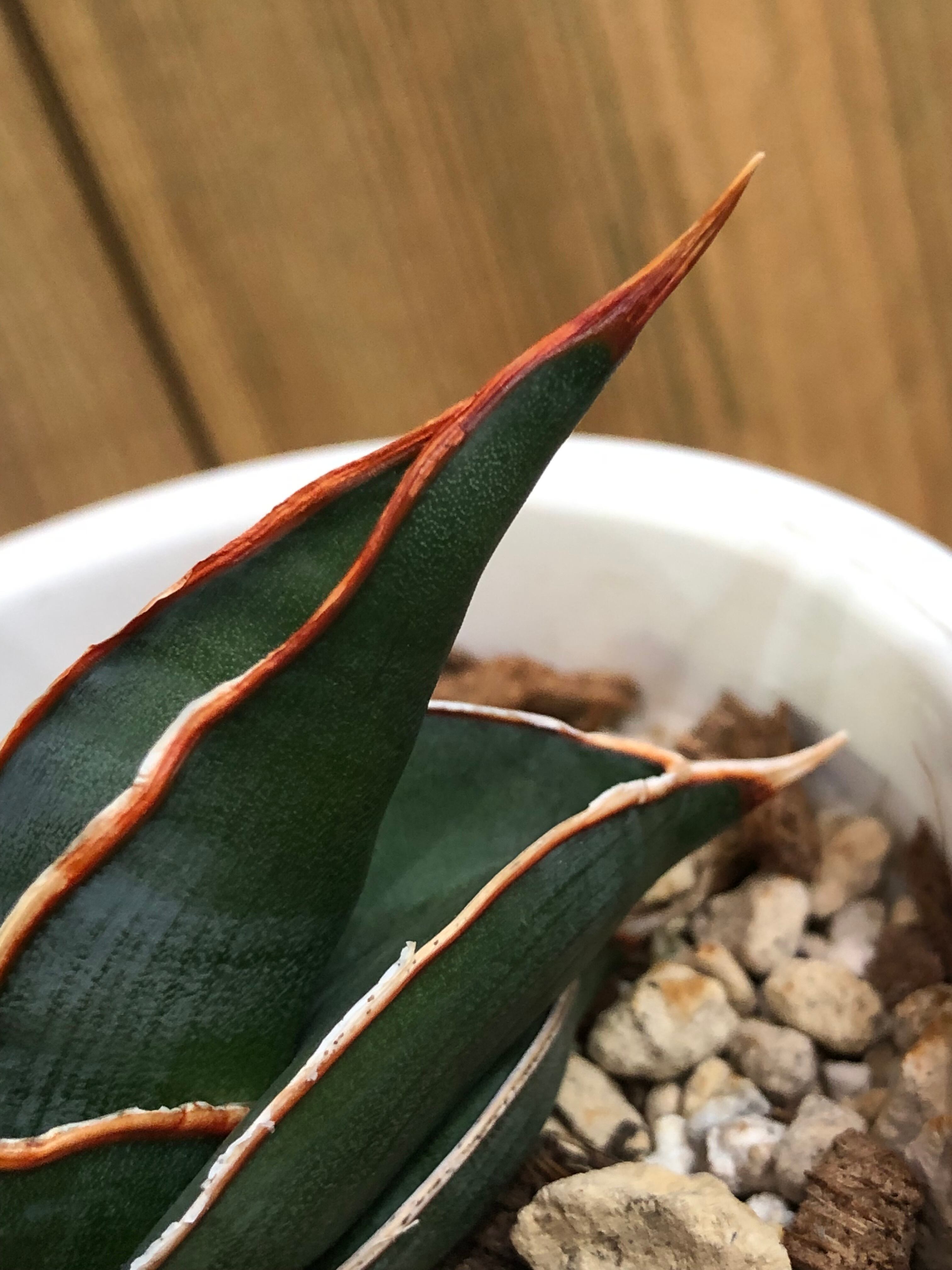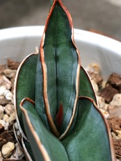 ソマリア原産のサンスベリアの王様的存在の品種です。葉は硬く濃い緑色で縁に赤茶色と白色のラインが入っています。左右交互に葉を展開しながら成長していきます。小型で20㎝前後の高さまで育ち、子株も出します。成長はかなり遅いので同じ姿を長い間楽しめます。