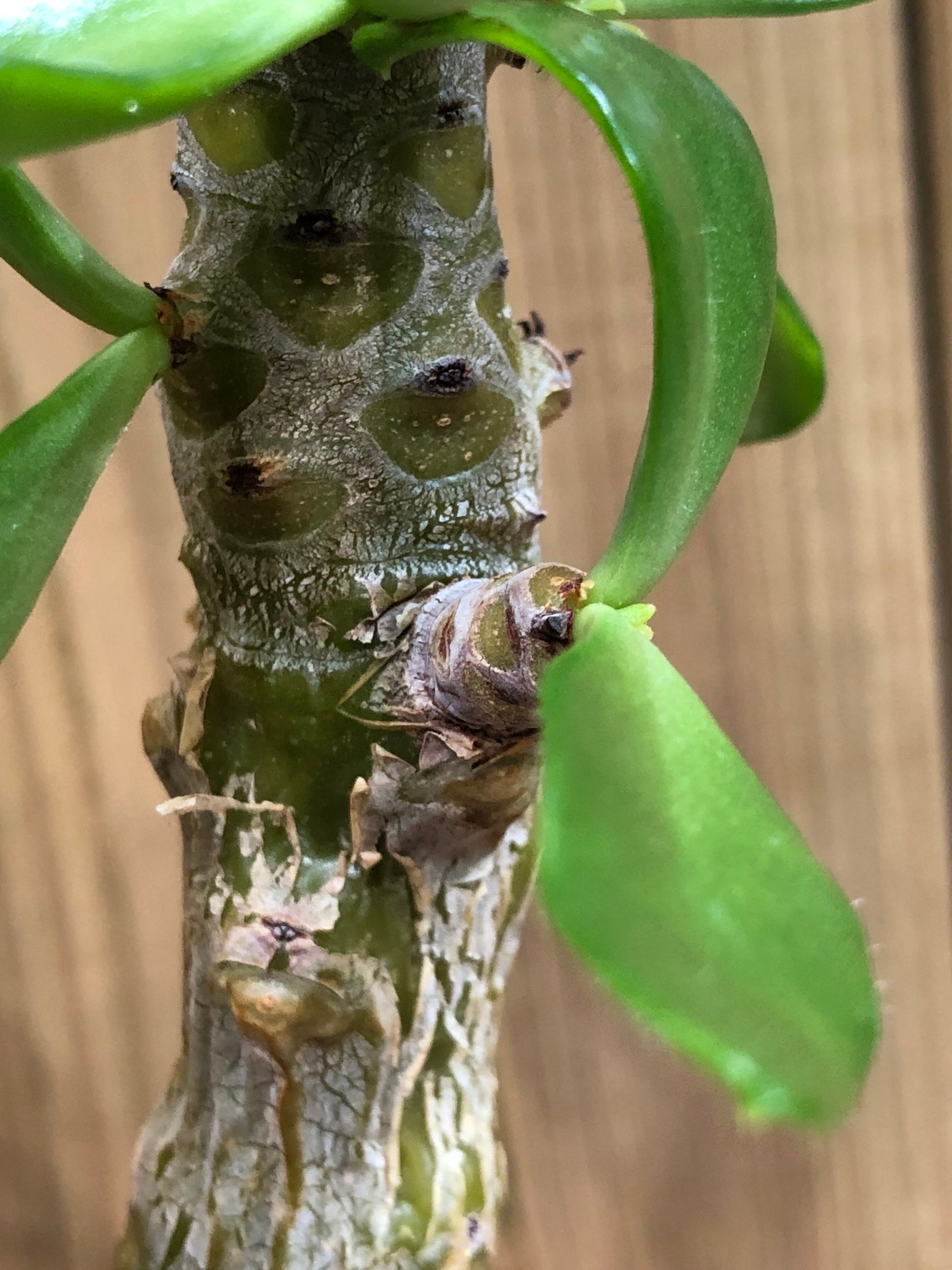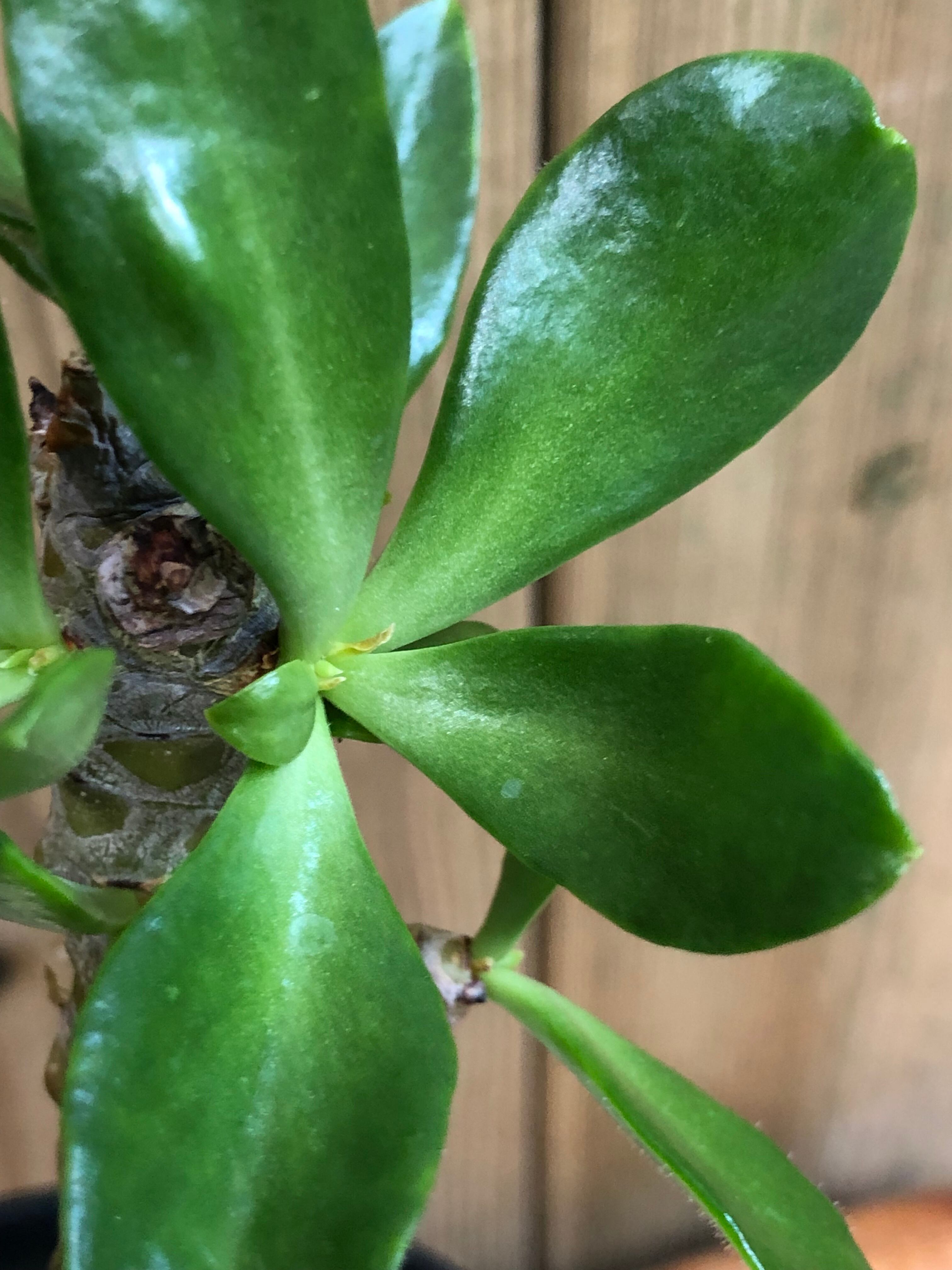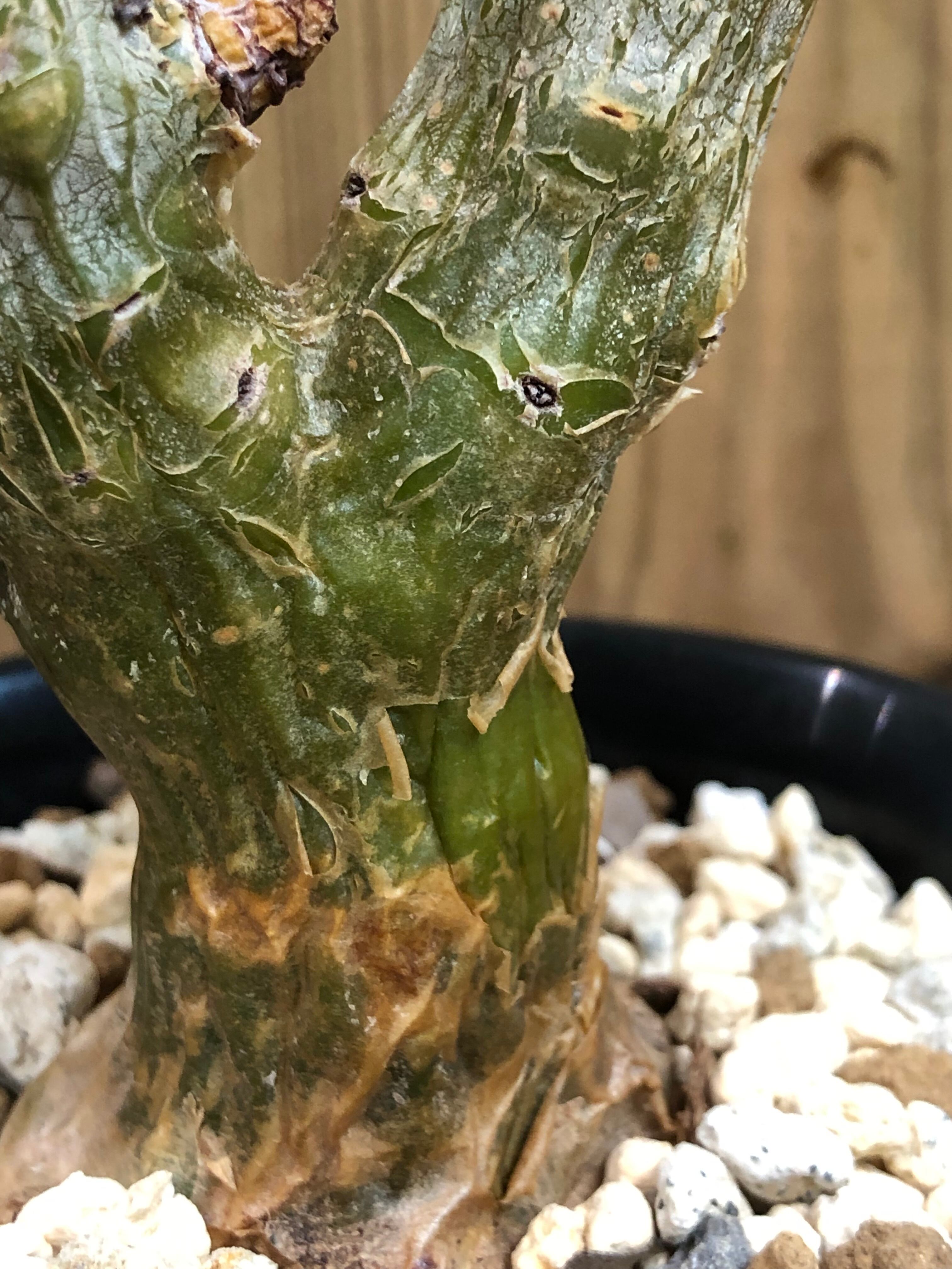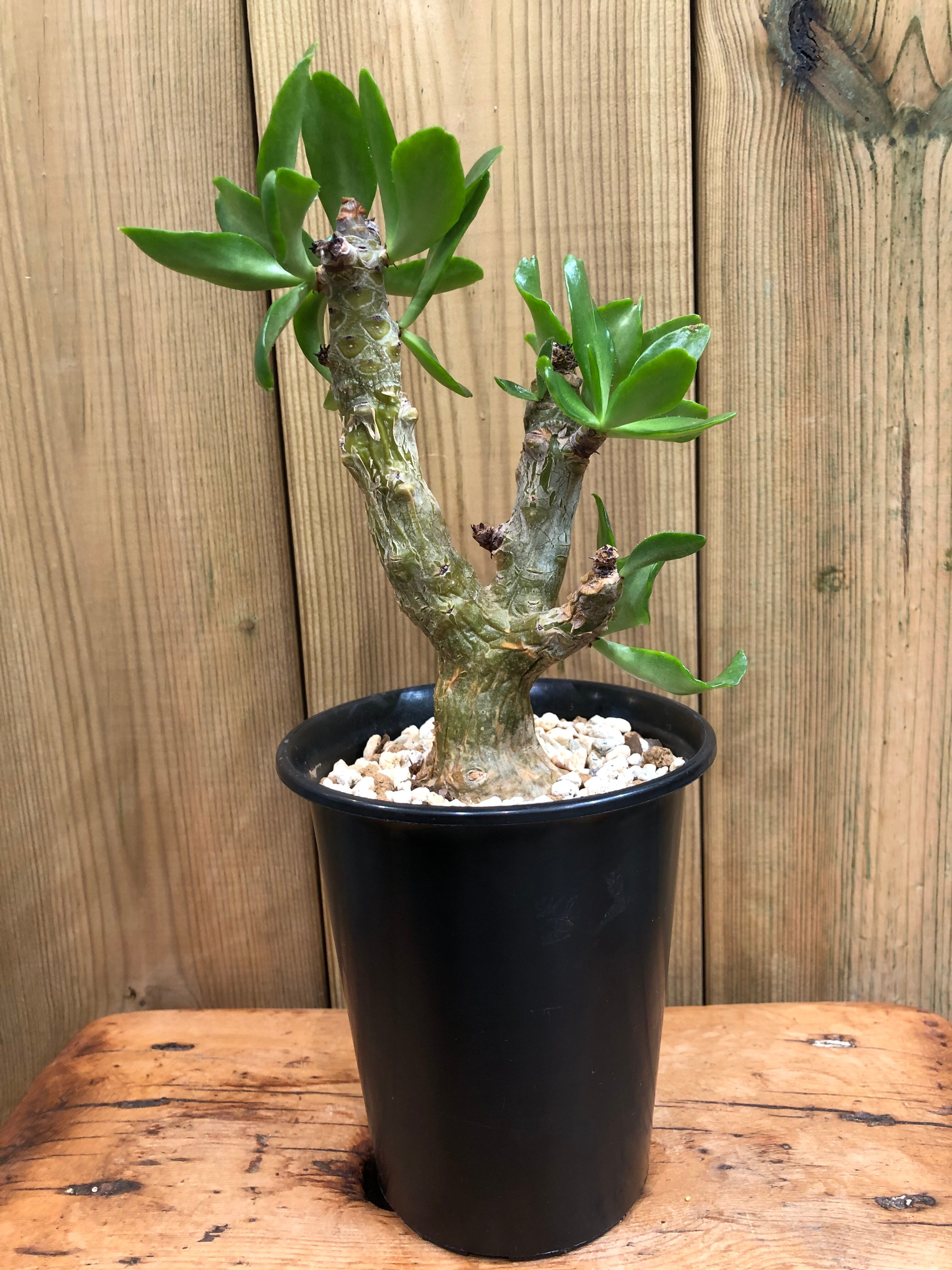 南アフリカ原産の冬型塊根植物です。葉は肉厚で楕円形の少しうねる様な形状で、幹は薄茶色の表皮に包まれており、成長と共に剥がれます。幹は太りながら枝数を増やしながら大きくなります。自生地ではm級になる品種です。