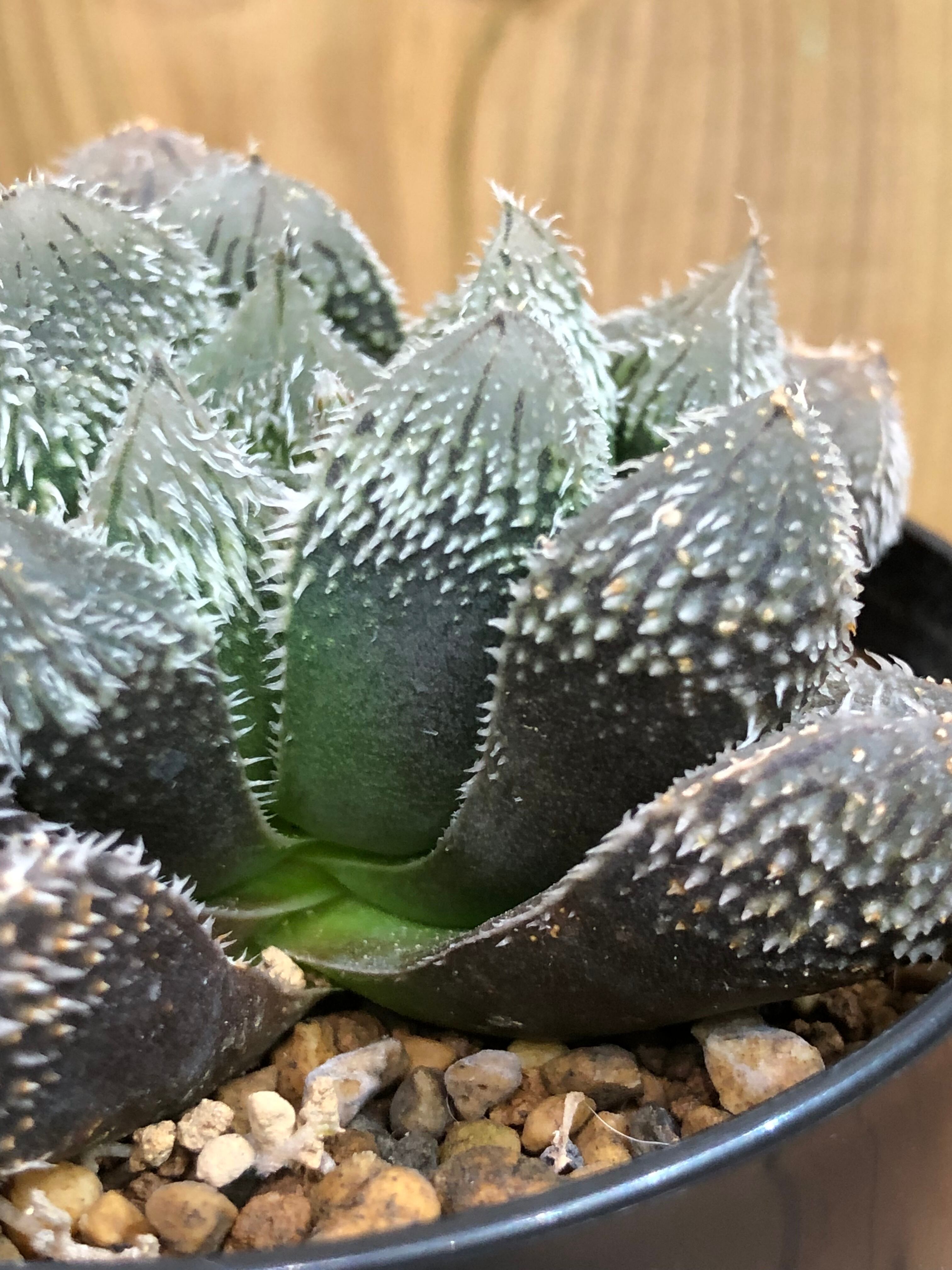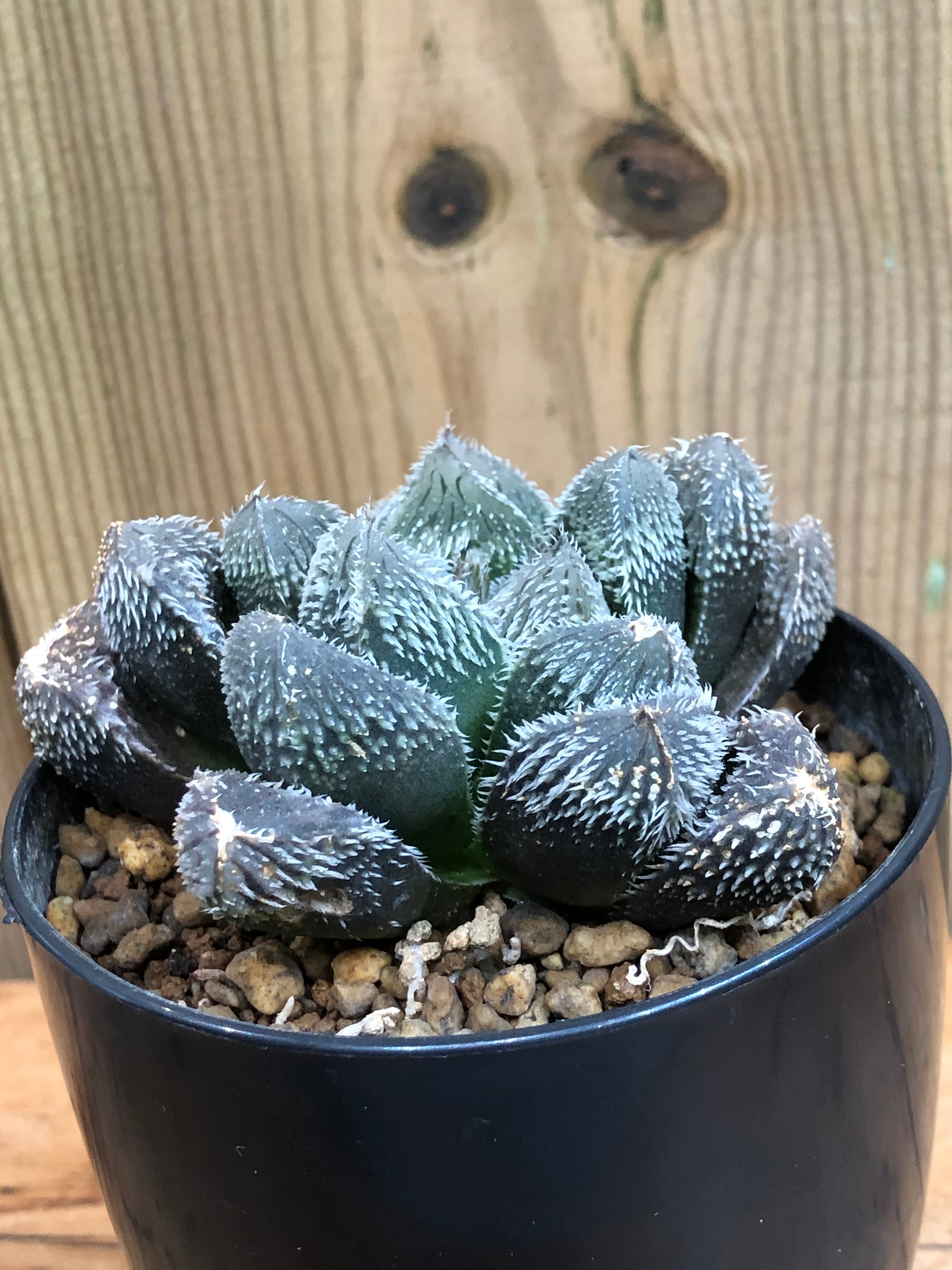 南アフリカ原産のハオルチアの交配種で、名前の通りタランチュラの尻尾によく似ています。軟葉系の品種で葉先の窓が半透明で表皮は毛で覆われています。濃い緑色と紫色が混ざった様な色味をしています。