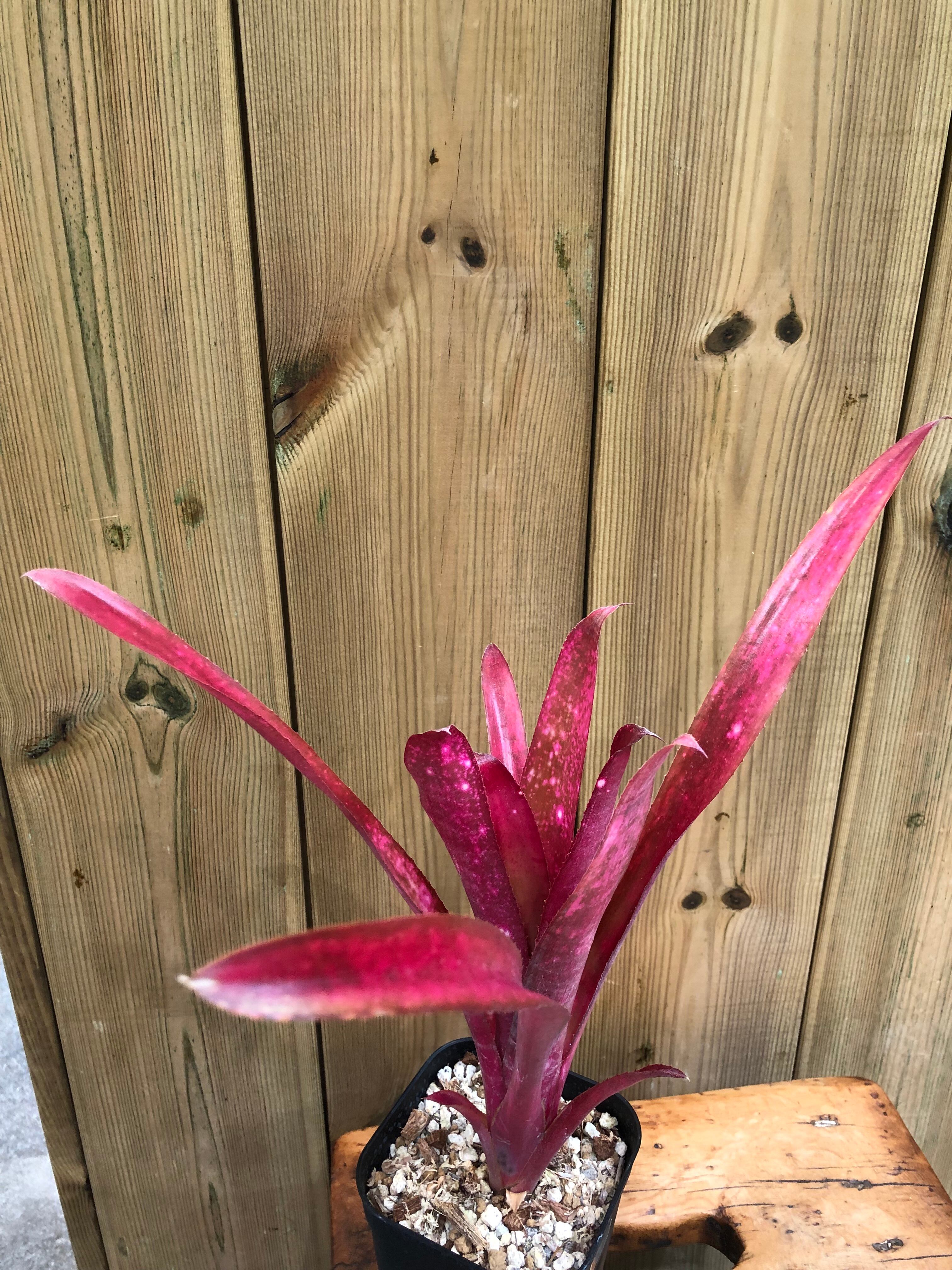 南米原産のタンクブロメリアで、葉は硬めで縁には小さな鋸歯があり白い斑点模様とゼブラ柄が入ります。陽当たりが良い場所で育てると写真の様に真っ赤に発色し、模様もはっきり出ますが、日照が足りない場合は緑色に色が抜けてきます。再度、日照の良い場所に置くと発色します。子株もよく出します。