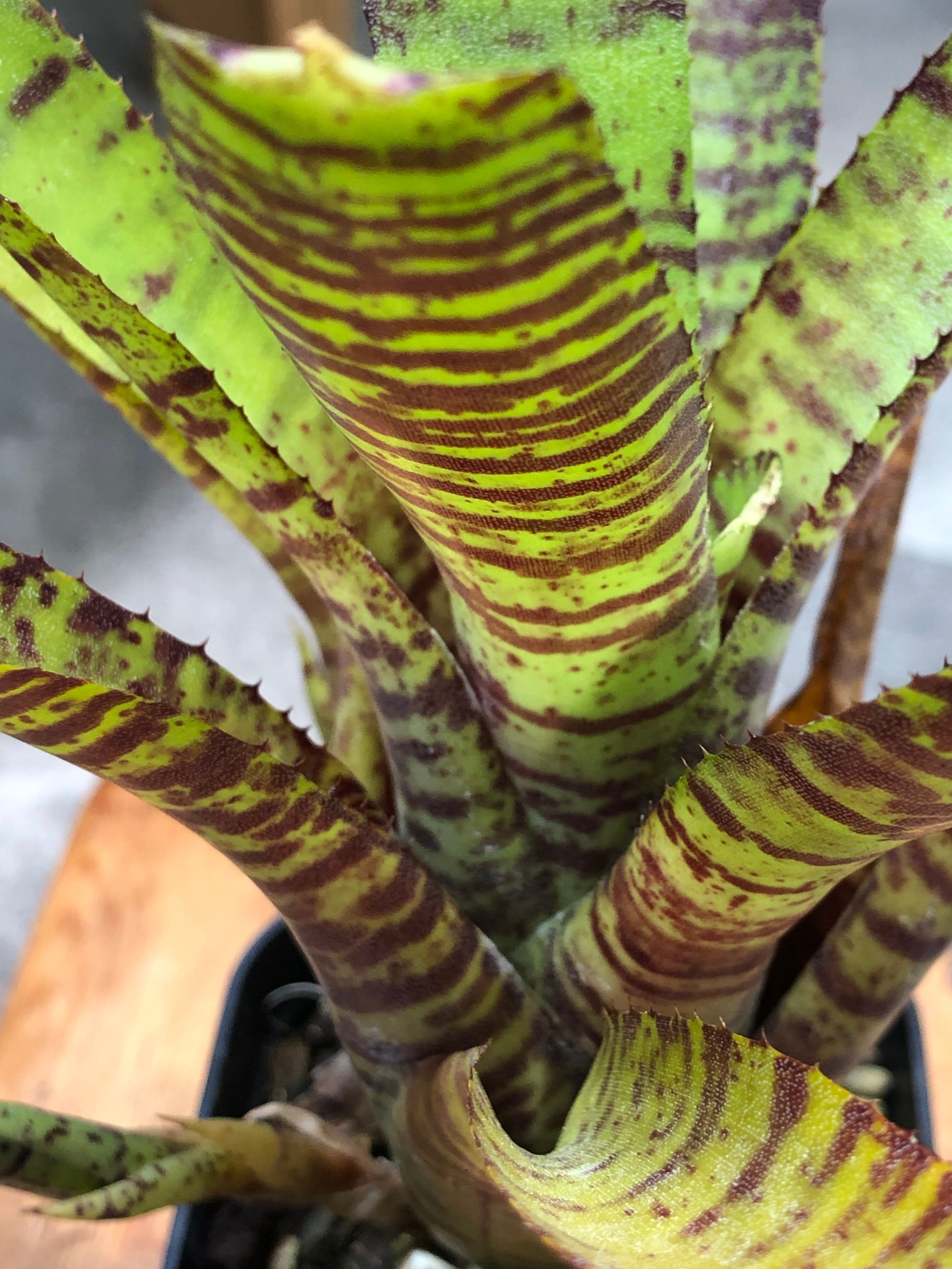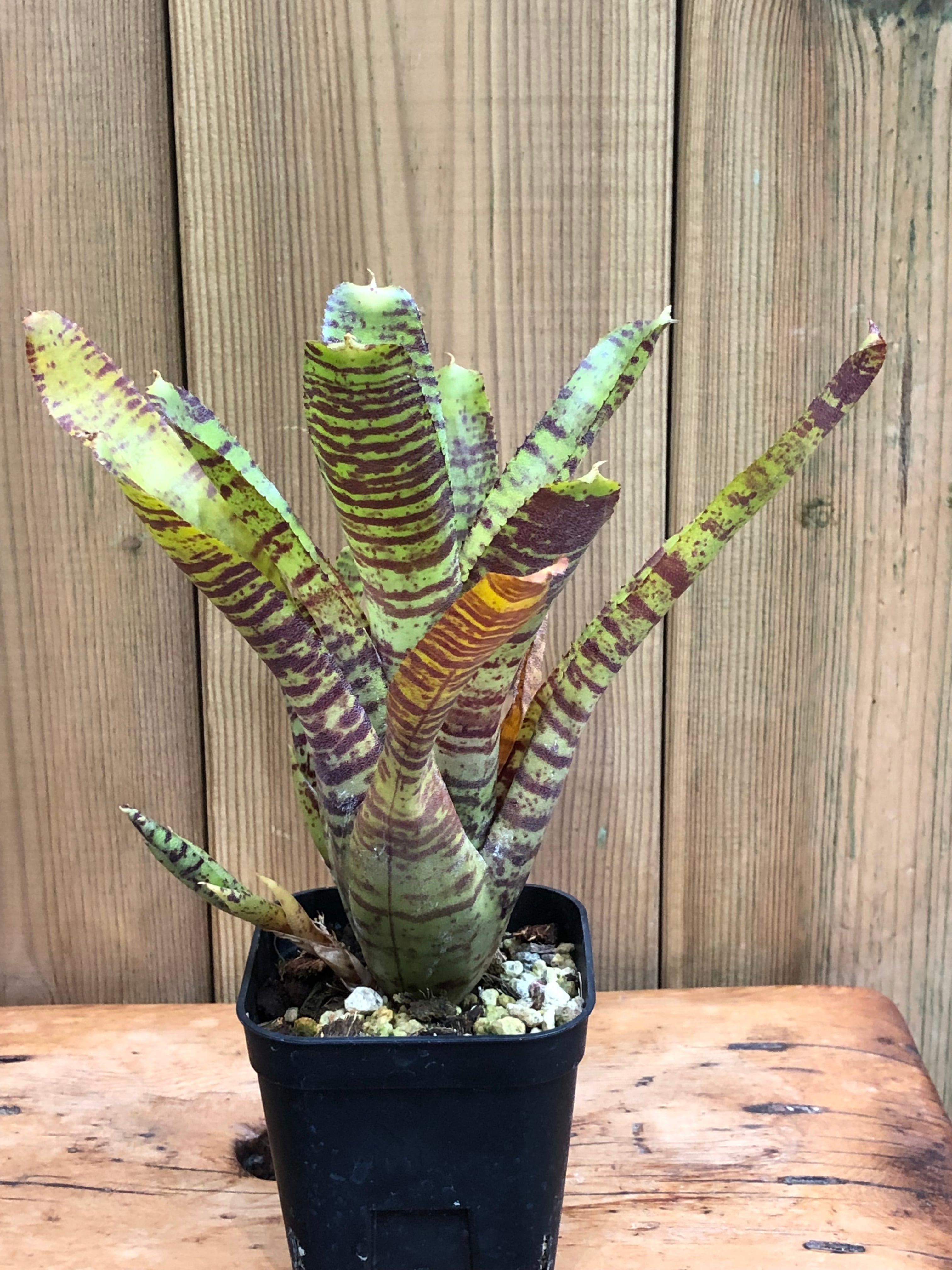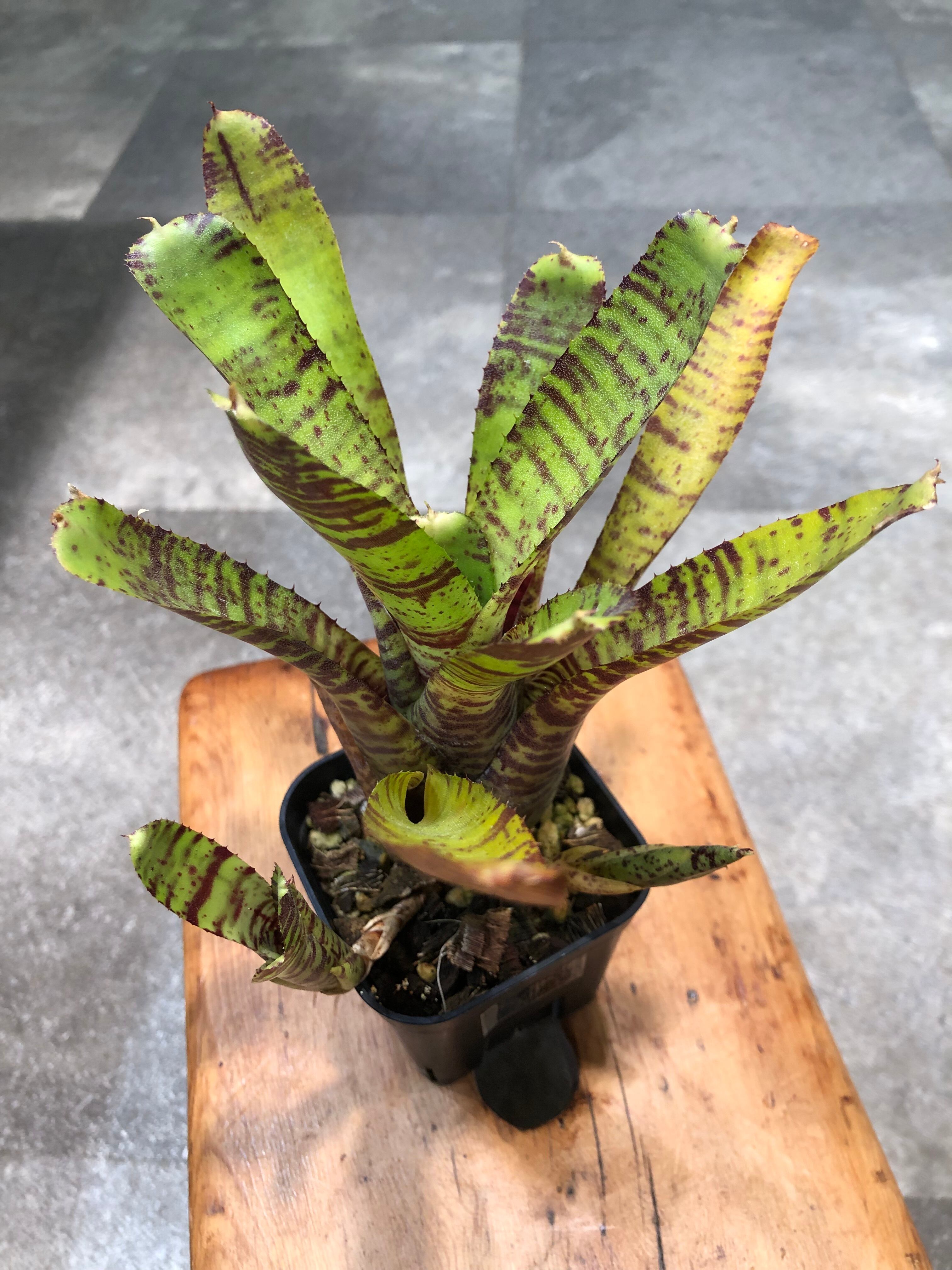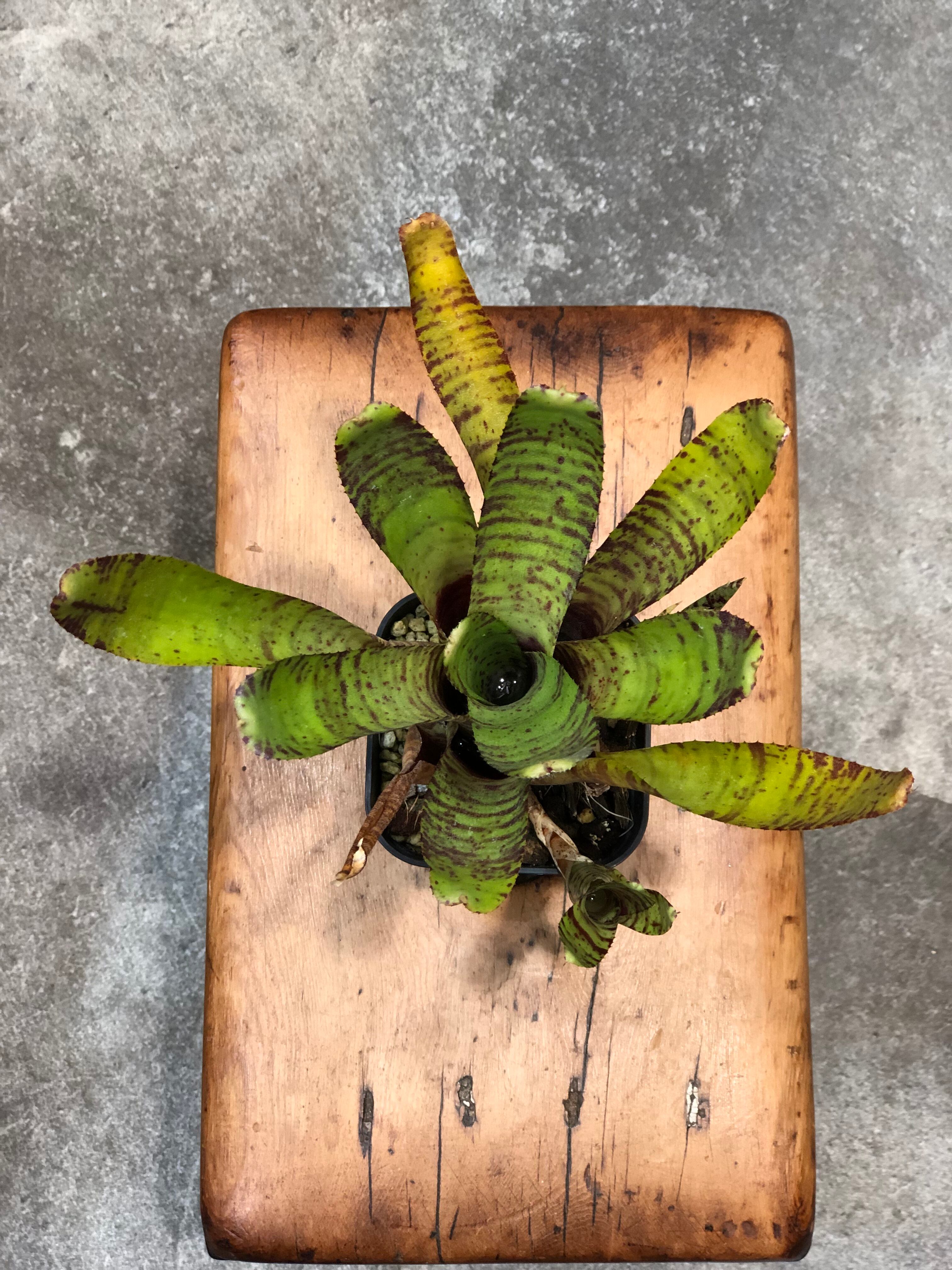南米原産のタンクブロメリアで、硬めの葉がロゼット形に展開します。葉は黄色く発色し濃い赤色の模様が入ります。日照が不足すると色味が緑色に戻ります。また陽当たりの良い場所におくと発色します。葉の間に水を溜めて管理します。