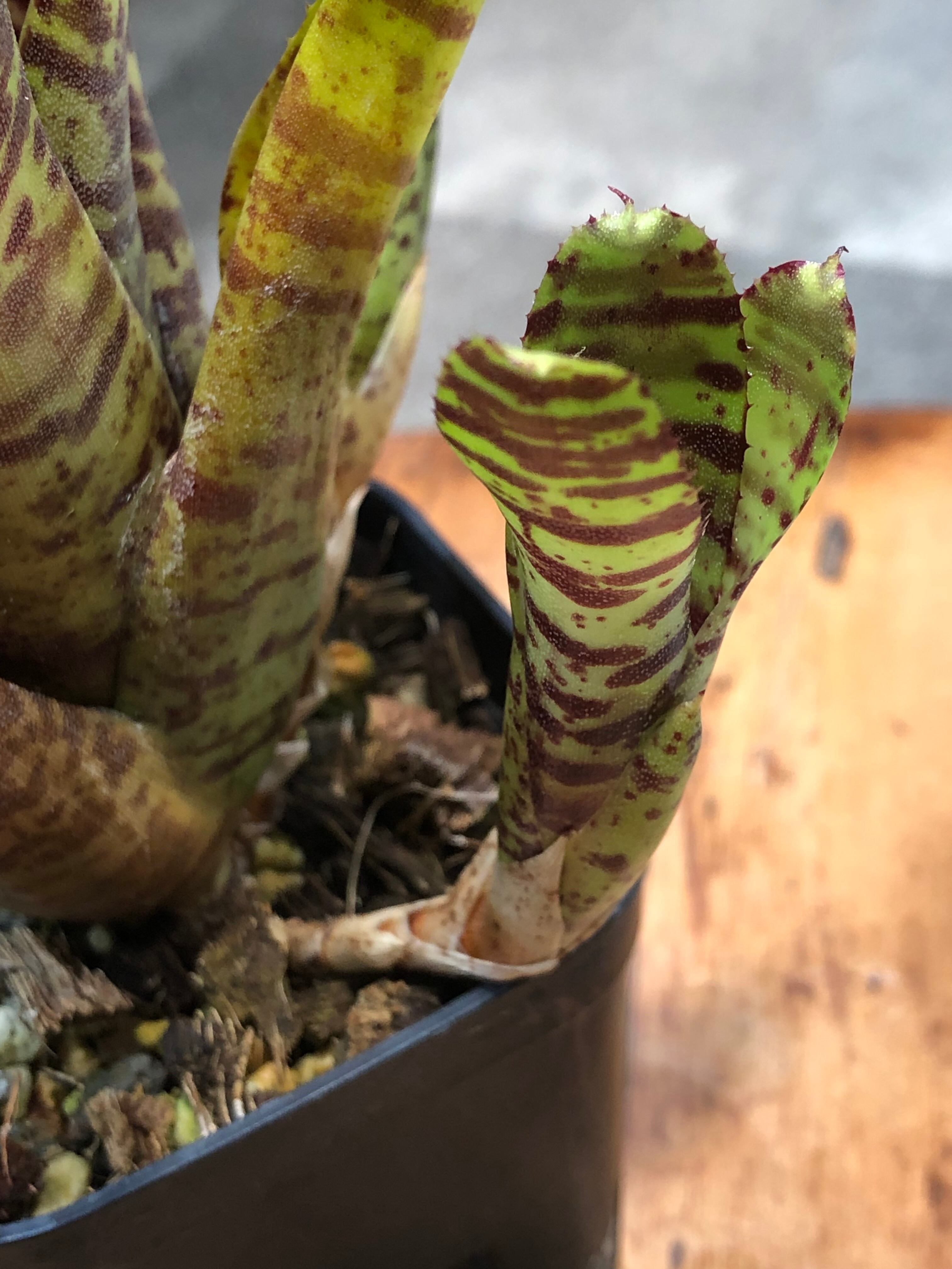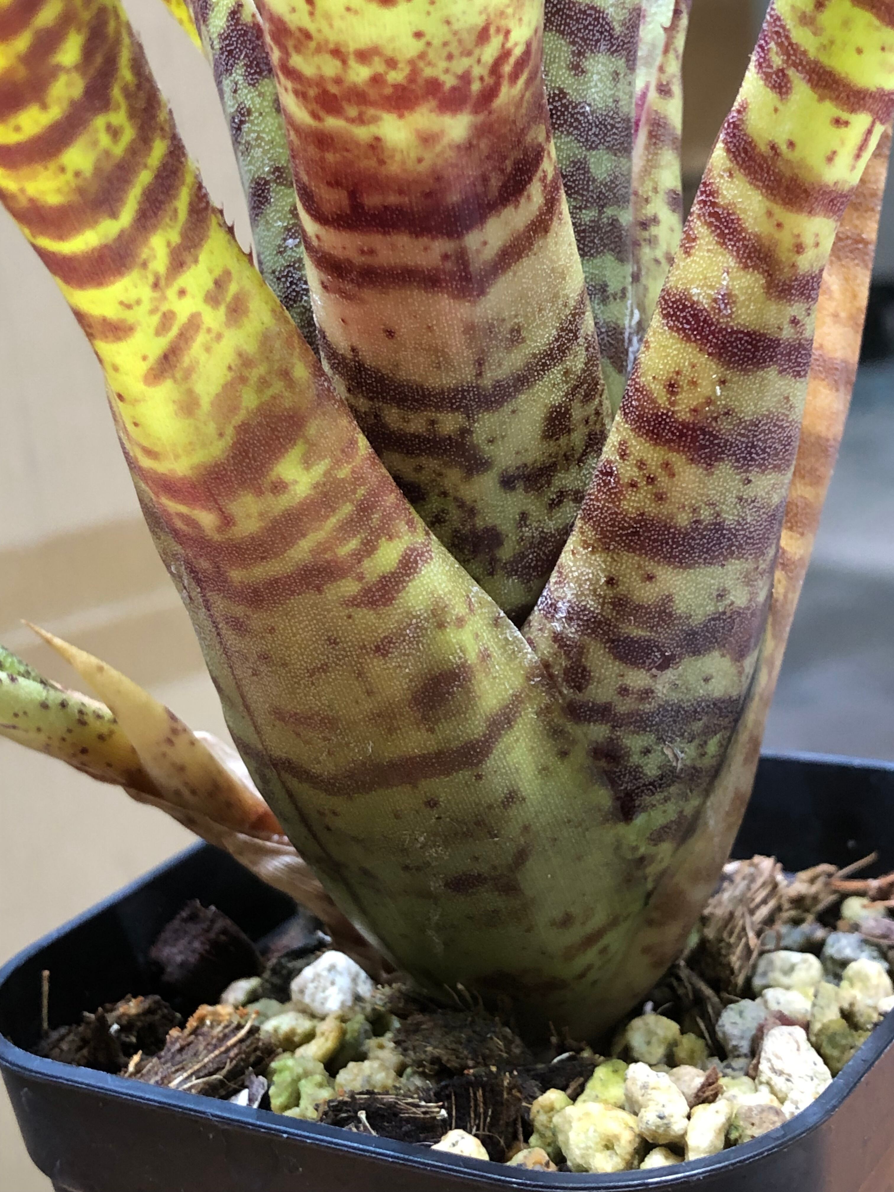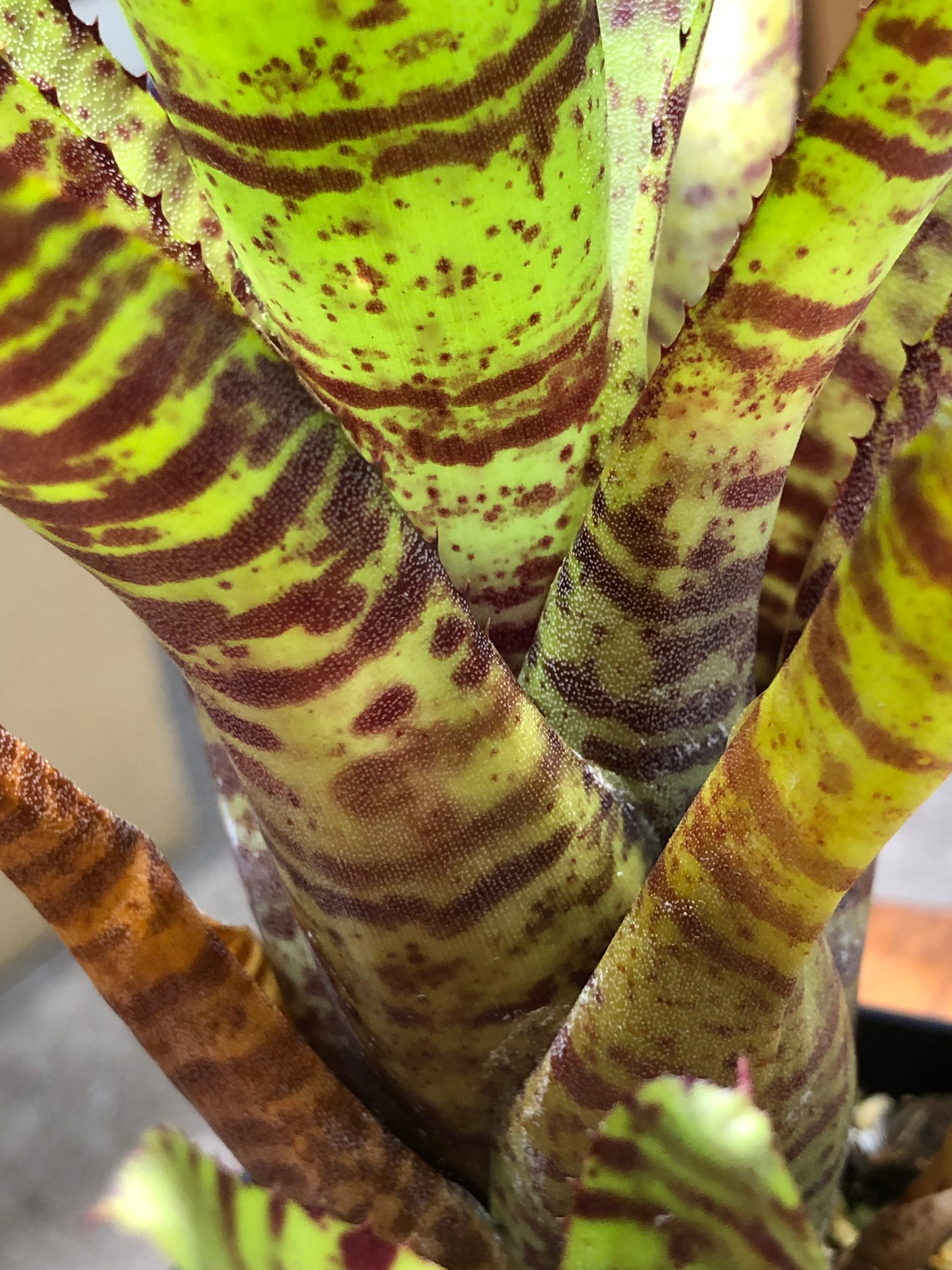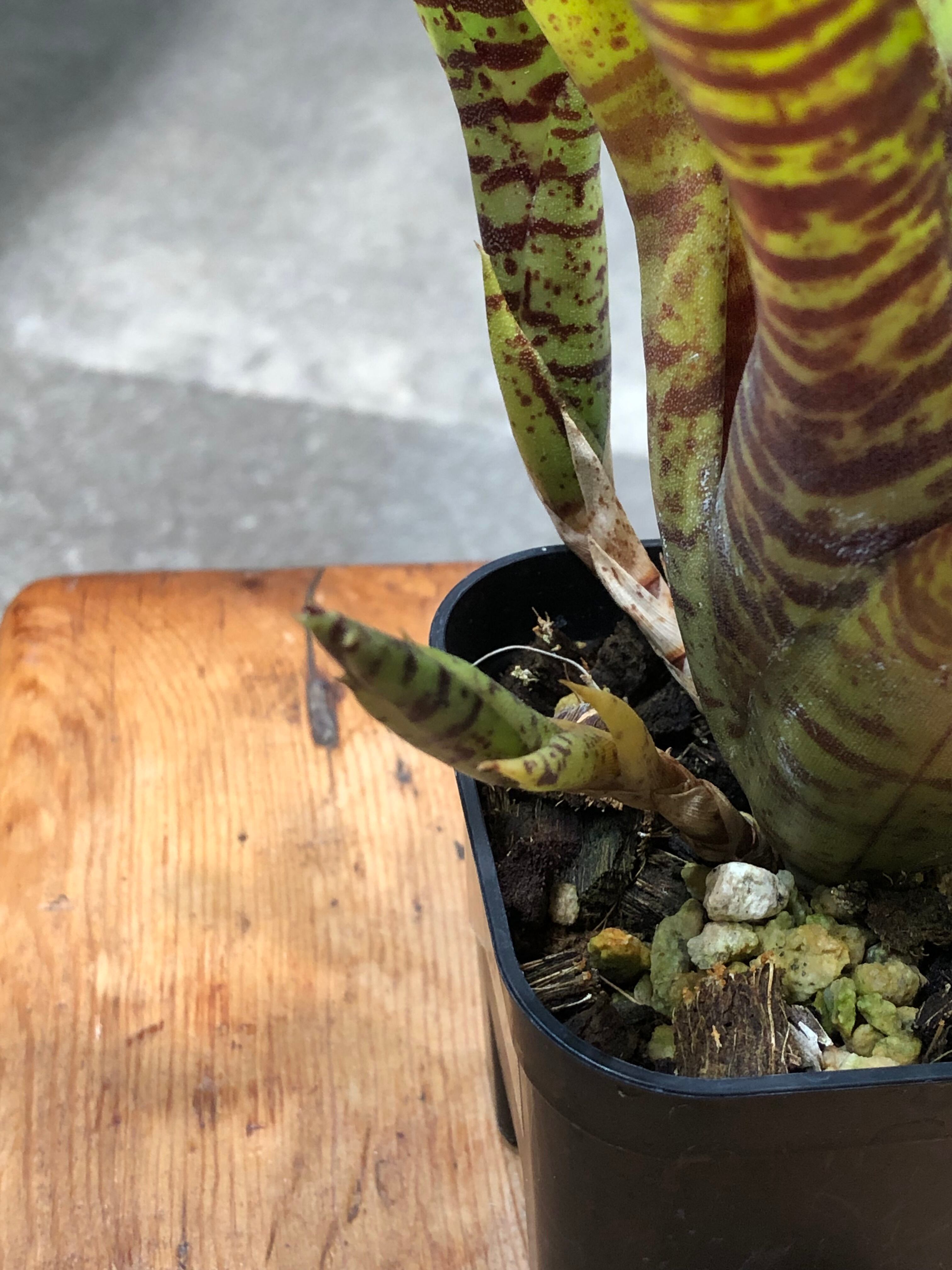 南米原産のタンクブロメリアで、硬めの葉がロゼット形に展開します。葉は黄色く発色し濃い赤色の模様が入ります。日照が不足すると色味が緑色に戻ります。また陽当たりの良い場所におくと発色します。葉の間に水を溜めて管理します。